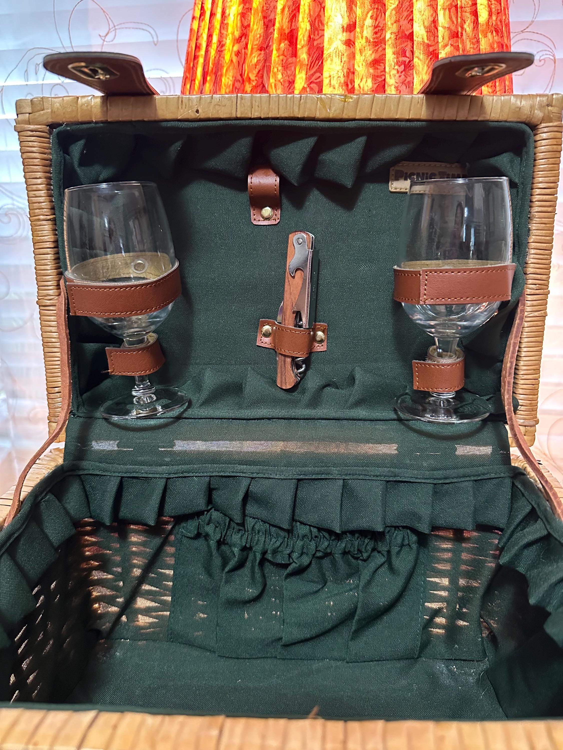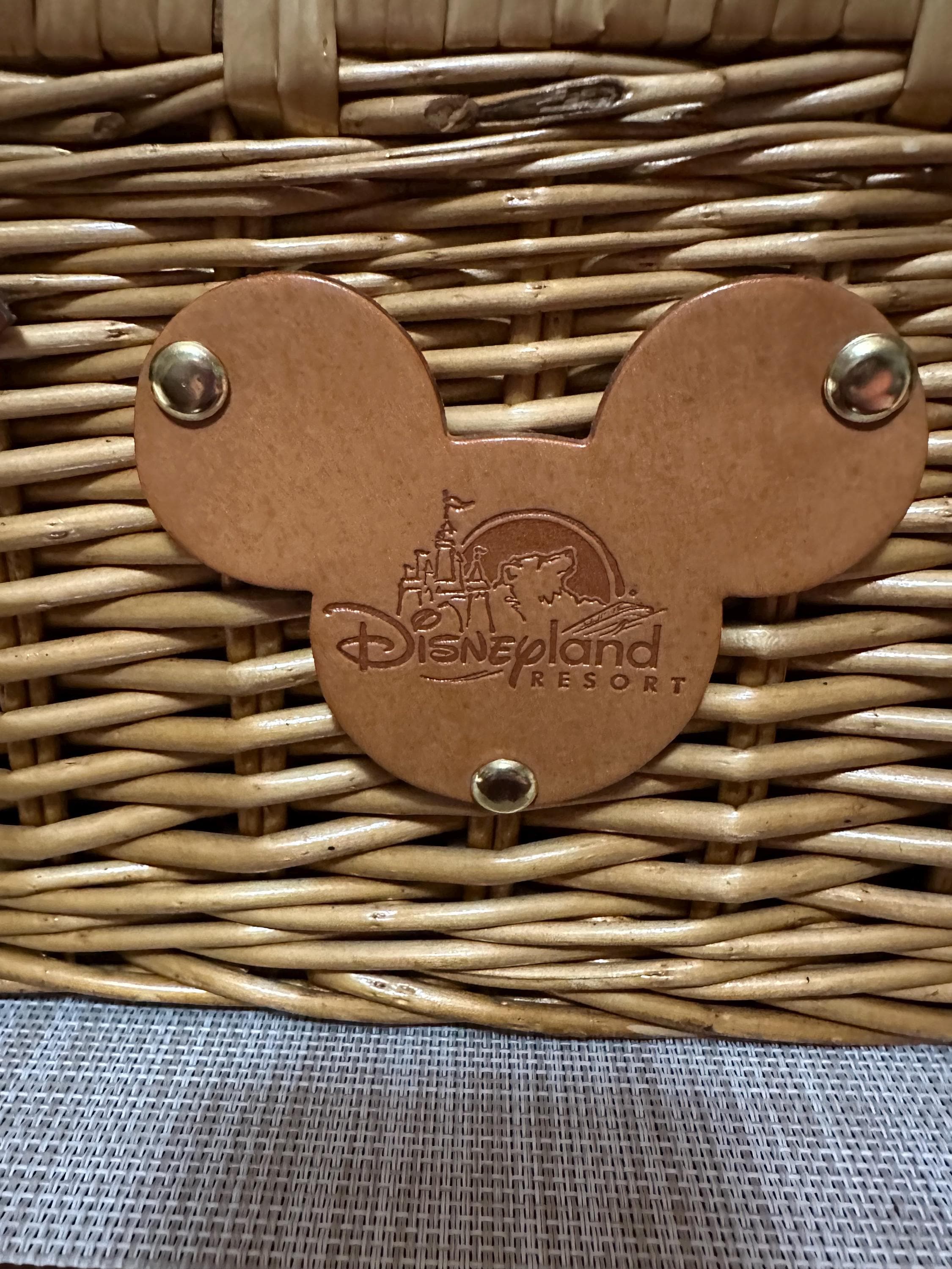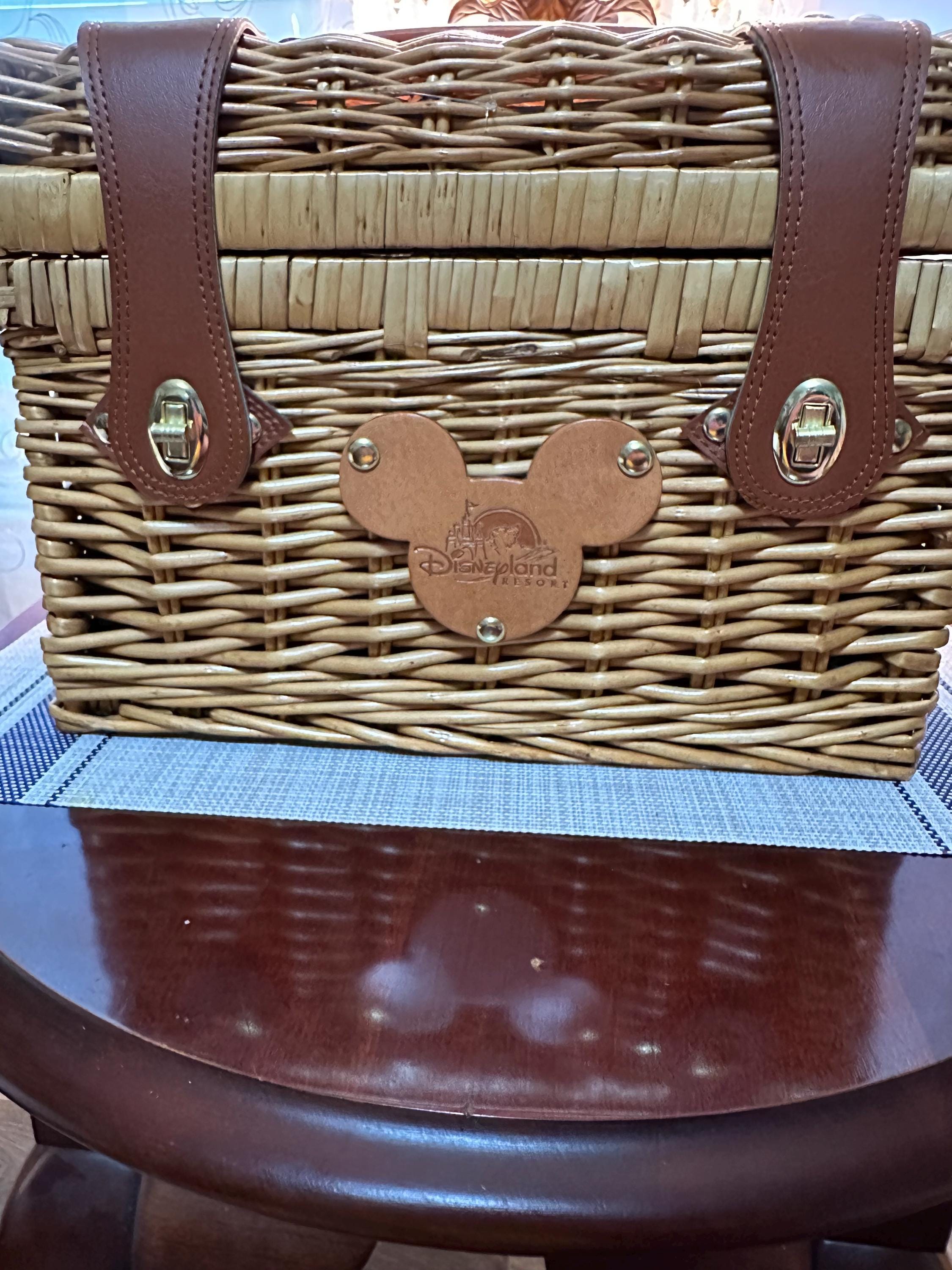 Walt Disney Resort Picnic Basket. This includes 2 napkins, a table cloth, 2 wine glasses and wine cork opener. This basket does not have the cheese knife. There are no tears inside the basket or on the napkins and table cloth. The basket is a rattan woven material. It is 13 inches wide, 8 inches deep, 9.5 inches tall. This is from a smoke free home. Disclaimer: color may be different due to lighting or camera.