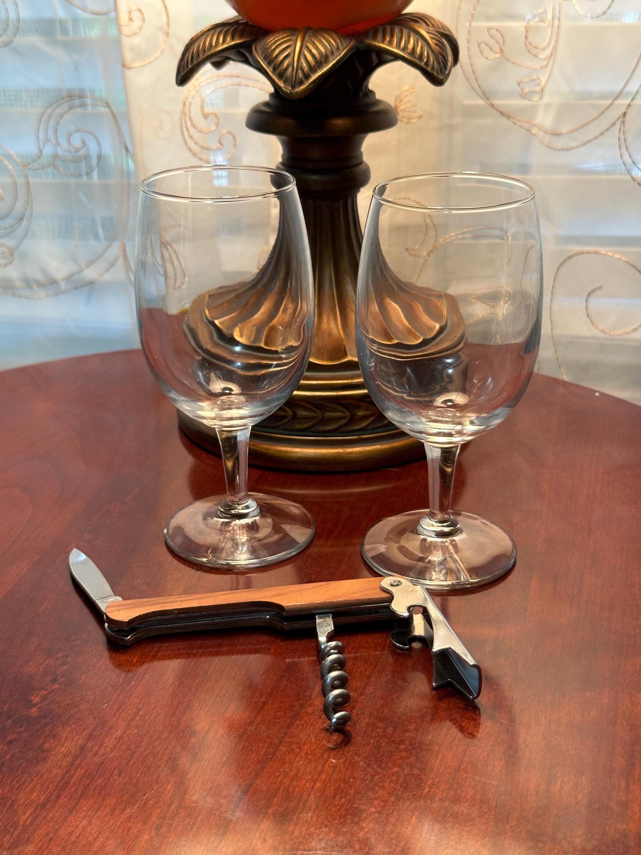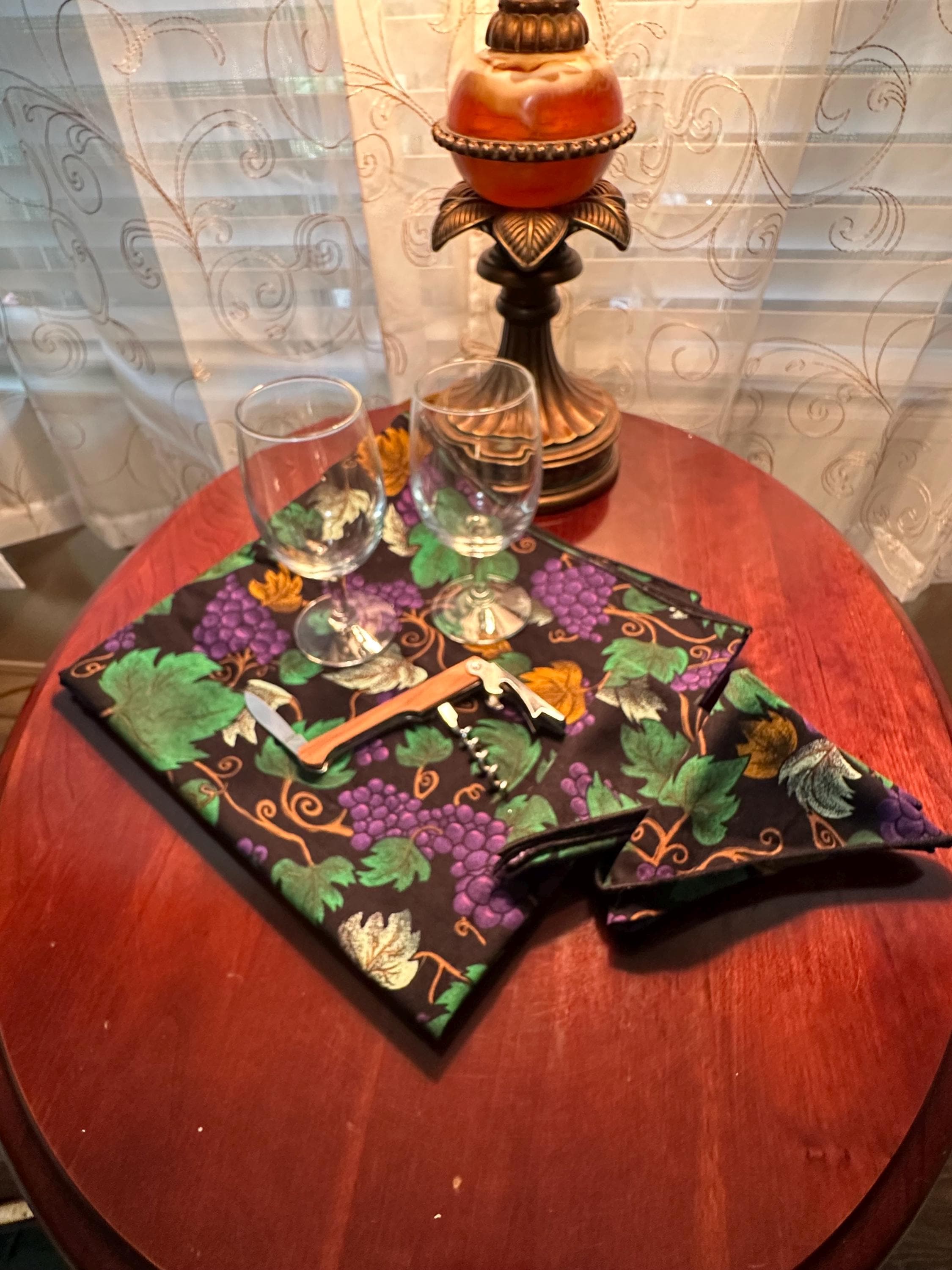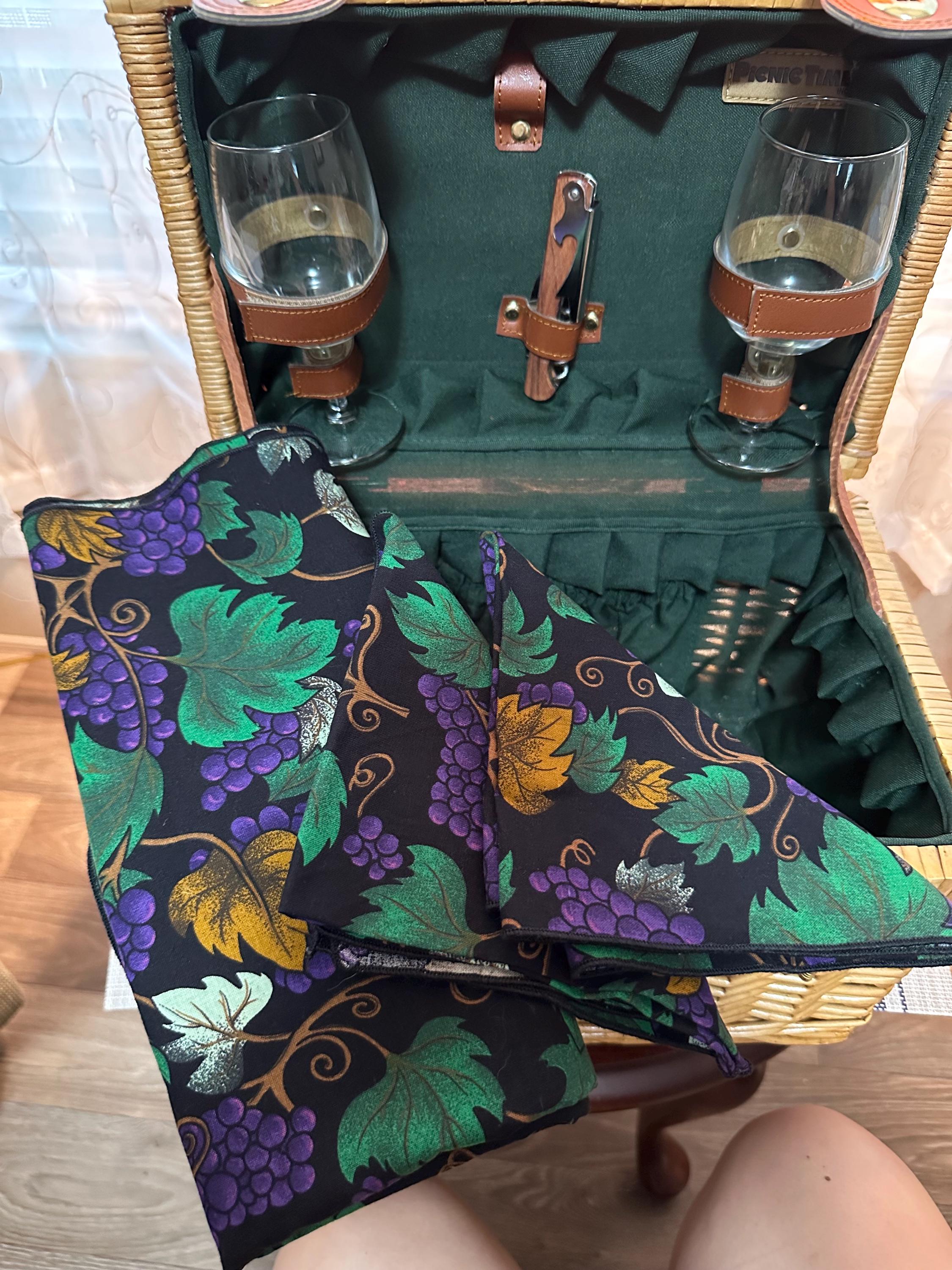Walt Disney Resort Picnic Basket. This includes 2 napkins, a table cloth, 2 wine glasses and wine cork opener. This basket does not have the cheese knife. There are no tears inside the basket or on the napkins and table cloth. The basket is a rattan woven material. It is 13 inches wide, 8 inches deep, 9.5 inches tall. This is from a smoke free home. Disclaimer: color may be different due to lighting or camera.