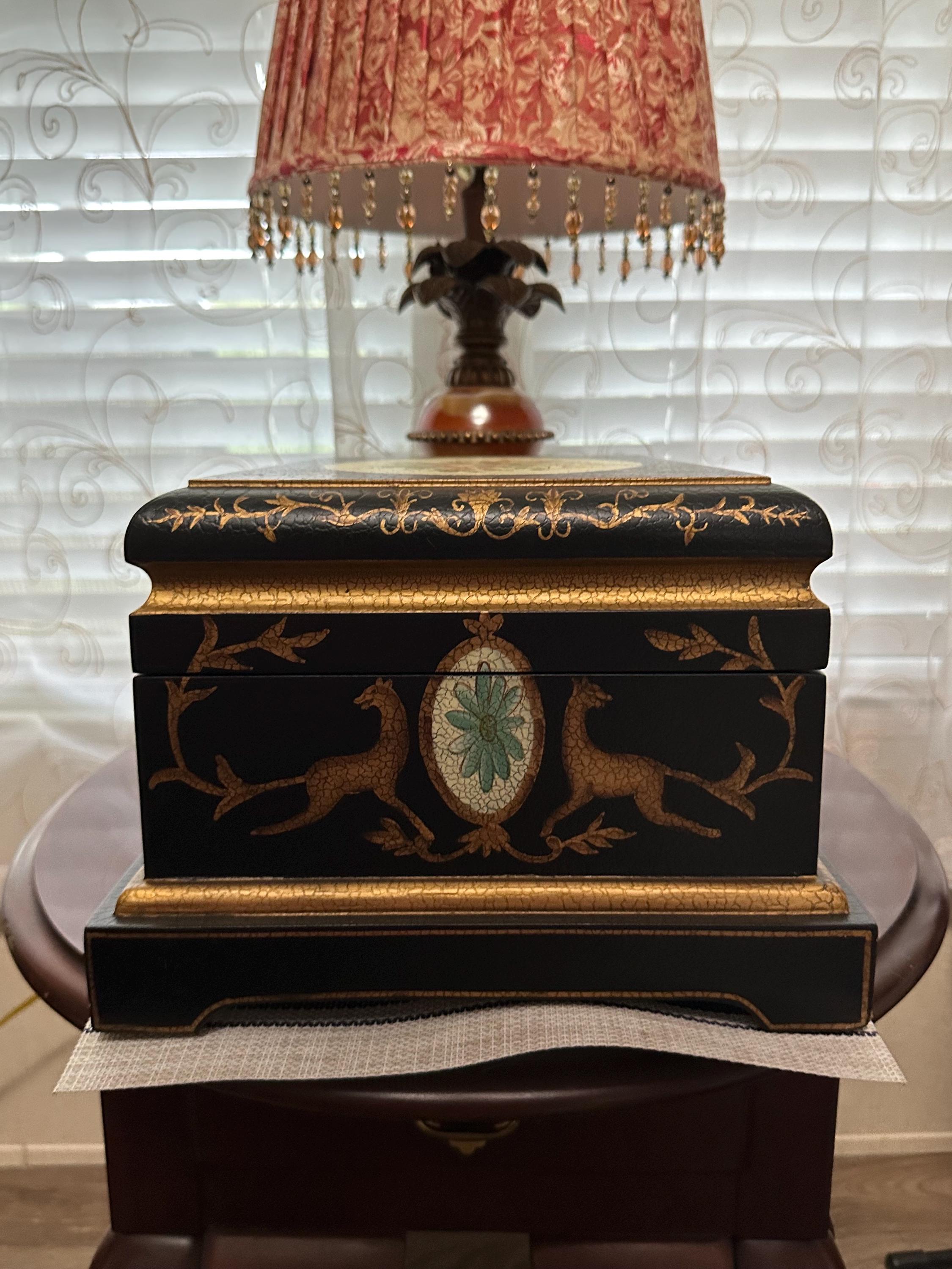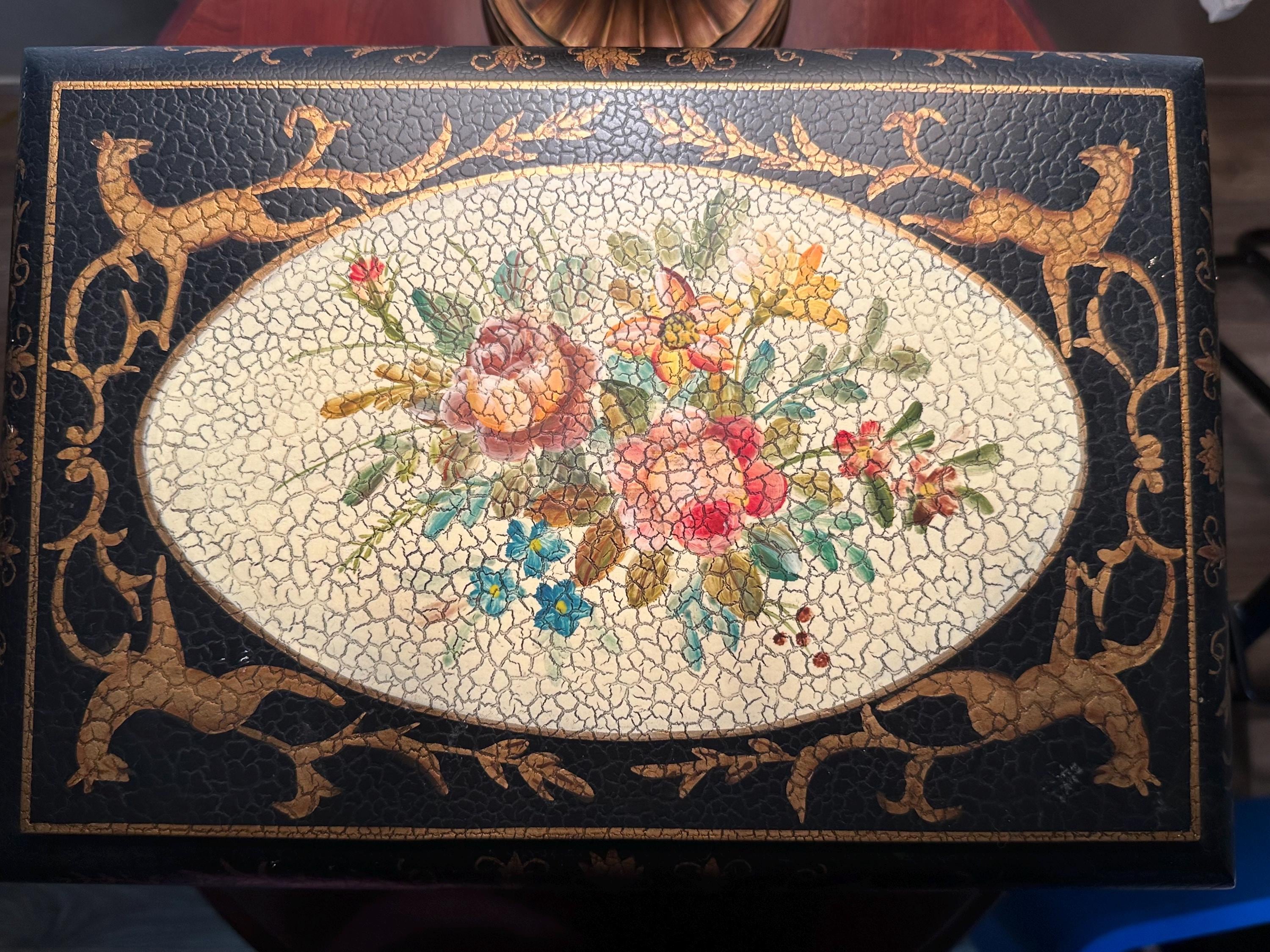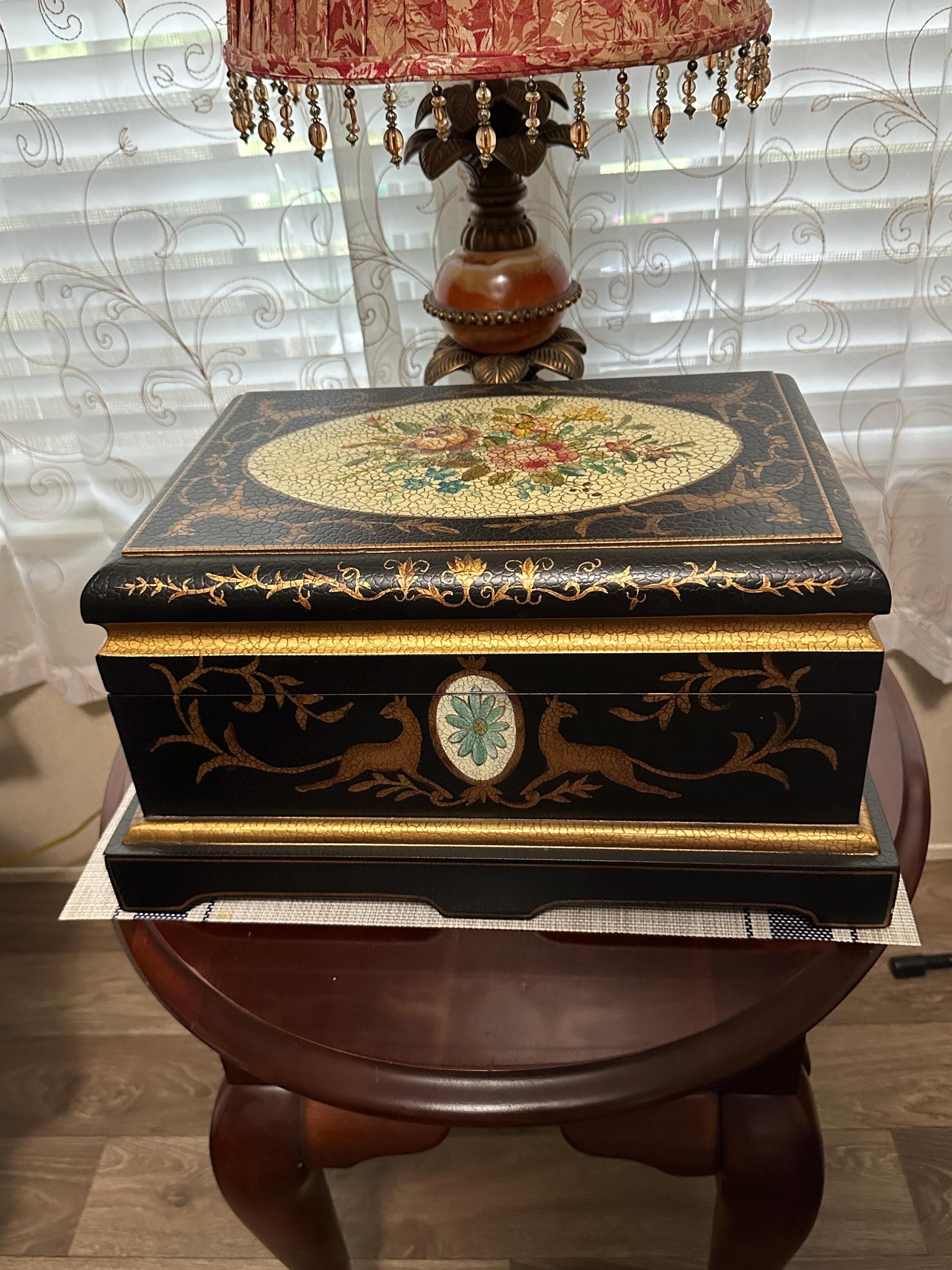 Very unique box decorated in tole style. This box is made of wood with metal hinges. This box is very heavy and has beautiful artwork on it. It is 13.5 x 10.5 x 8.5. There are no markings on the box to determine who made it. There are no cracks or chipping of the paint. All offers will be accepted. Please contact us if you have any questions at all or would like more pictures.