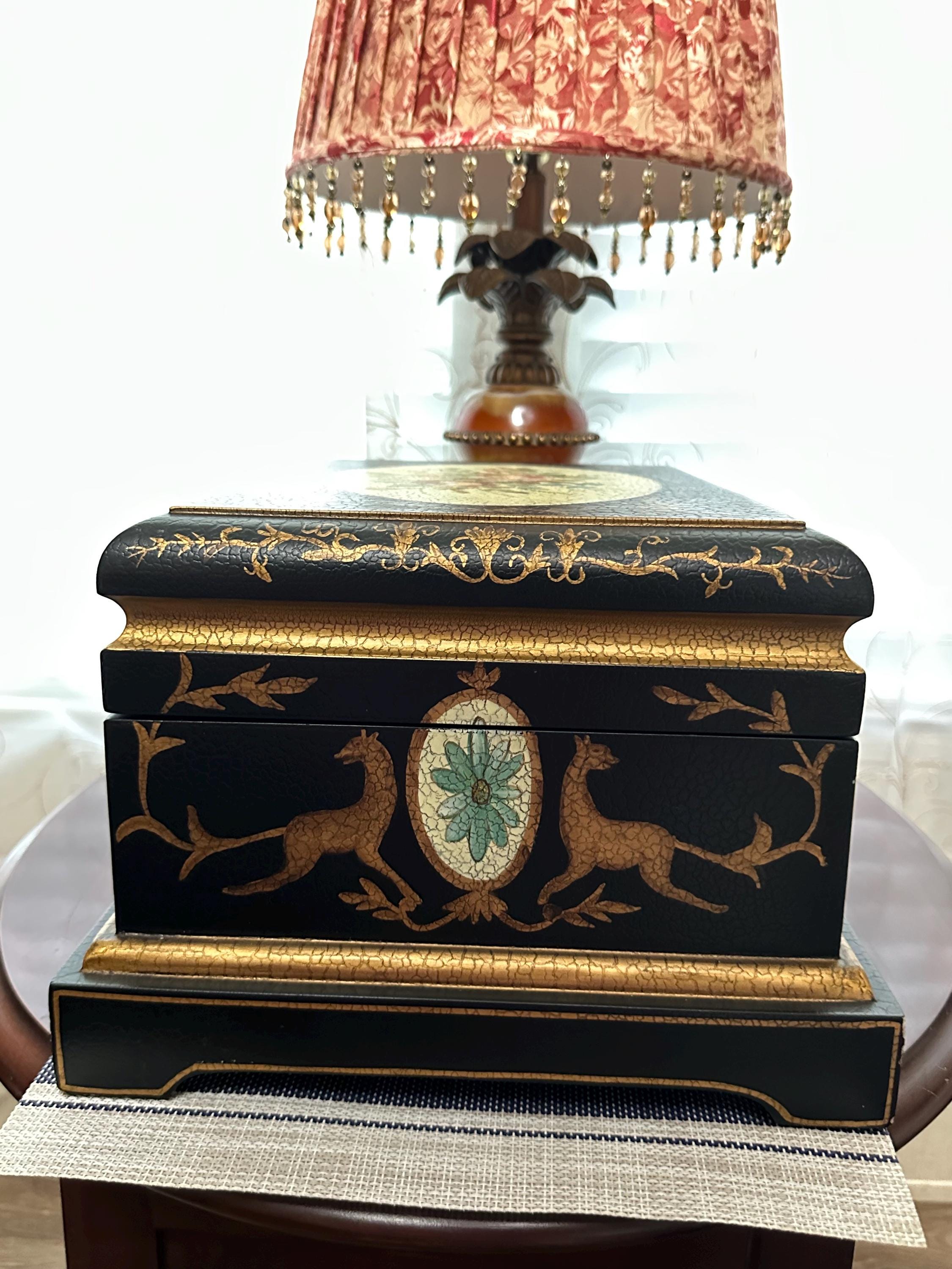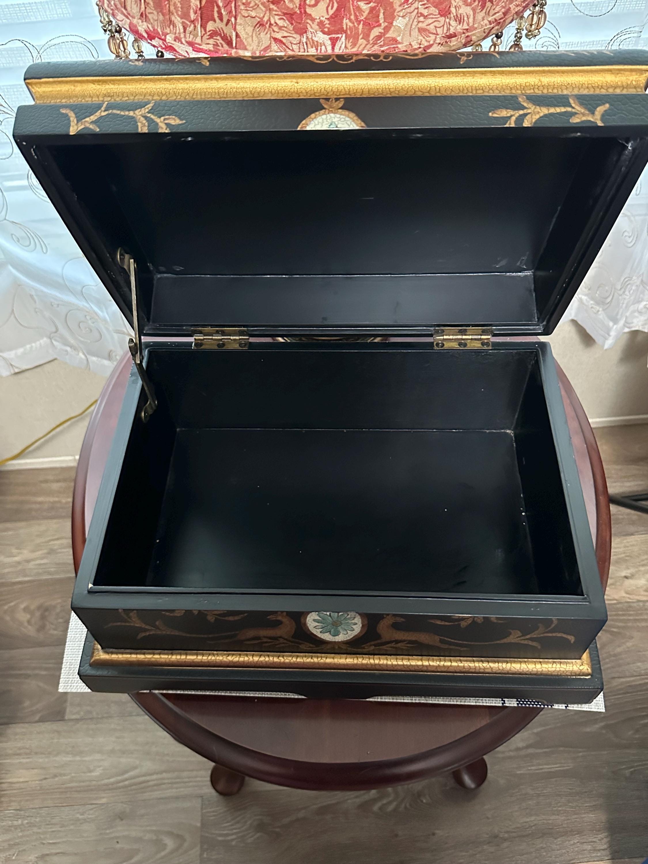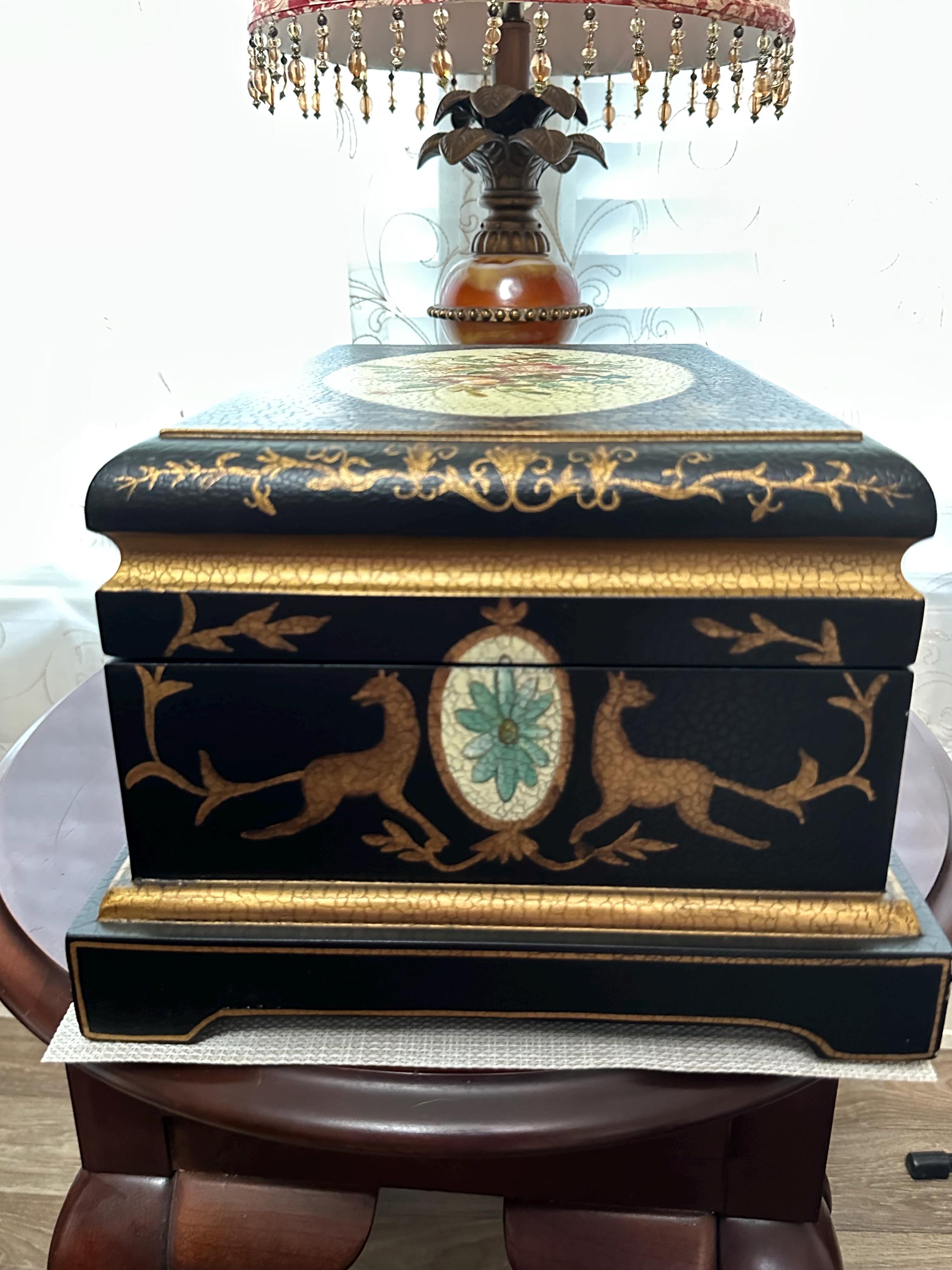 Very unique box decorated in tole style. This box is made of wood with metal hinges. This box is very heavy and has beautiful artwork on it. It is 13.5 x 10.5 x 8.5. There are no markings on the box to determine who made it. There are no cracks or chipping of the paint. All offers will be accepted. Please contact us if you have any questions at all or would like more pictures.