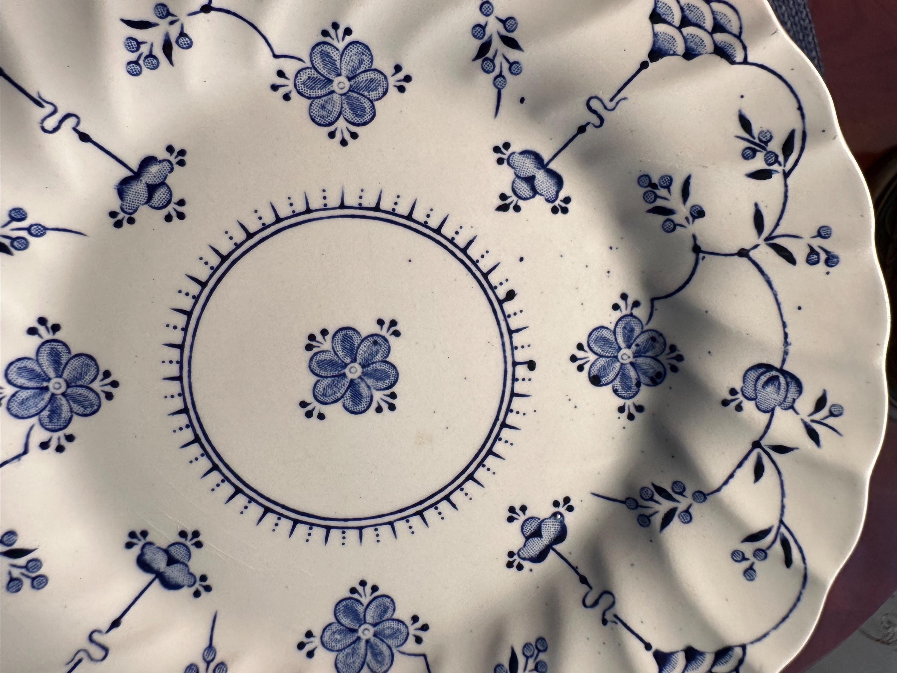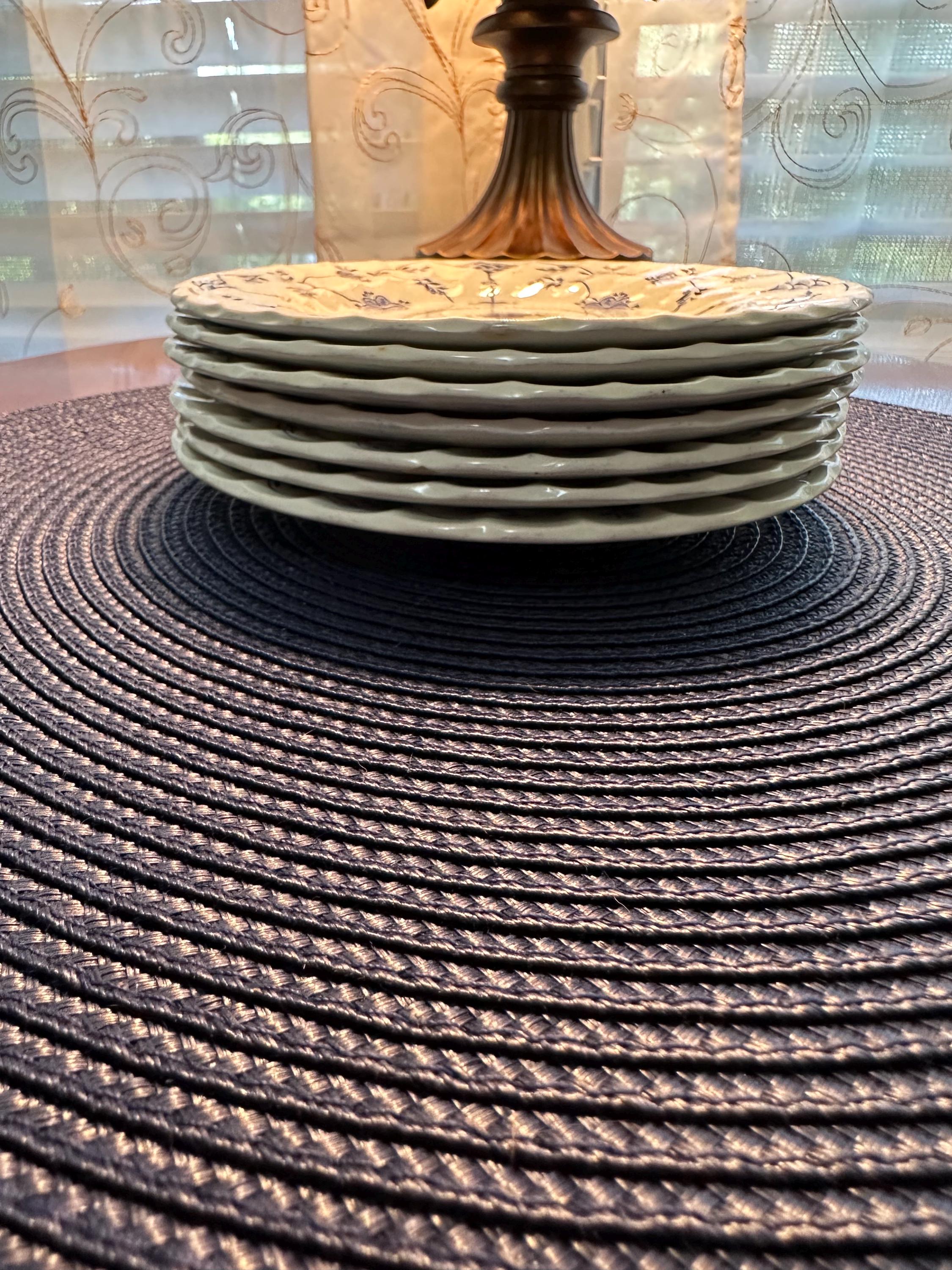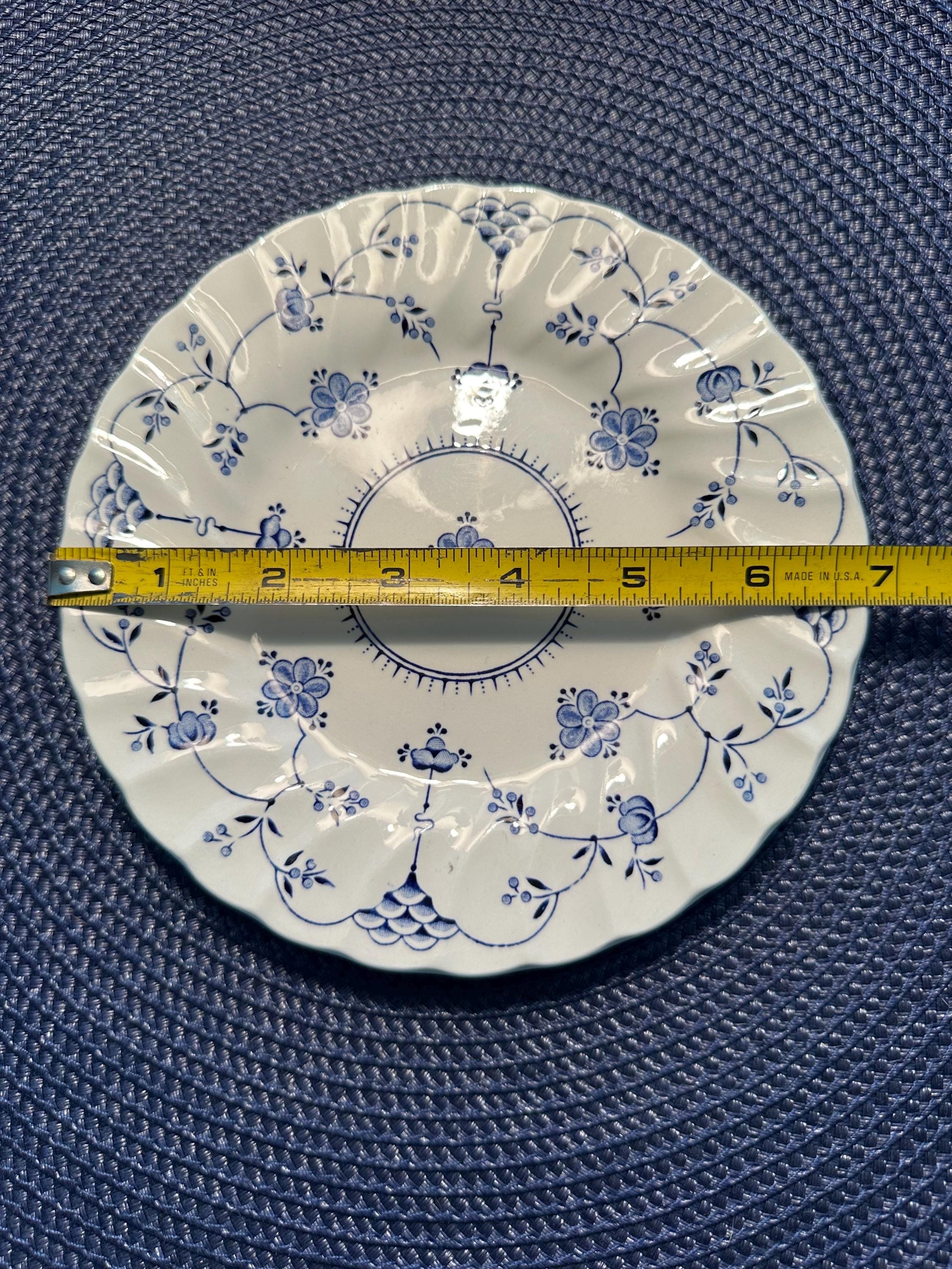 Set of 7 Myott Staffordshire “Finlandia” print 7 inch plates. This white plate with tiny colbalt designs are simplistically beautiful. No chips, crazing or cracks. There is one dish that has some irregular specks of paint. Picture is included.