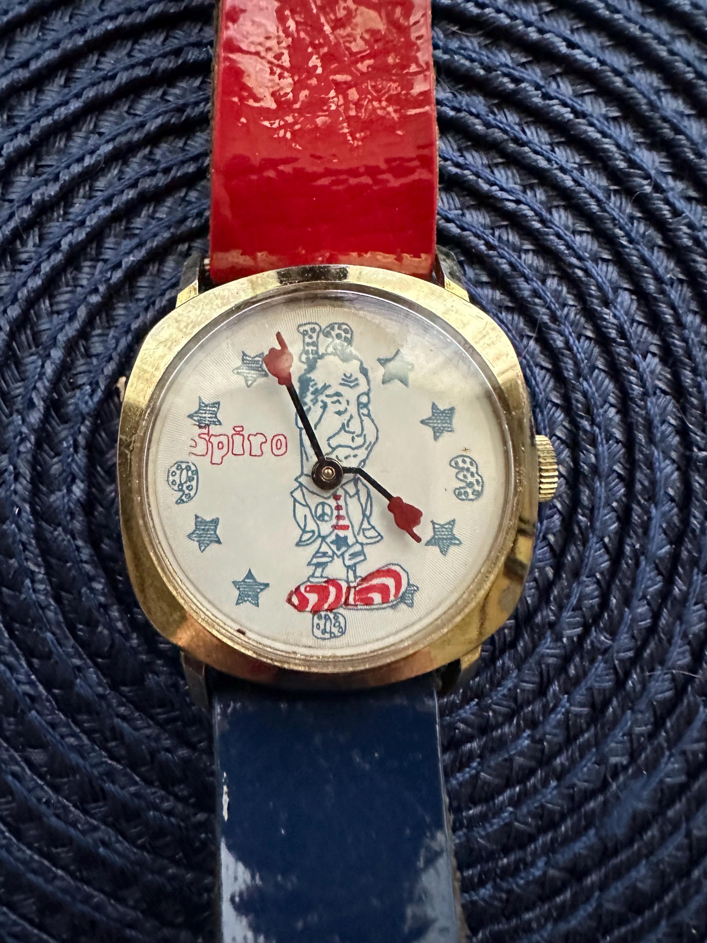 Welcome back to 1970! This is a rare find. This Spiro Agnew watch was purchased in 1970 and only worn a few times during the Nixon administration. This is definitely a conversation starter and will show your love for all things 1970. You can hear the watch tick after turning the knob. All offers are accepted.
