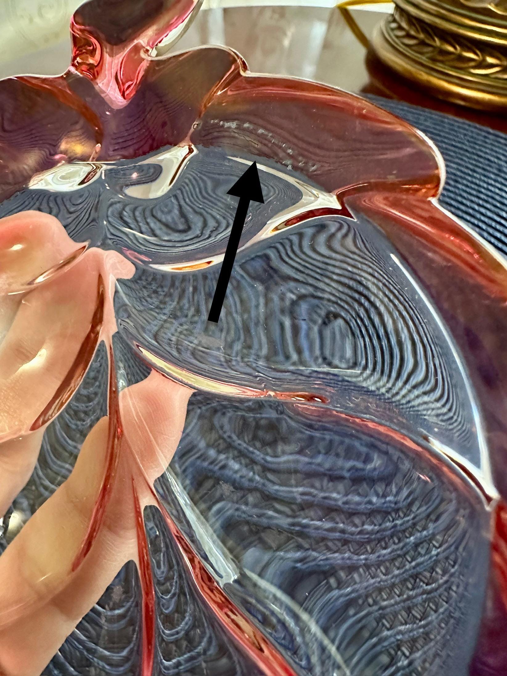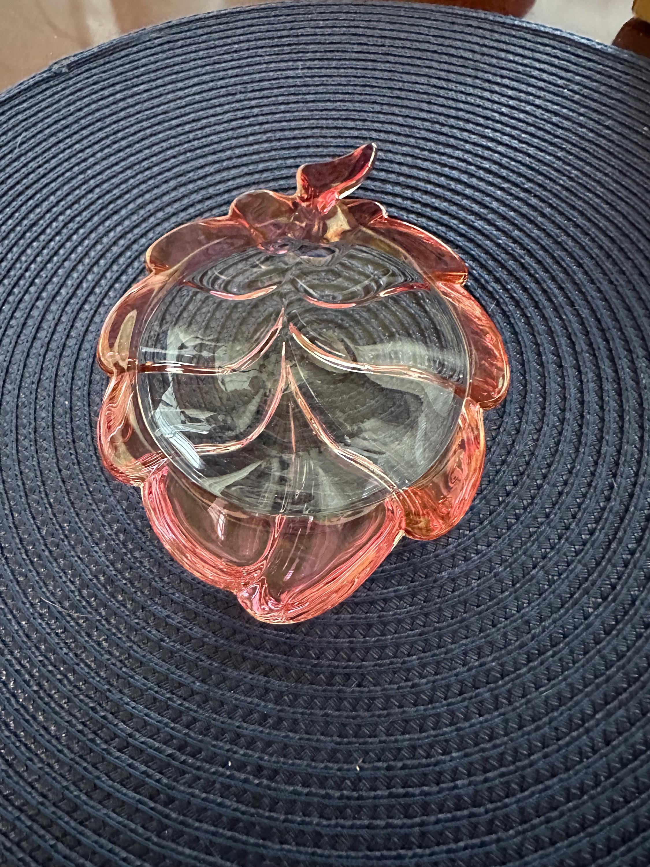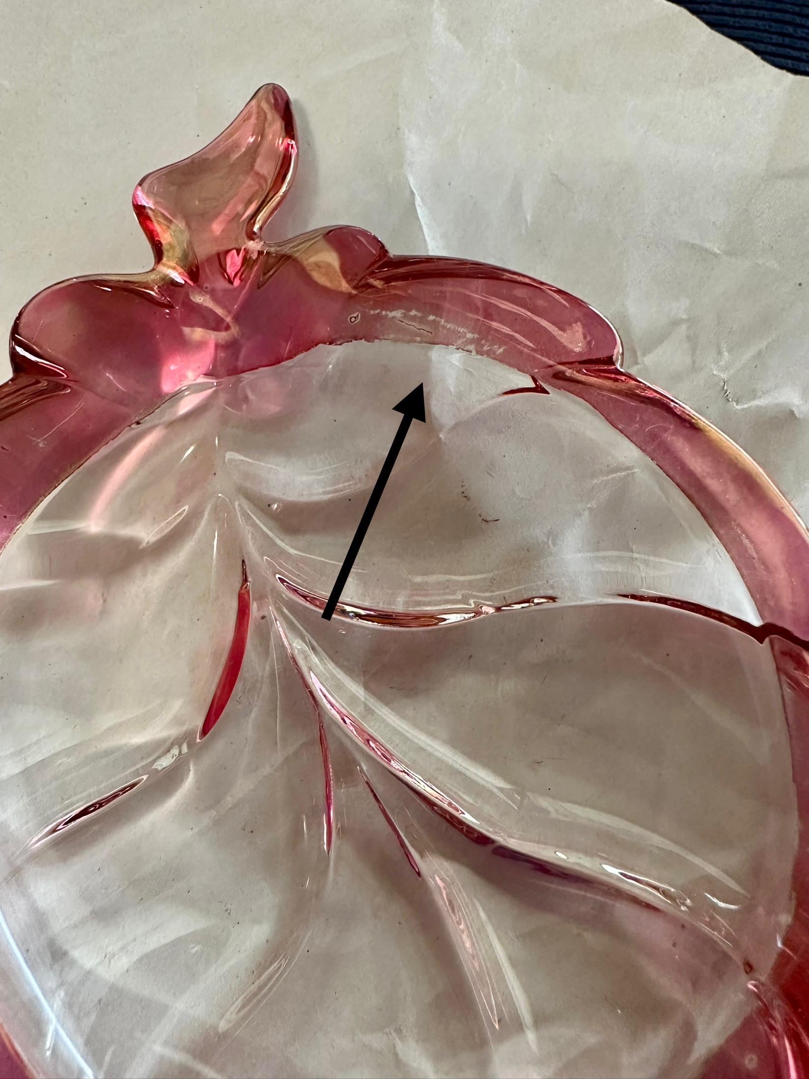This is a vintage pink leaf-shaped trinket dish. There is a scuff on the bottom of the dish from where it was placed. Due to age, some of the coloration is missing; pictures are included. Please contact the seller if you have any questions or would like to make an offer.