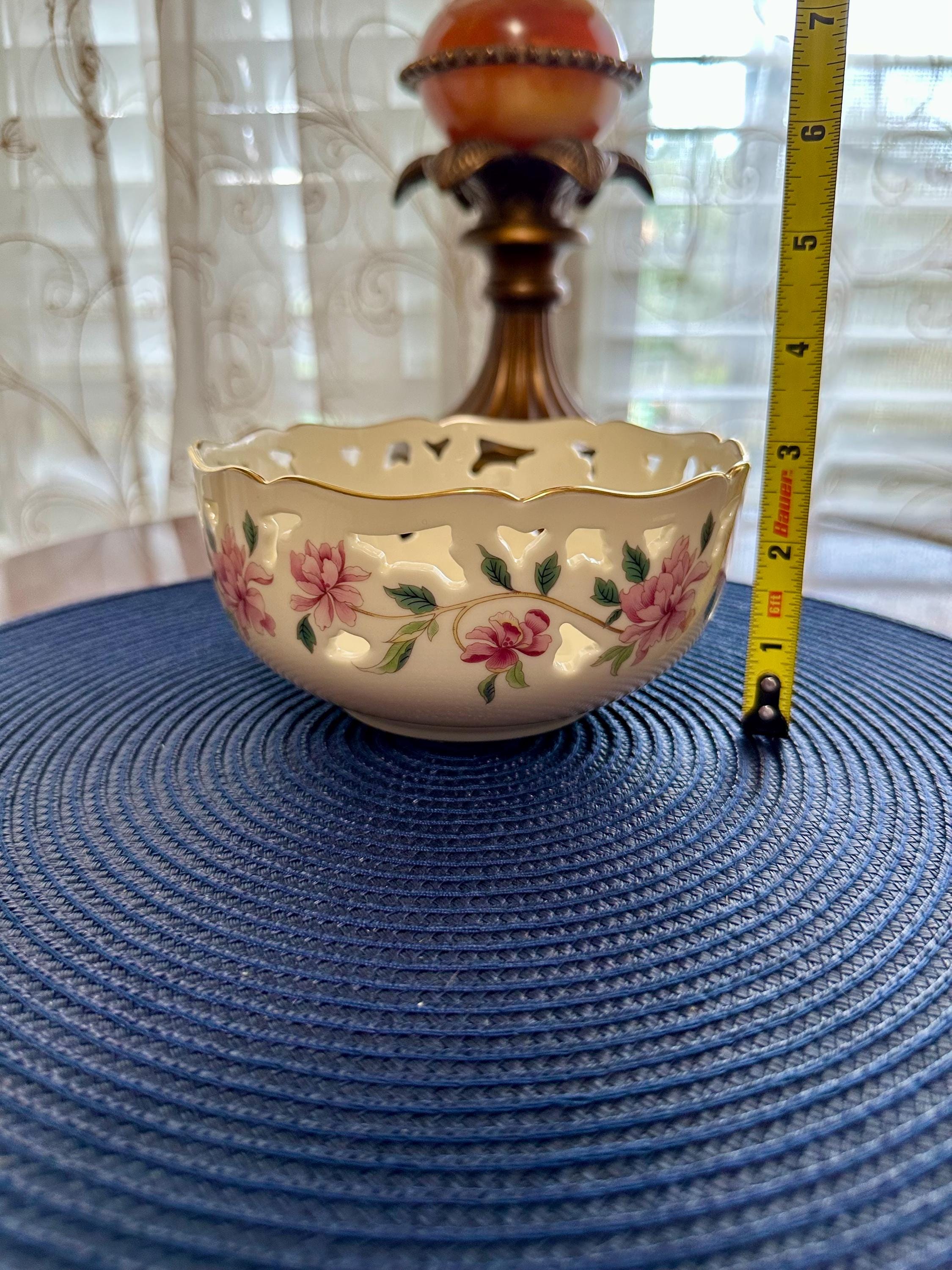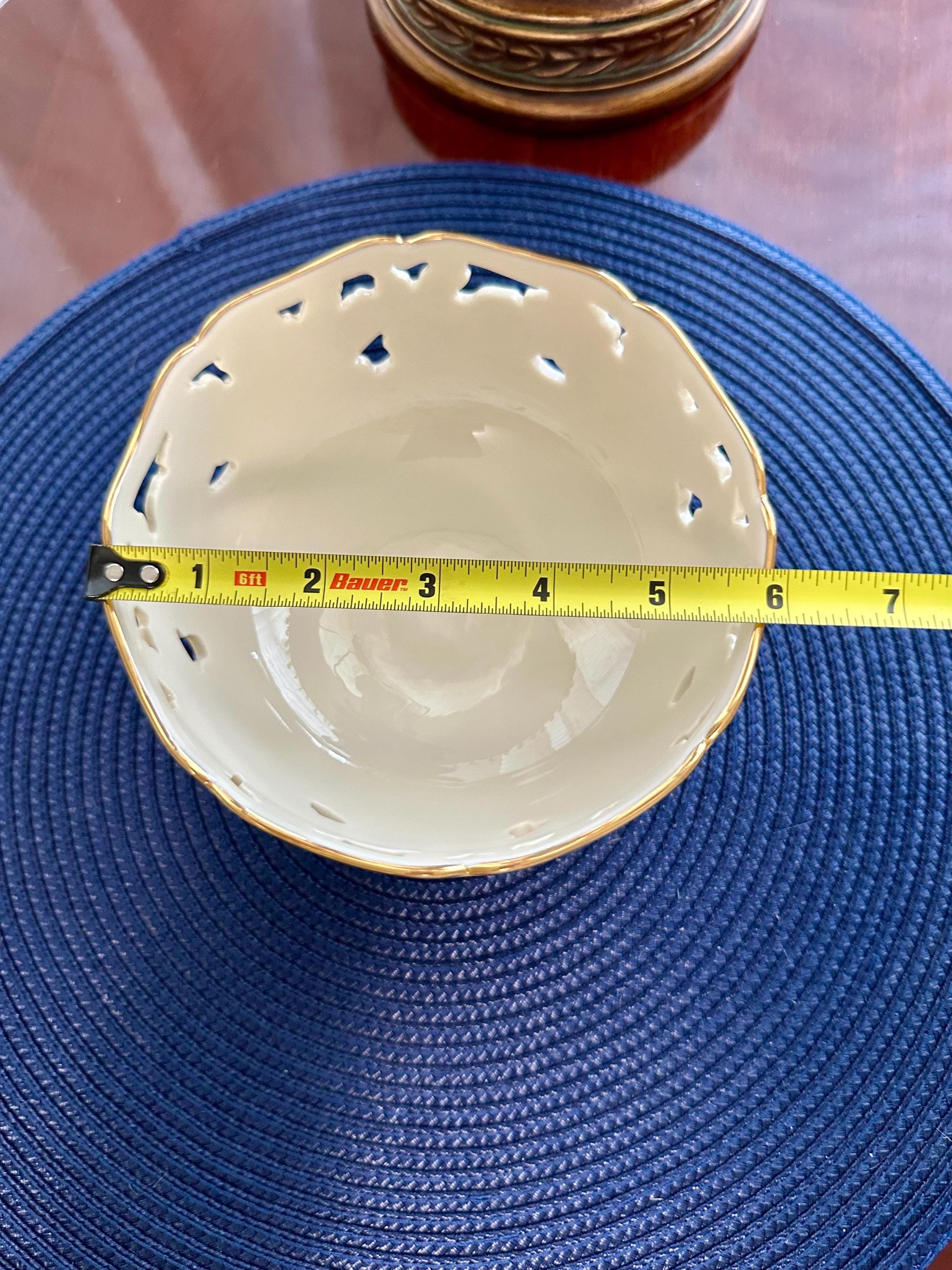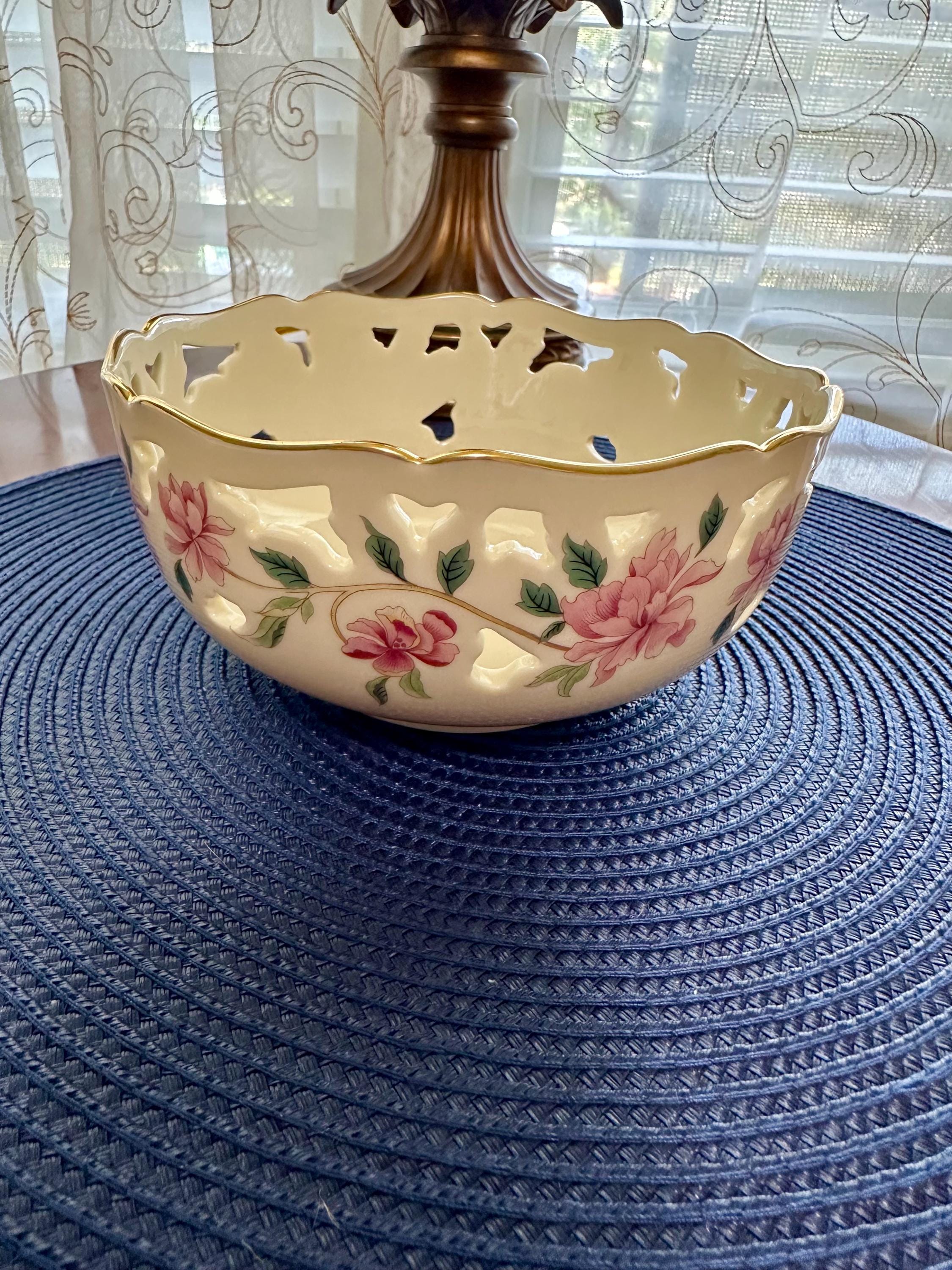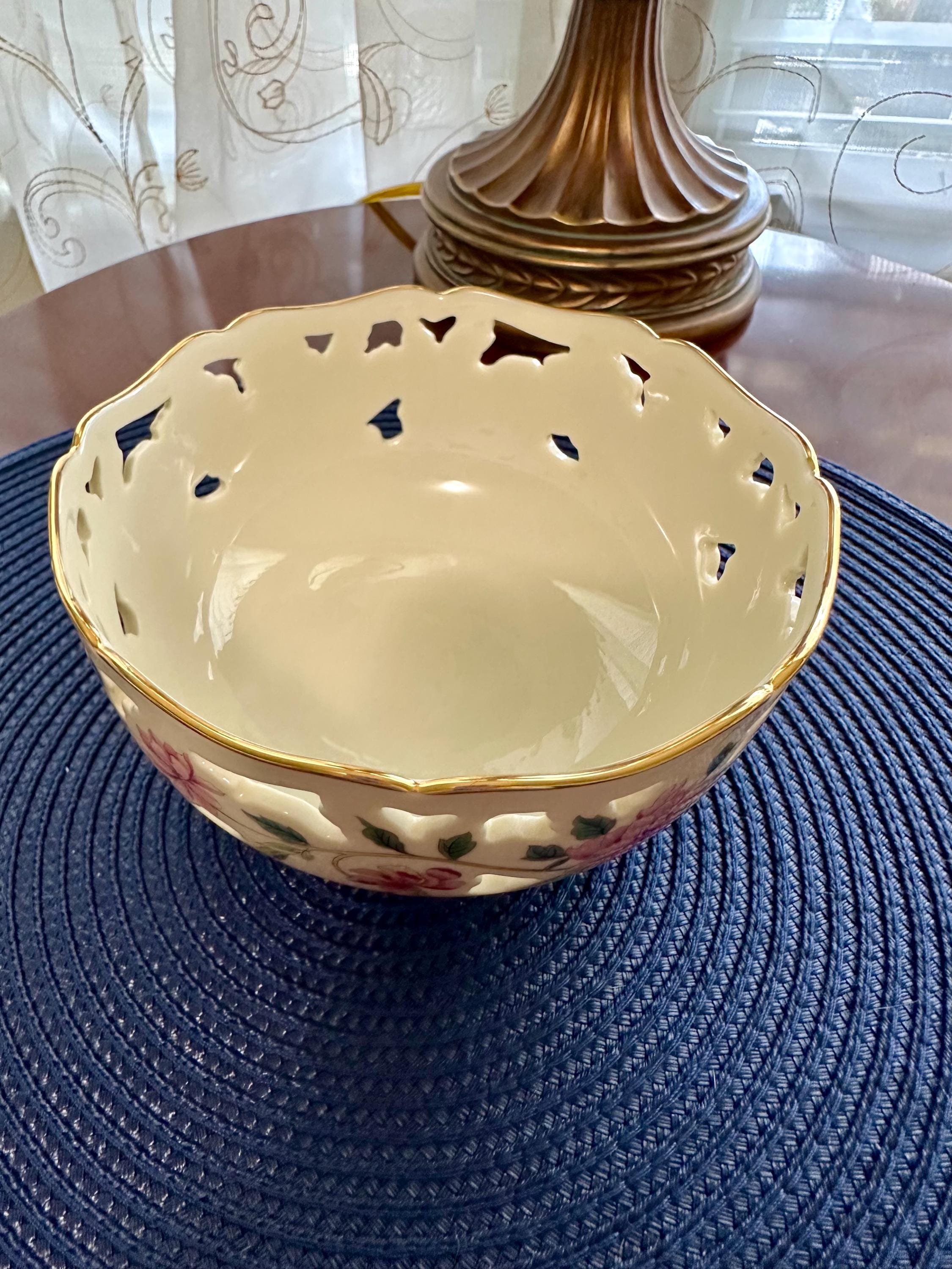 From the Lenox Barrington Collection, this USA-made gold-trimmed bowl is a must-have for your home. This is an ivory bowl with pink flowers and green leaves painted on it. This was made between 1988-1999. There are no chips, cracks, or crazing. This does not come in the original box, however, it will be packaged with care. Please contact us if you have any questions or would like to see more pictures. We have other "Lenox" items and fine china listed.