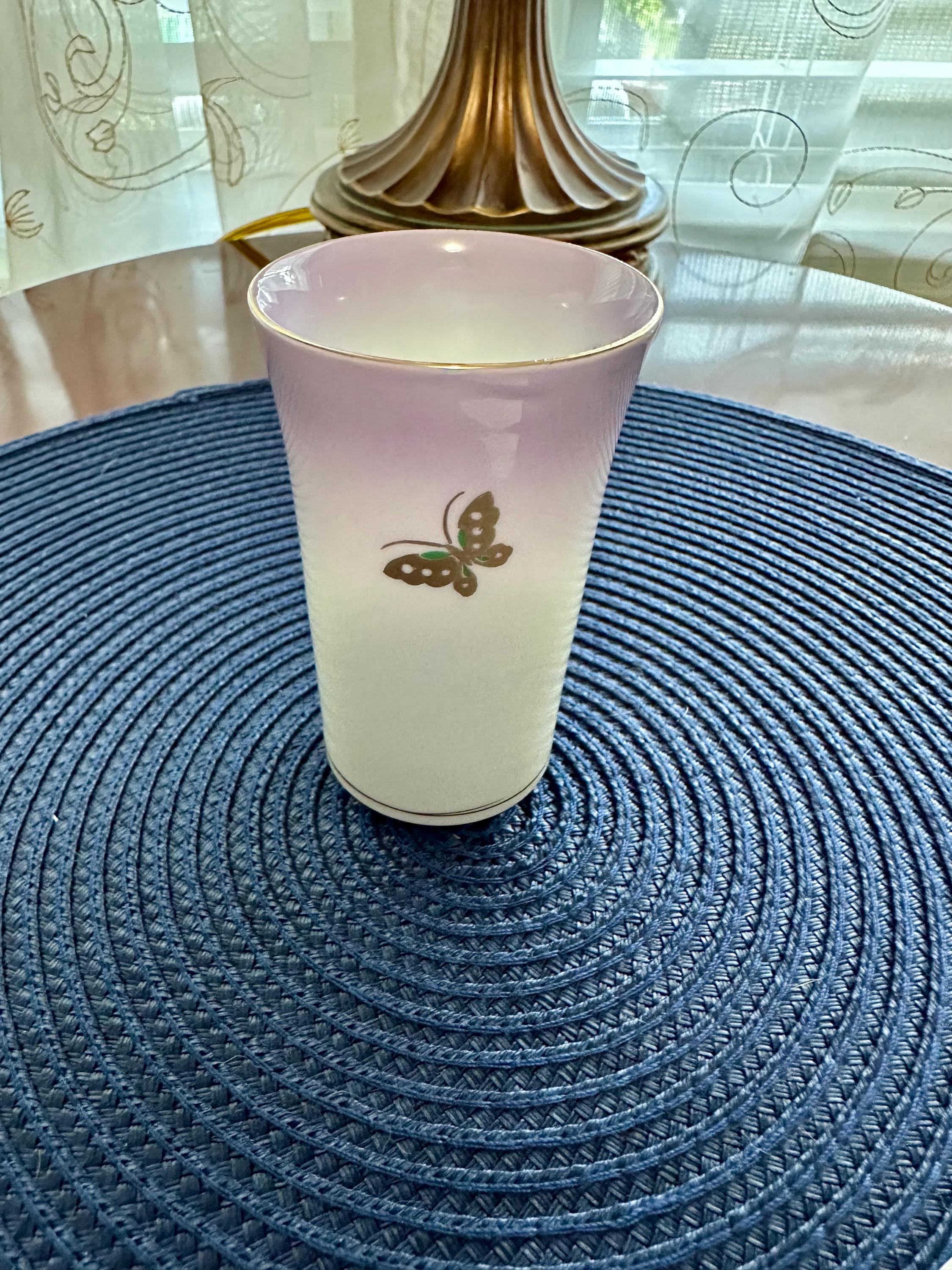 Vintage Japanese porcelain cup. This cup has delicate butterflies with a gold trim. The color of this cup is an ombre hue of beige into purple.