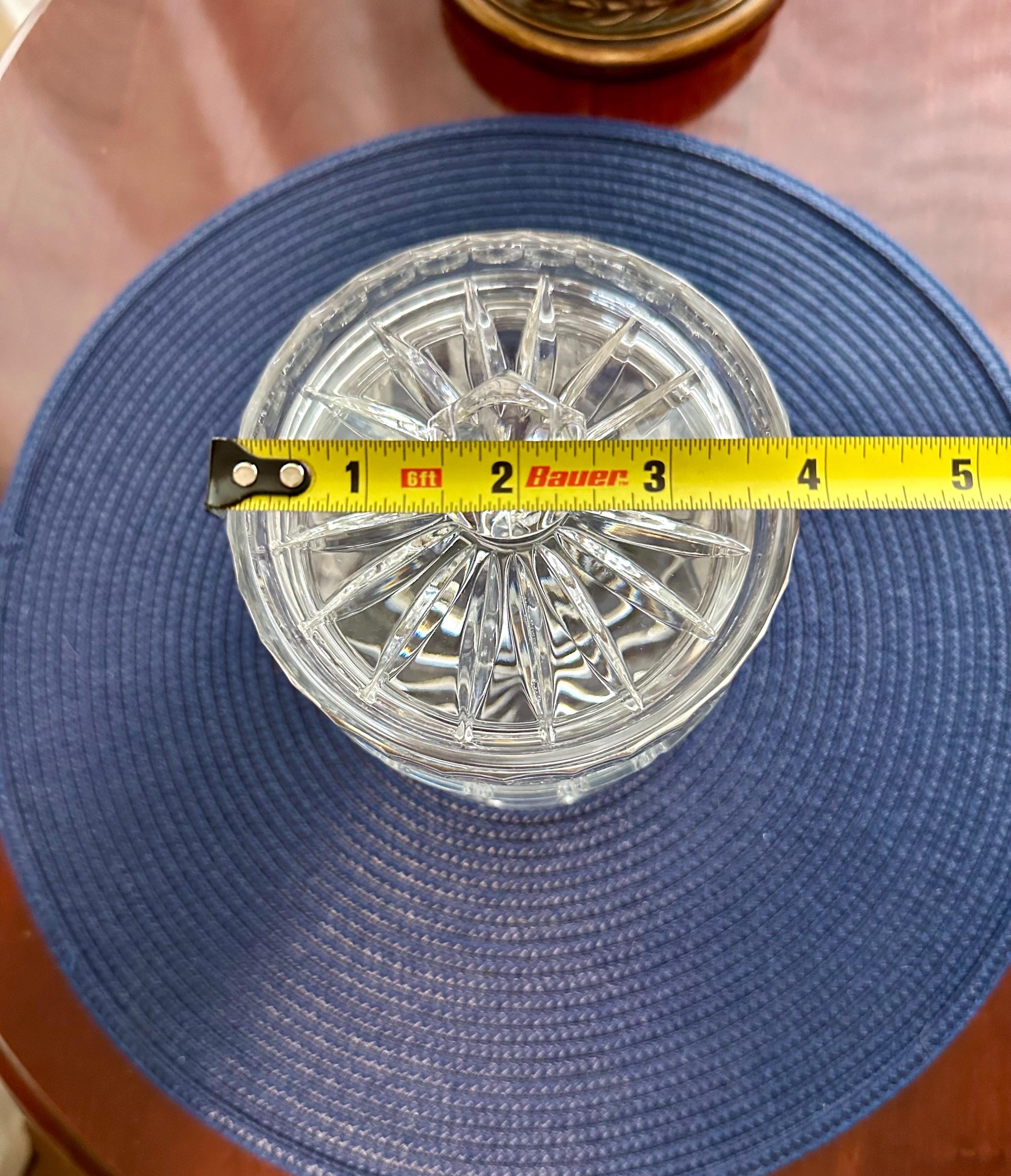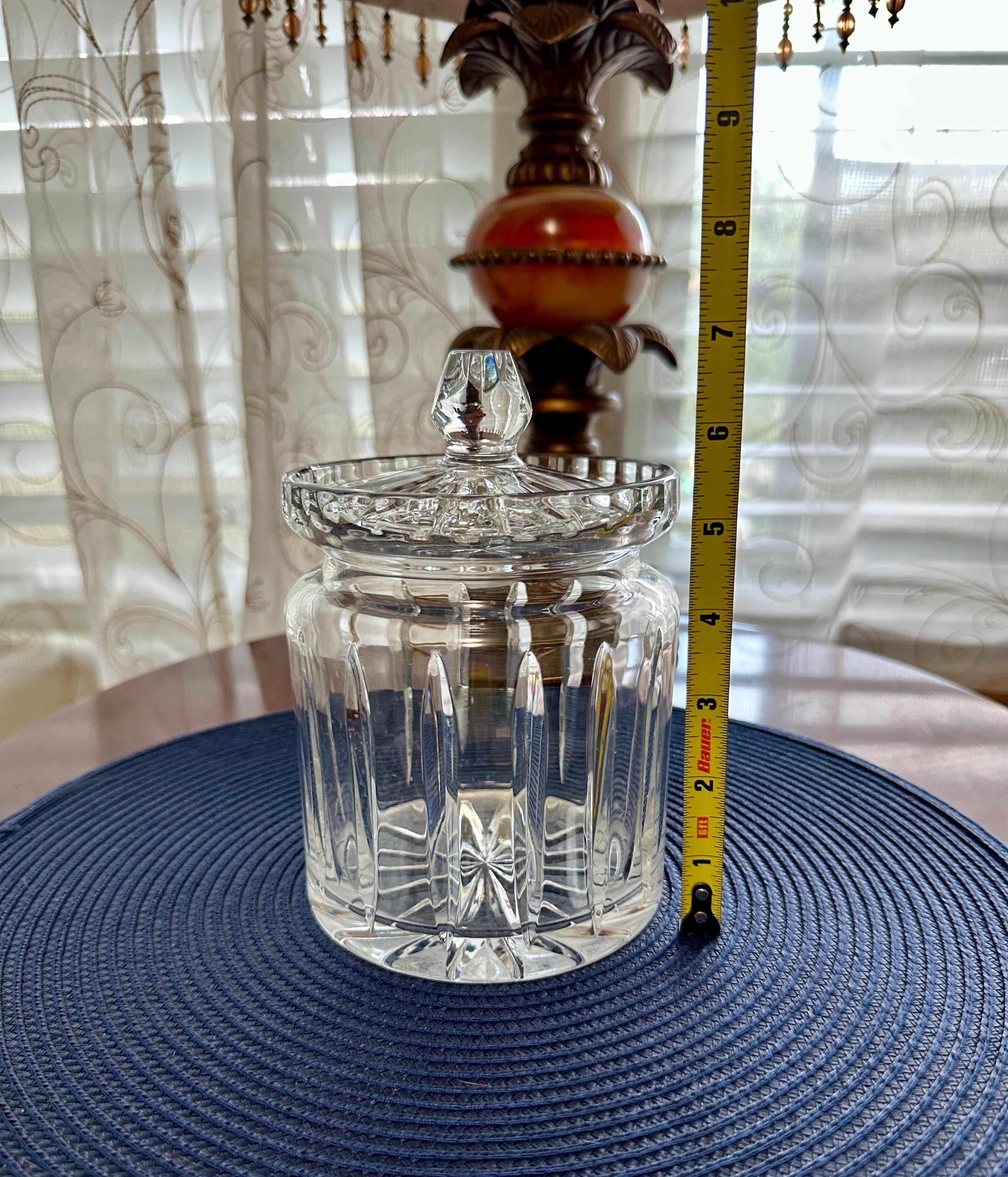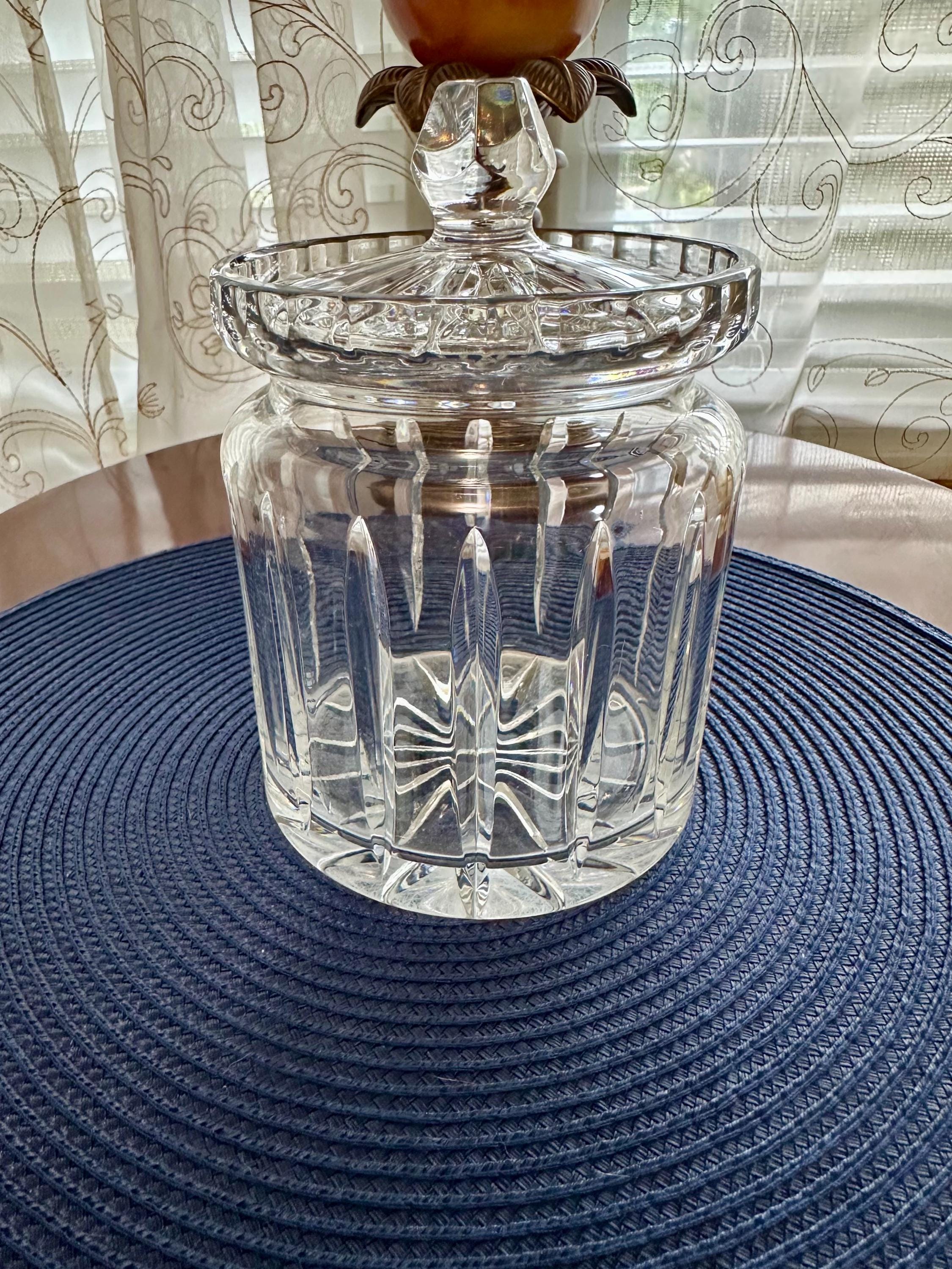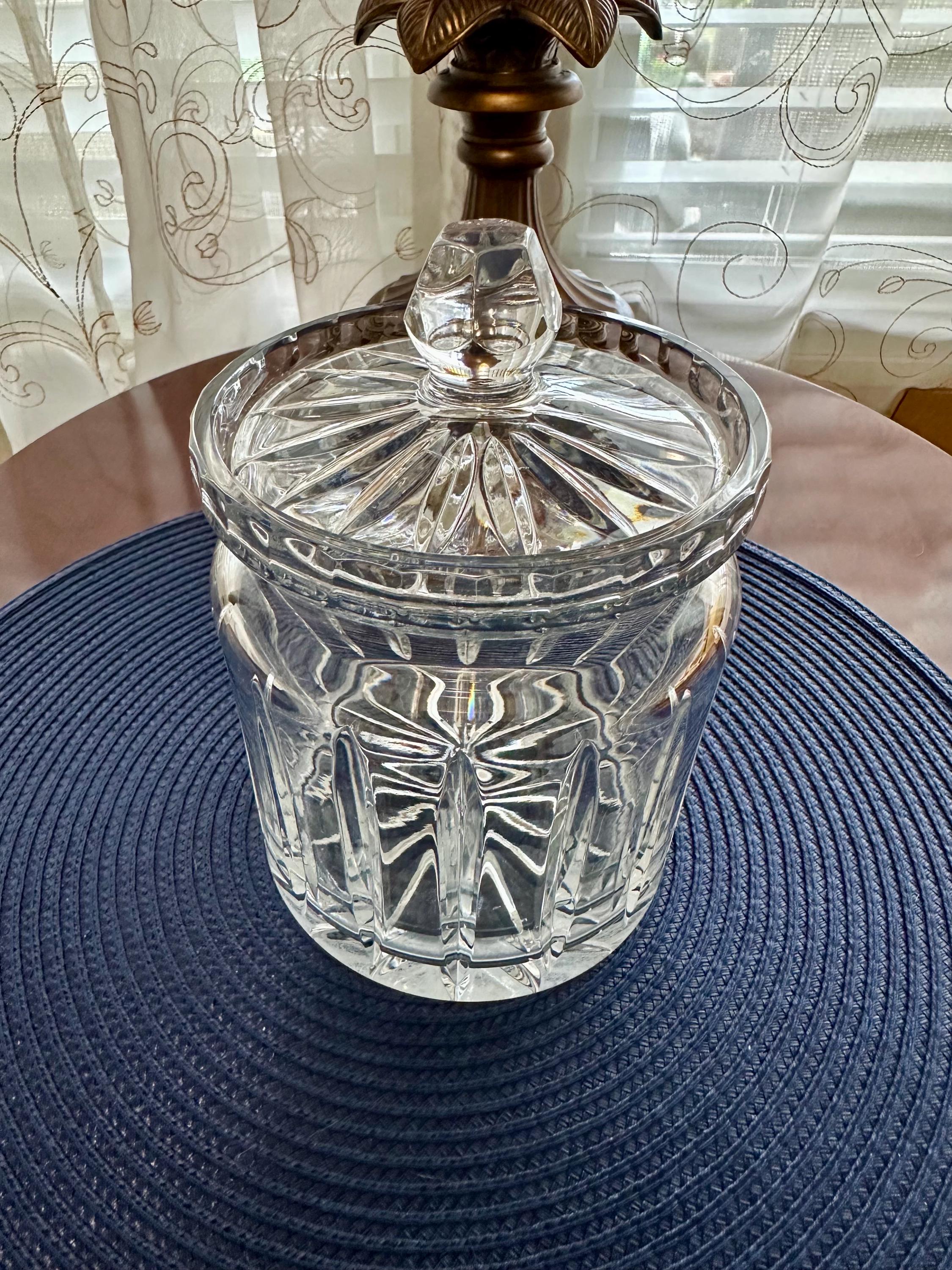 This is a beautiful crystal jar that can be used for candy or other trinkets you would like to display. This item does not have its original box but will be shipped with care. There are scratches on the bottom from where it was placed on the table. There is a bubble in the glass from manufacturing. On the lid there is a small ship. Please feel free to send an offer.