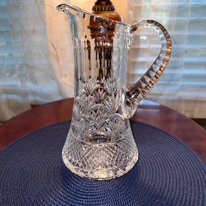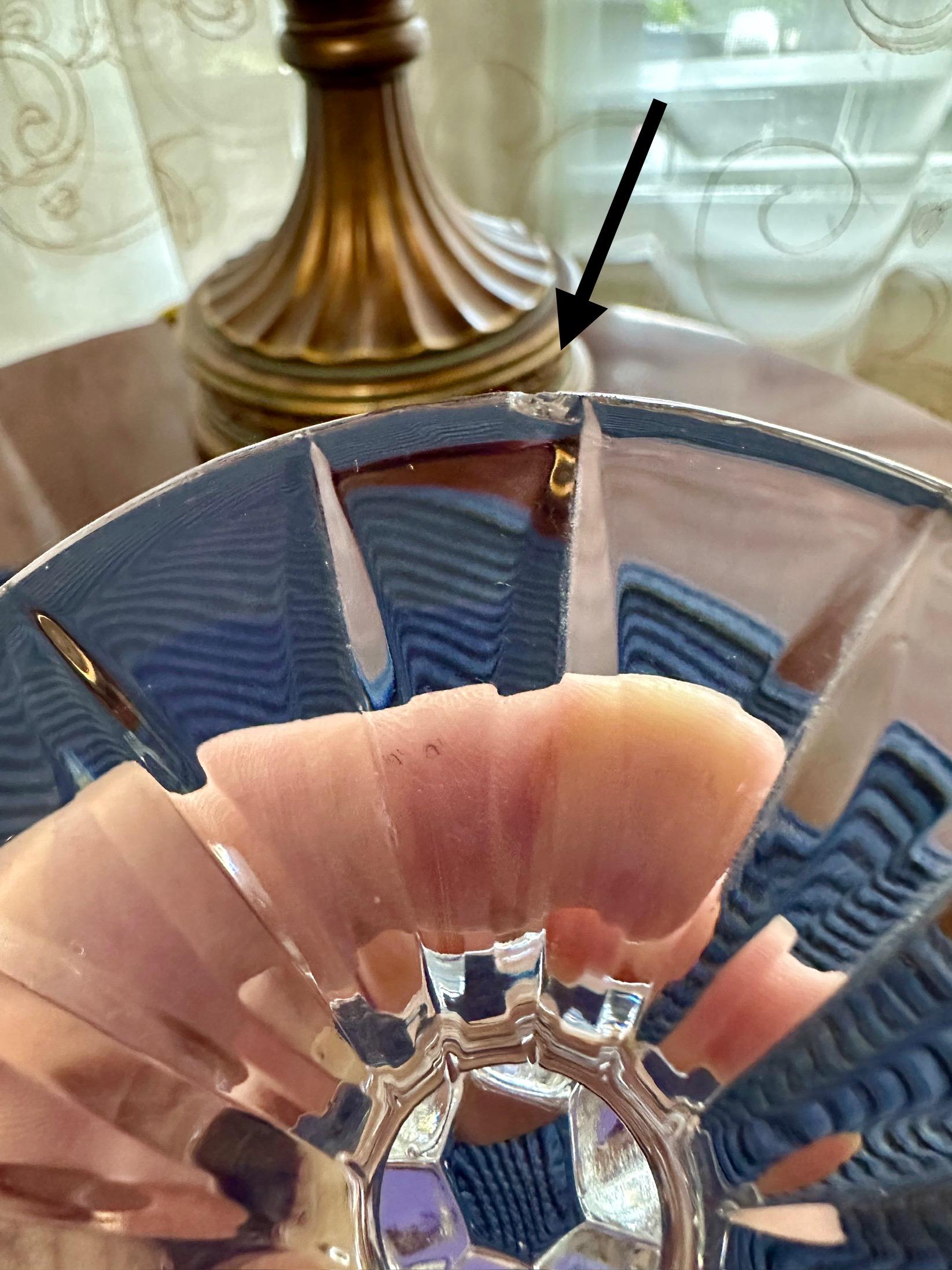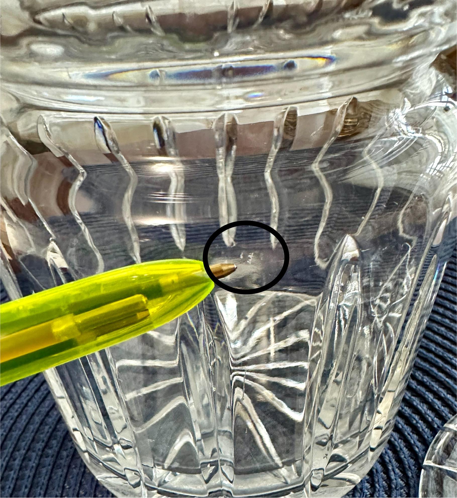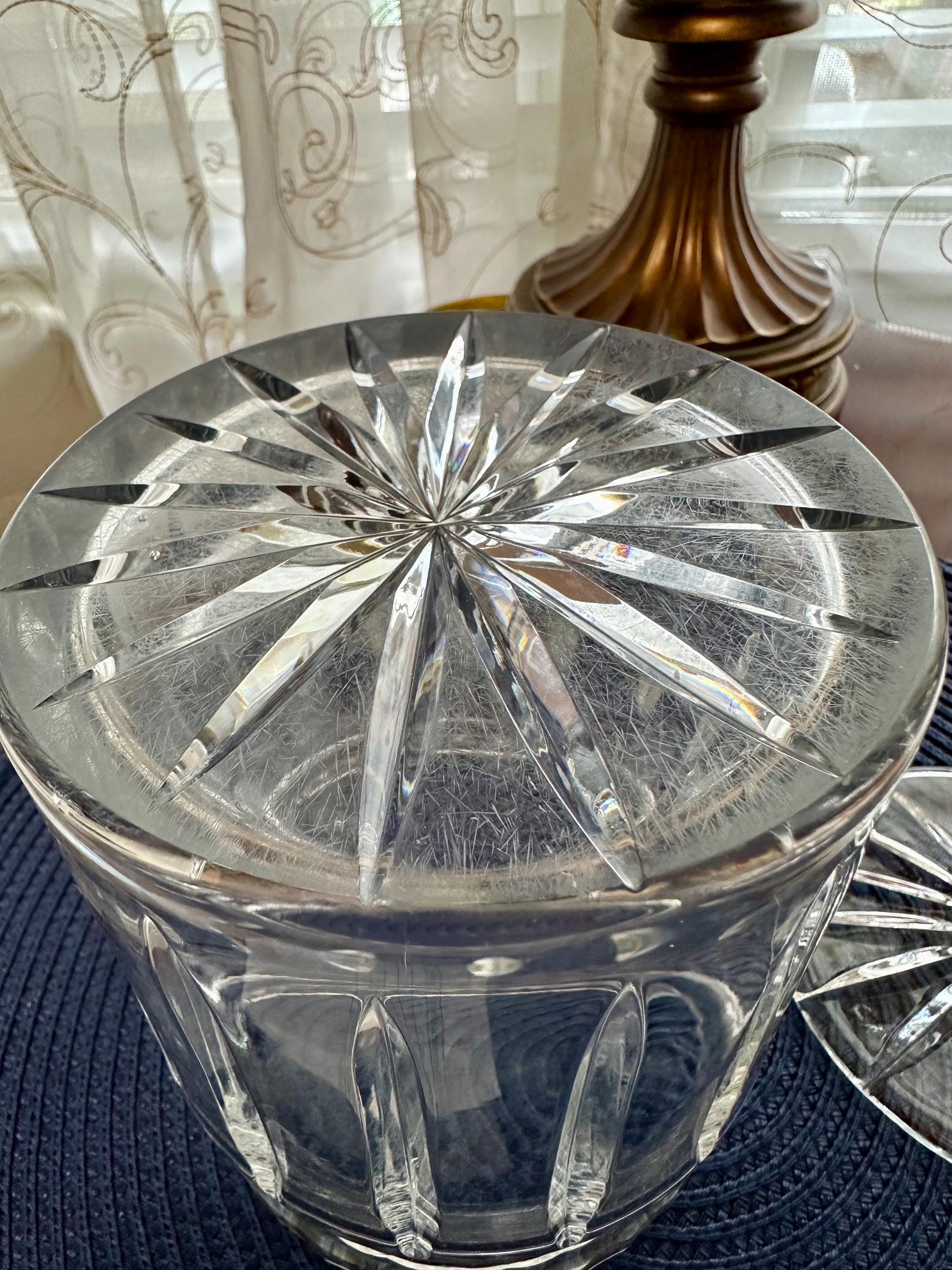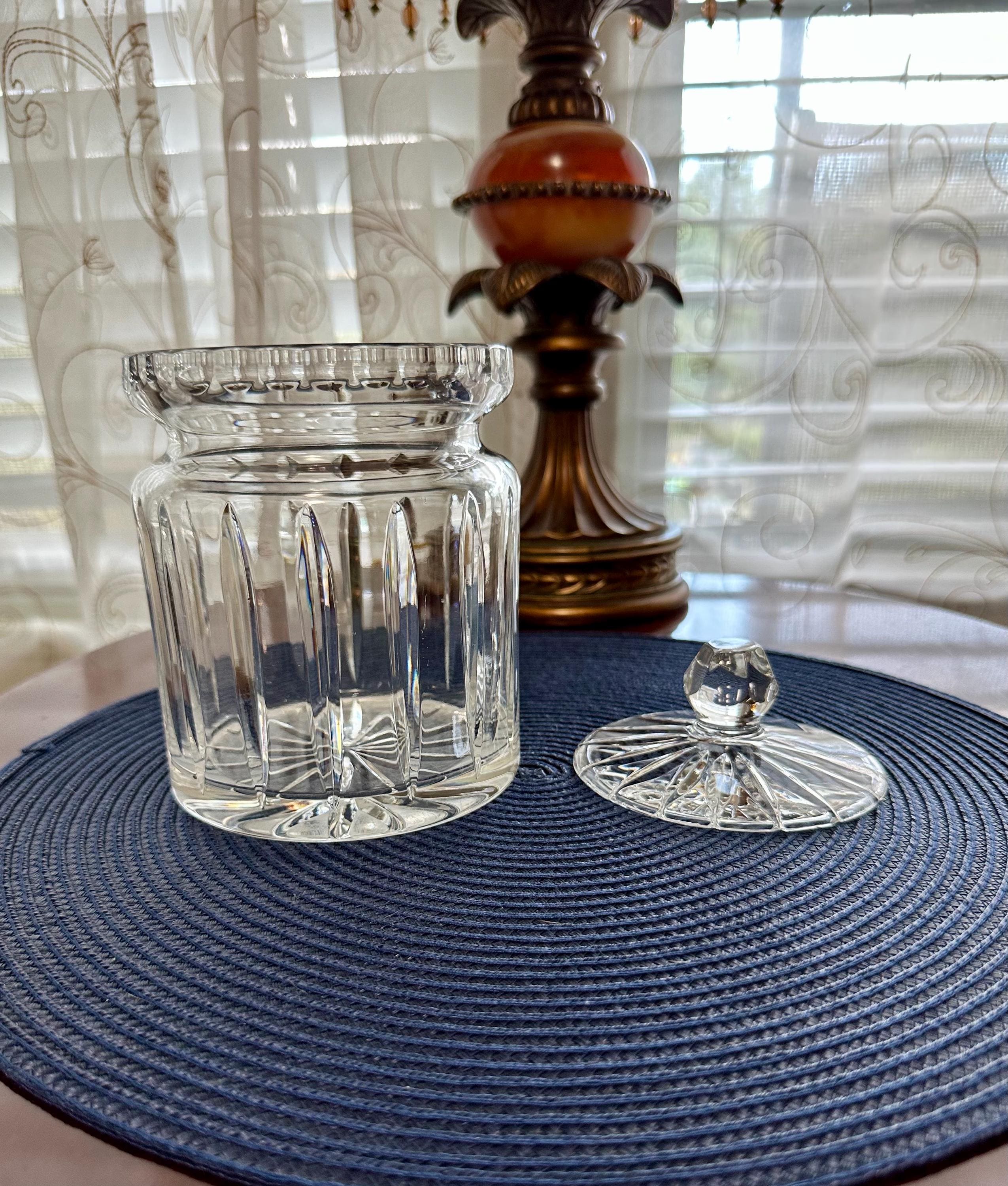 This is a beautiful crystal jar that can be used for candy or other trinkets you would like to display. This item does not have its original box but will be shipped with care. There are scratches on the bottom from where it was placed on the table. There is a bubble in the glass from manufacturing. On the lid there is a small ship. Please feel free to send an offer.