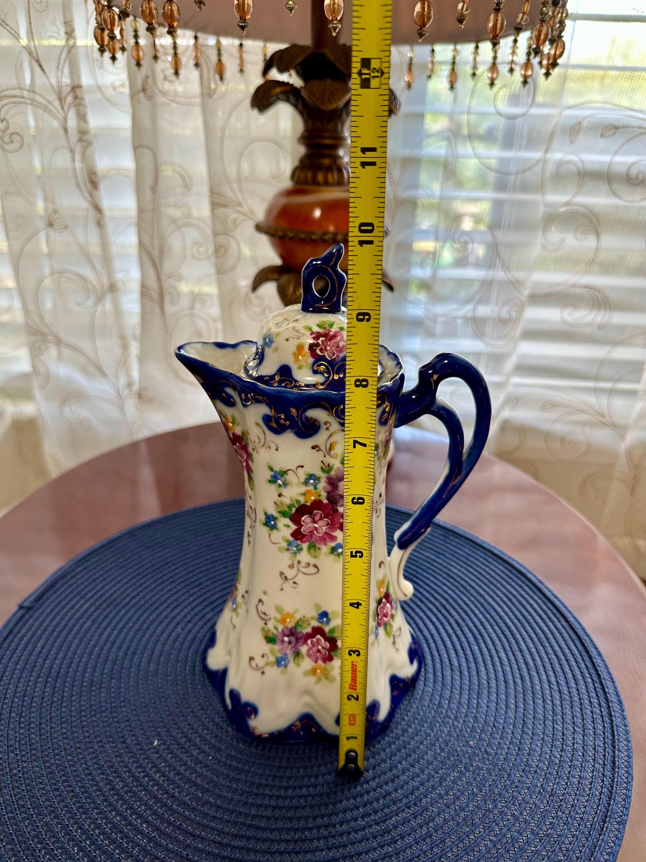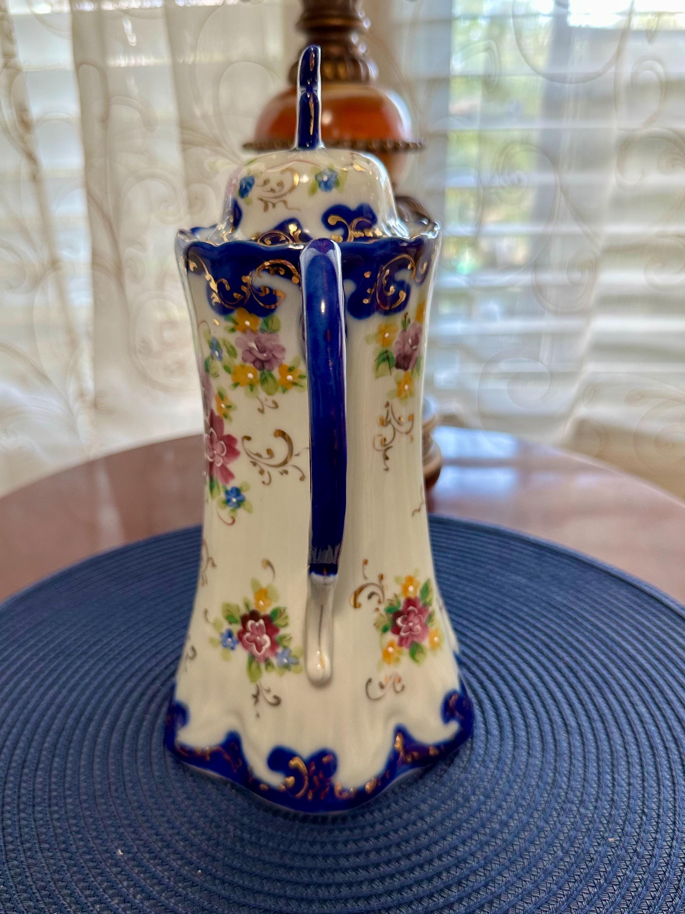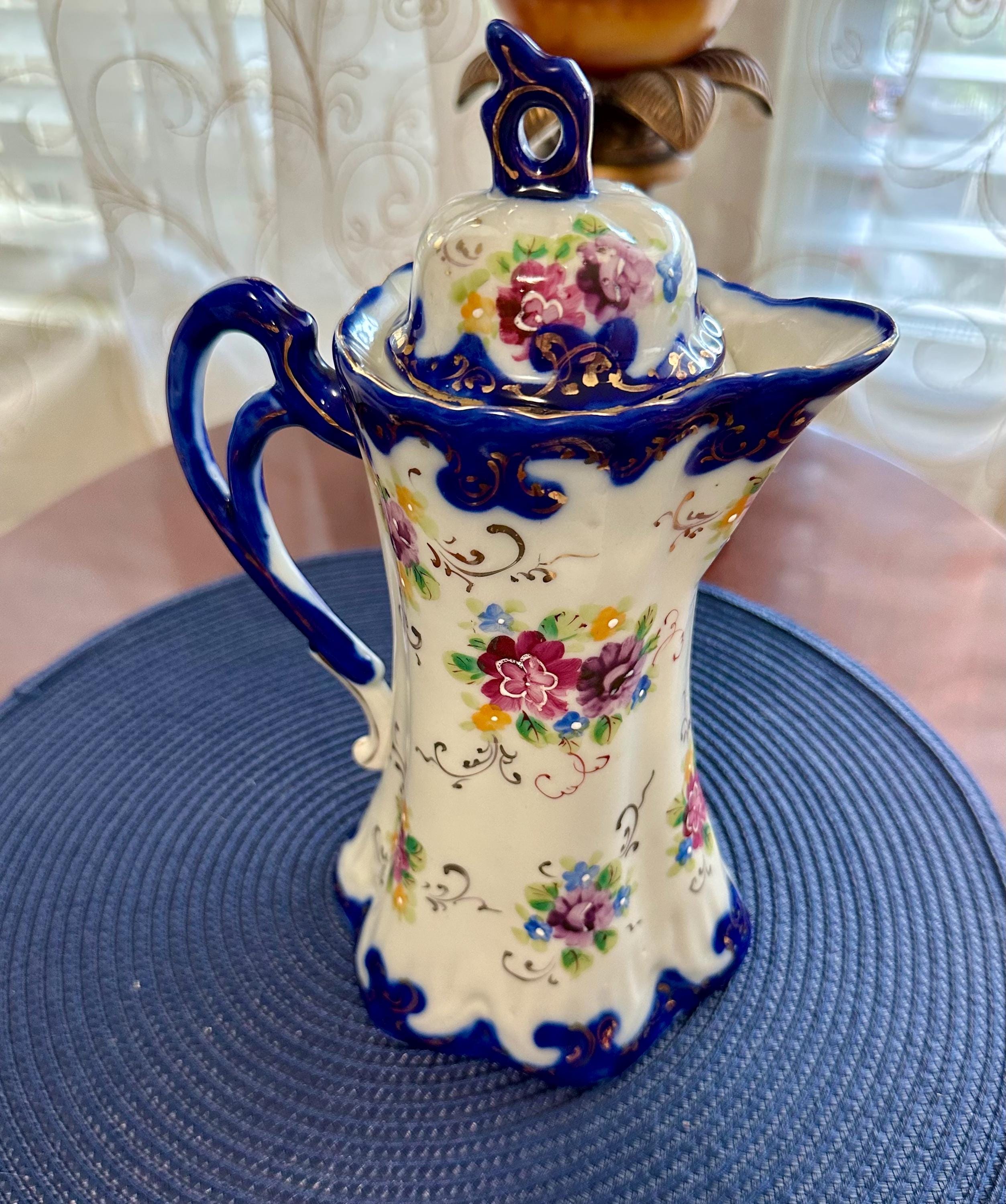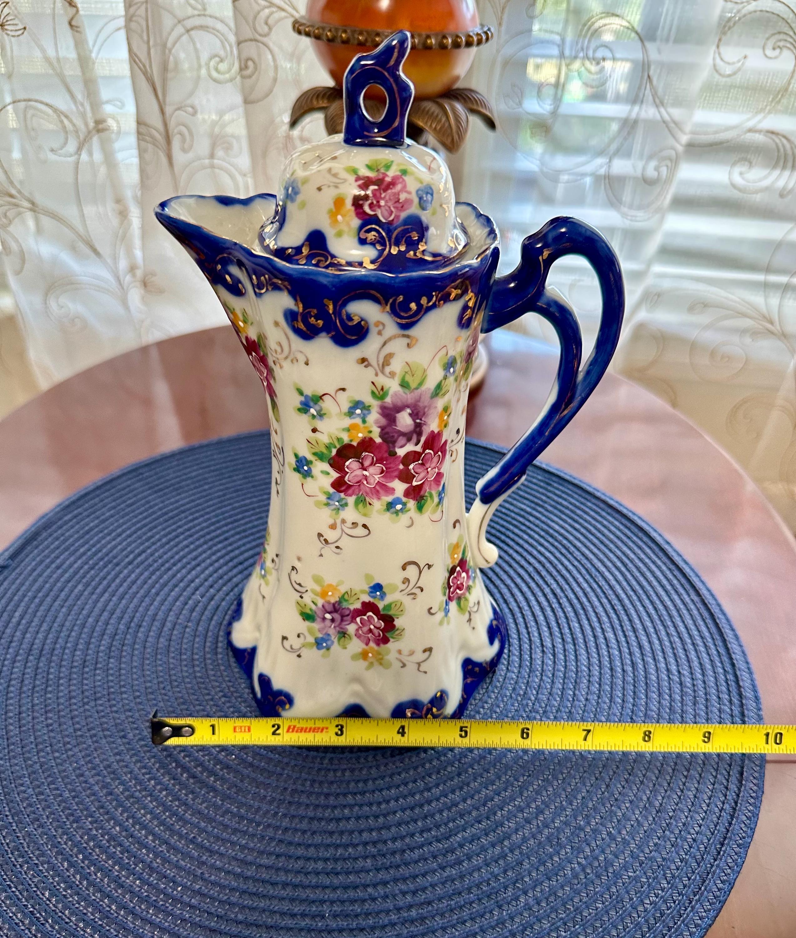 This is a rare hand-painted Japanese chocolate pot. This antique was made between 1945 to 1952. Trimmed in cobalt blue with hand-painted flowers. There is one small bubble in the porcelain from the manufacturer, but no cracks or crazing. This can hold water and will pour properly. If you are going to use this beautiful pot, you will need to hand-wash it. The price is not firm, and we will accept all reasonable offers. Please contact us if you have any questions or would like to make an offer.