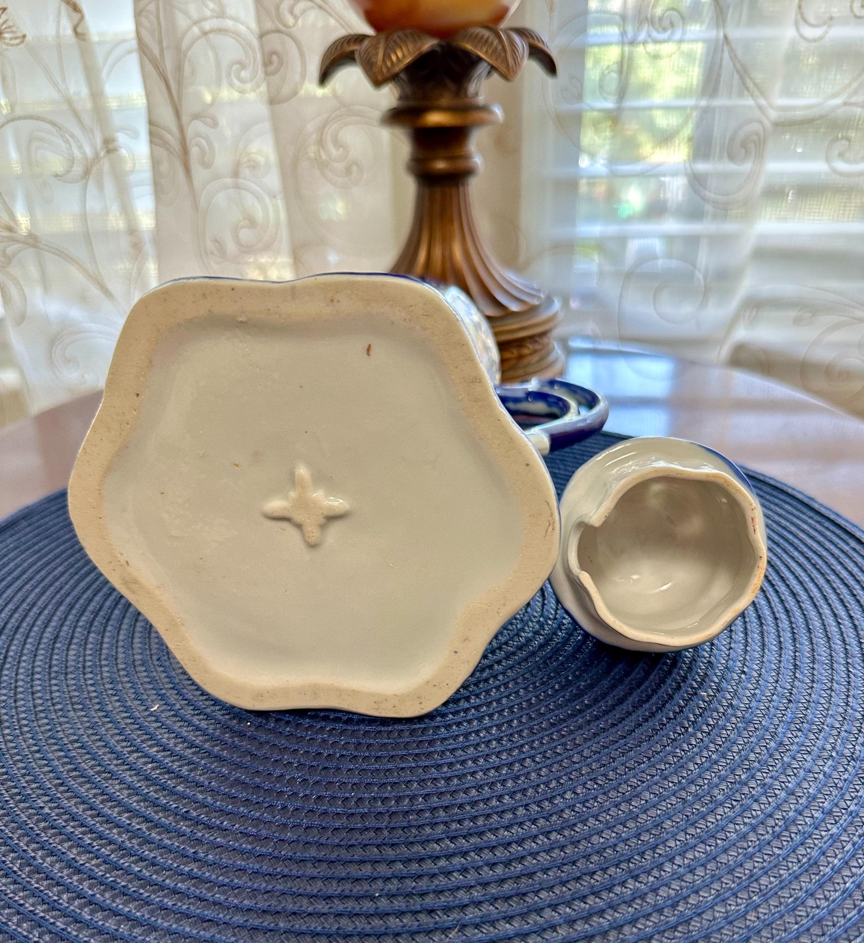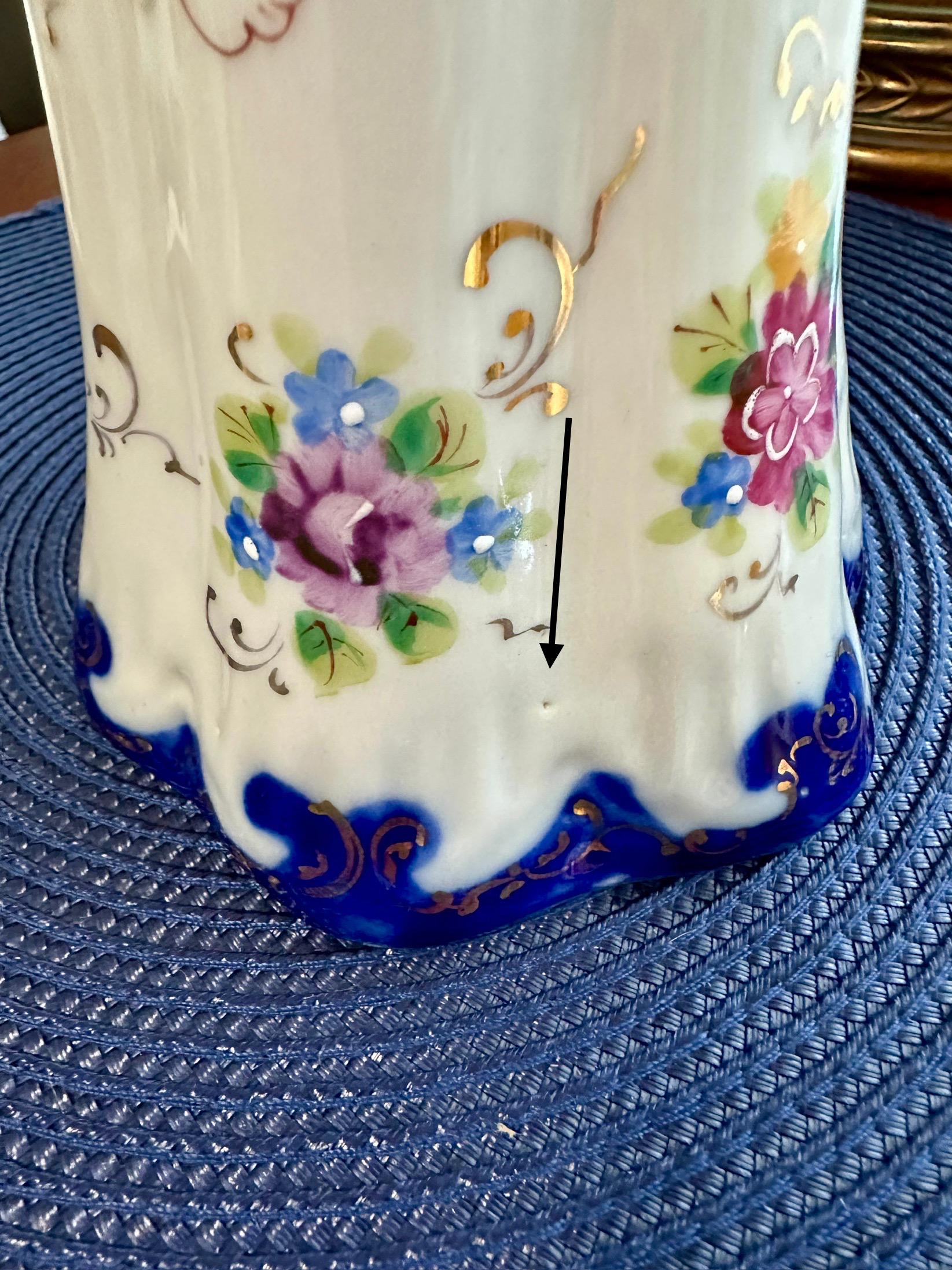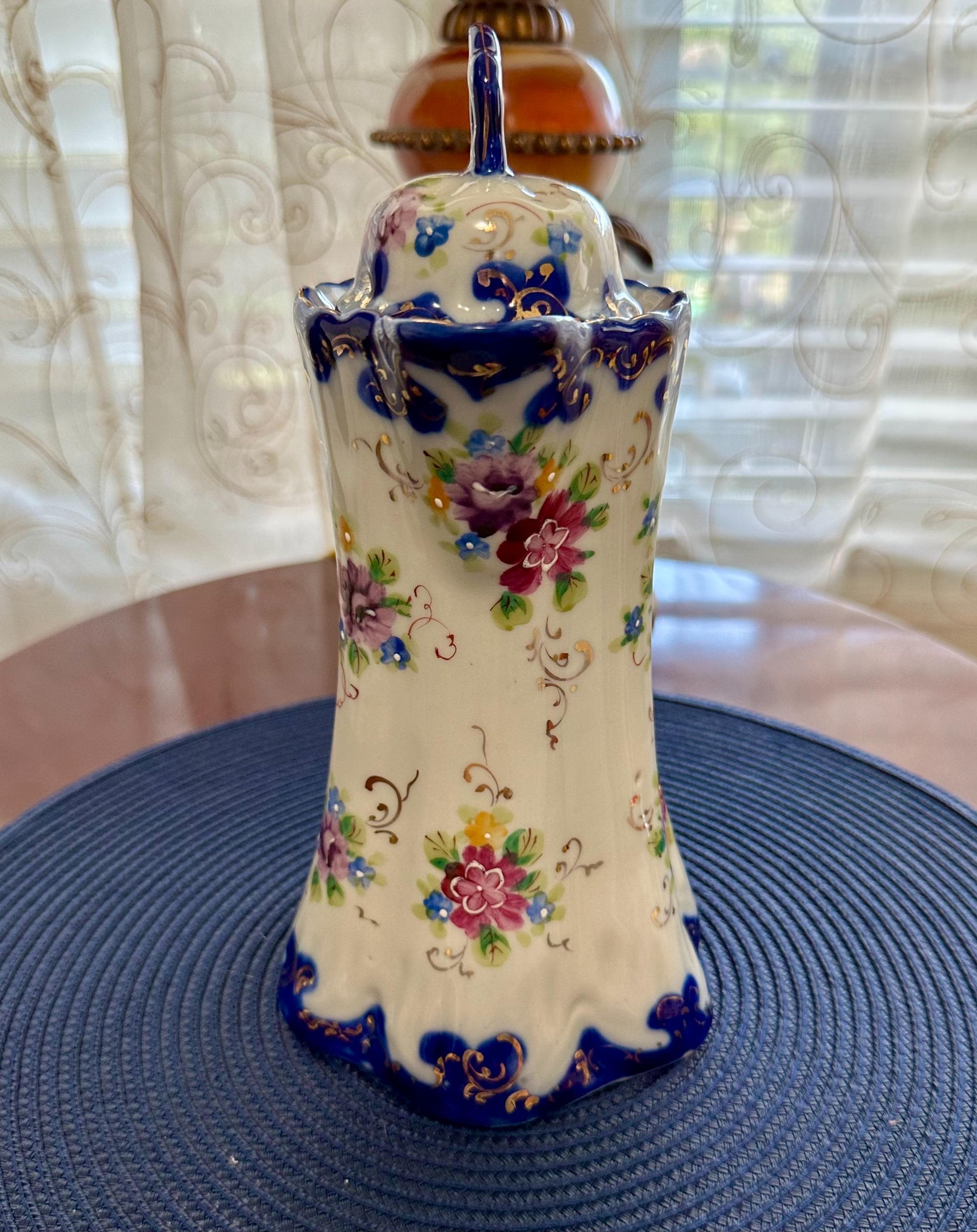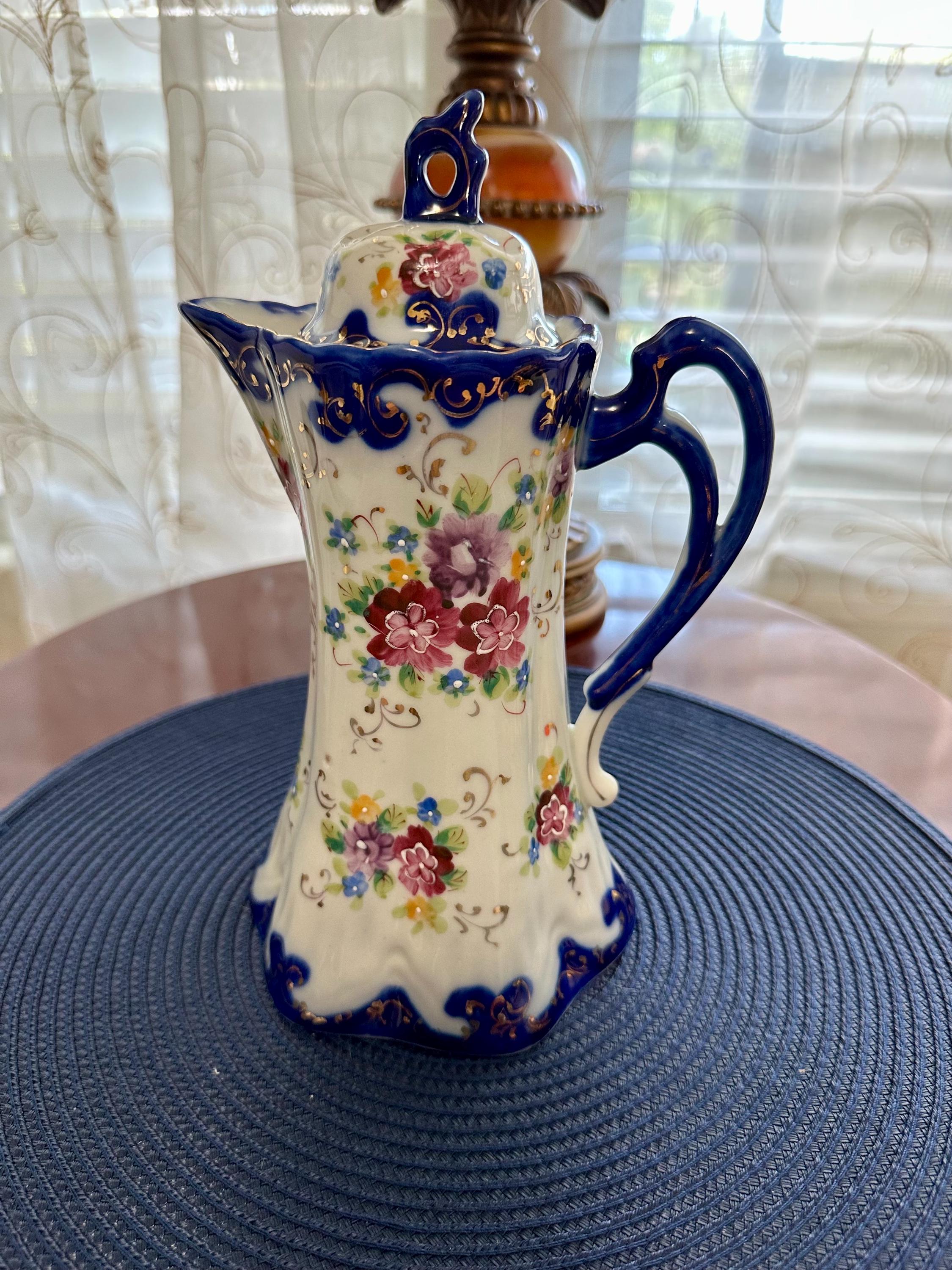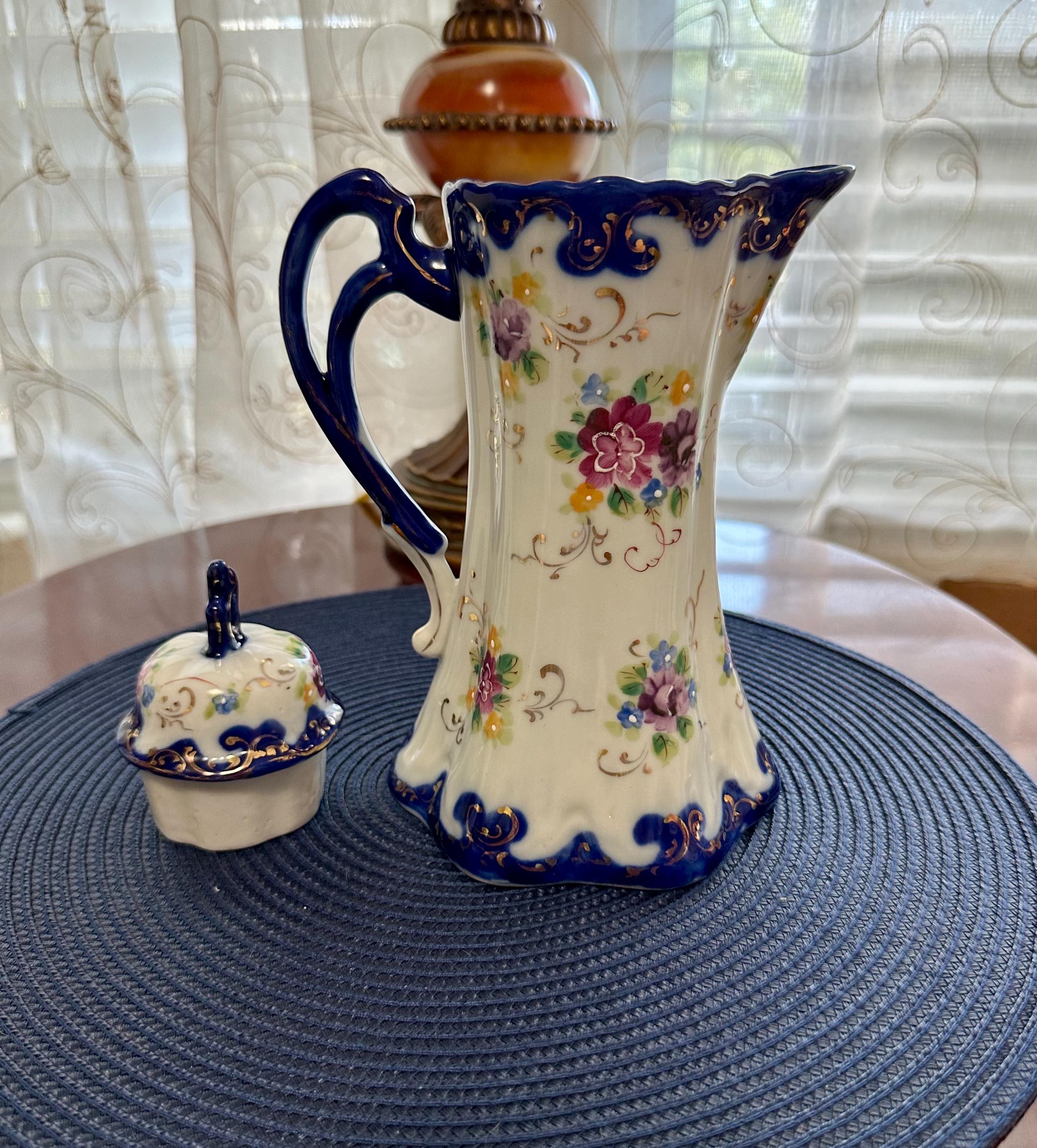 This is a rare hand-painted Japanese chocolate pot. This antique was made between 1945 to 1952. Trimmed in cobalt blue with hand-painted flowers. There is one small bubble in the porcelain from the manufacturer, but no cracks or crazing. This can hold water and will pour properly. If you are going to use this beautiful pot, you will need to hand-wash it. The price is not firm, and we will accept all reasonable offers. Please contact us if you have any questions or would like to make an offer.