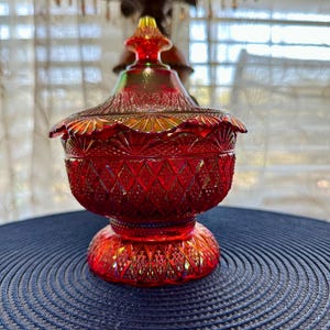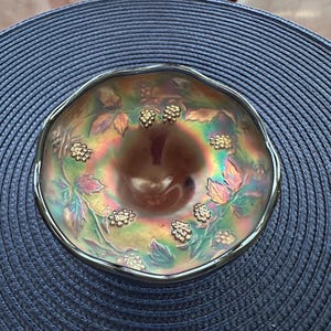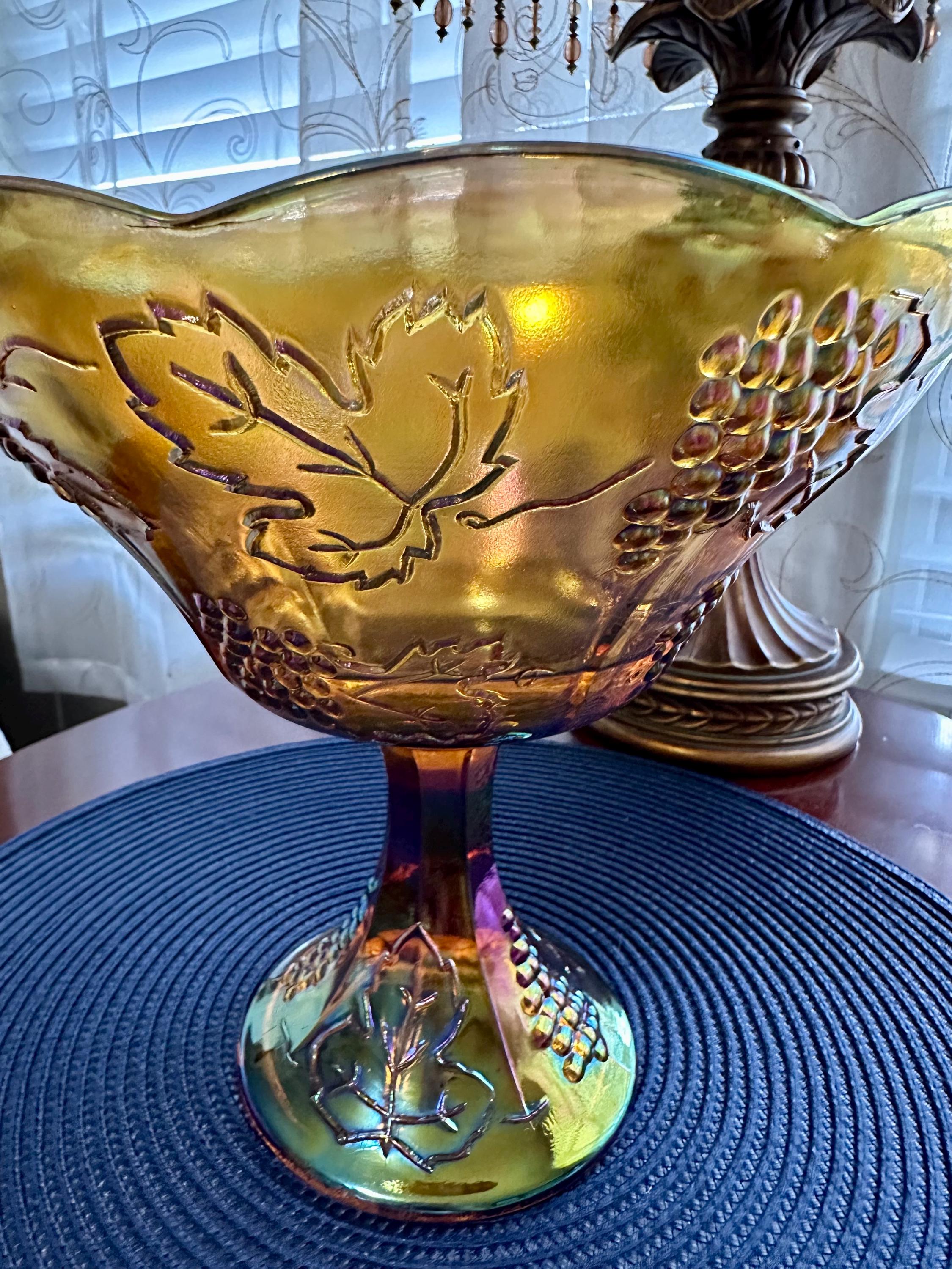 This is a vintage Indiana glass bowl named “wedding bowl” from the 1970s. Though this was typically given as a wedding gift, it has many uses. This bowl has a beautiful and unique metallic/iridescent marigold color with a “harvest” pattern of grapes and leaves. There is a small chip on the edge (picture included). We carry other Indiana glass and carnival glass. Please feel free to send an offer, or if you would like additional details.
