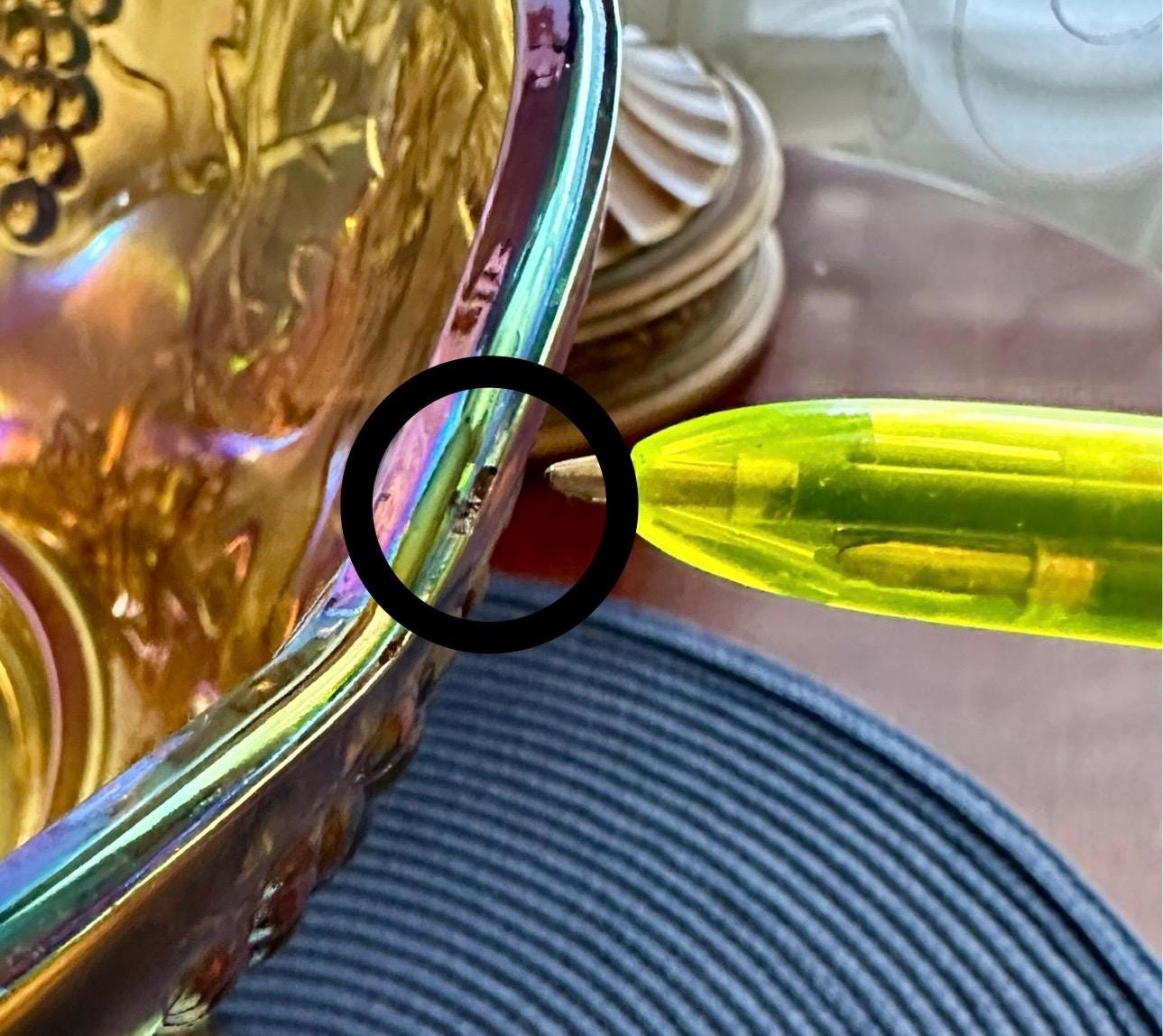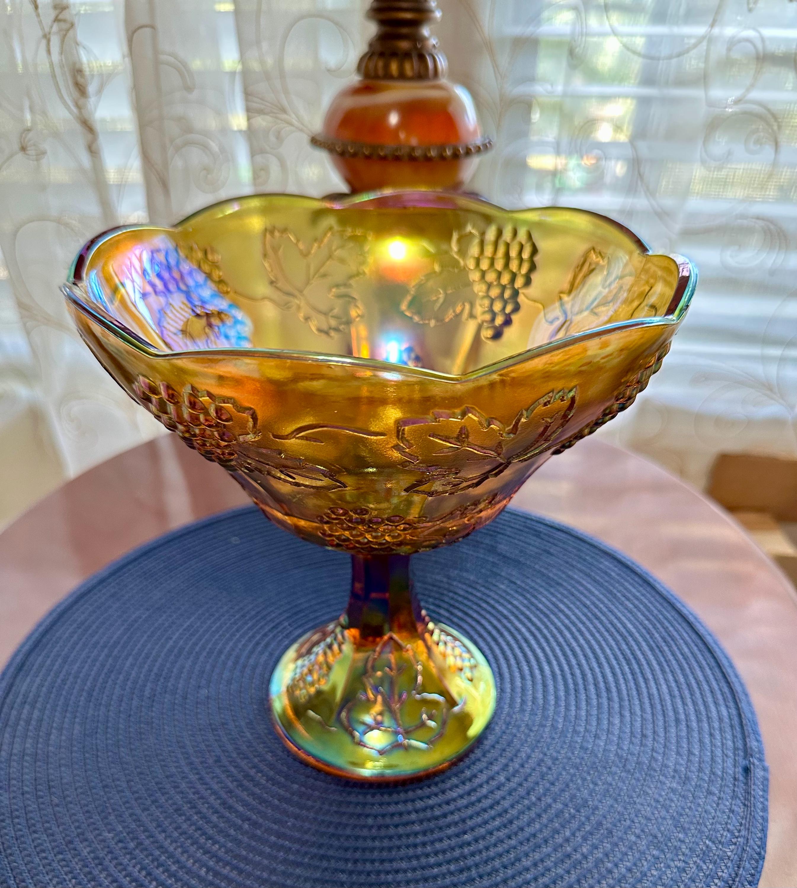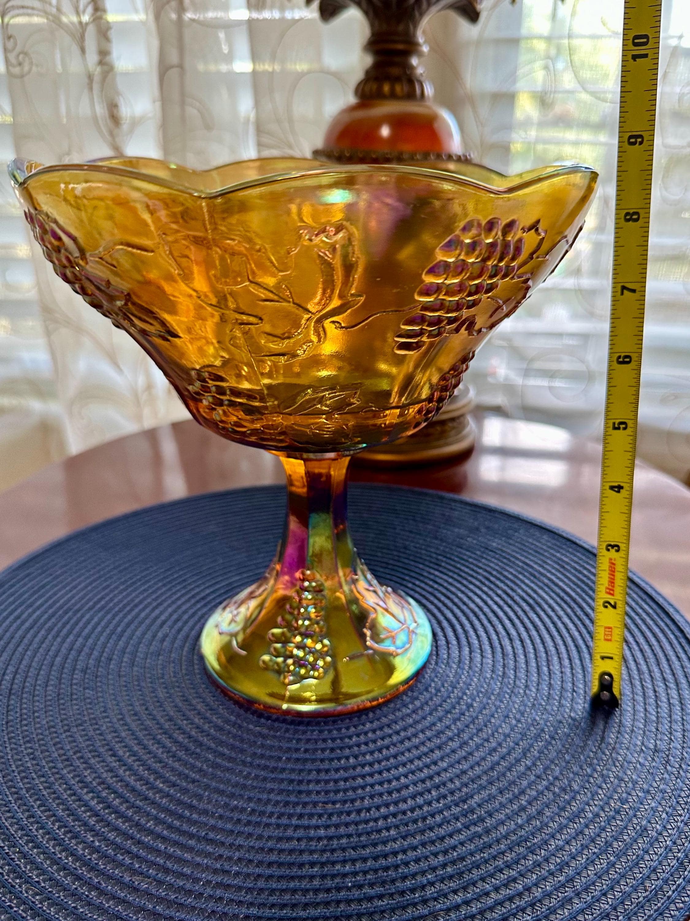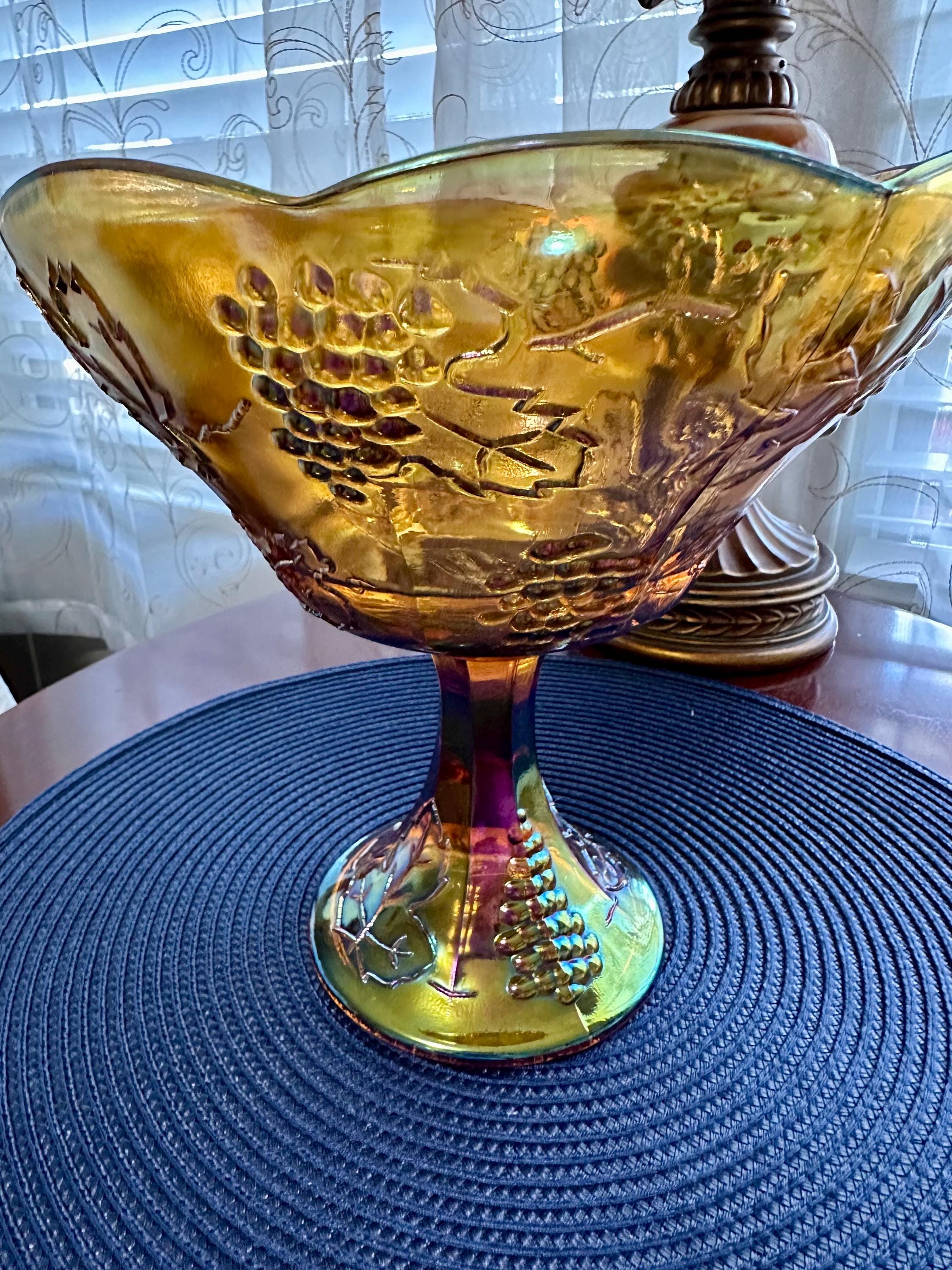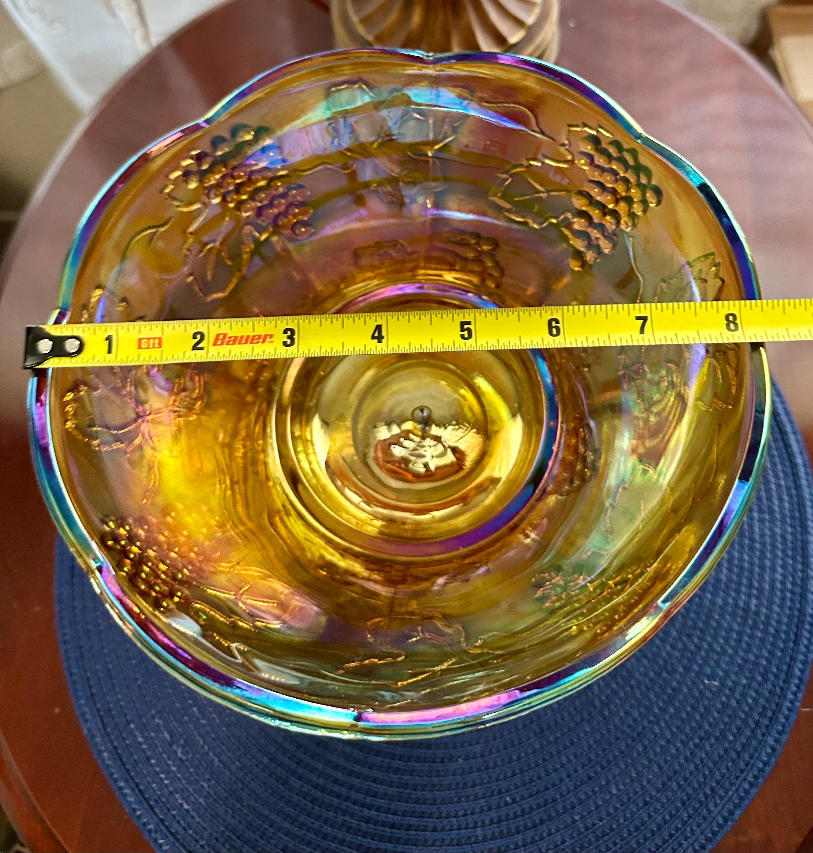 This is a vintage Indiana glass bowl named “wedding bowl” from the 1970s. Though this was typically given as a wedding gift, it has many uses. This bowl has a beautiful and unique metallic/iridescent marigold color with a “harvest” pattern of grapes and leaves. There is a small chip on the edge (picture included). We carry other Indiana glass and carnival glass. Please feel free to send an offer, or if you would like additional details.