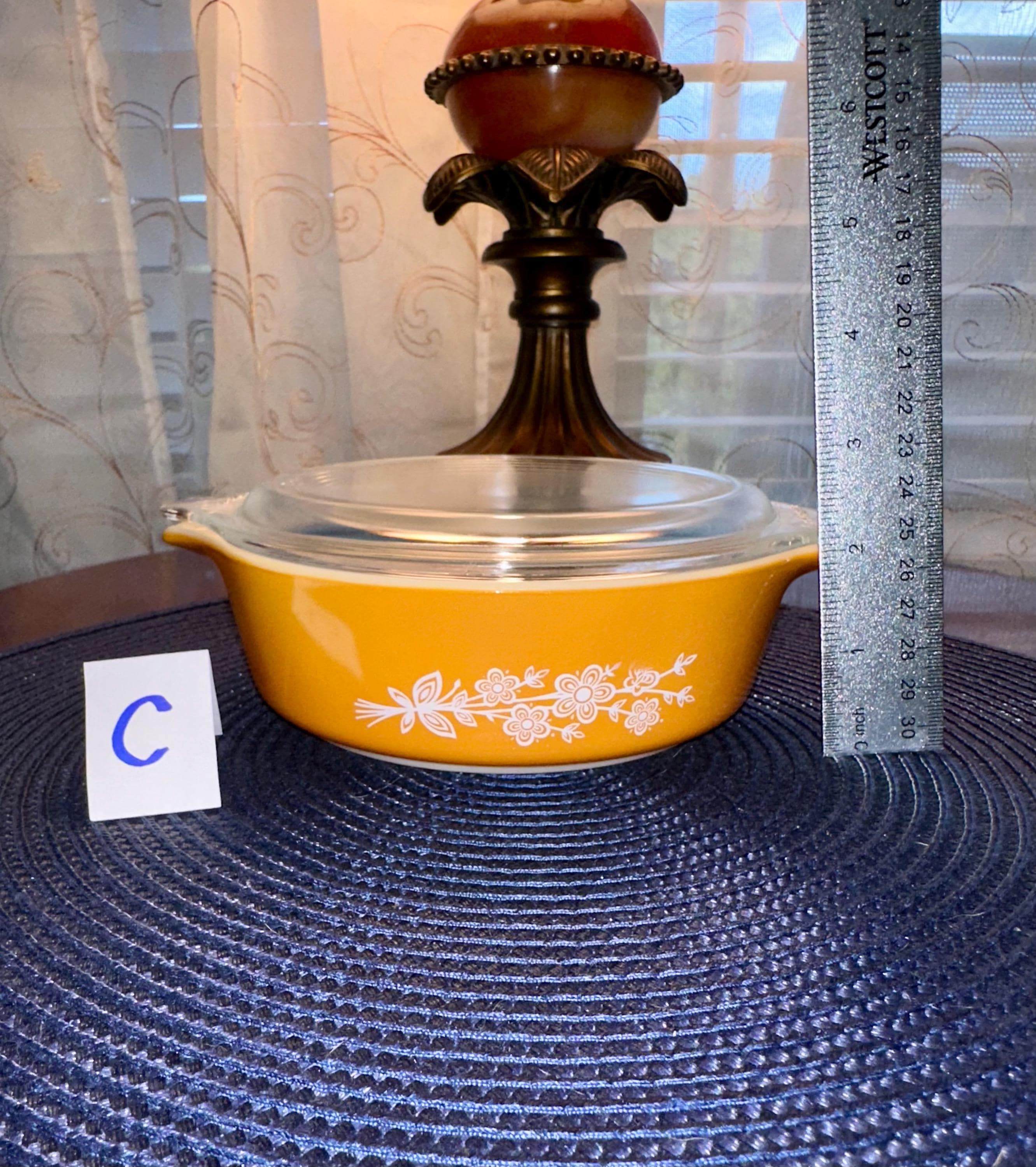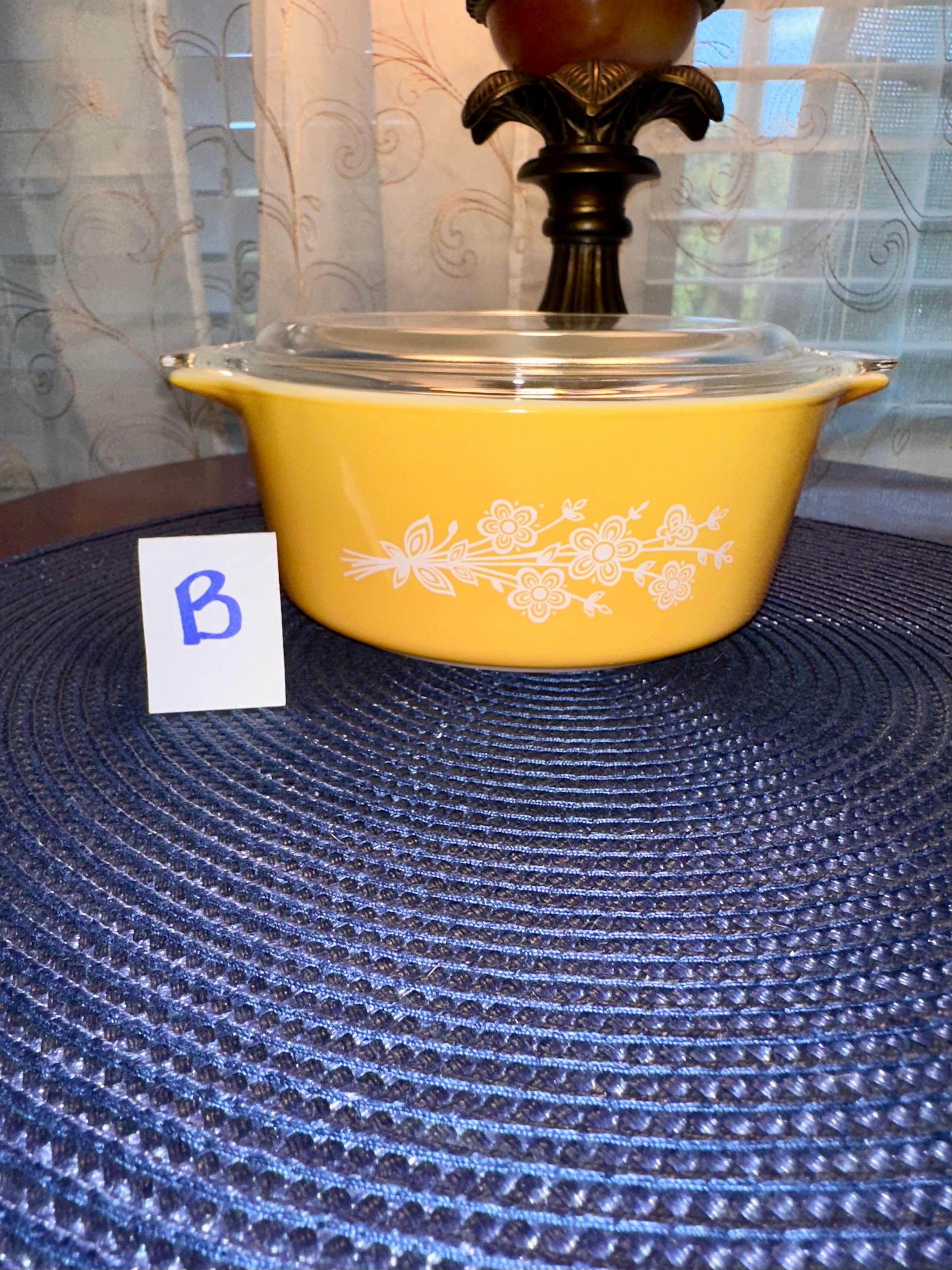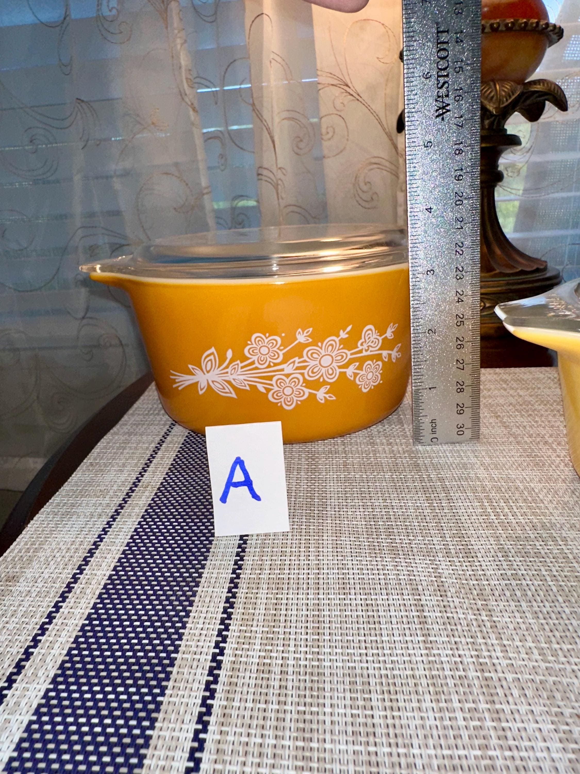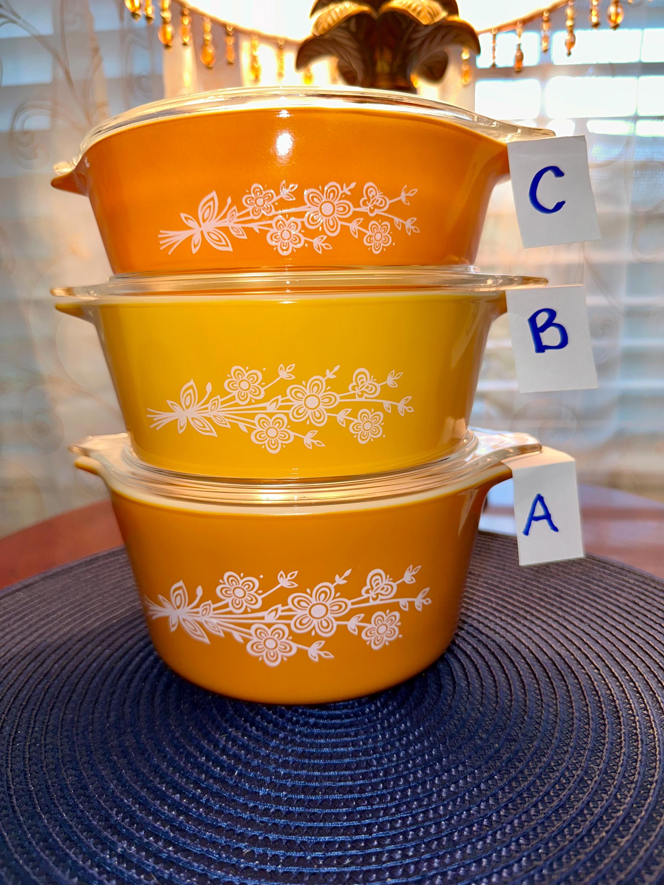 Vintage set of Pyrex Casserole Dishes with Lids in "Butterfly Gold". This is a set of 3 dishes that are in great condition. The lids are clear with no cooking damage, they are not cracked or chipped. There is only a few manufactured bubbles on "A", pictures are included. There is also slight crazing of the bottom of "A" and "C" pictures are included. These casserole dishes come in 1-quart, 1.5-quart and 2.5-quart. The dishes are not damaged from cooking or use. These are able to nest for storage and are usable. On the underside of the bakeware you will see that you are able to use them in the oven and microwave. NOT for stove top or broiler. It is suggested to hand wash this bakeware.