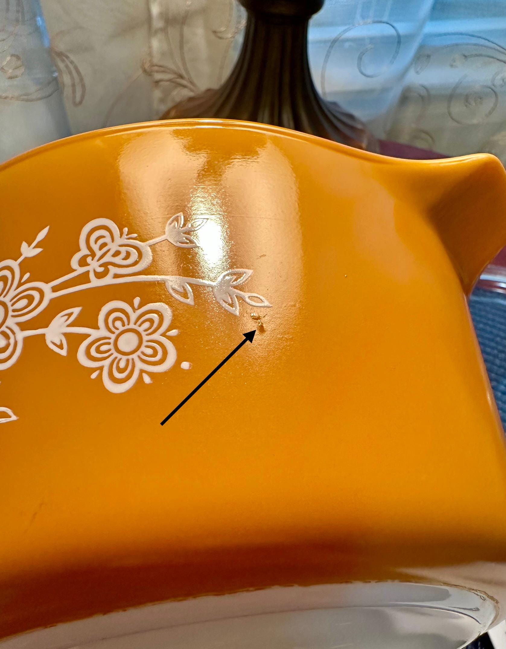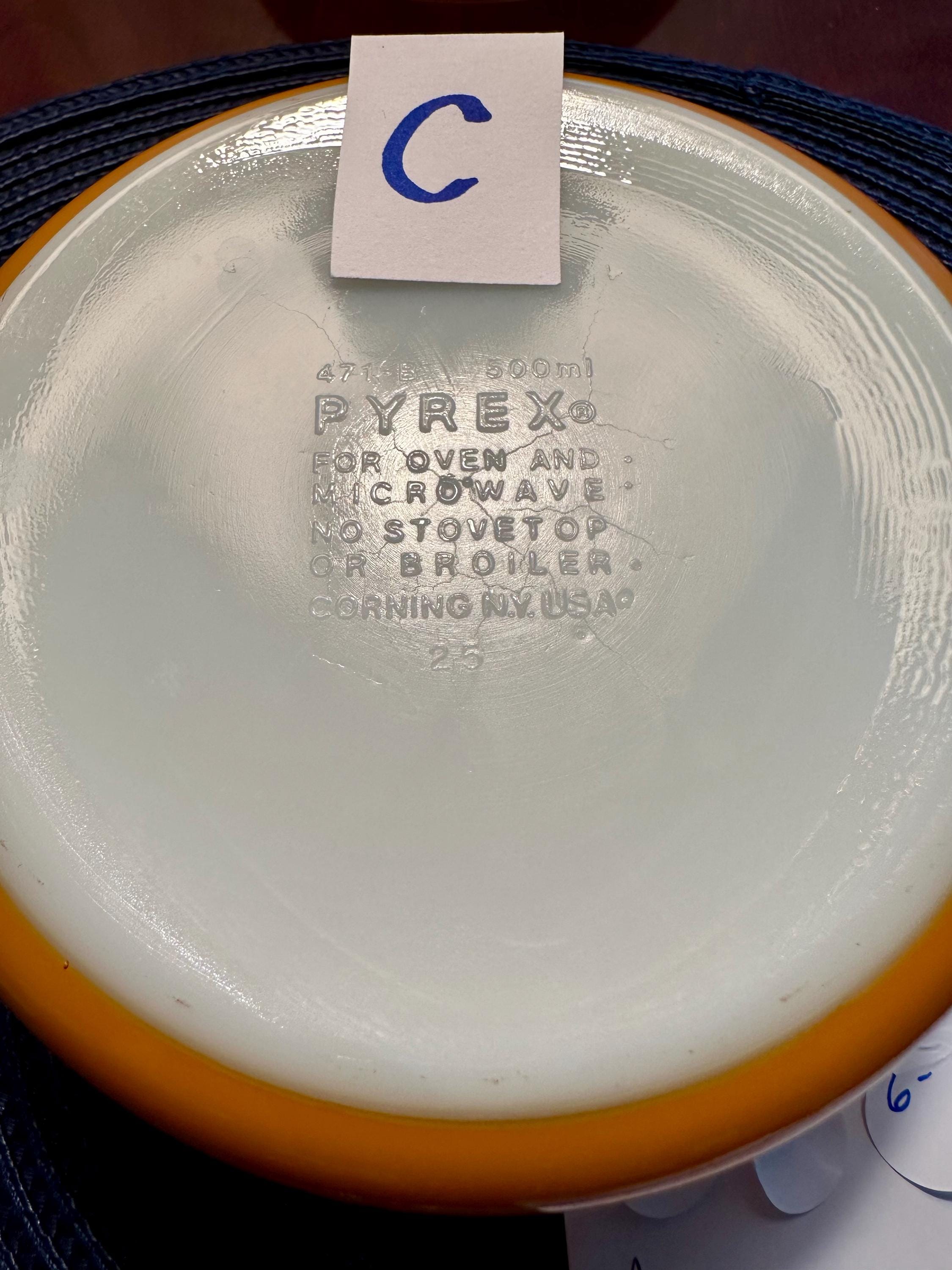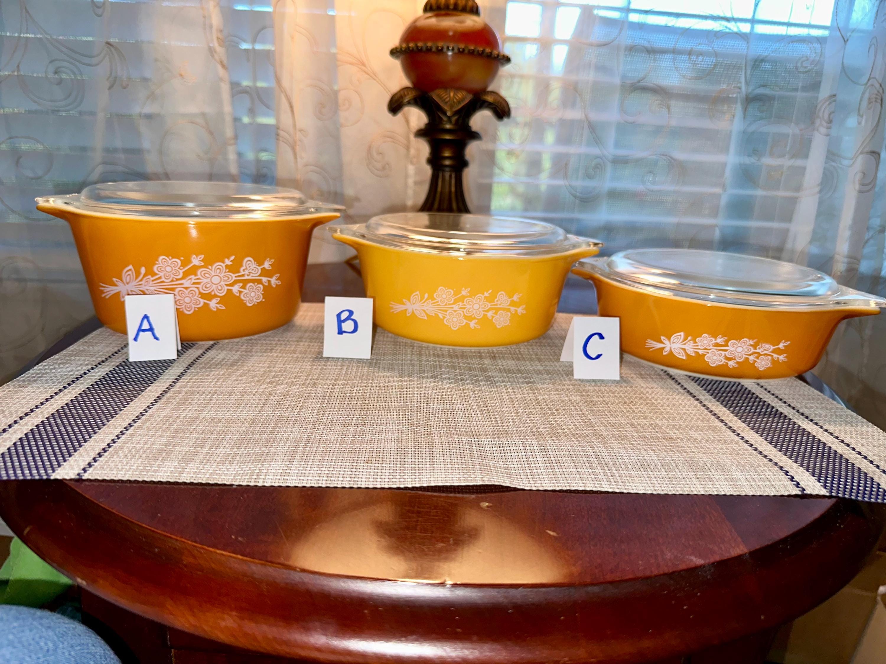 Vintage set of Pyrex Casserole Dishes with Lids in "Butterfly Gold". This is a set of 3 dishes that are in great condition. The lids are clear with no cooking damage, they are not cracked or chipped. There is only a few manufactured bubbles on "A", pictures are included. There is also slight crazing of the bottom of "A" and "C" pictures are included. These casserole dishes come in 1-quart, 1.5-quart and 2.5-quart. The dishes are not damaged from cooking or use. These are able to nest for storage and are usable. On the underside of the bakeware you will see that you are able to use them in the oven and microwave. NOT for stove top or broiler. It is suggested to hand wash this bakeware.