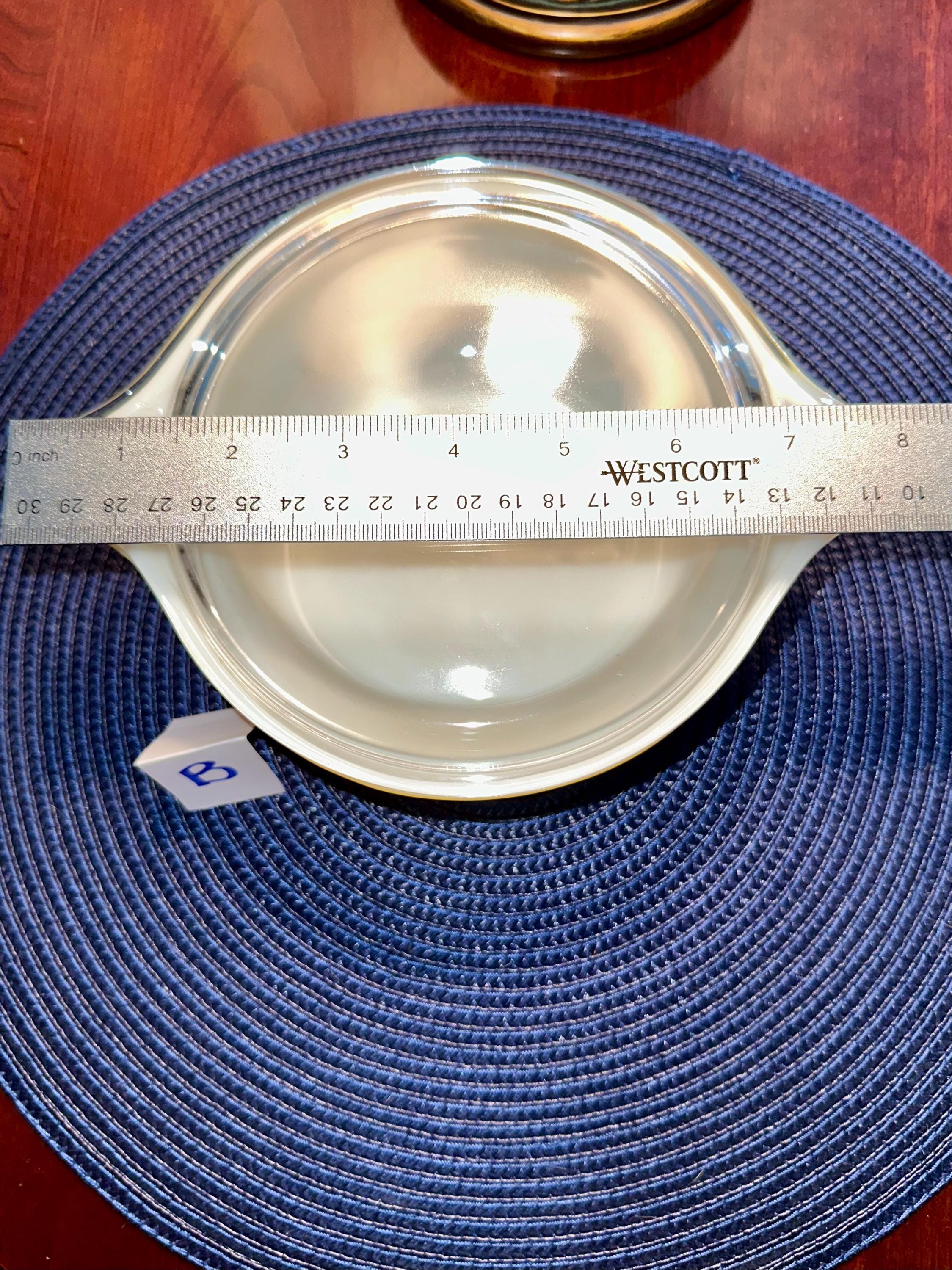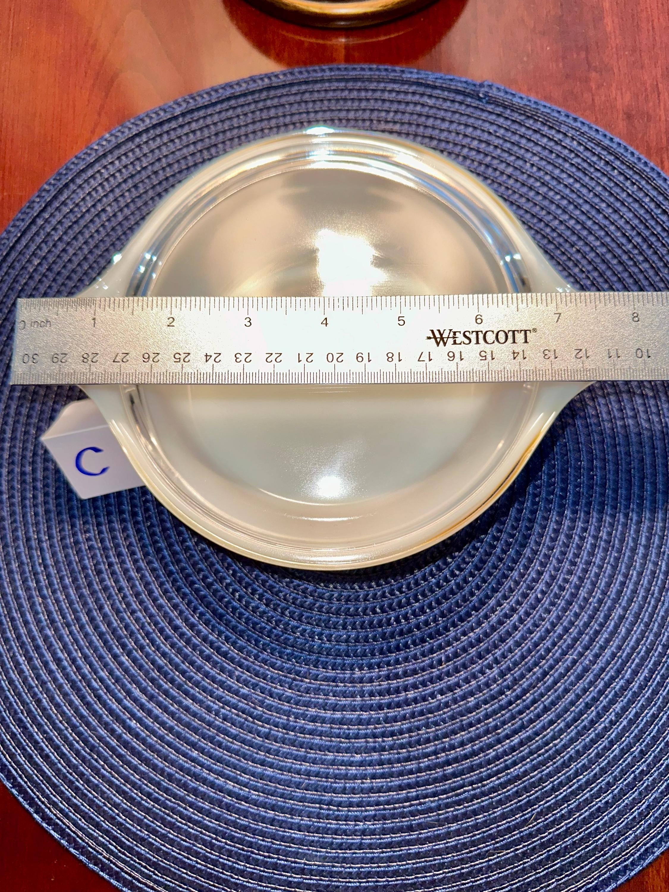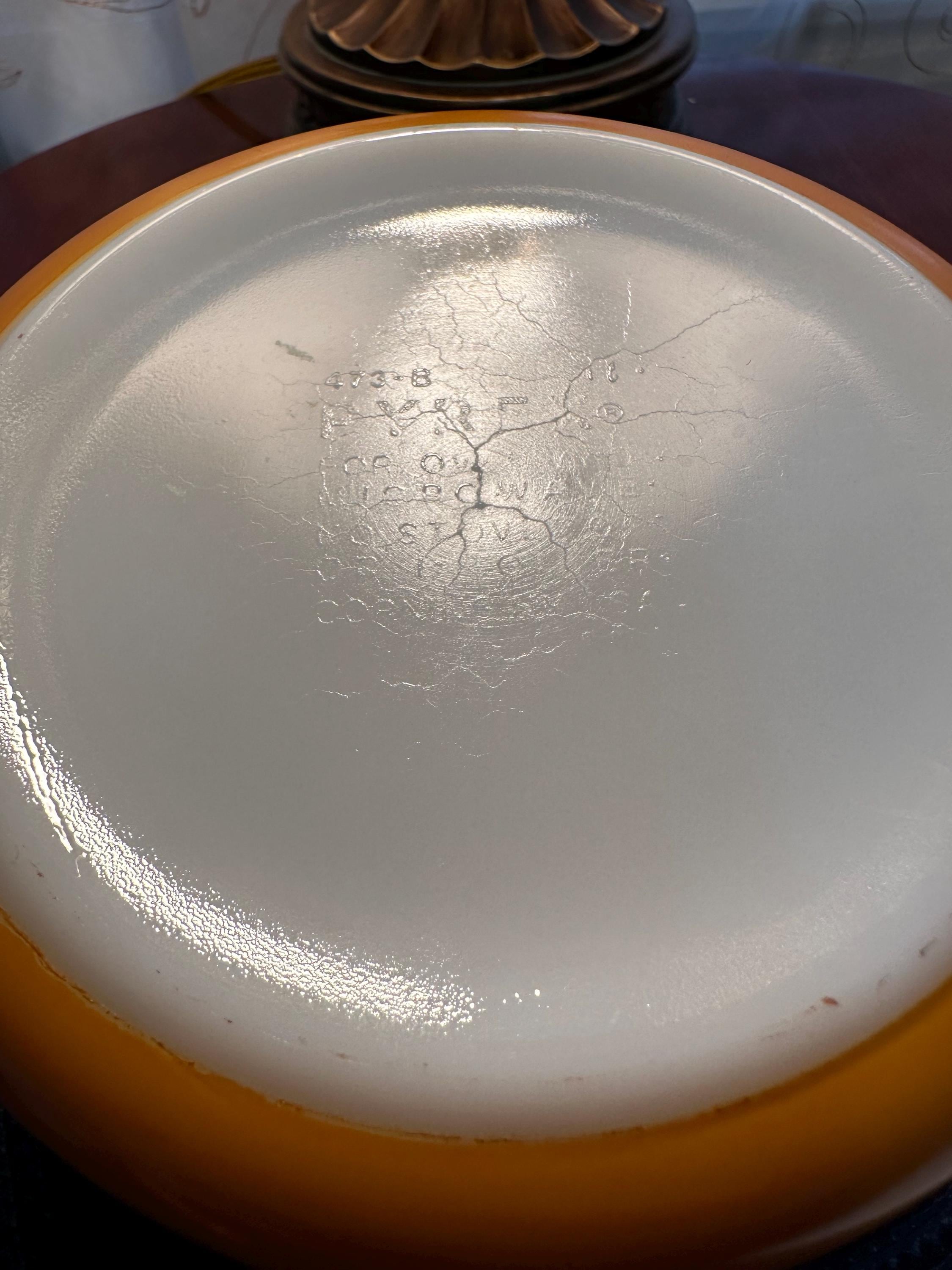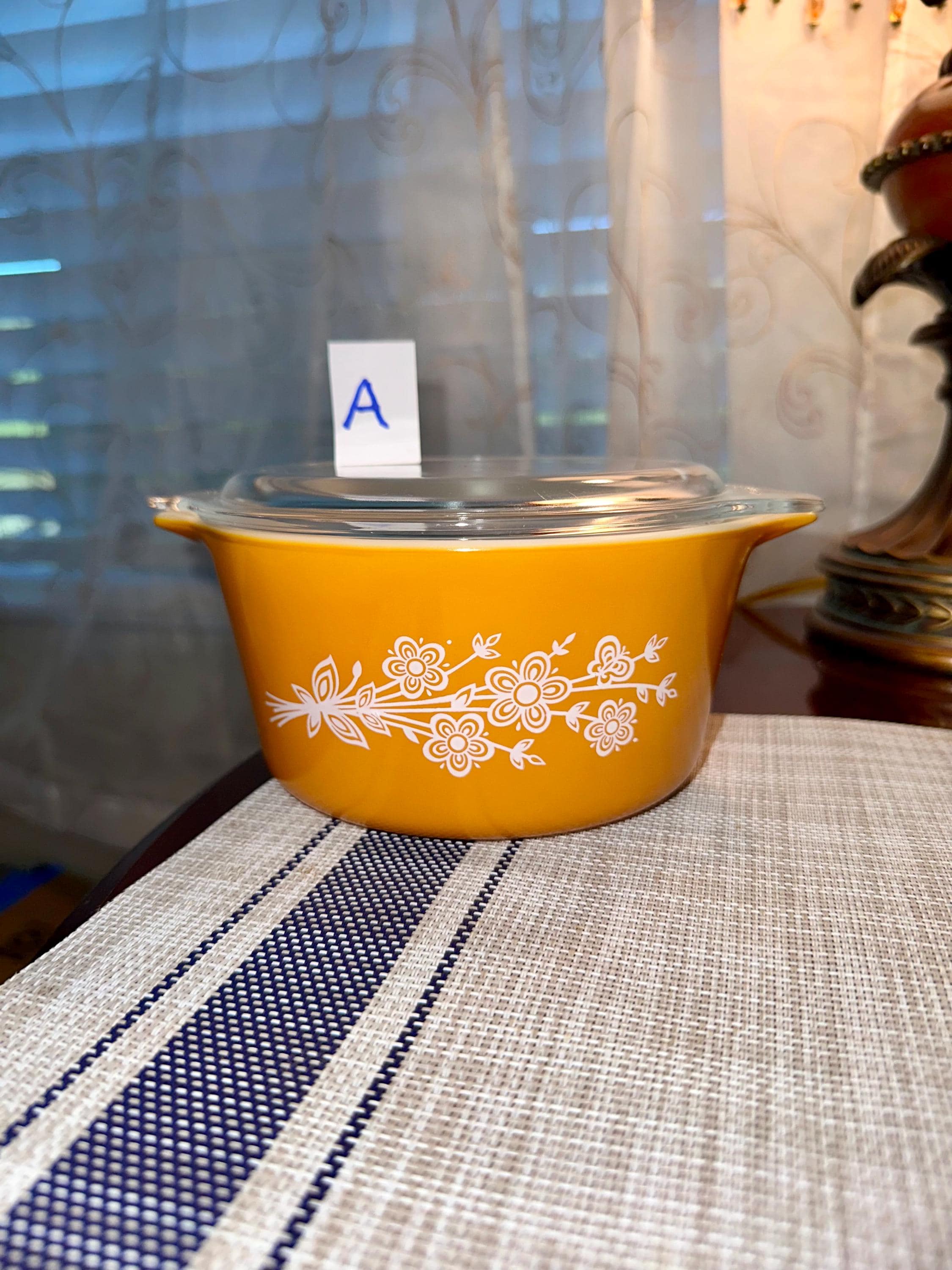 Vintage set of Pyrex Casserole Dishes with Lids in "Butterfly Gold". This is a set of 3 dishes that are in great condition. The lids are clear with no cooking damage, they are not cracked or chipped. There is only a few manufactured bubbles on "A", pictures are included. There is also slight crazing of the bottom of "A" and "C" pictures are included. These casserole dishes come in 1-quart, 1.5-quart and 2.5-quart. The dishes are not damaged from cooking or use. These are able to nest for storage and are usable. On the underside of the bakeware you will see that you are able to use them in the oven and microwave. NOT for stove top or broiler. It is suggested to hand wash this bakeware.
