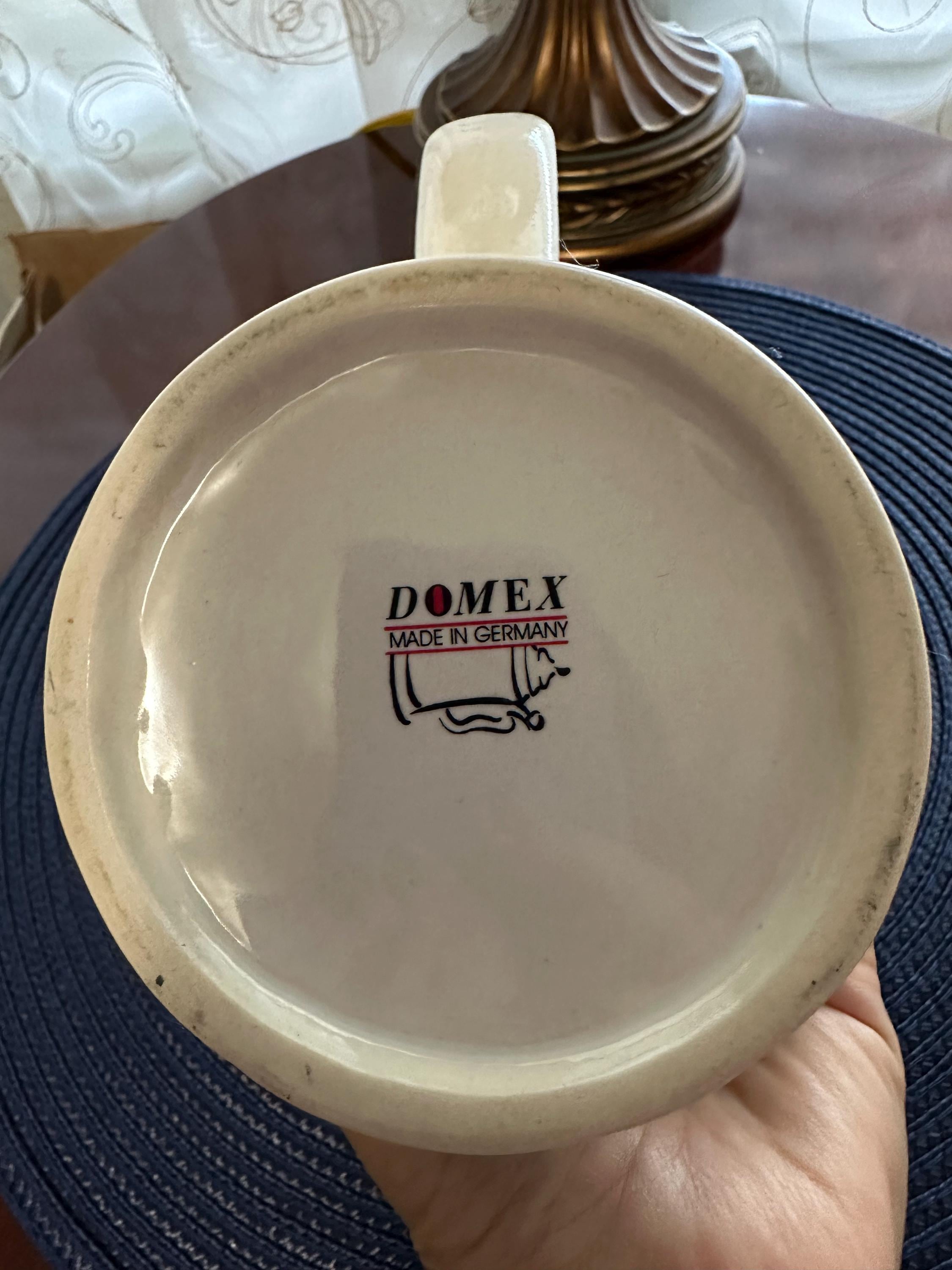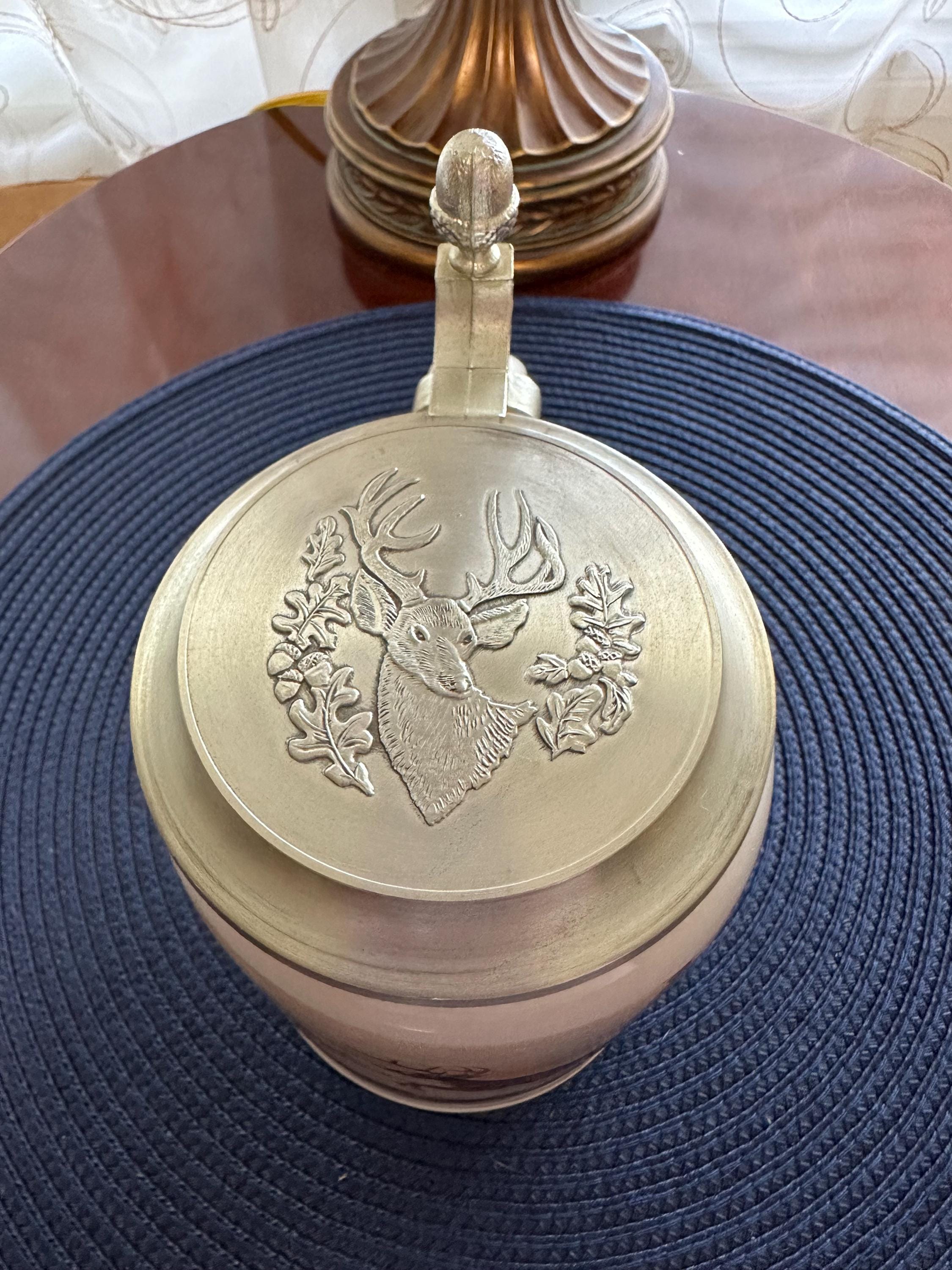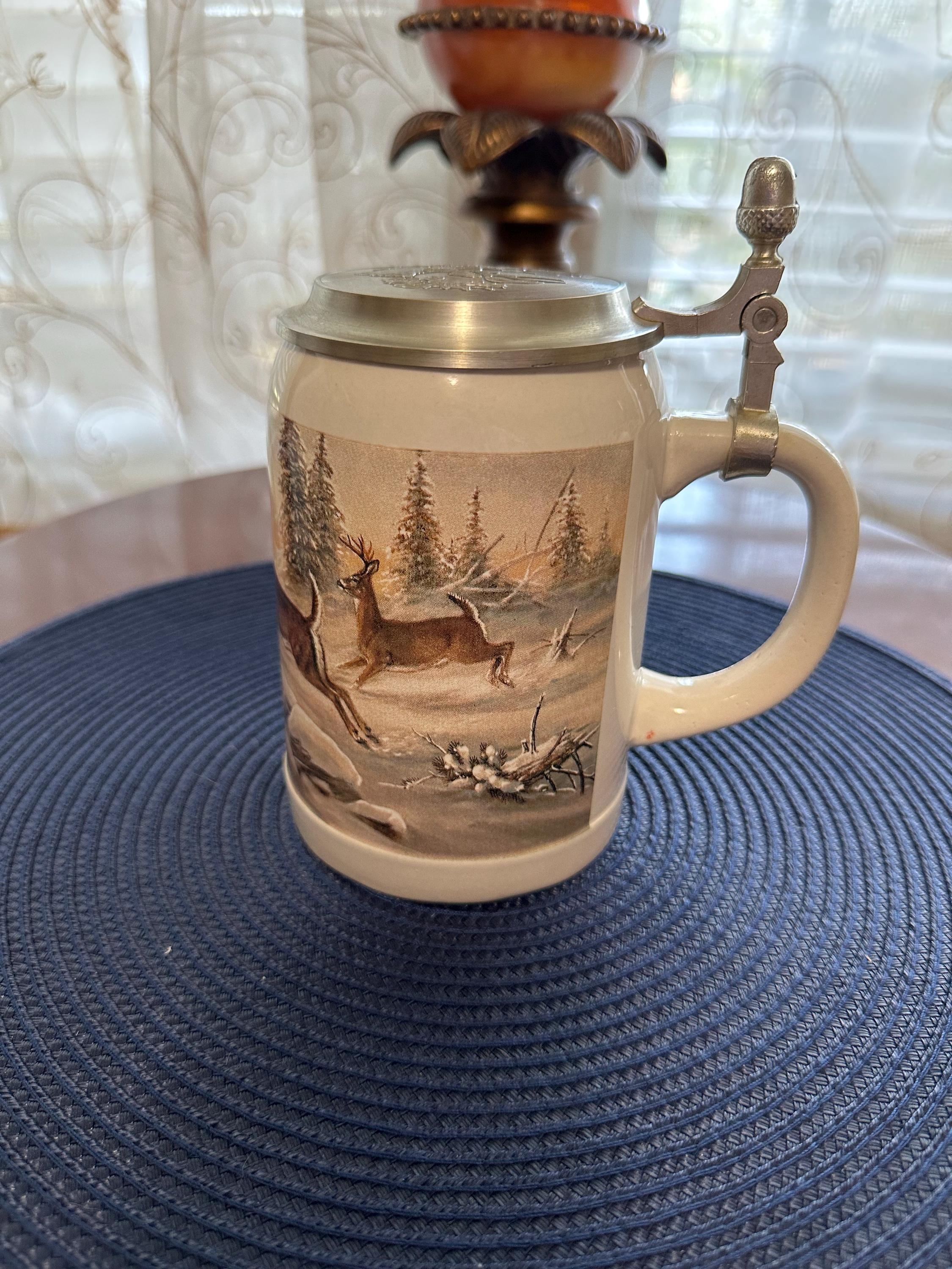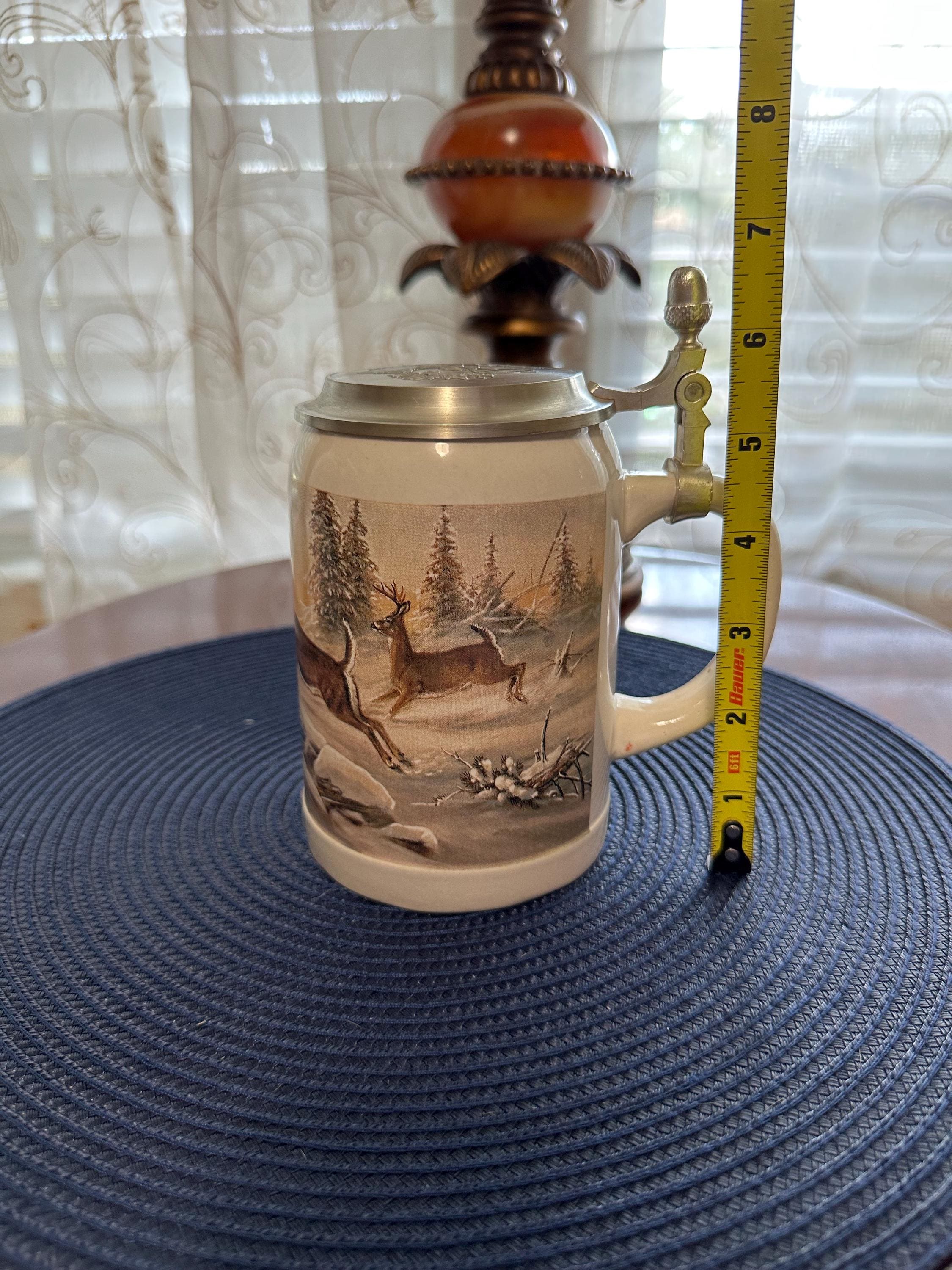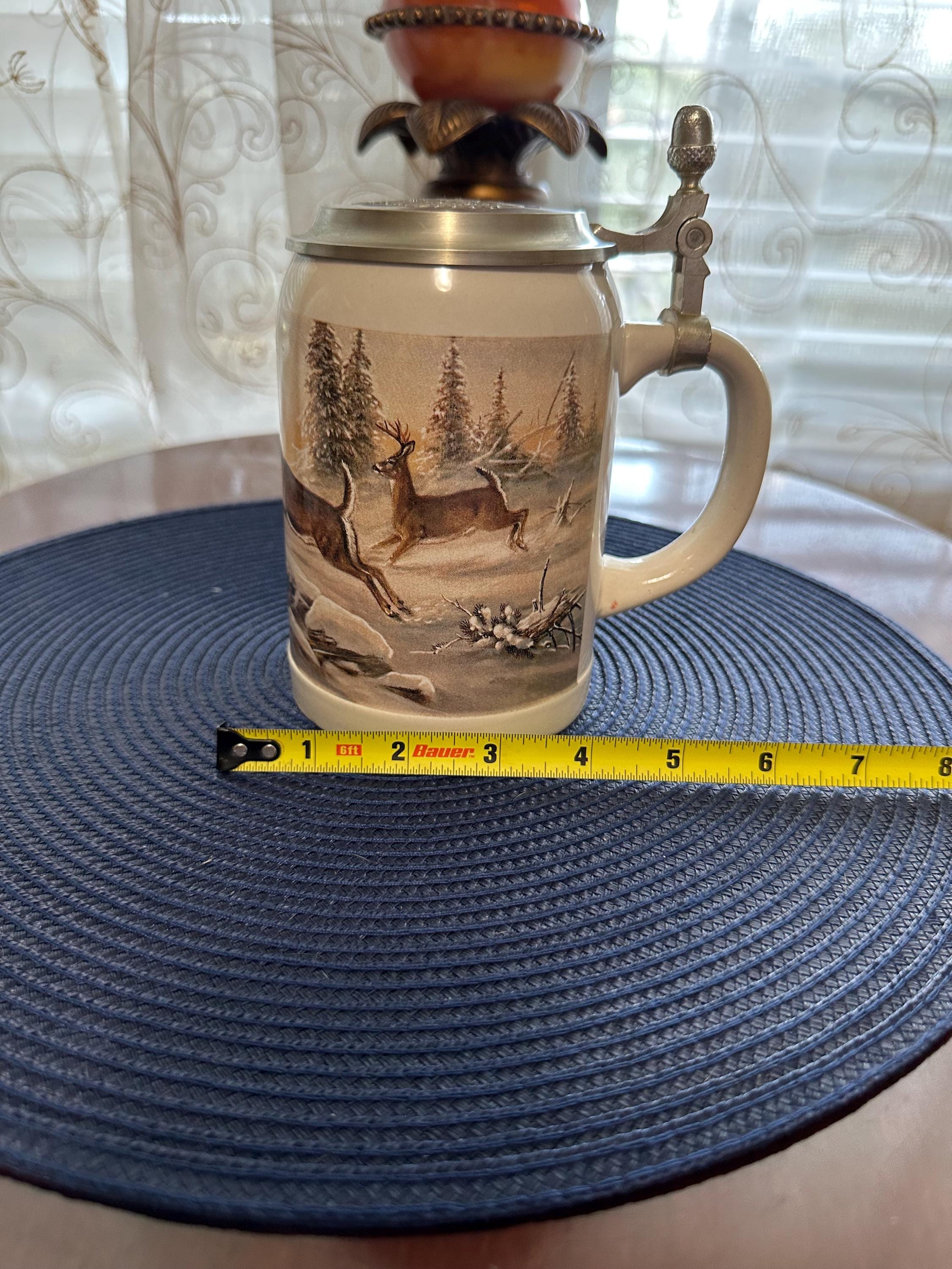 German Beer Stein made by Domex. This has a "Deer in Winter" design with a pewter lid. There are no cracks, crazing or chips. There are some dimples in the handle made by manufacture. The lid closes and seals around without any gaps. Please contact us if you would like to make an offer or if you have any questions. Gift wrapping is available complimentary of purchase, message us if you would like this free service and what type of gift this is so we can give you the appropriate wrapping.