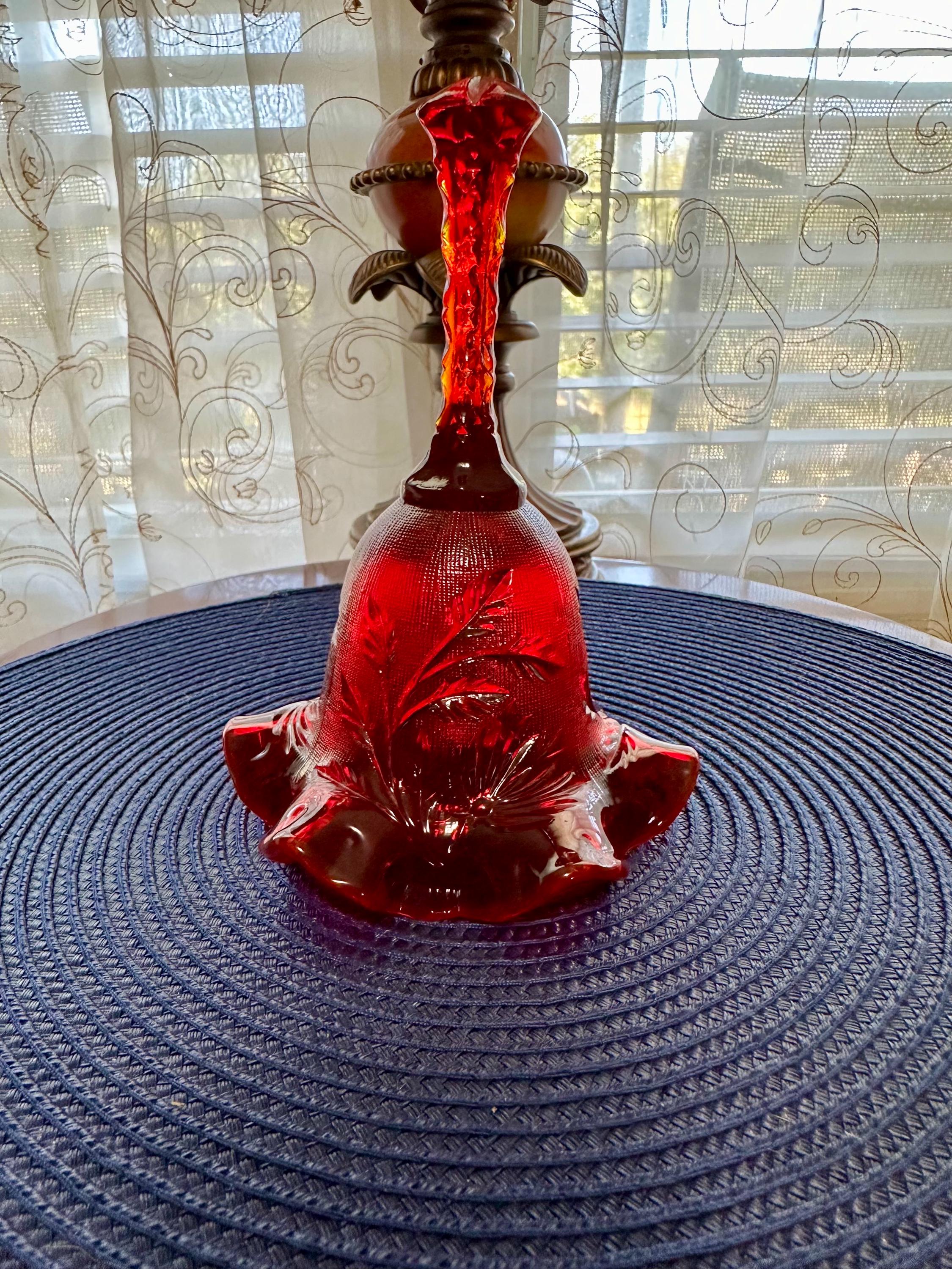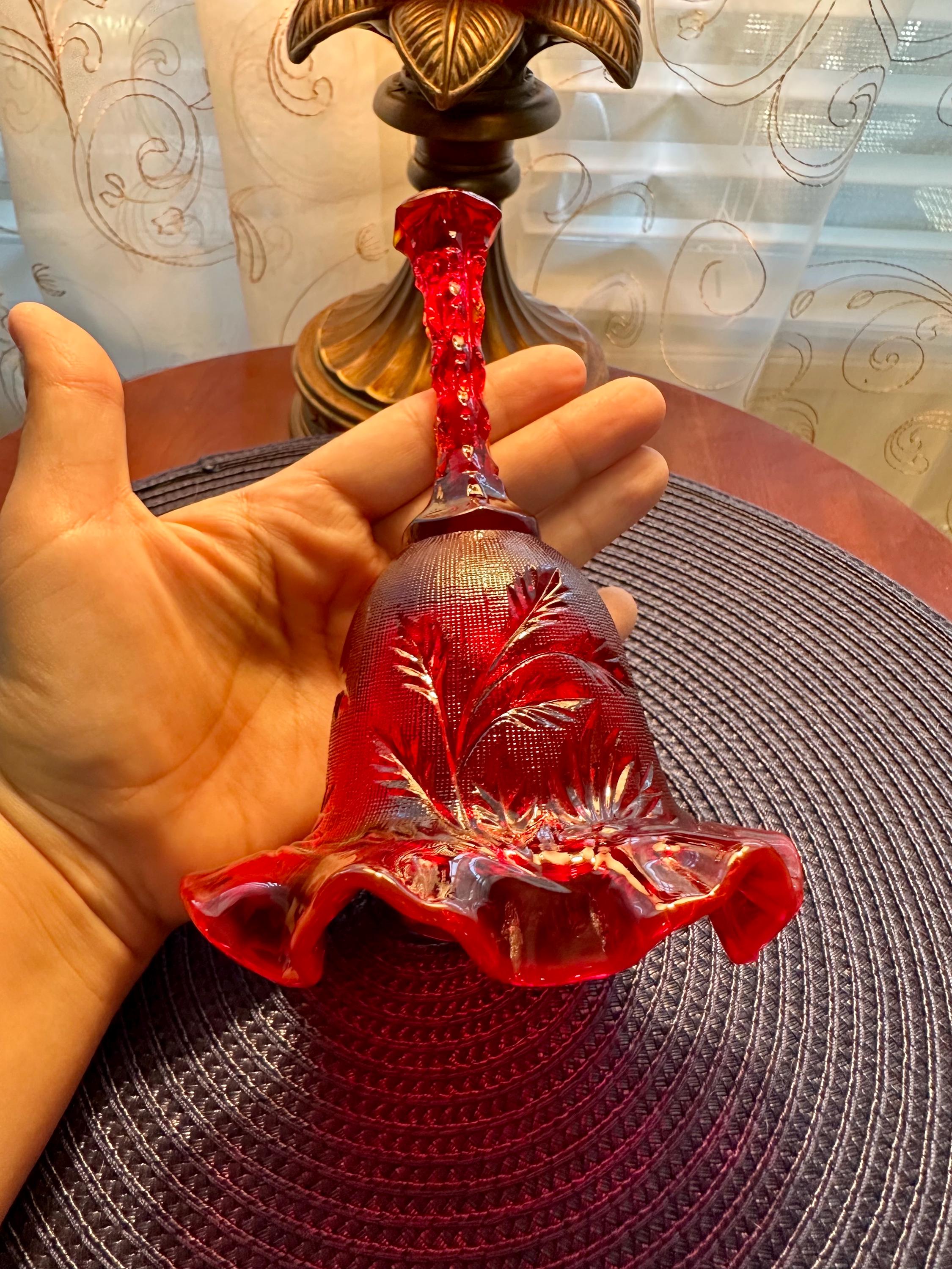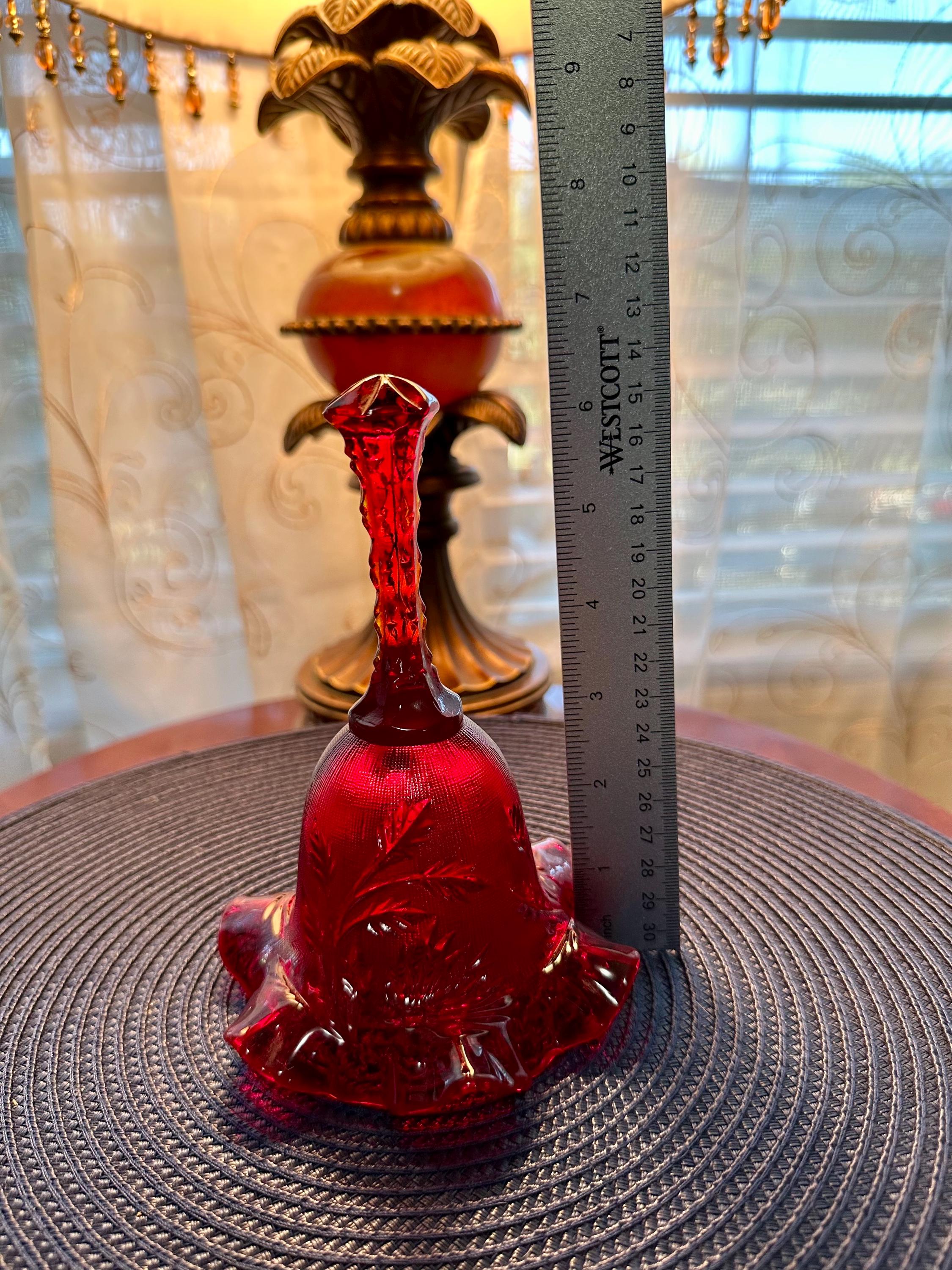 Beautiful Fenton cranberry red bell etched with leafs and ruffle edges. This is in mint condition, with no scuffs, chips, cracks or blemishes. This bell is 6 1/2 inches tall and 4 1/2 inches wide. This would be great for a gift or to add to your collection of Fenton glass. Please contact us if you have any questions.