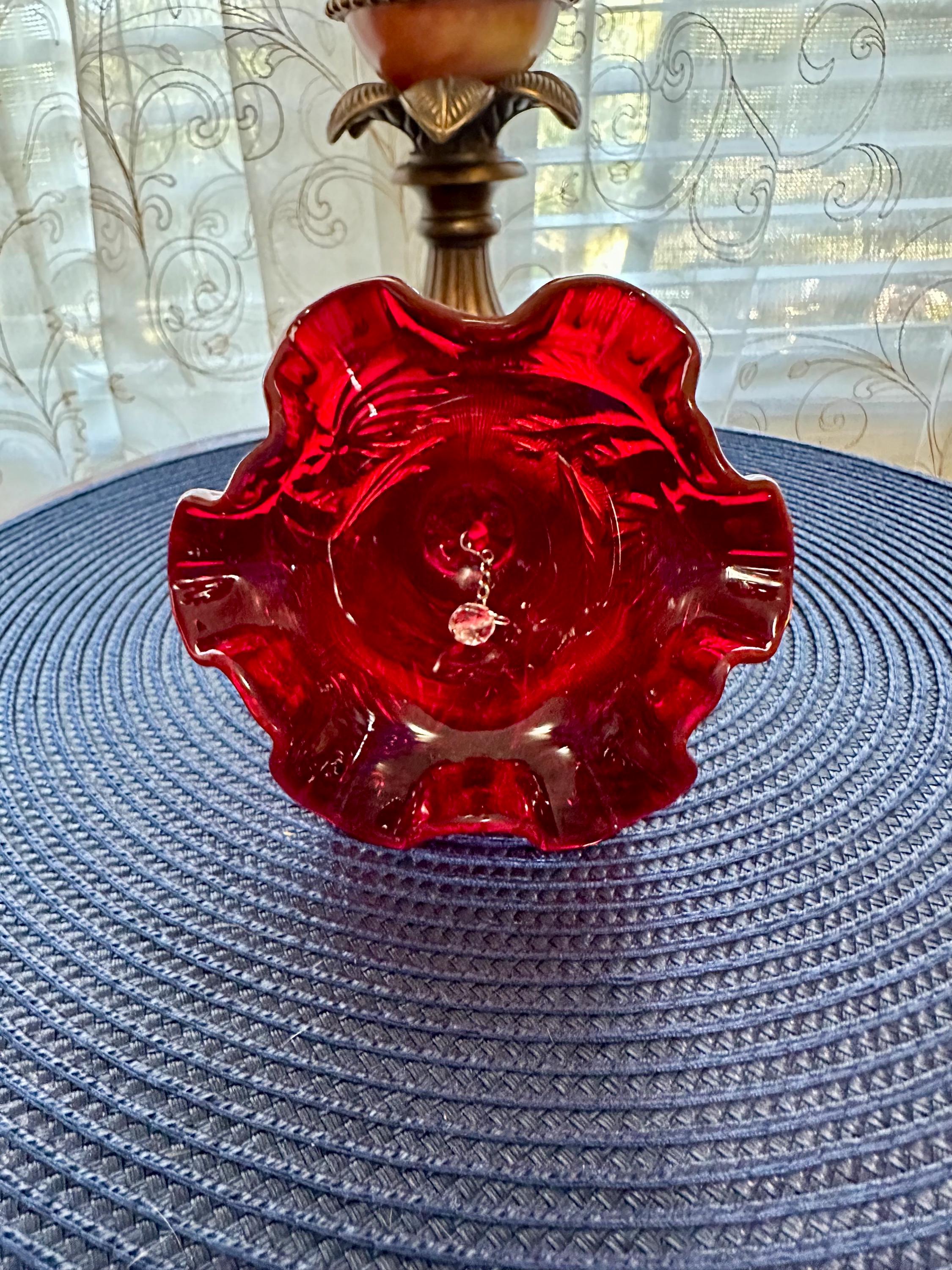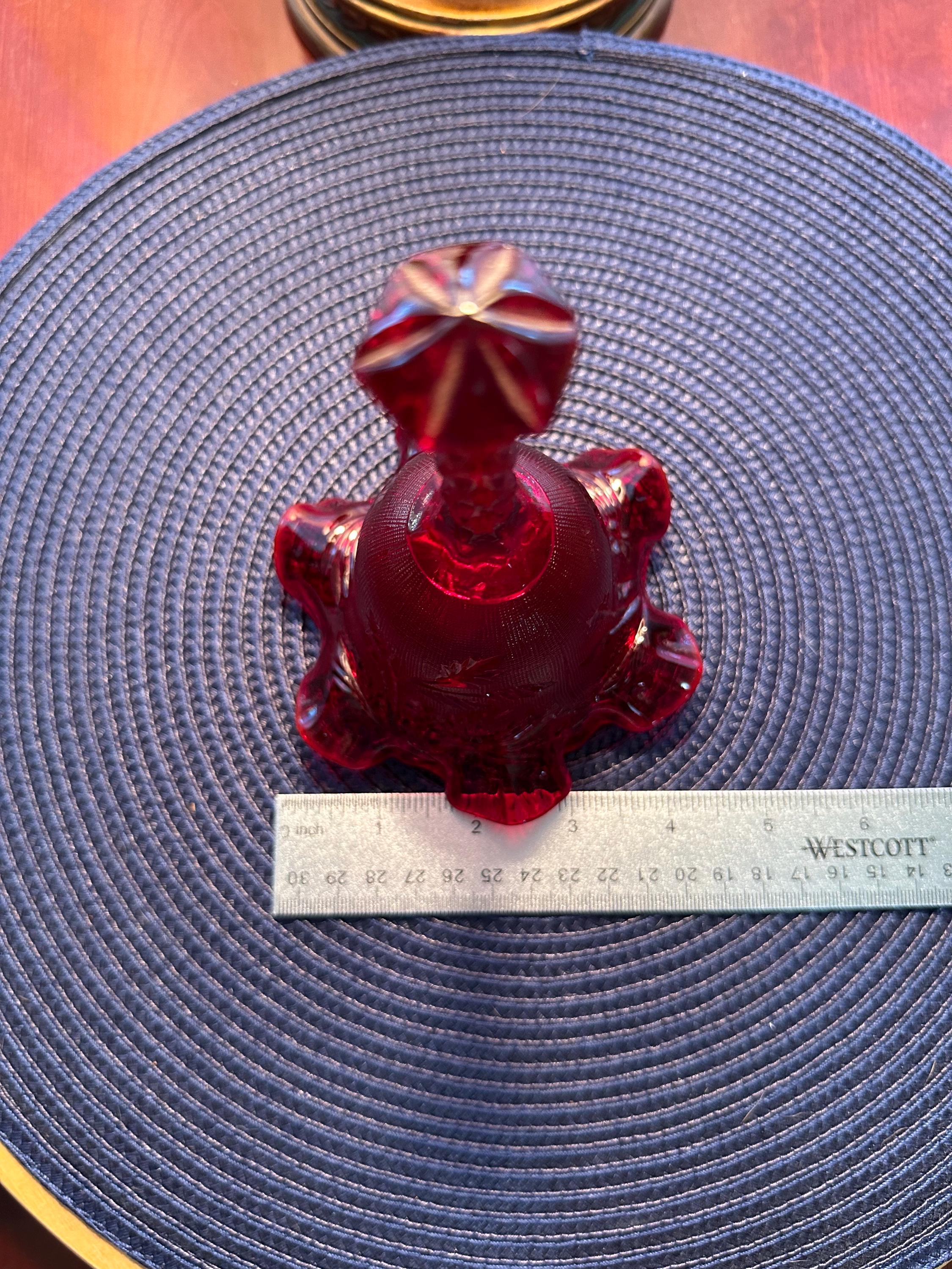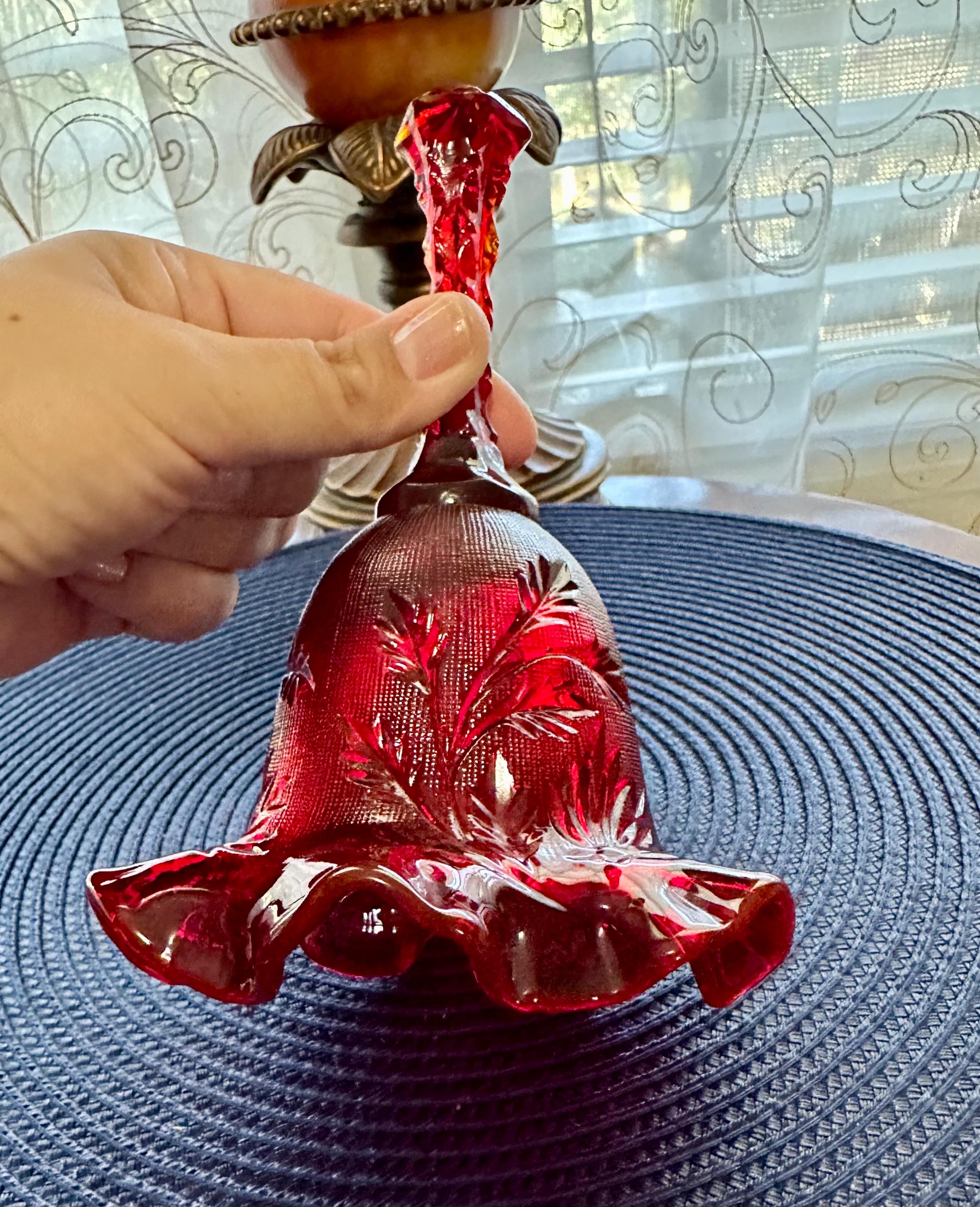 Beautiful Fenton cranberry red bell etched with leafs and ruffle edges. This is in mint condition, with no scuffs, chips, cracks or blemishes. This bell is 6 1/2 inches tall and 4 1/2 inches wide. This would be great for a gift or to add to your collection of Fenton glass. Please contact us if you have any questions.
