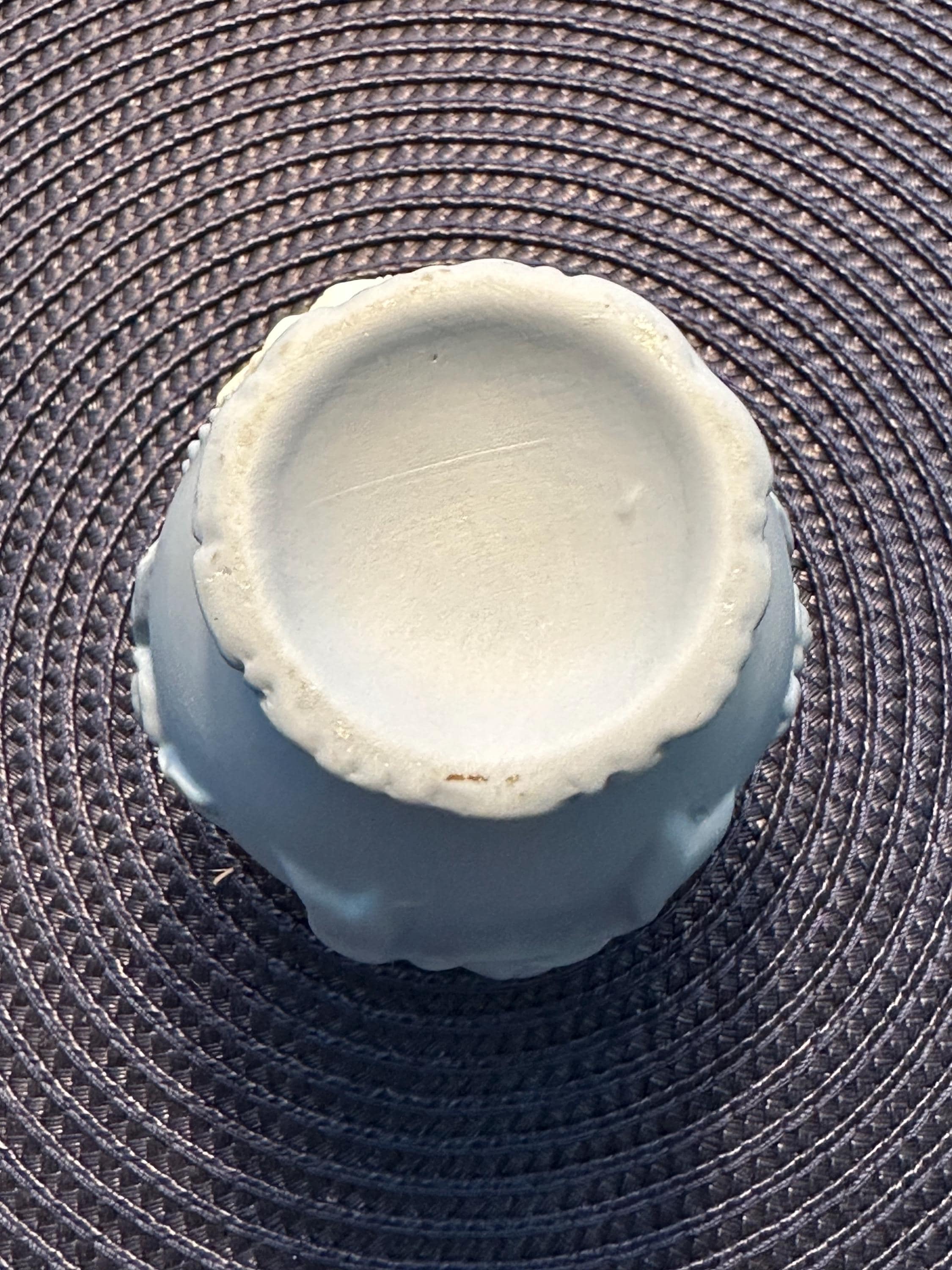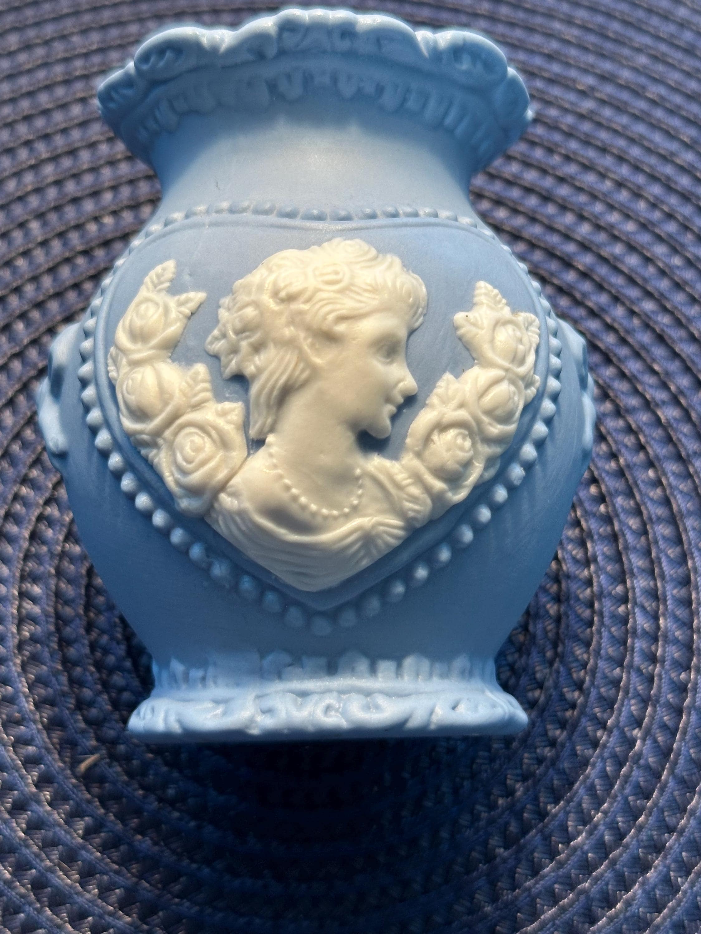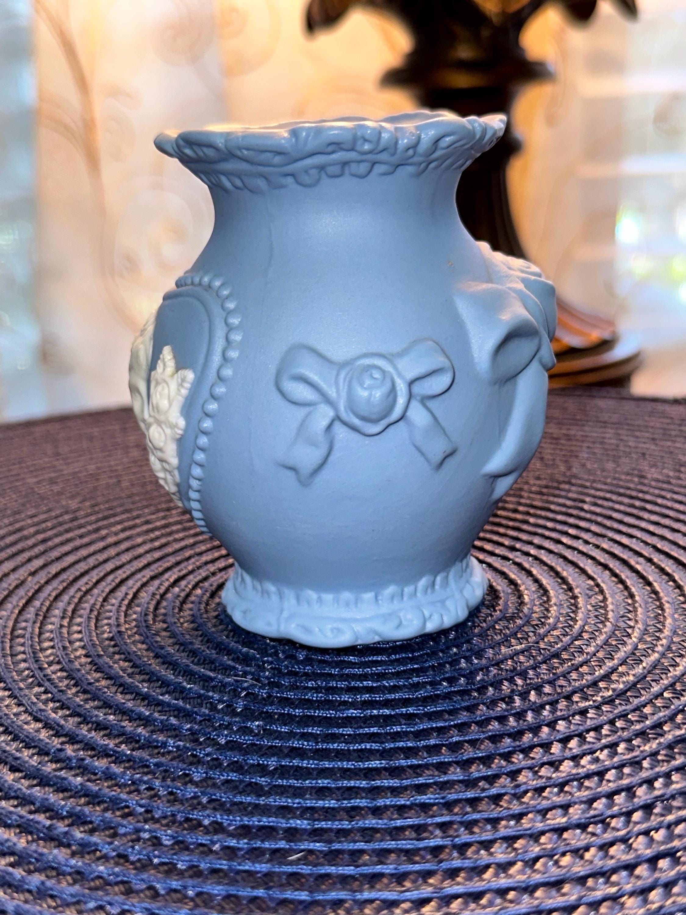Wedgewood Jasperware Cameo mini vase. This is 3 1/2 inches tall and has no chips, cracks or crazing. It has a matte finish in their iconic blue color. This does not have any distinguishing marks on the bottom of the vase.