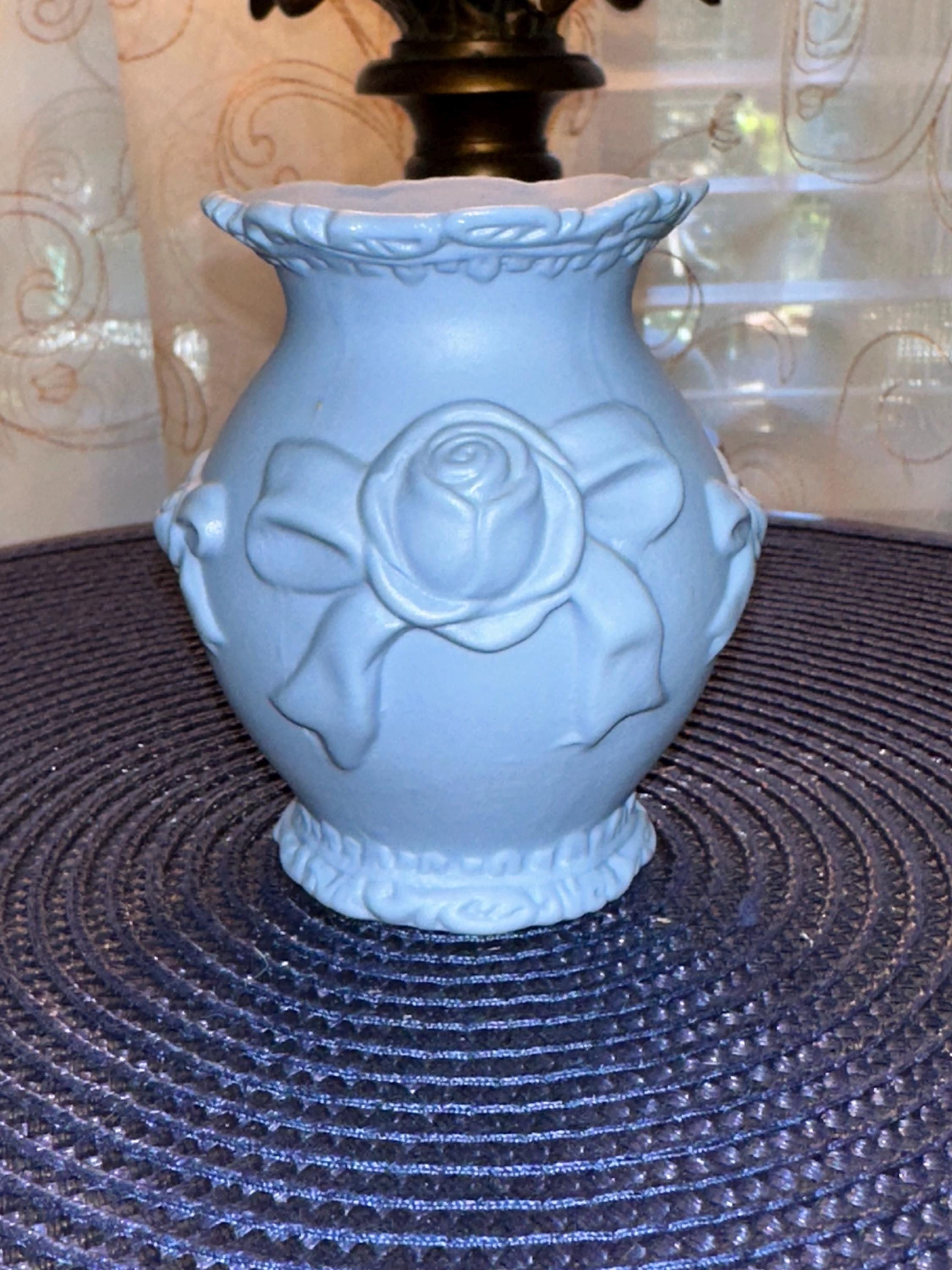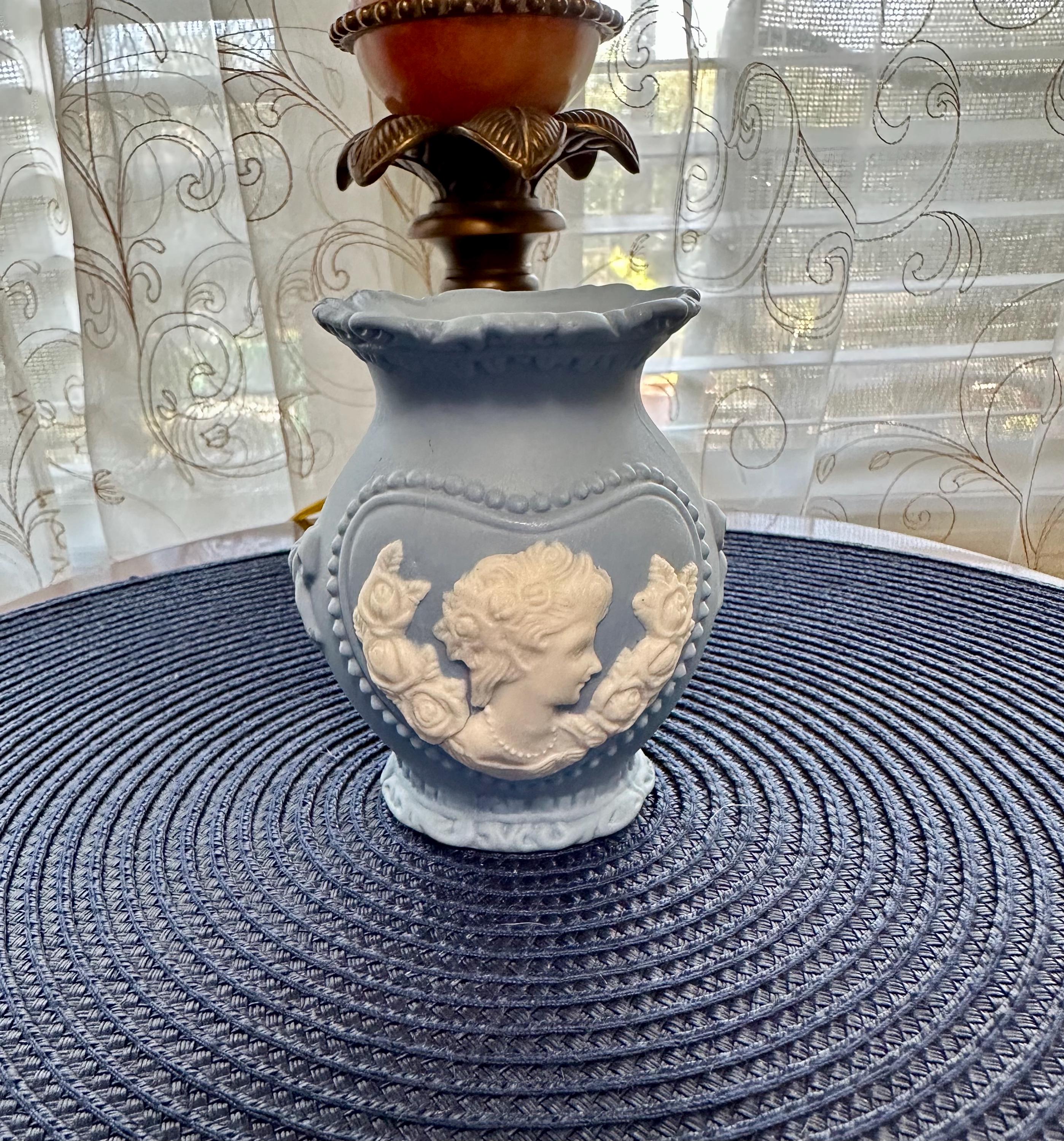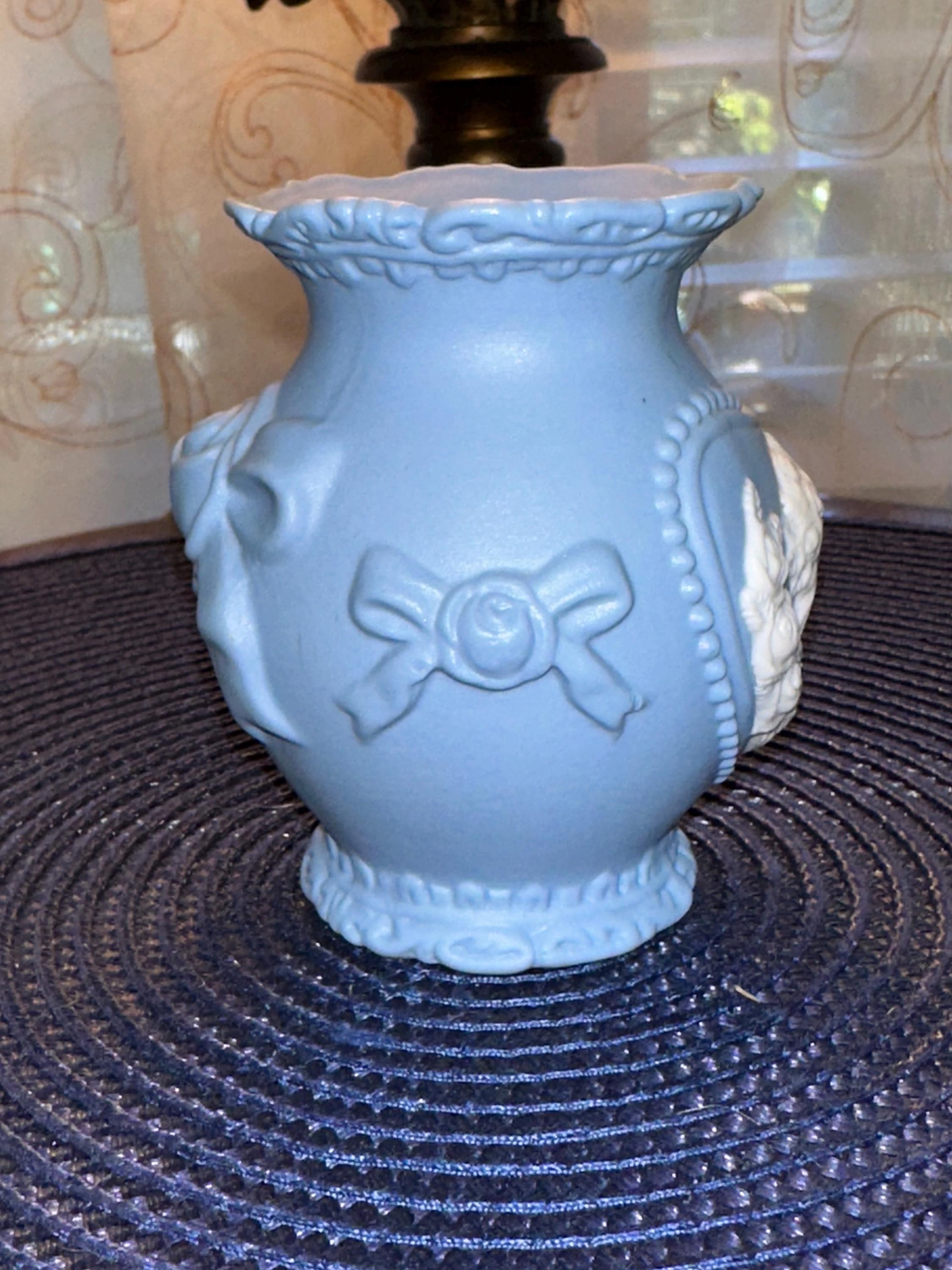 Wedgewood Jasperware Cameo mini vase. This is 3 1/2 inches tall and has no chips, cracks or crazing. It has a matte finish in their iconic blue color. This does not have any distinguishing marks on the bottom of the vase.
