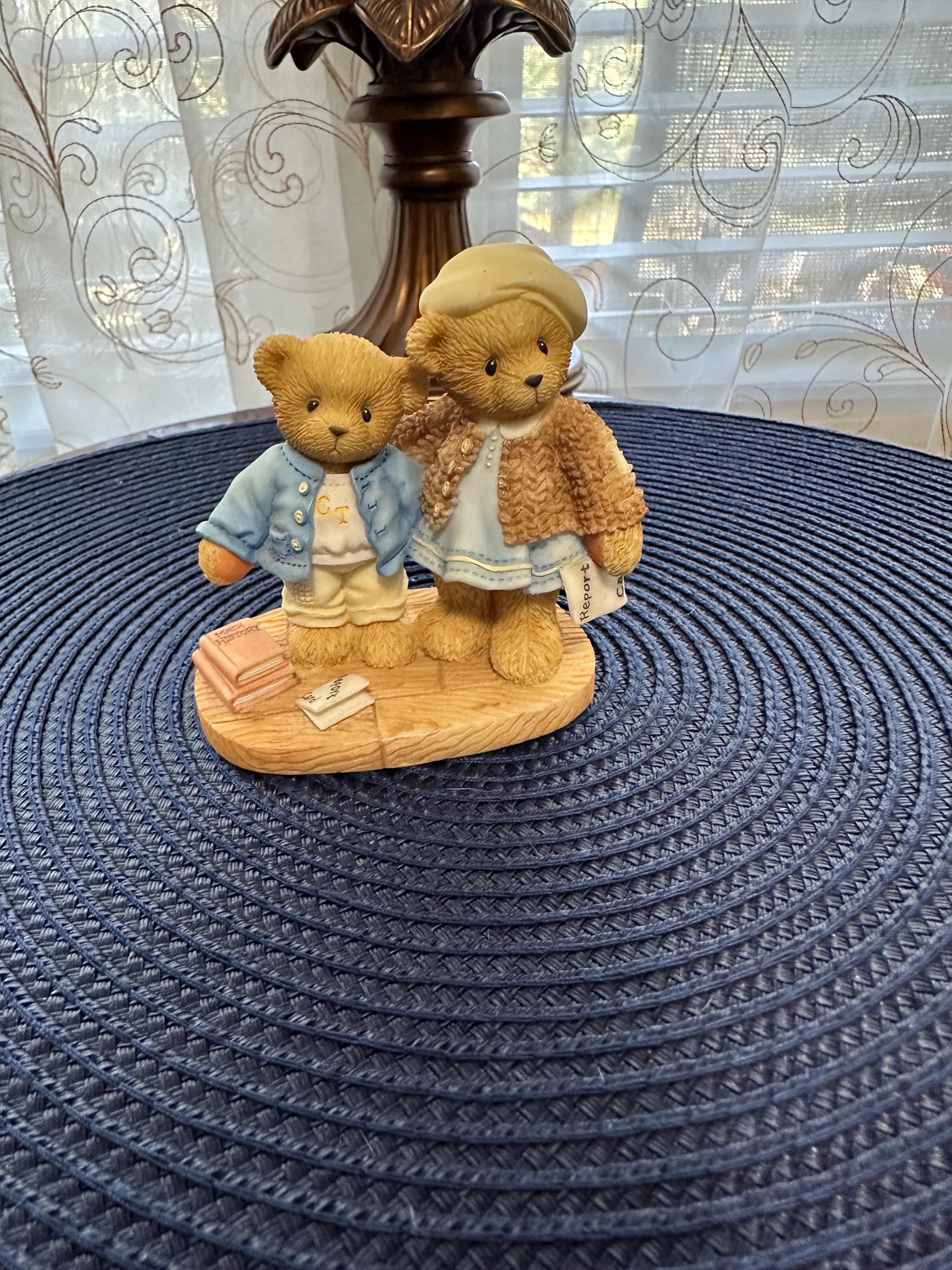 This Cherished Teddy - Clemet and Jodie "Try, Try, And Try Again" figurine is designed by Priscilla Hillman and made by ENSCO. Jodie and Clemet are standing 3 inches tall. This figurine is not in the original box. There are no chips, crazing, or cracks. The price is not firm on this item. Please contact us if you would like to make an offer.