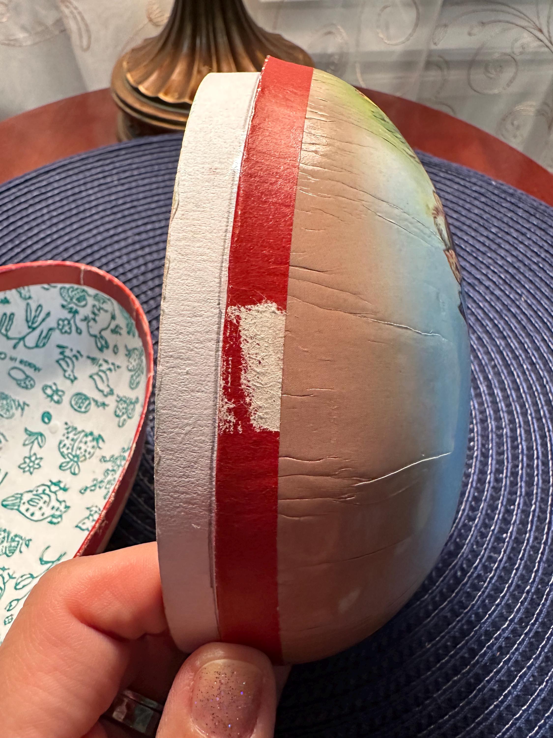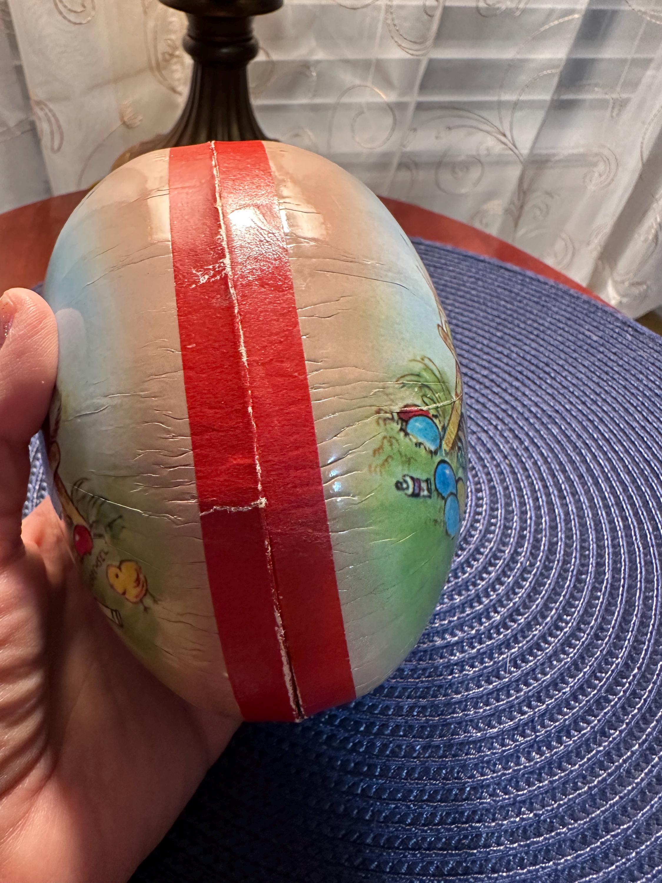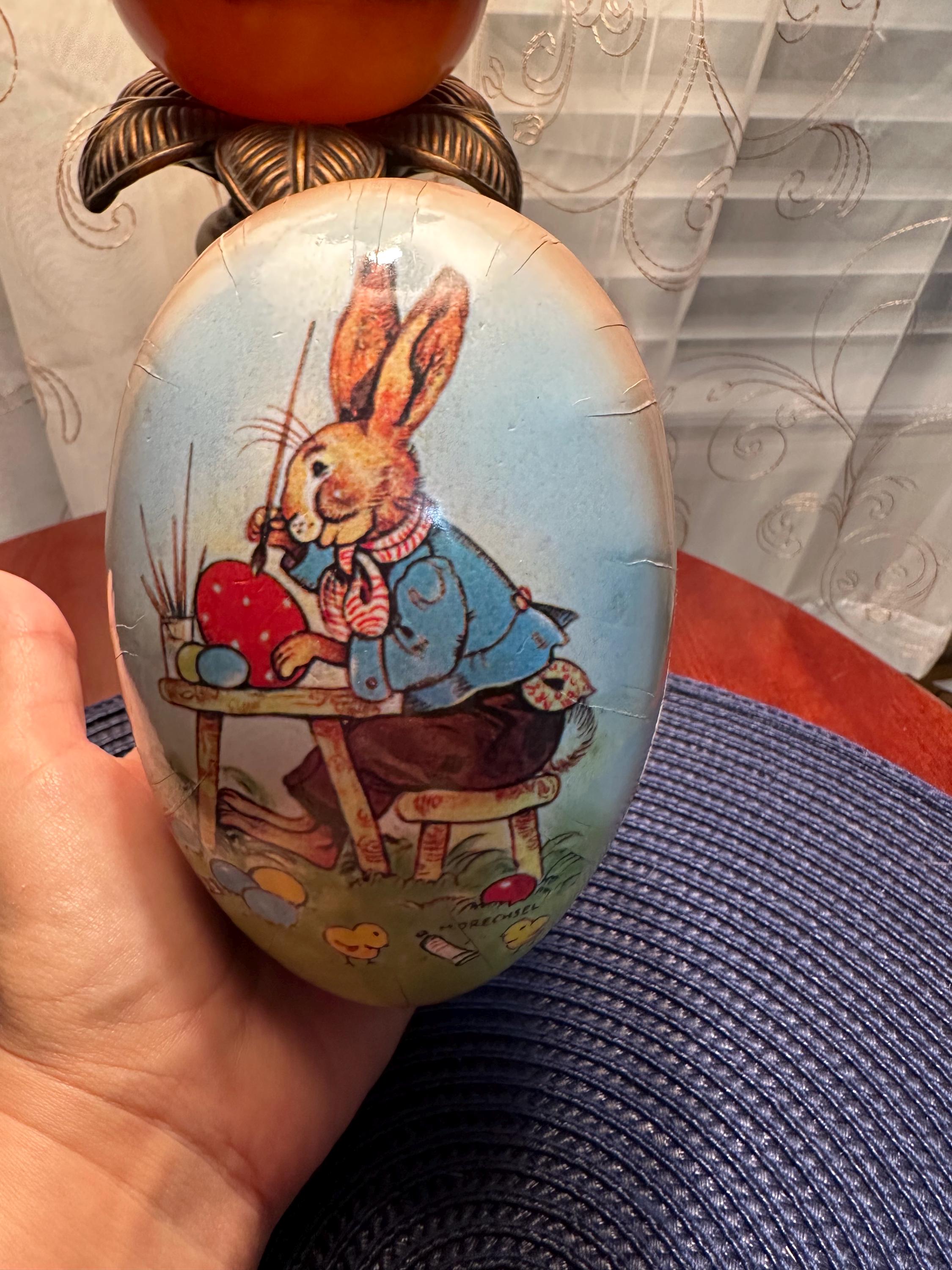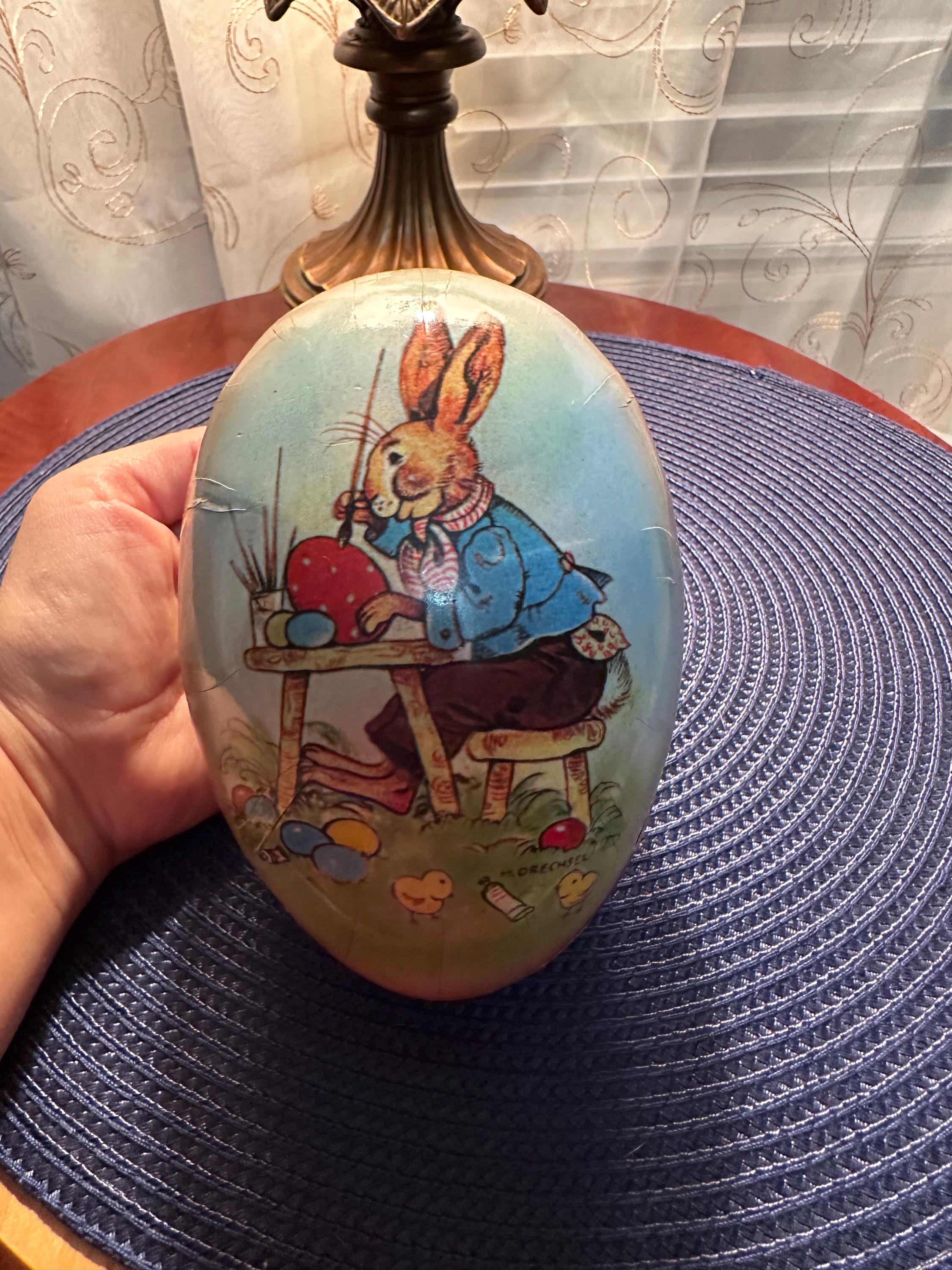 This is a vintage German made papier-mâché Easter egg of the Easter Bunny painting eggs. This is hand crafted from the 1950s by M Drechsel. This item has some torn edges where the egg has been opened and closed over the years. There are pictures of the worn areas on this must have holiday decoration. Color may be different due to the camera or the lighting. Please contact us if you have any questons and if you would like to see more pictures.