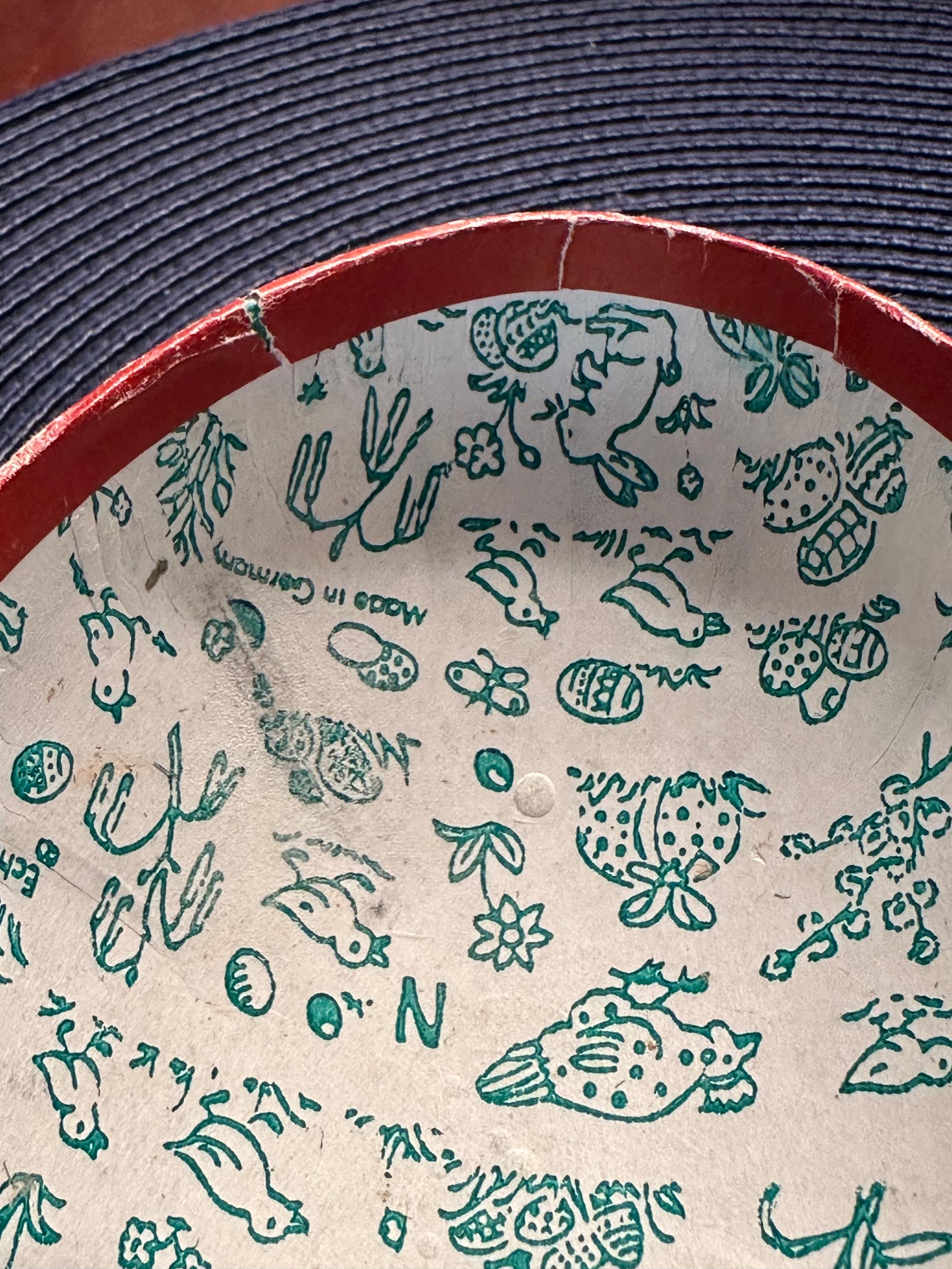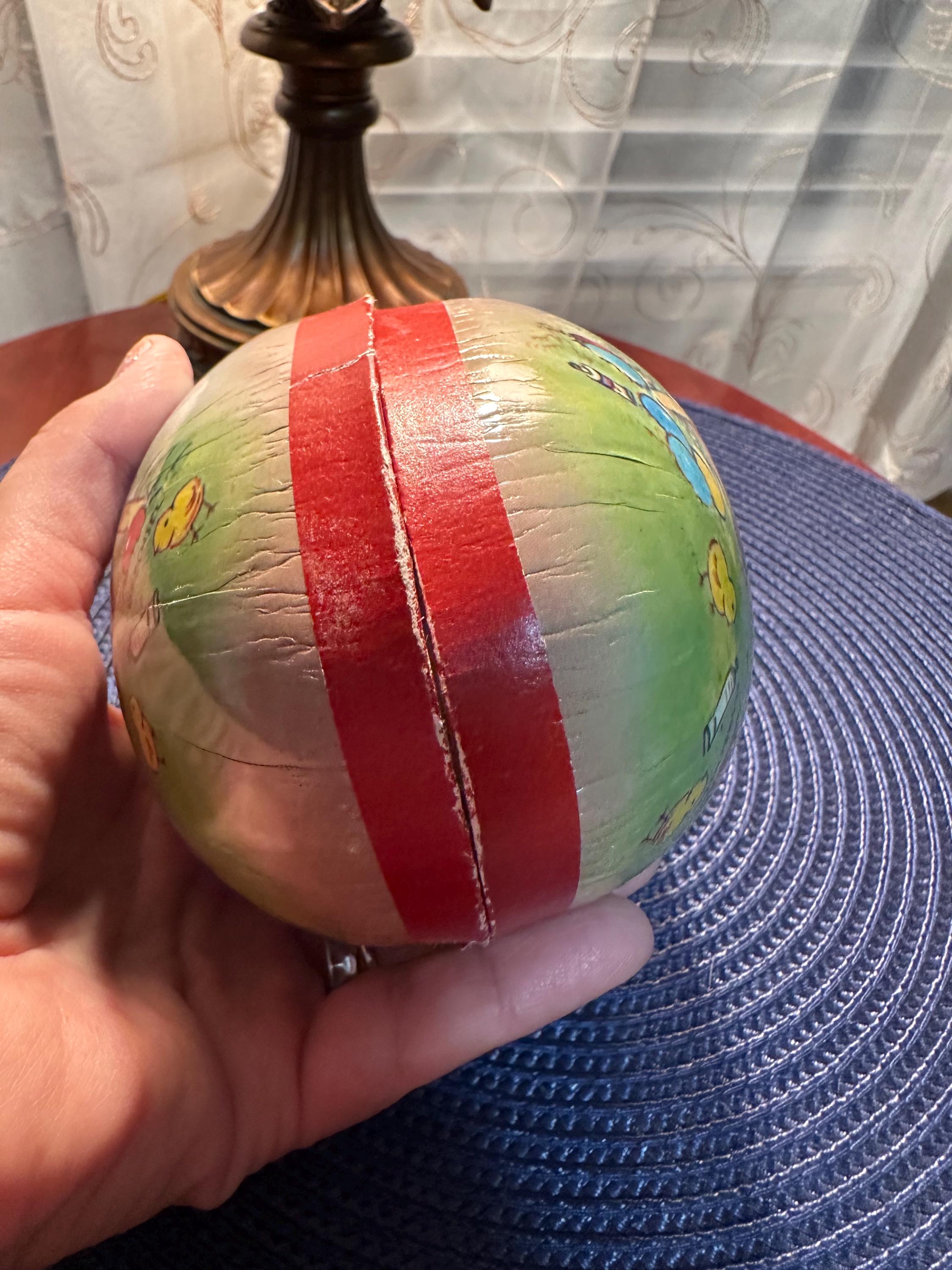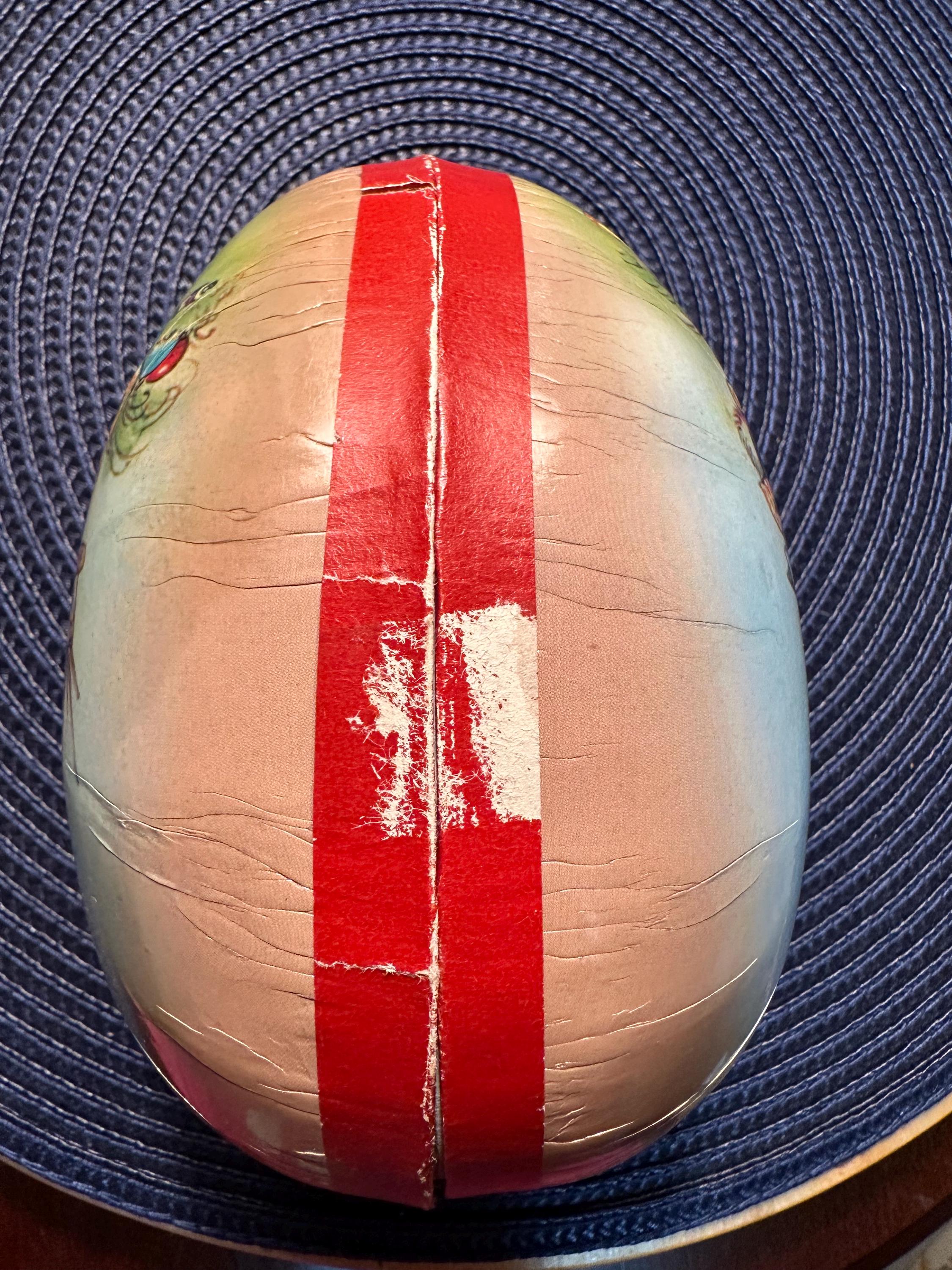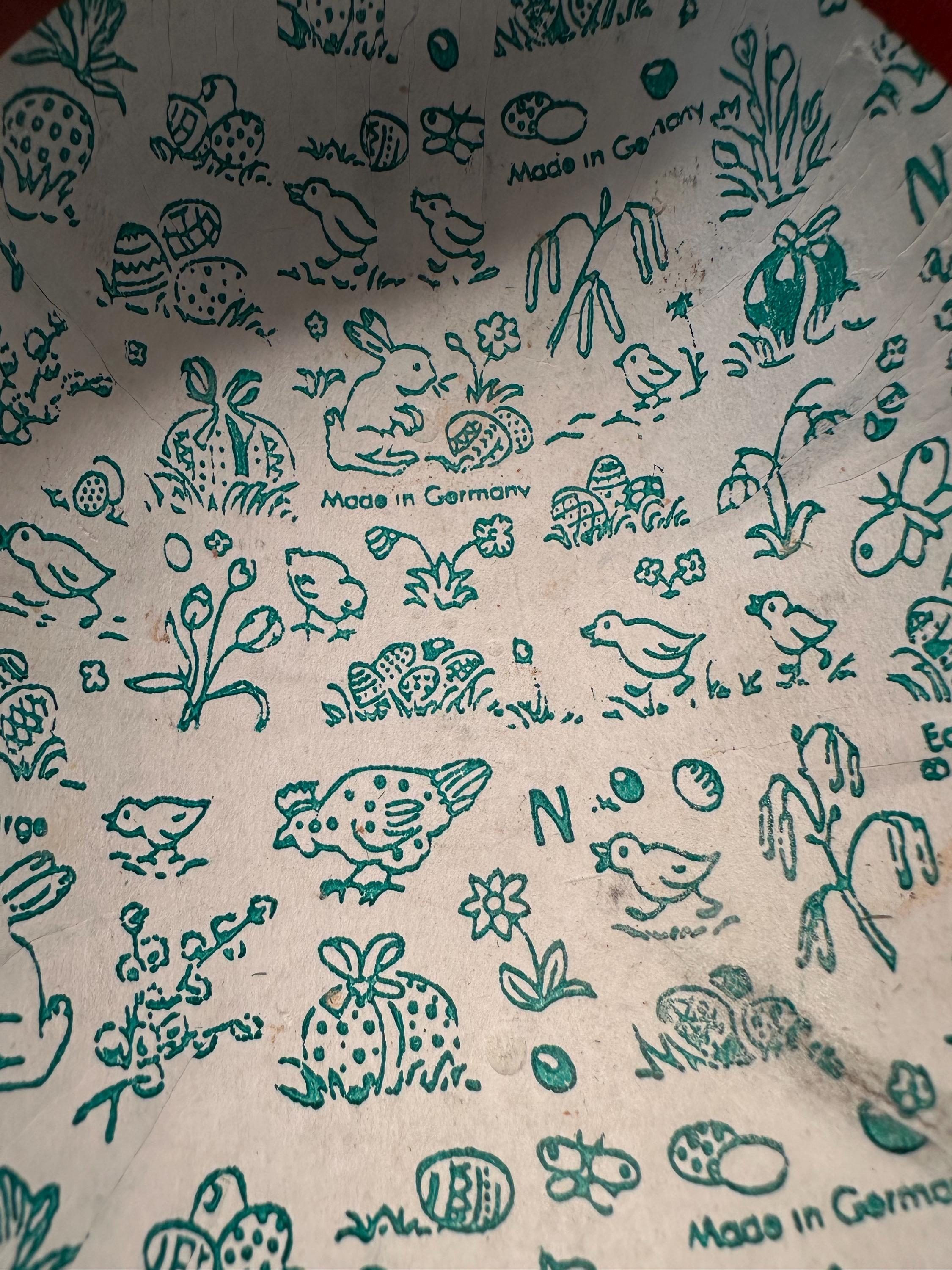 This is a vintage German made papier-mâché Easter egg of the Easter Bunny painting eggs. This is hand crafted from the 1950s by M Drechsel. This item has some torn edges where the egg has been opened and closed over the years. There are pictures of the worn areas on this must have holiday decoration. Color may be different due to the camera or the lighting. Please contact us if you have any questons and if you would like to see more pictures.