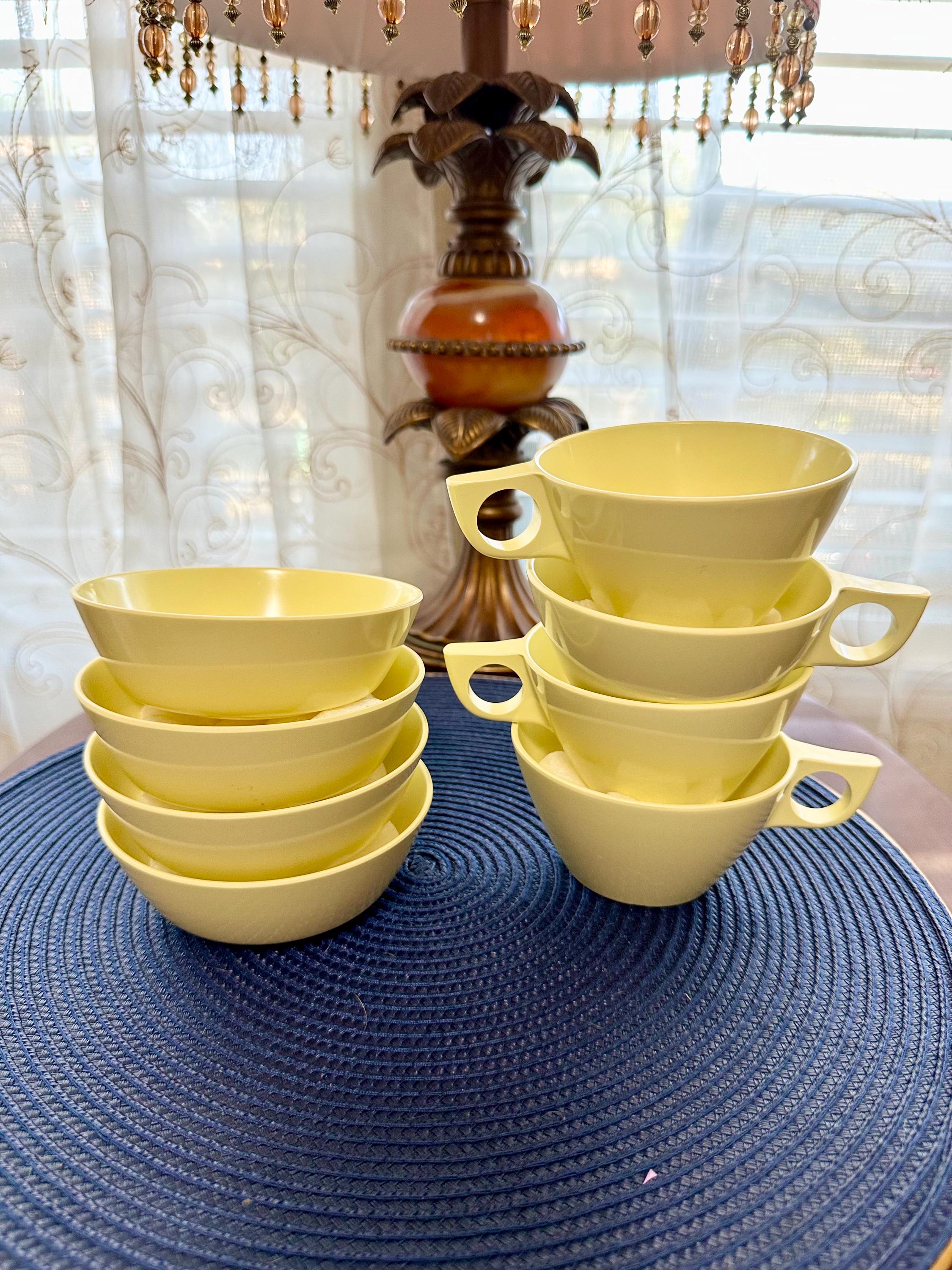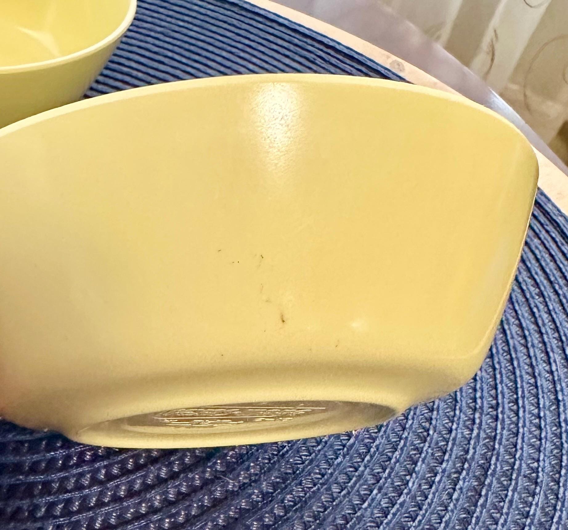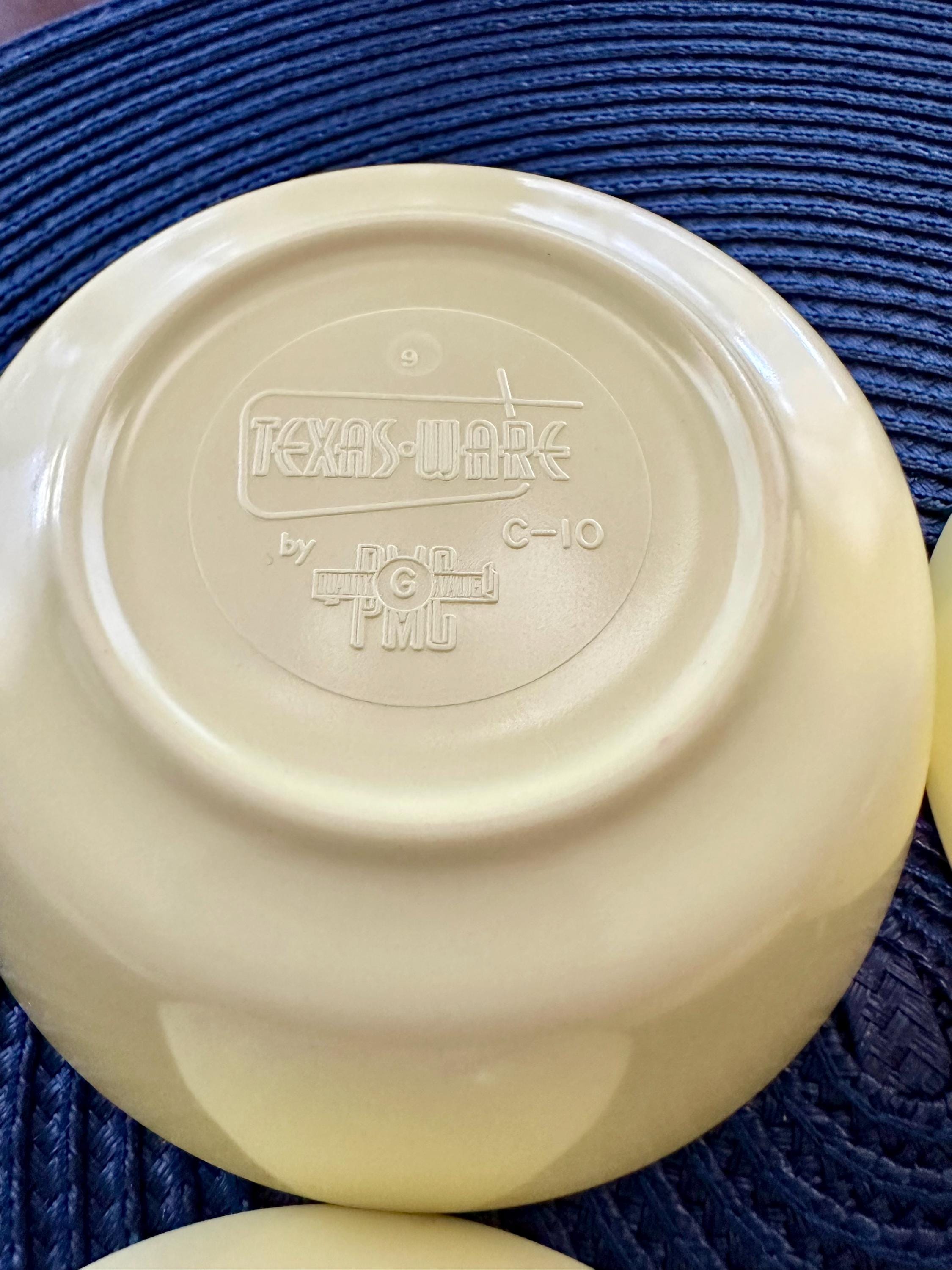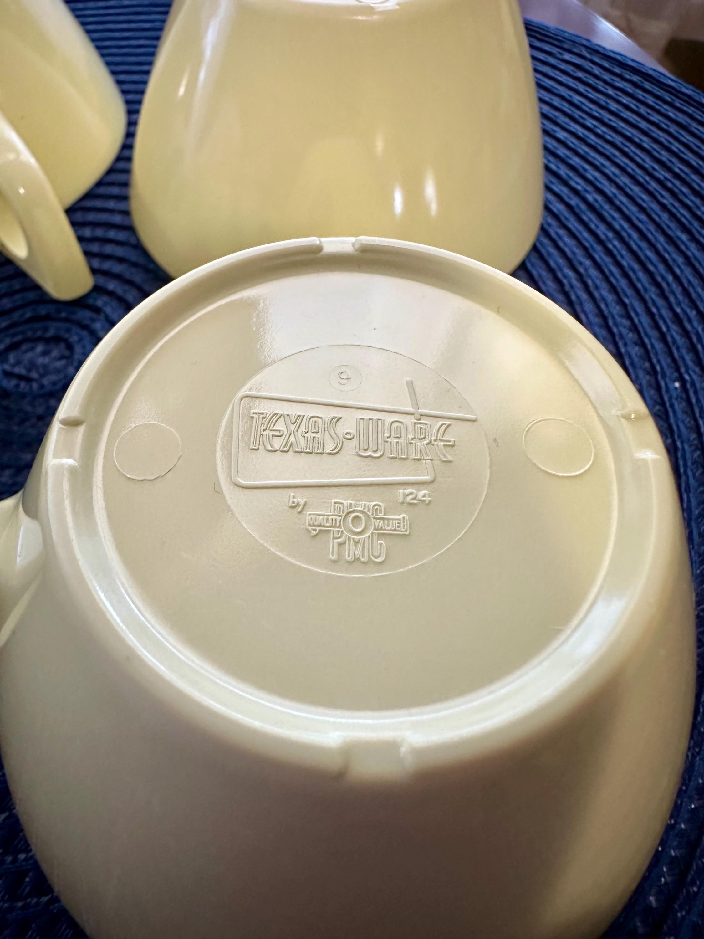 These are vintage Texas-Ware Bowls and Cups by PMC. These melamine bowls and cups in yellow are perfect if you have a collection you are looking to add to or if you are a lover of all things vintage. There is a few red specks on one of the bowls. There are no major scratches on these bowls and cups. There is no chips or cracks on any of these dishes. These are genuine TEXAS-WARE vintage dishes, they are not microwaveable or dishwasher safe. It is suggested to wash them in warm soapy water.
