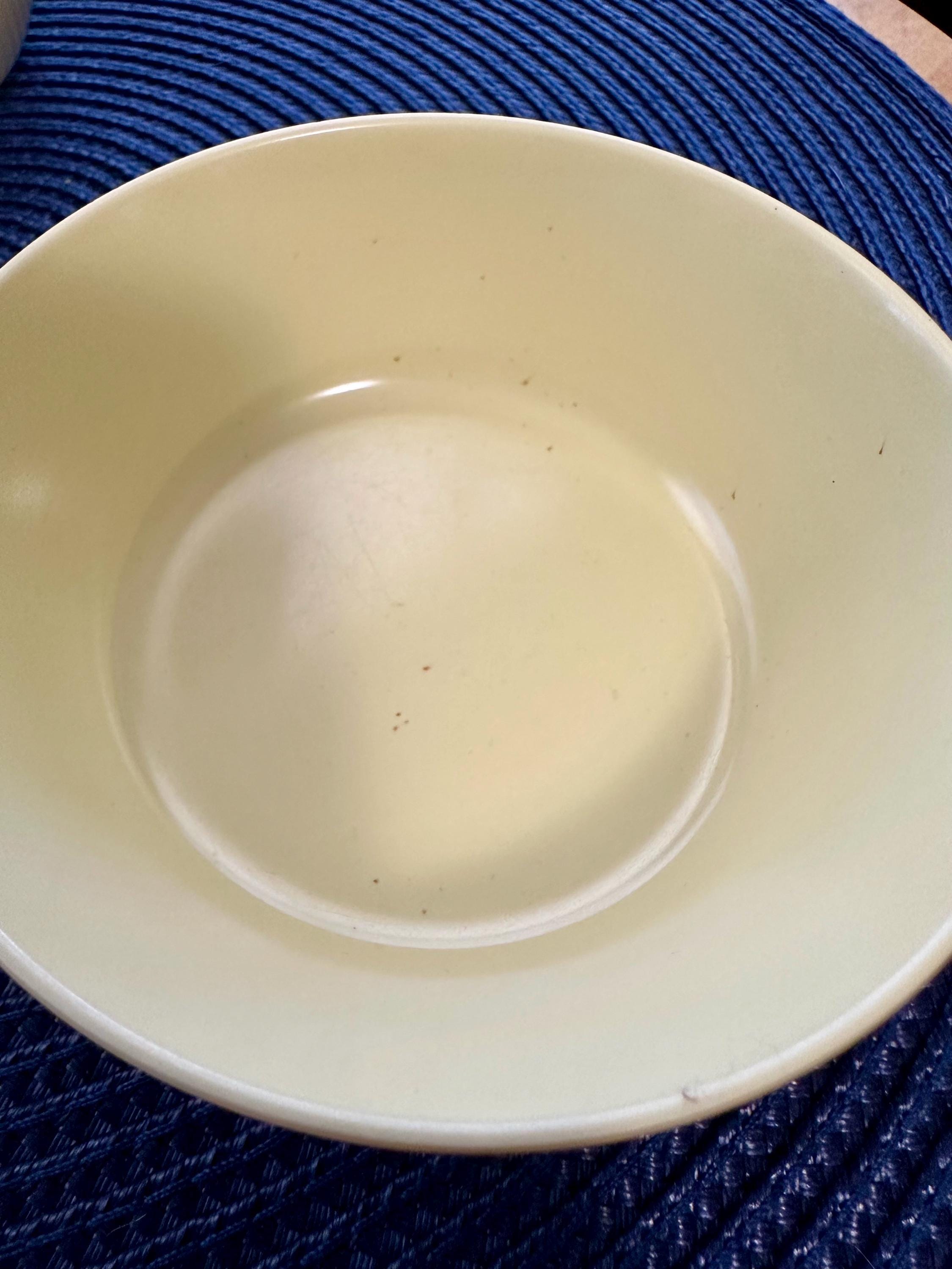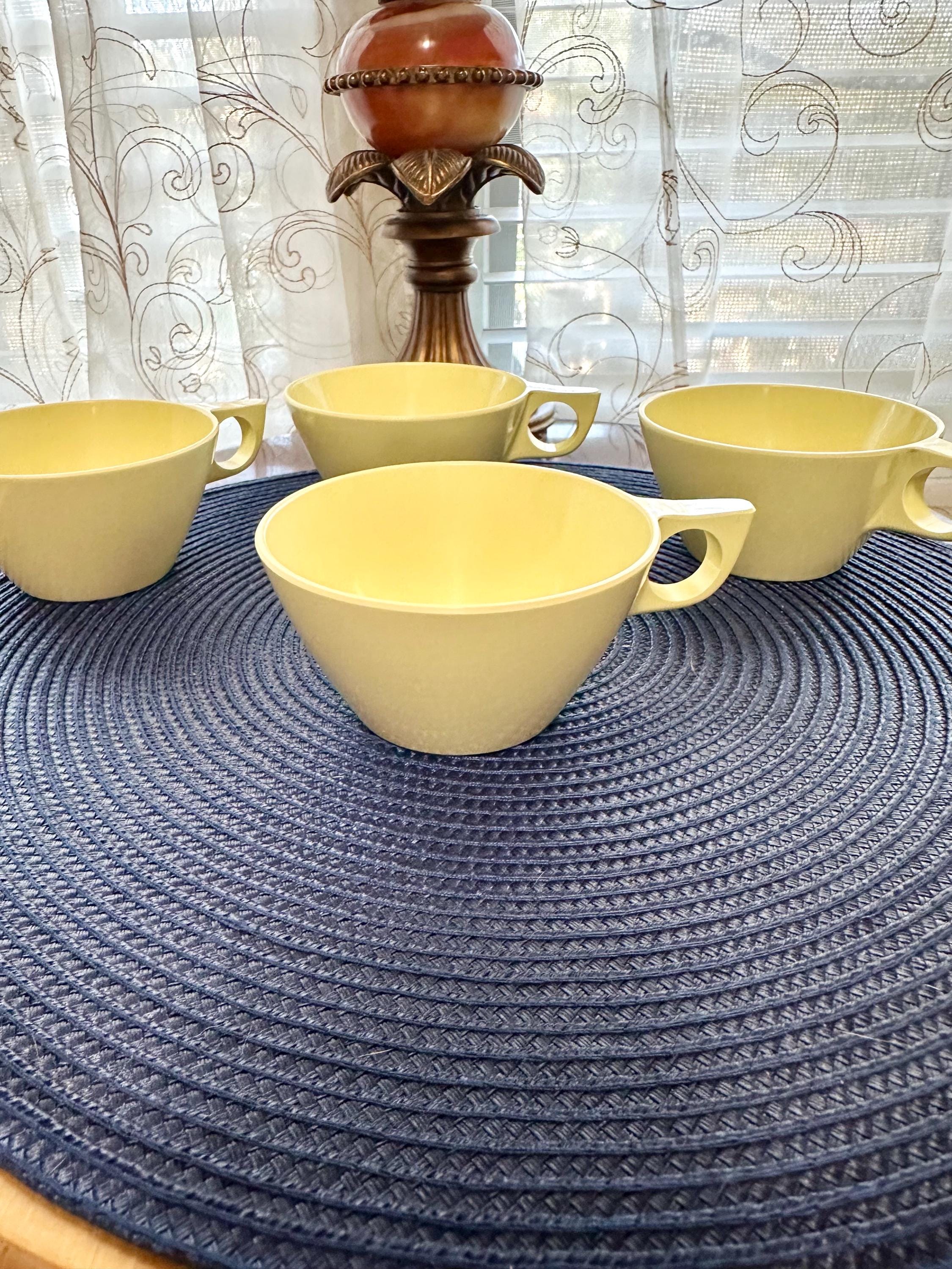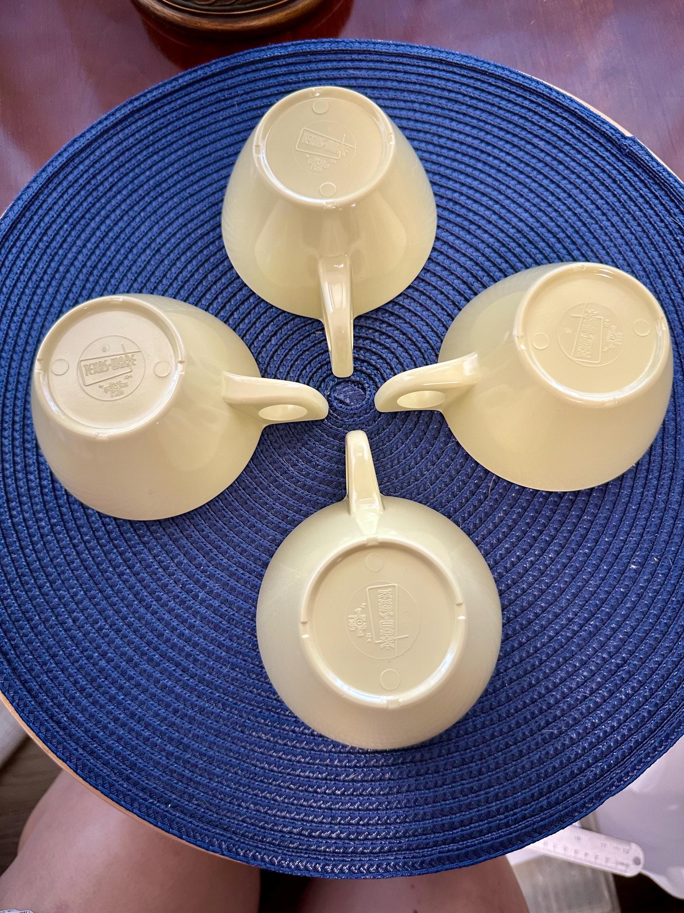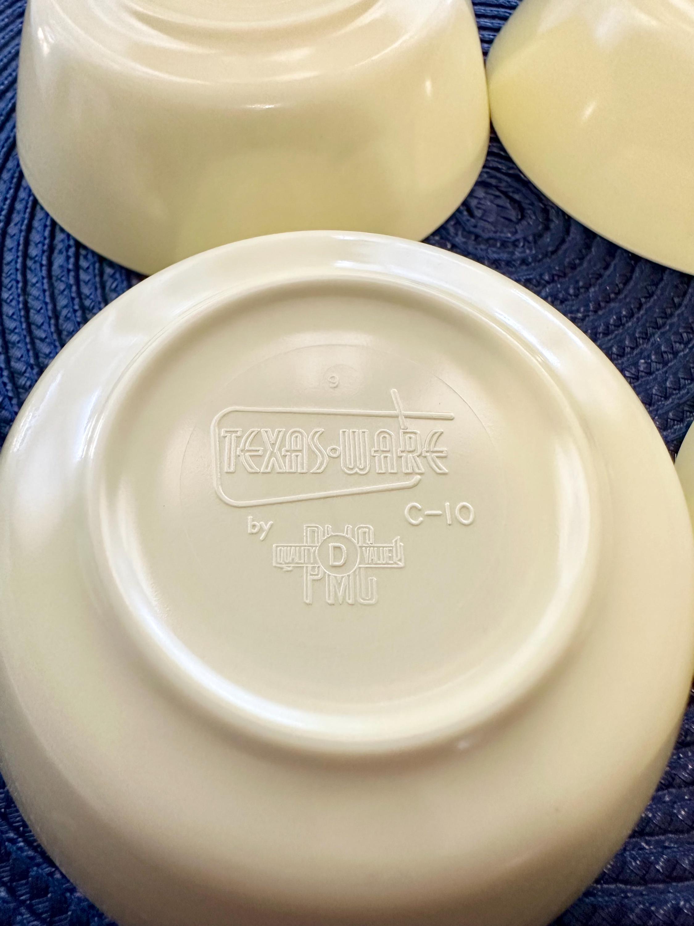These are vintage Texas-Ware Bowls and Cups by PMC. These melamine bowls and cups in yellow are perfect if you have a collection you are looking to add to or if you are a lover of all things vintage. There is a few red specks on one of the bowls. There are no major scratches on these bowls and cups. There is no chips or cracks on any of these dishes. These are genuine TEXAS-WARE vintage dishes, they are not microwaveable or dishwasher safe. It is suggested to wash them in warm soapy water.