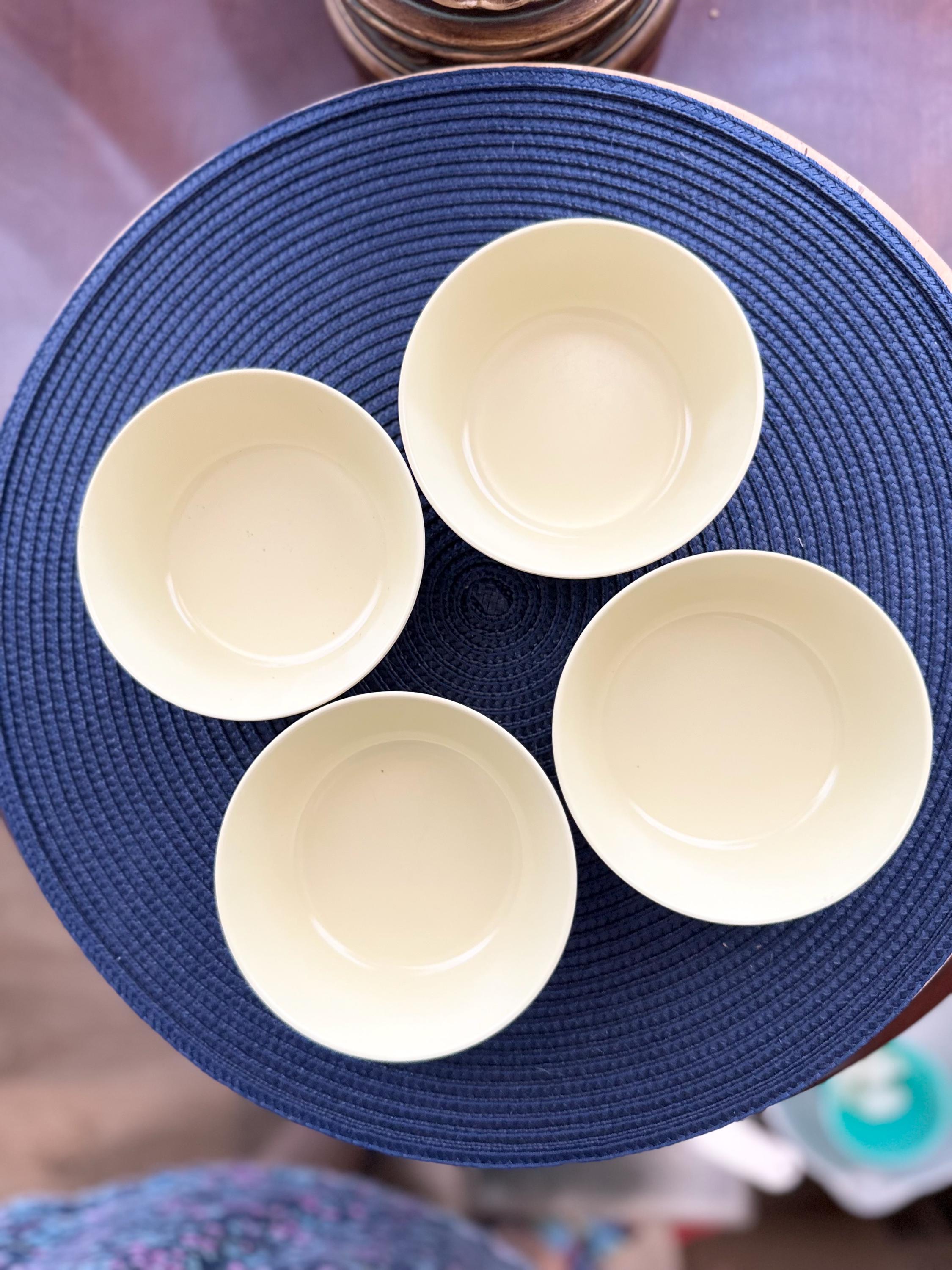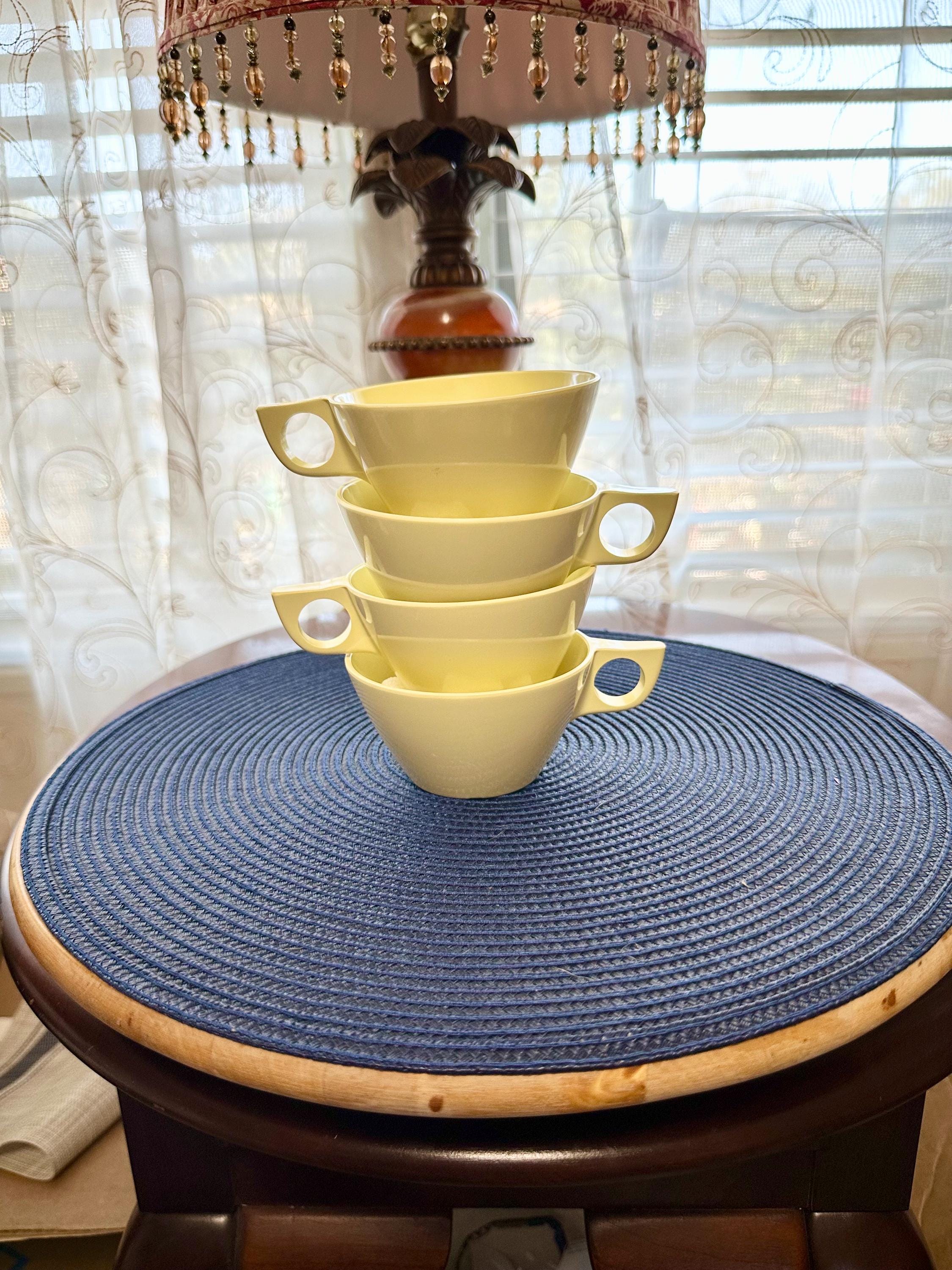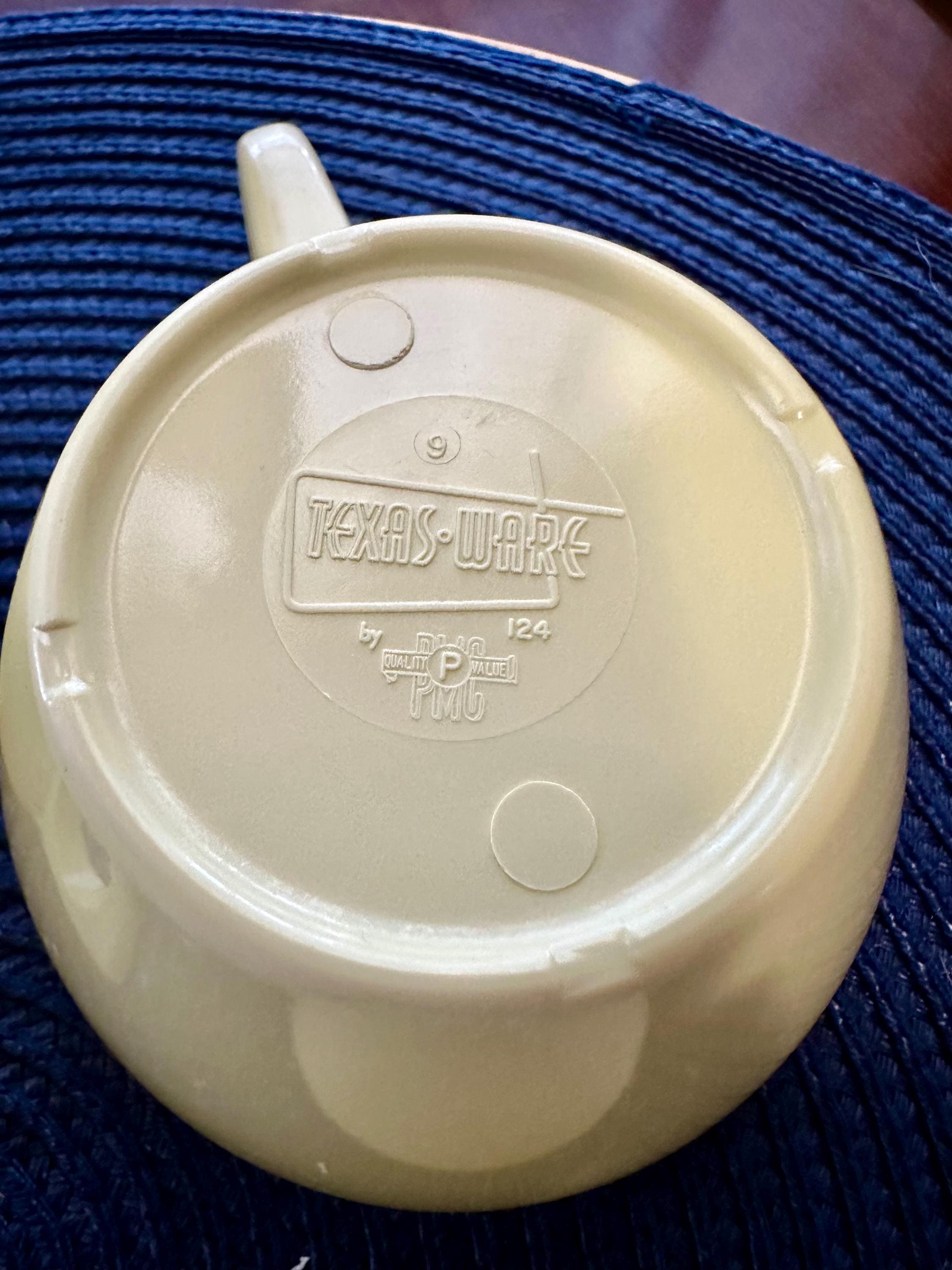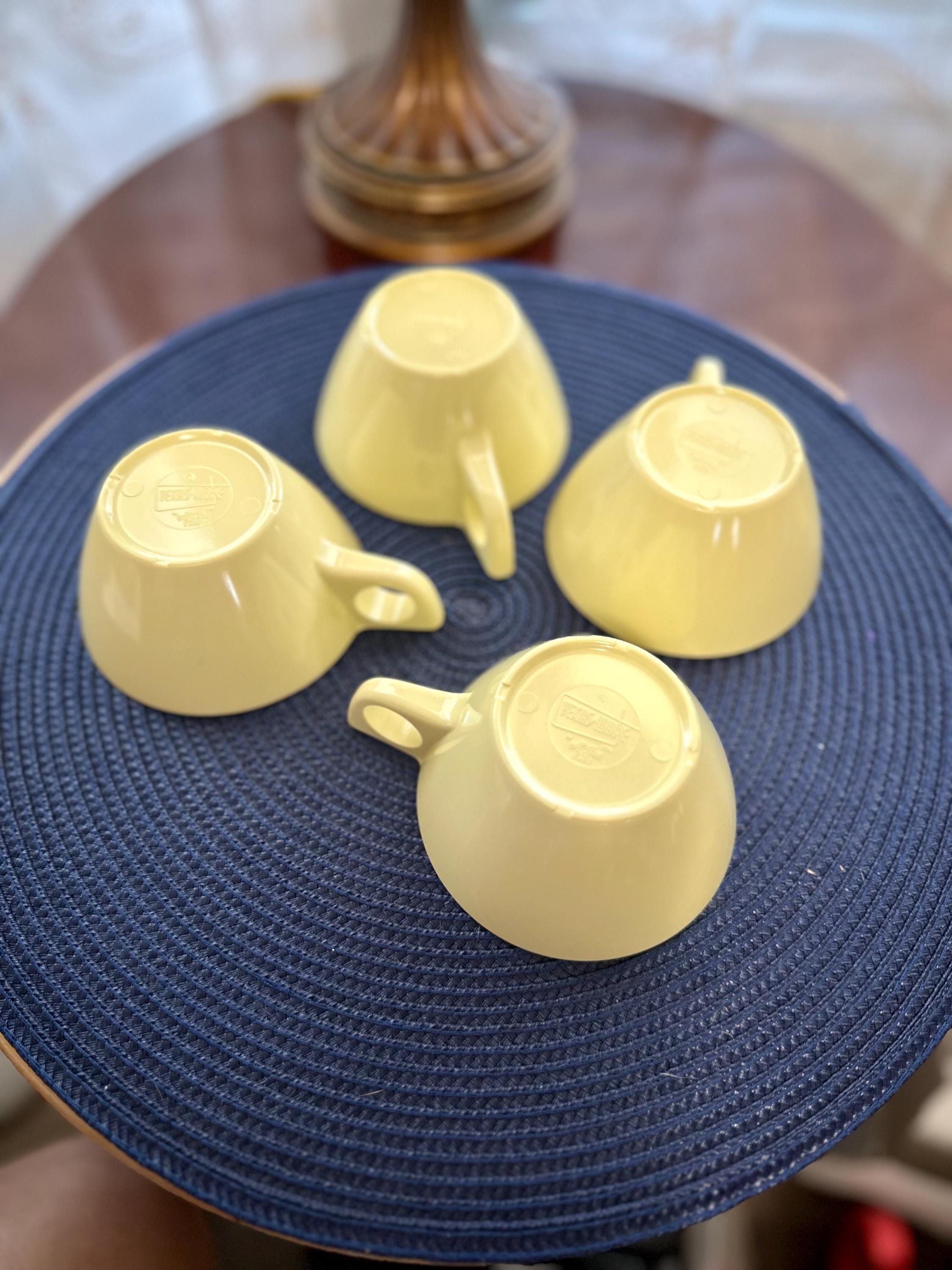 These are vintage Texas-Ware Bowls and Cups by PMC. These melamine bowls and cups in yellow are perfect if you have a collection you are looking to add to or if you are a lover of all things vintage. There is a few red specks on one of the bowls. There are no major scratches on these bowls and cups. There is no chips or cracks on any of these dishes. These are genuine TEXAS-WARE vintage dishes, they are not microwaveable or dishwasher safe. It is suggested to wash them in warm soapy water.