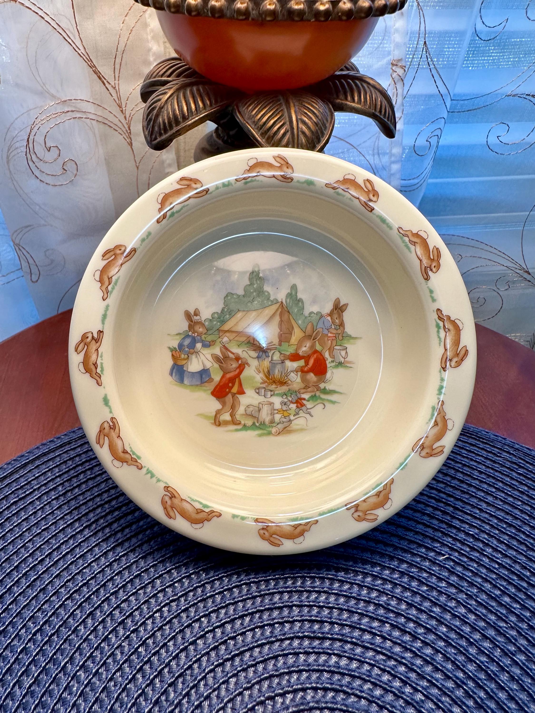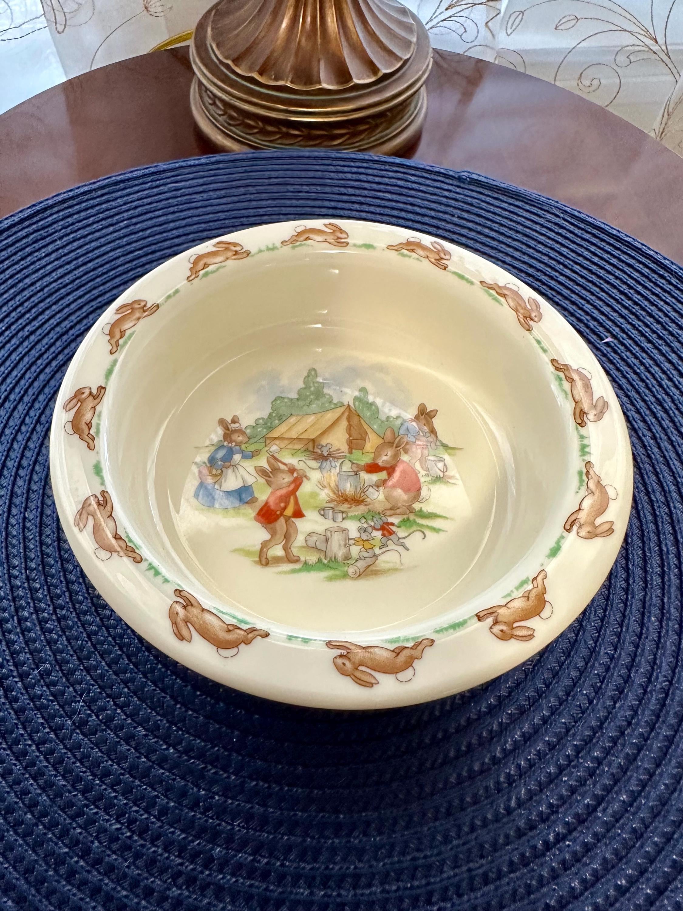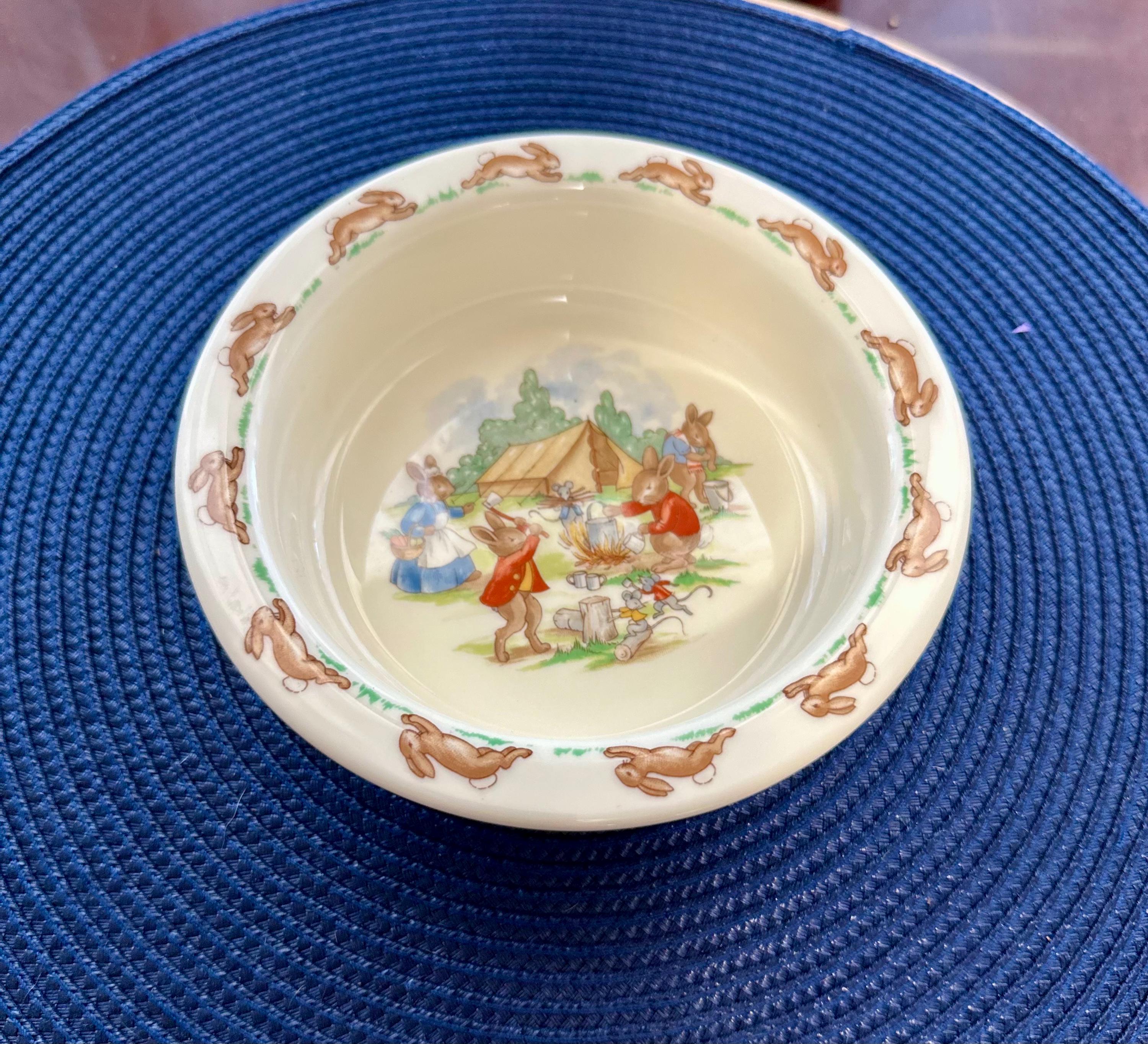 This is an adorable child's bowl by Royal Doulton named "Bunnykins". This bowl has no cracks, chips, crazing or blemishes. Some of Royal Doulton dishes are not safe to eat of off. I do not have the exact year this was made so I do not suggest you use it for eating. But it will be great for decoration. Color may be different due to the lighting or camera. If you have any questions please contact us.