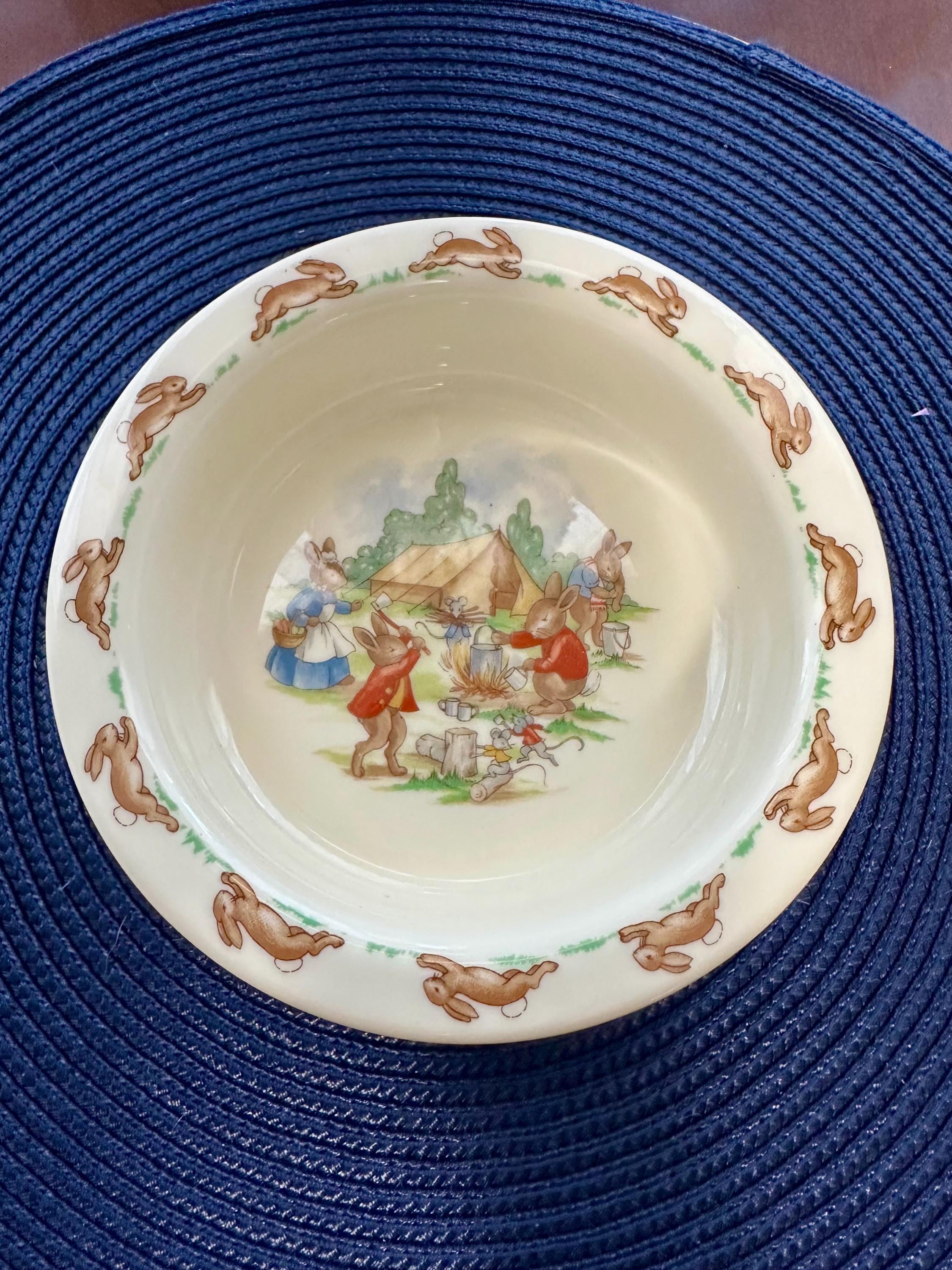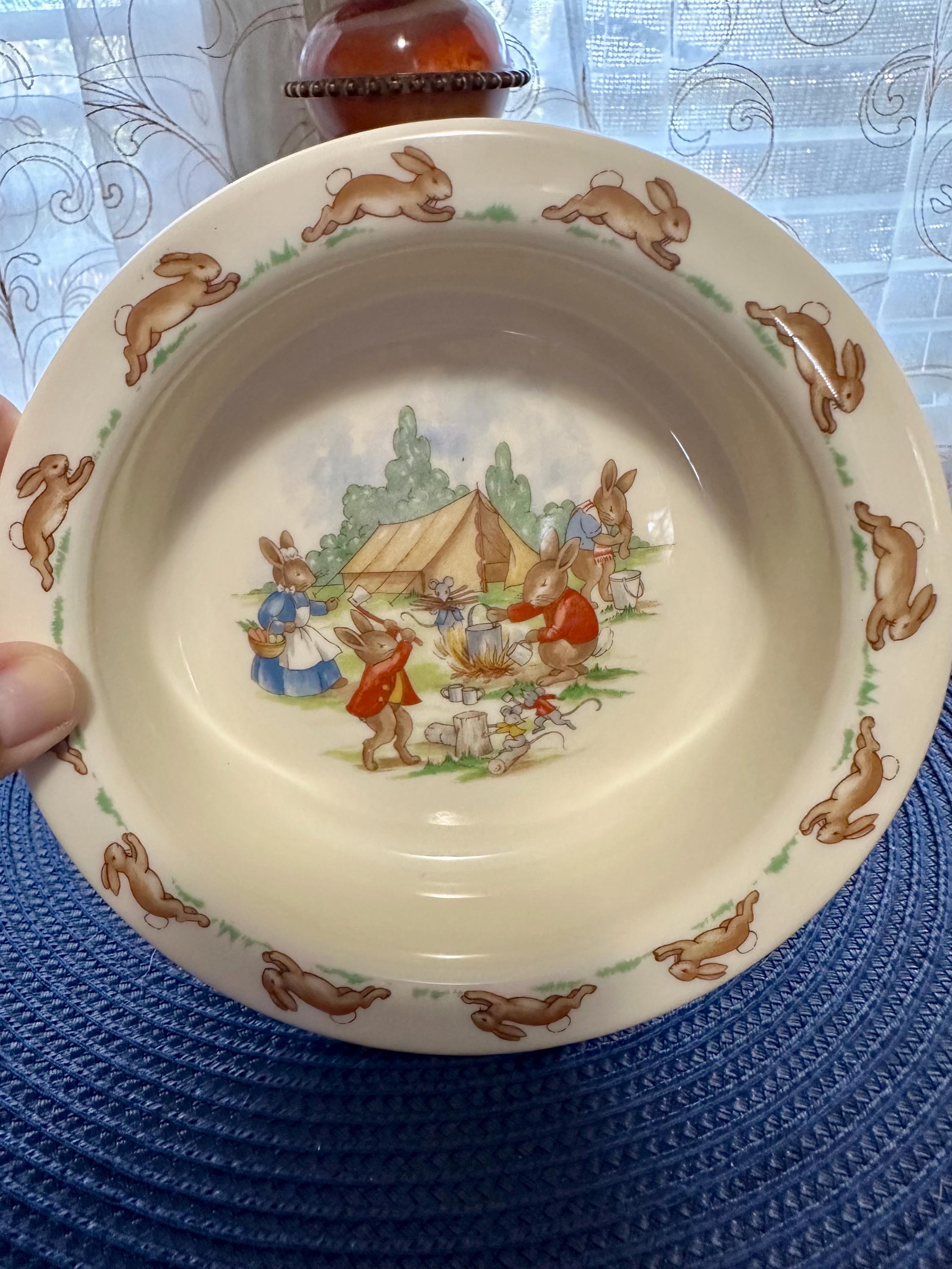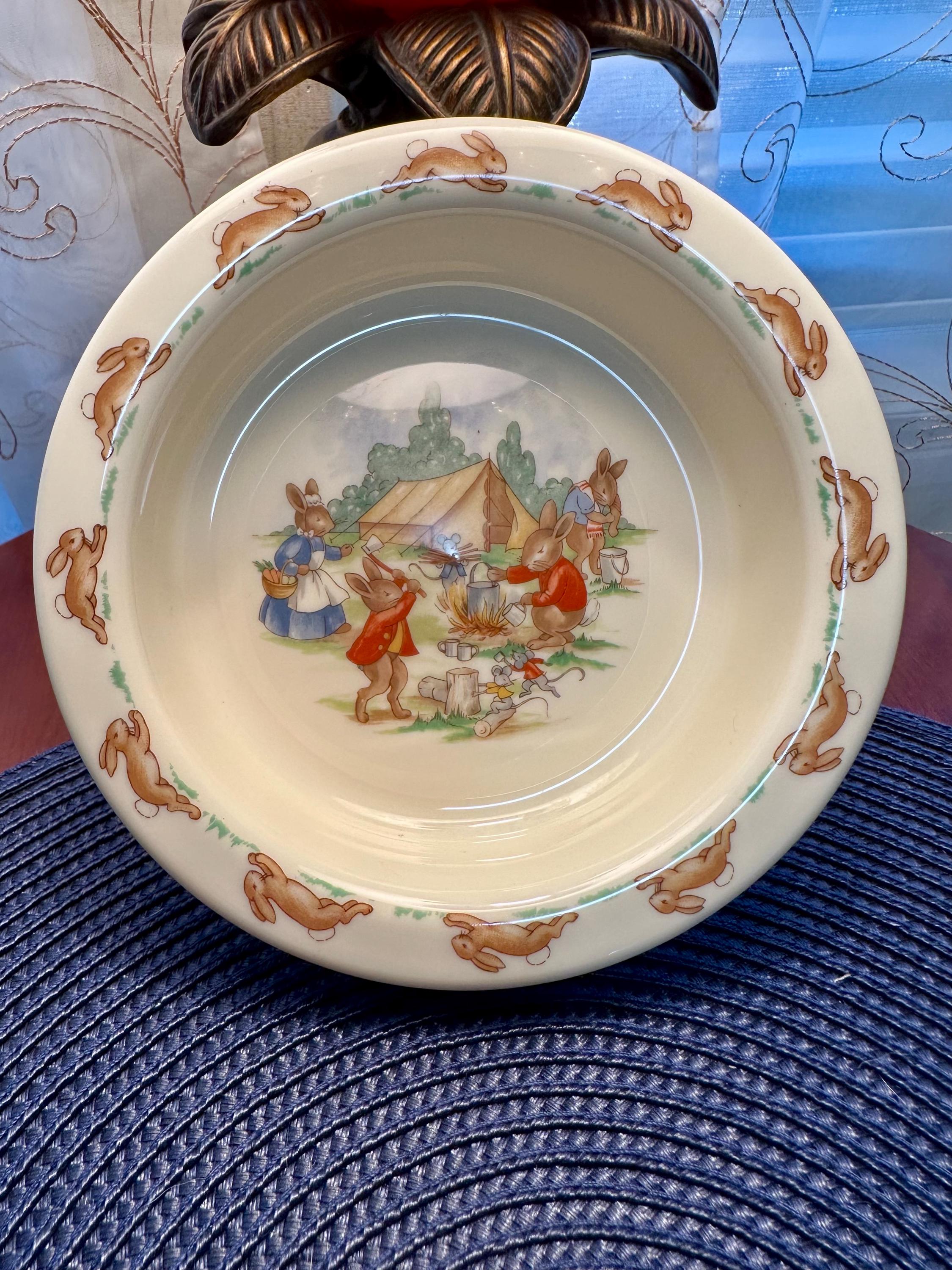 This is an adorable child's bowl by Royal Doulton named "Bunnykins". This bowl has no cracks, chips, crazing or blemishes. Some of Royal Doulton dishes are not safe to eat of off. I do not have the exact year this was made so I do not suggest you use it for eating. But it will be great for decoration. Color may be different due to the lighting or camera. If you have any questions please contact us.