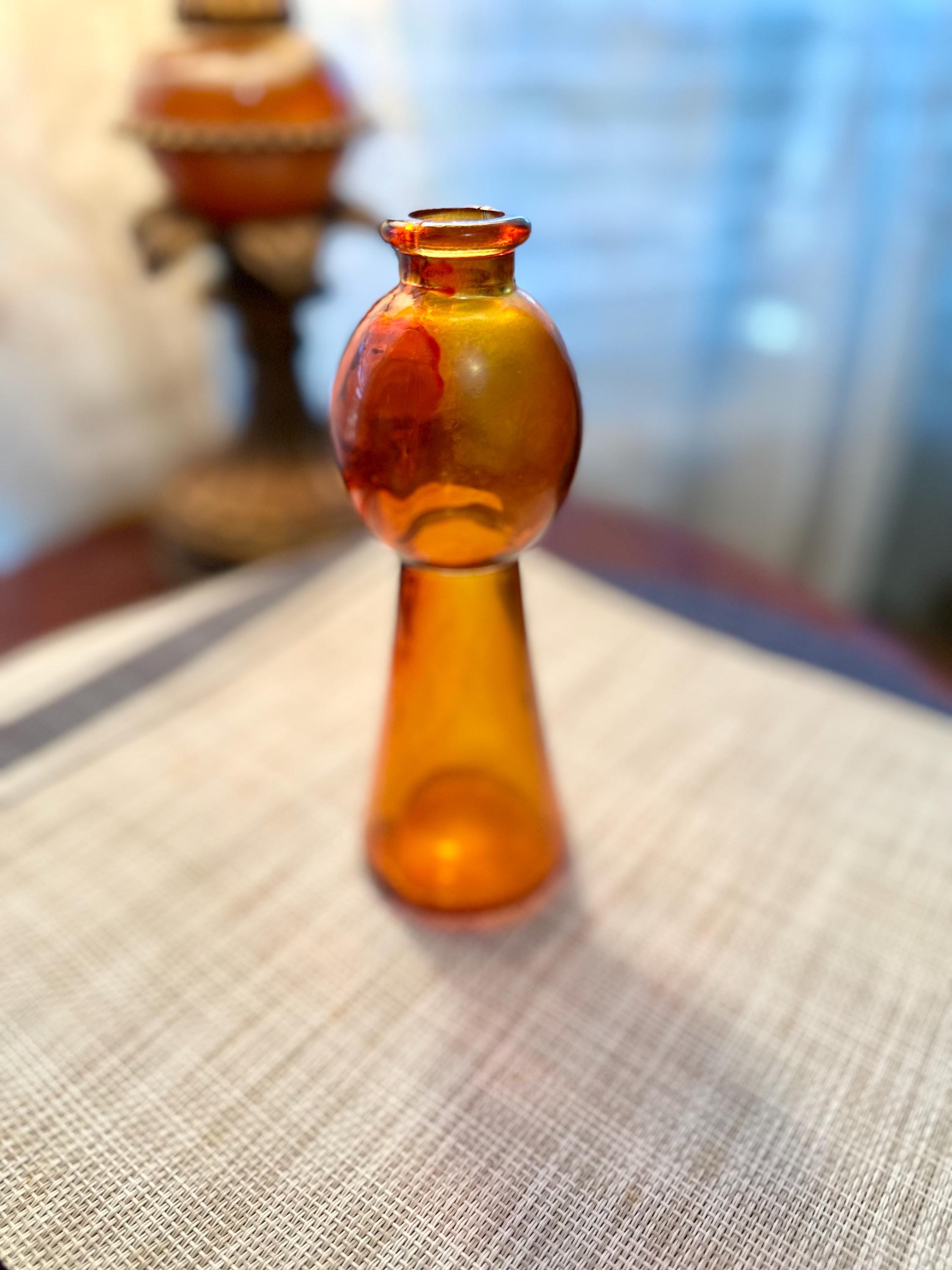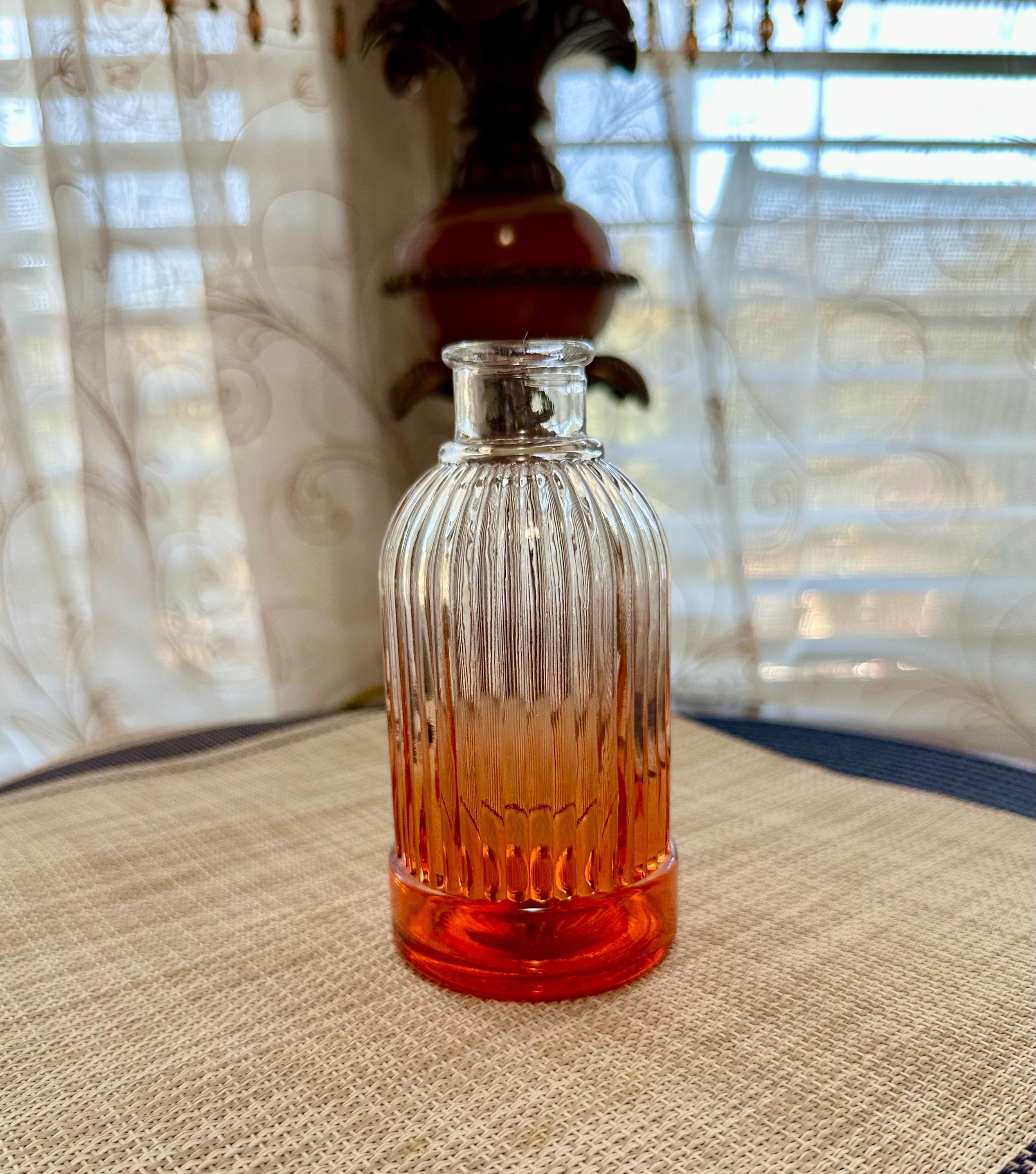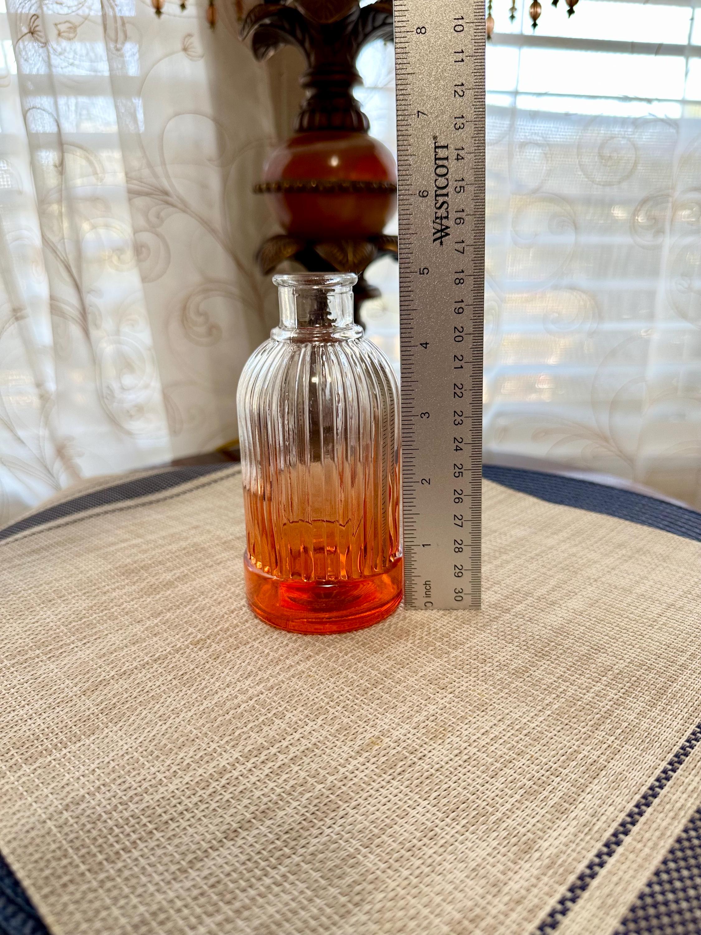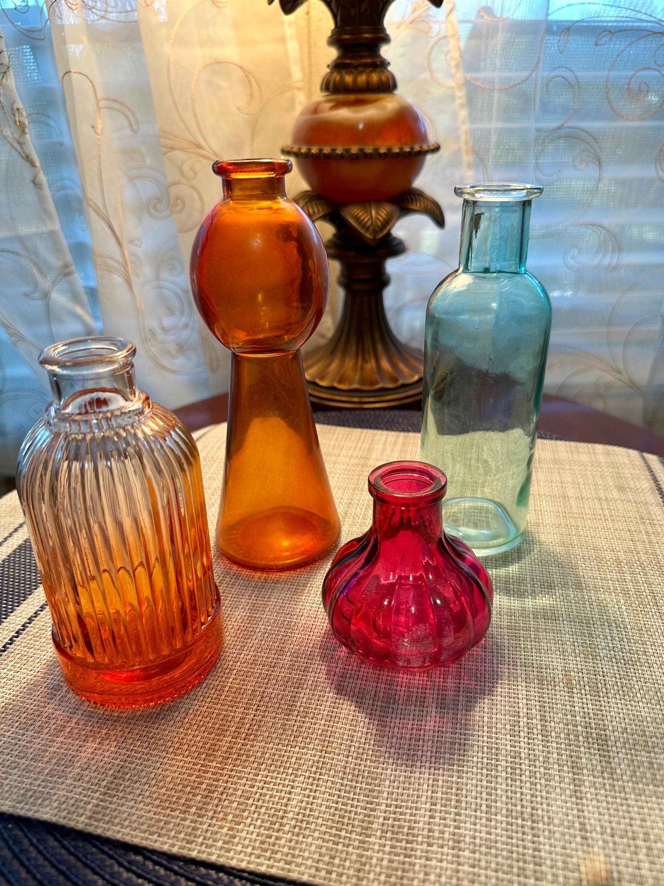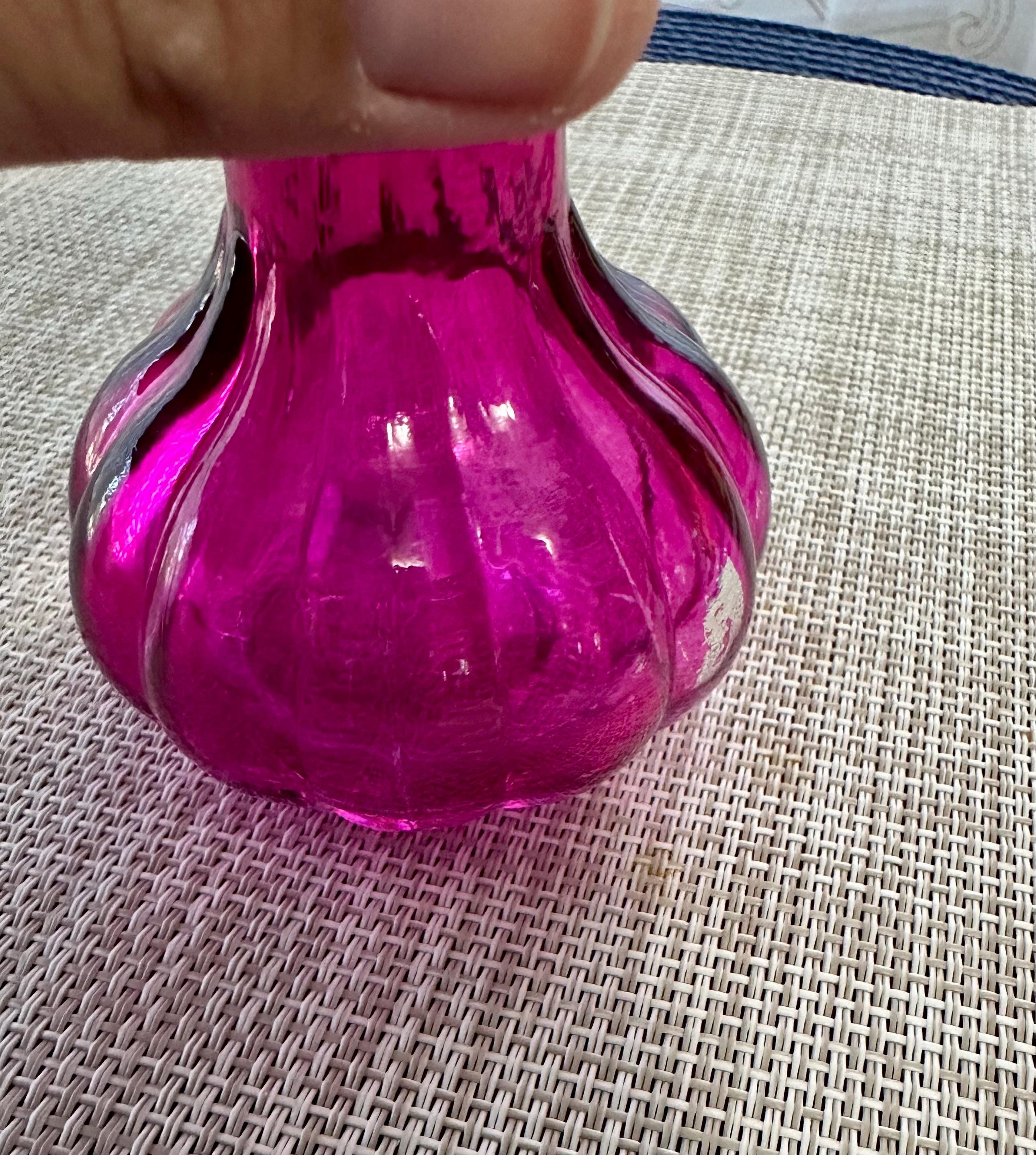 Set of 4 mini vases. The clear vase is 6.5 inches tall, no cracks or chips. The pink vase is 3 inches tall. There is some color missing on the bottom (picture is included) it is stamped on the bottom "HR". The orange vase is very unique. There are two different colors of orange depending on the angle you look at it ( picture is included). The orange vase is 7 inches tall. The final vase is a ombre orange to clear vase. This vase stands 5 inches tall.