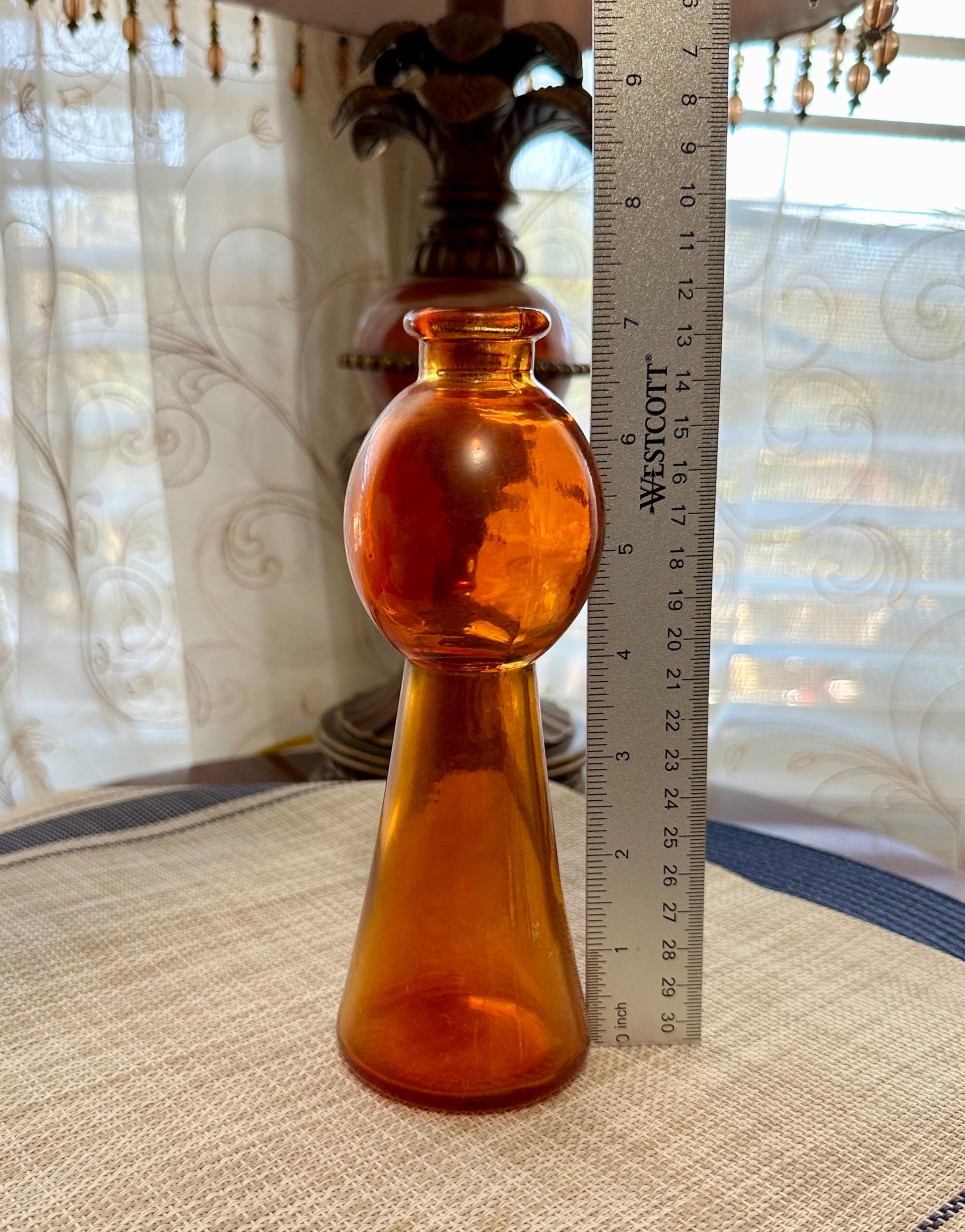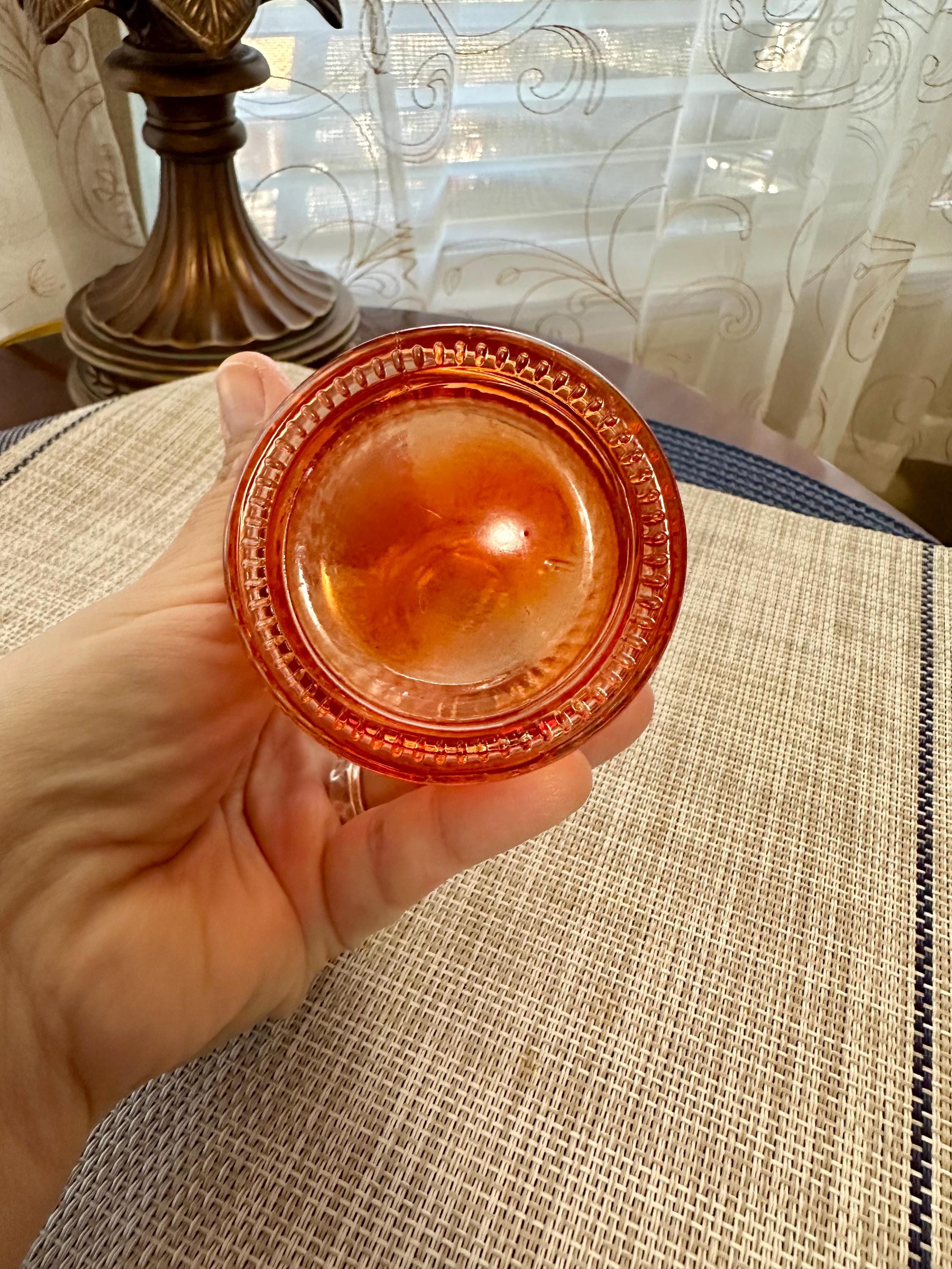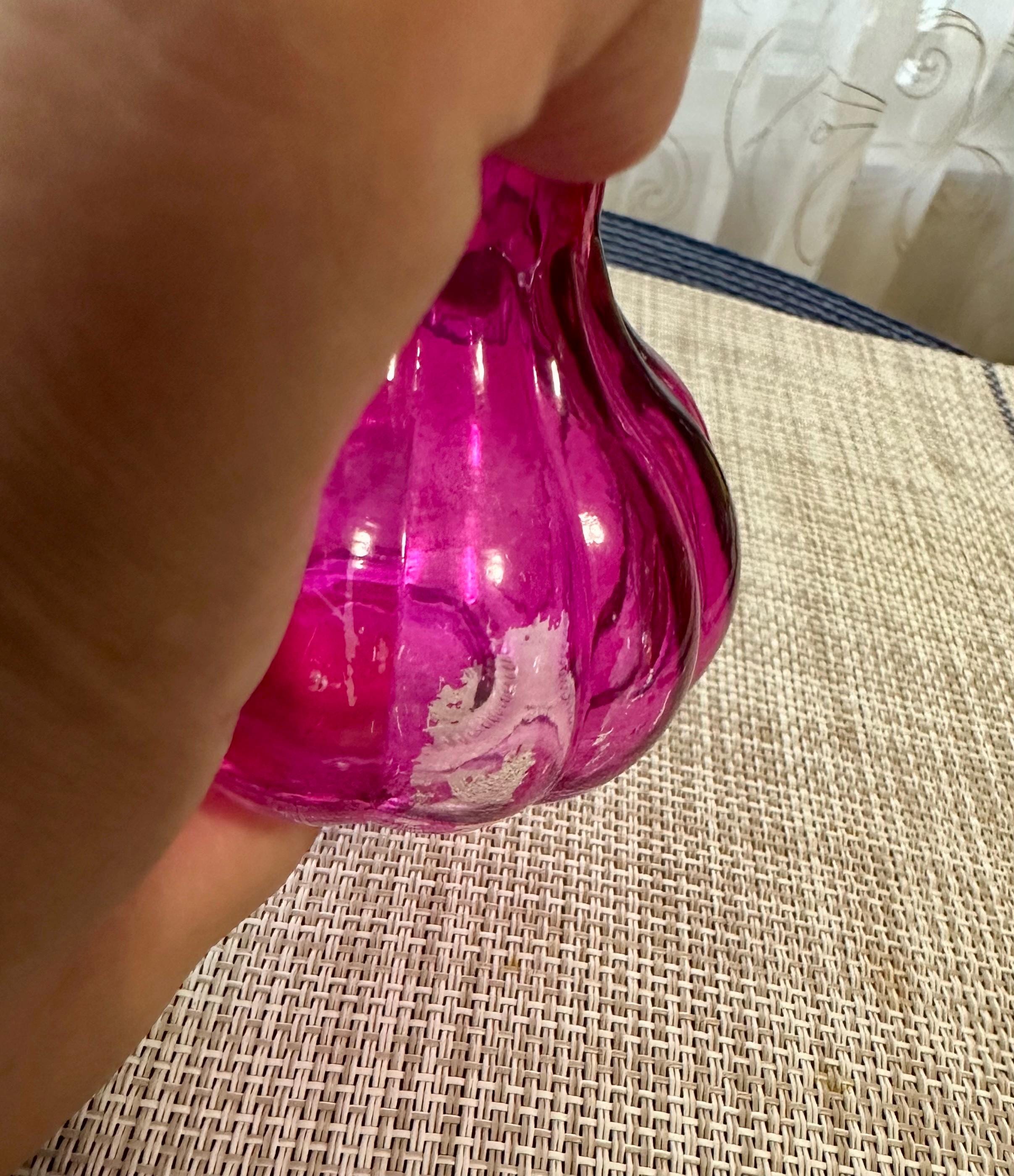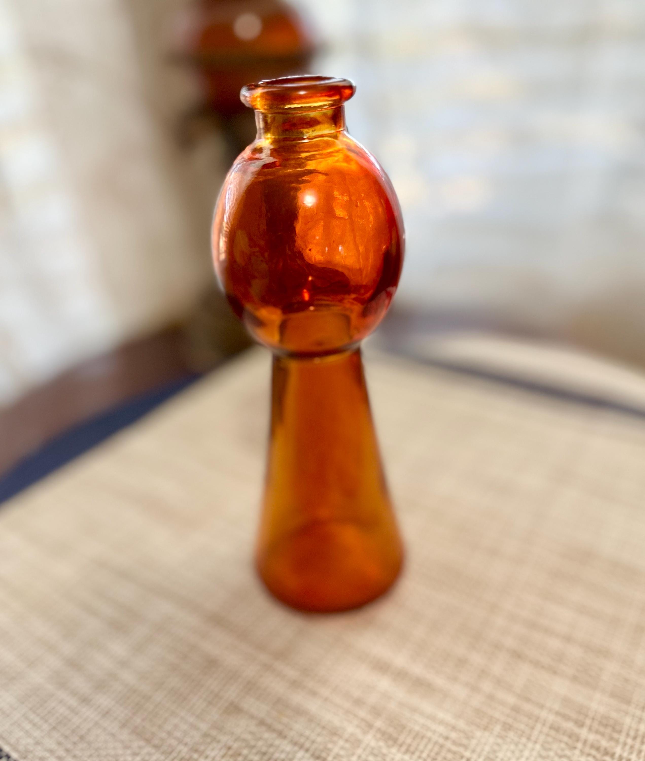 Set of 4 mini vases. The clear vase is 6.5 inches tall, no cracks or chips. The pink vase is 3 inches tall. There is some color missing on the bottom (picture is included) it is stamped on the bottom "HR". The orange vase is very unique. There are two different colors of orange depending on the angle you look at it ( picture is included). The orange vase is 7 inches tall. The final vase is a ombre orange to clear vase. This vase stands 5 inches tall.