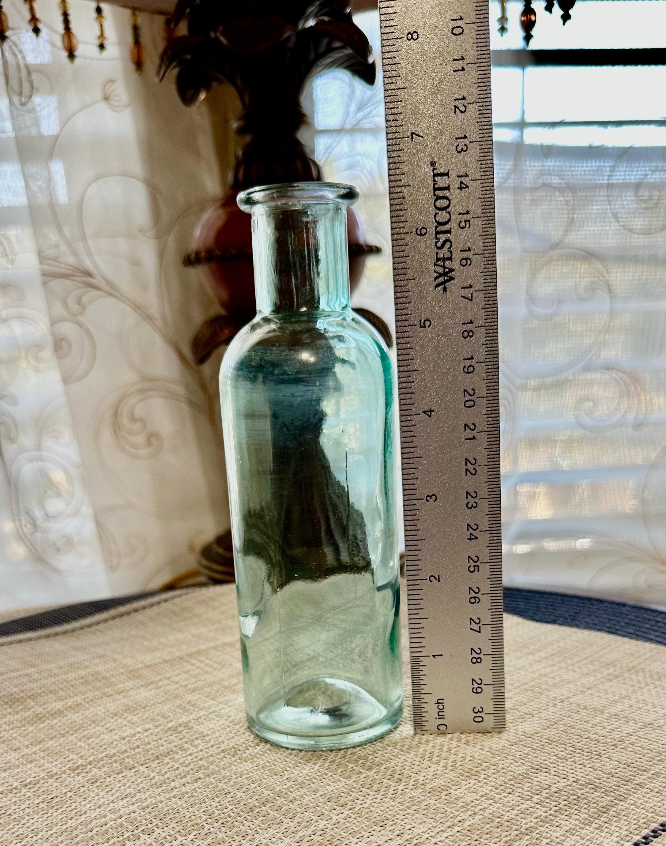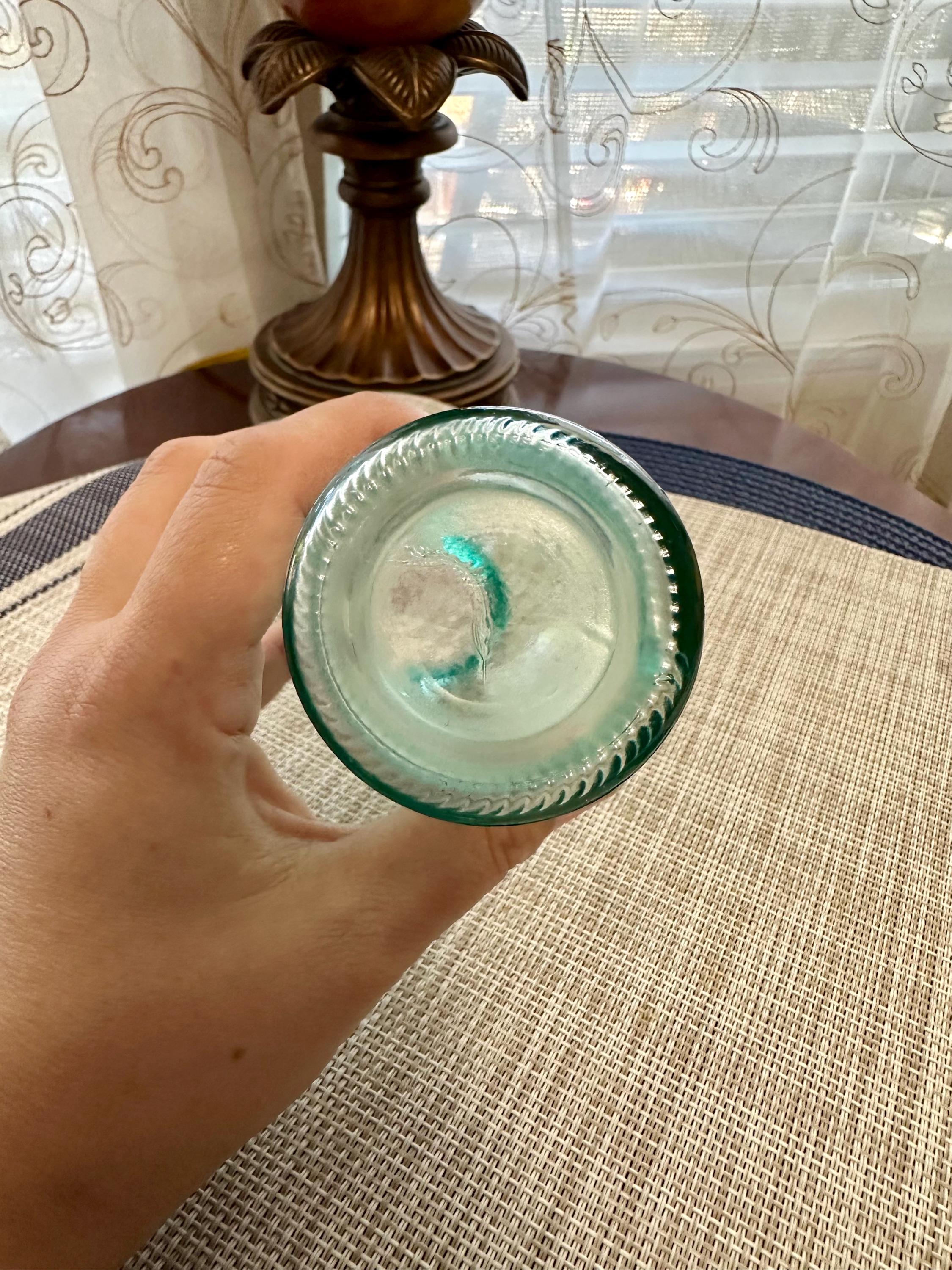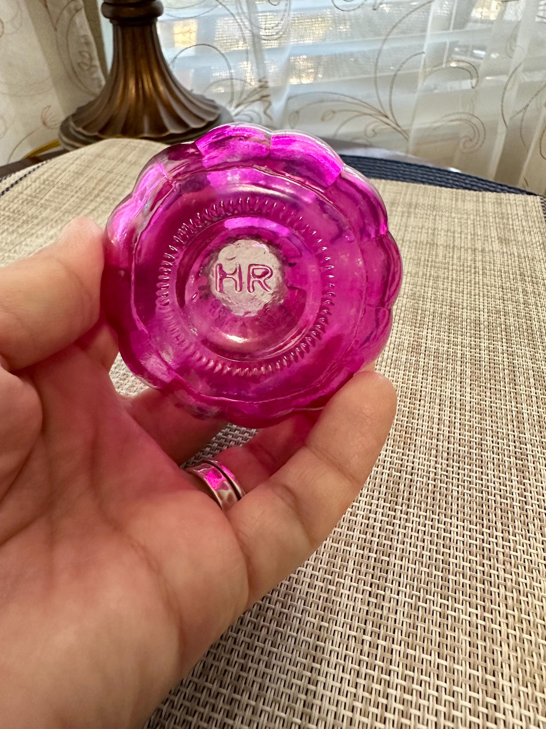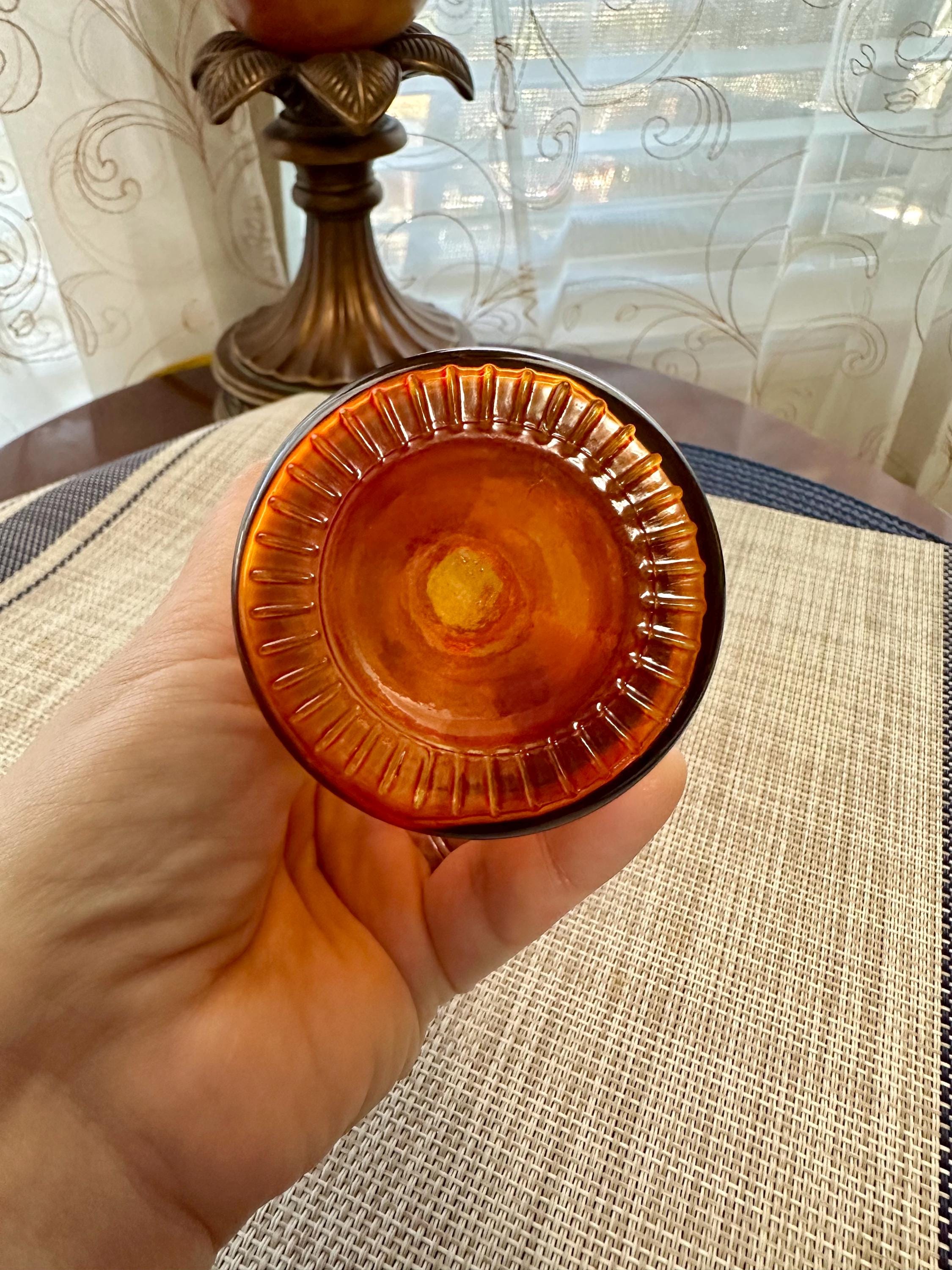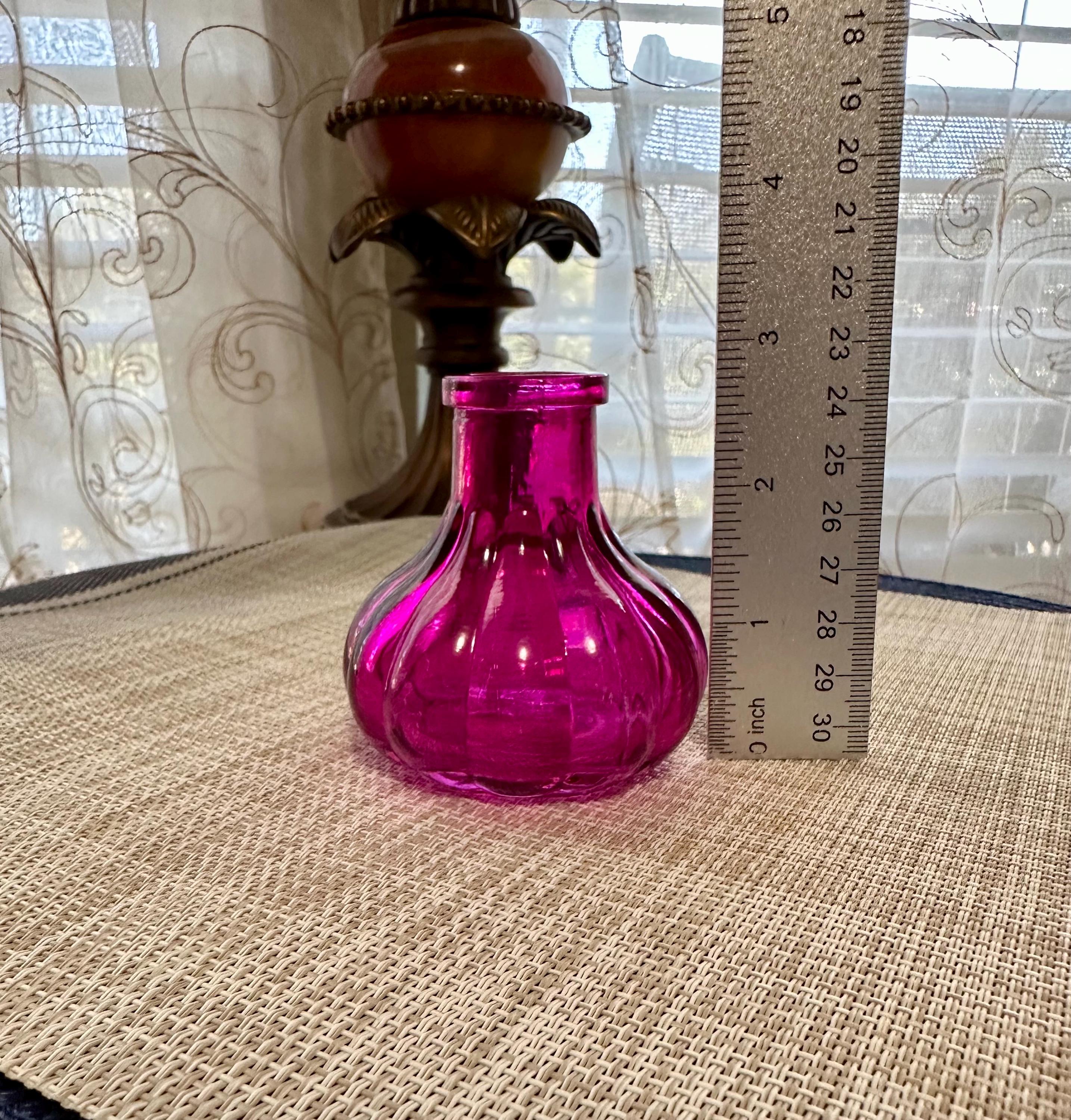 Set of 4 mini vases. The clear vase is 6.5 inches tall, no cracks or chips. The pink vase is 3 inches tall. There is some color missing on the bottom (picture is included) it is stamped on the bottom "HR". The orange vase is very unique. There are two different colors of orange depending on the angle you look at it ( picture is included). The orange vase is 7 inches tall. The final vase is a ombre orange to clear vase. This vase stands 5 inches tall.