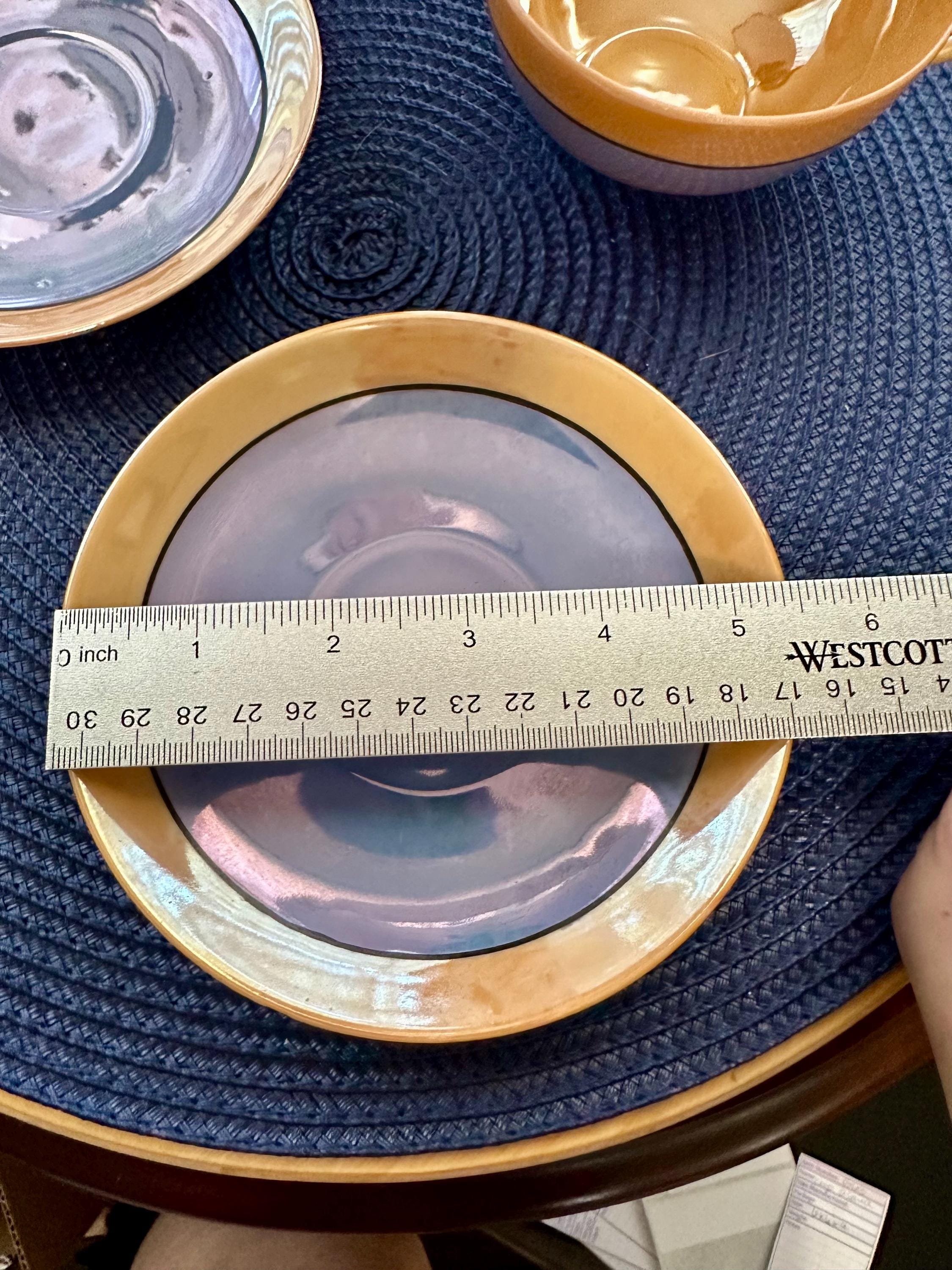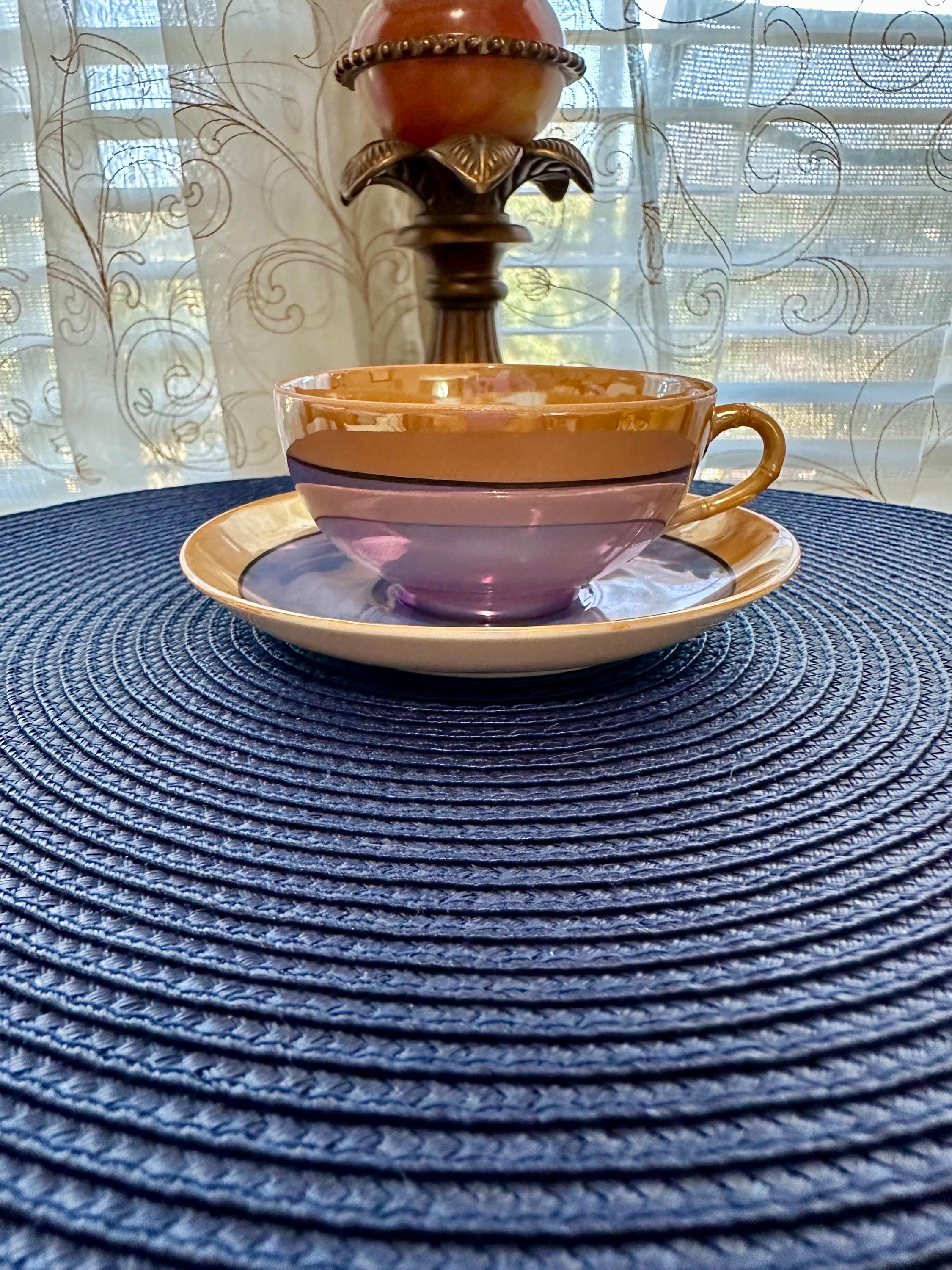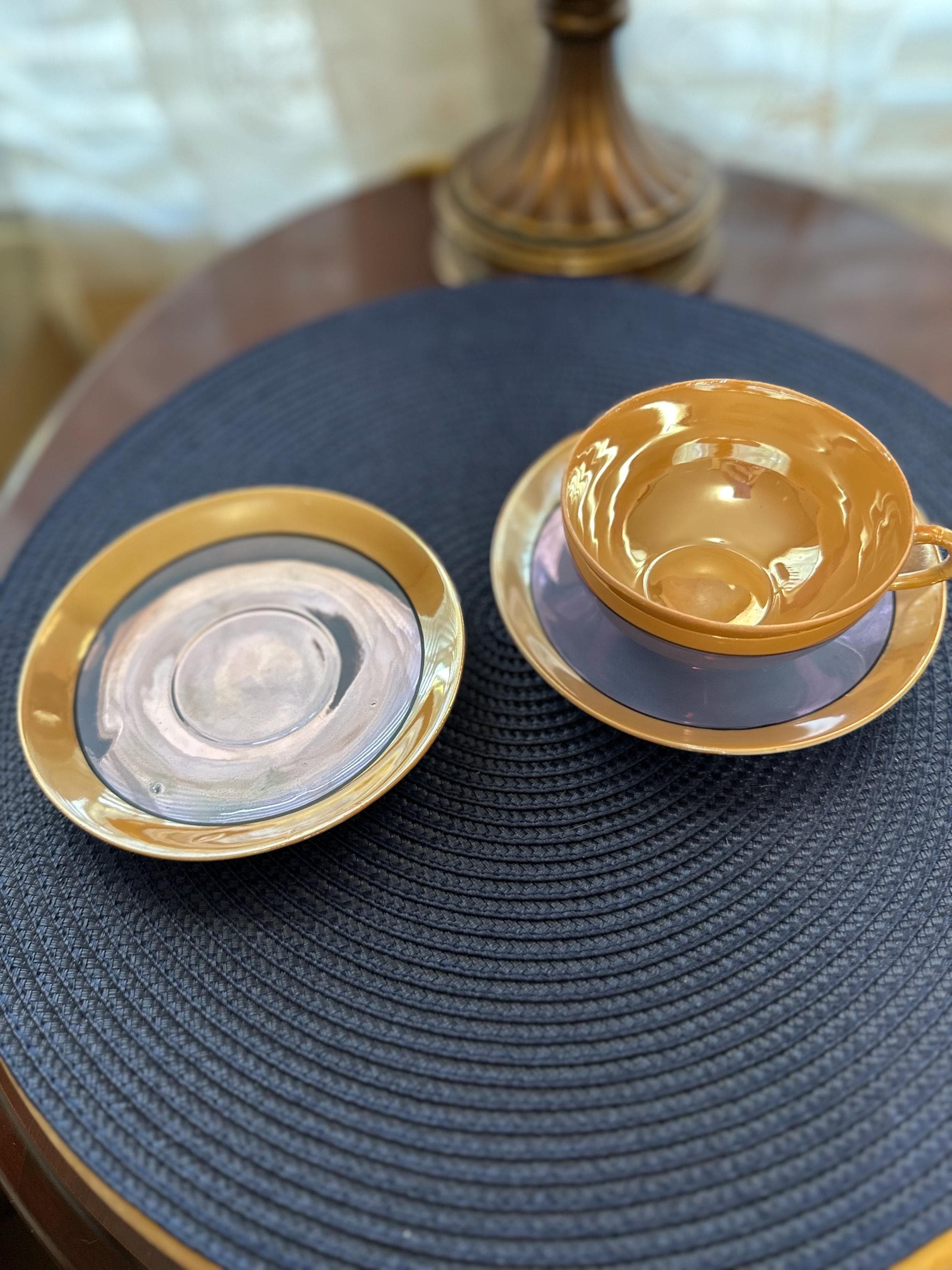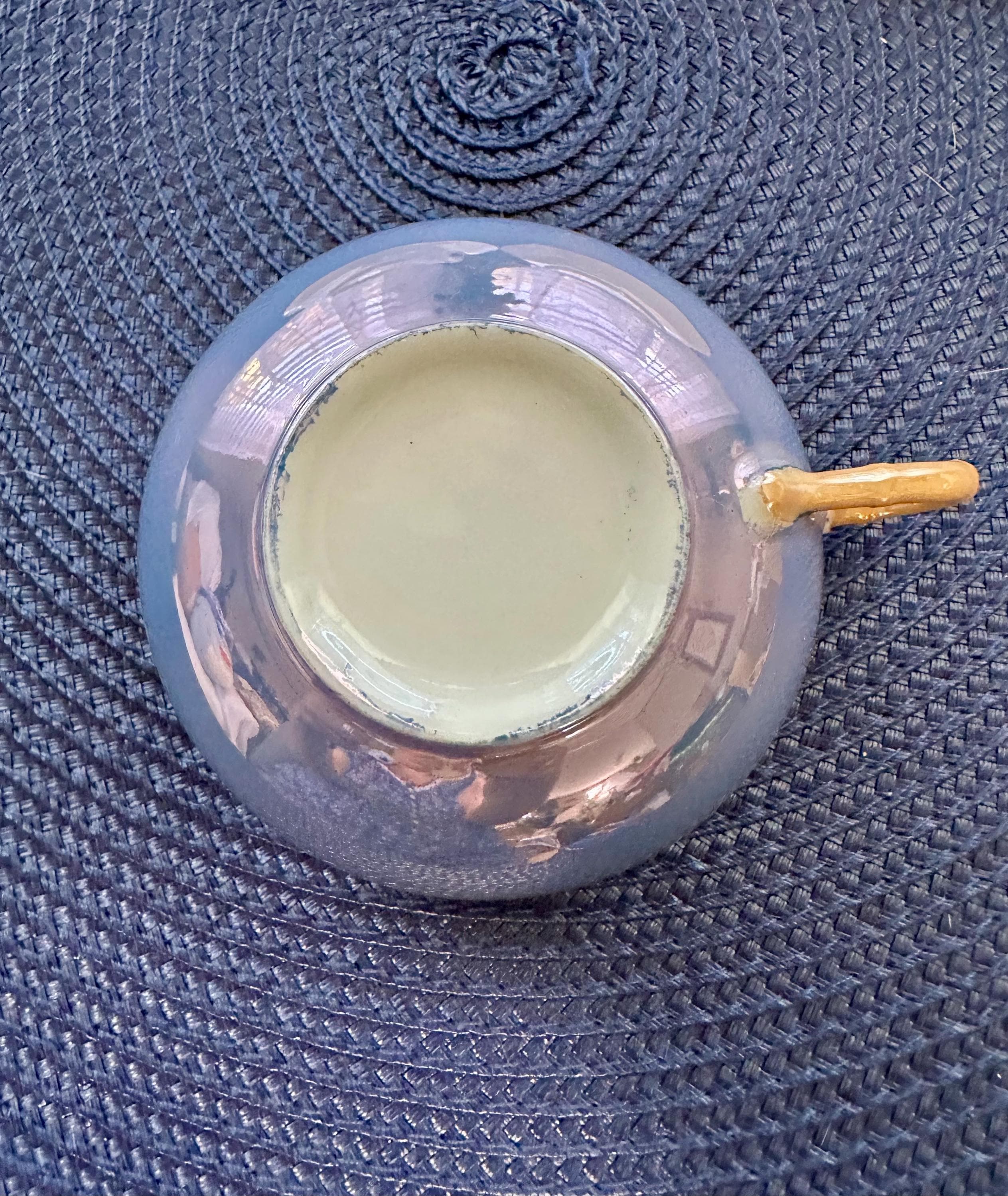 Beautiful lusterware blue and peach tea cup and saucer PLUS a bonus saucer. Before you ask "What am I going to do with an extra saucer?" The answer is easy. That is for your snacks to go with your hot cup of tea. This is a vintage item and for the age it is in great shape. There is a slight haze to one of the saucers and a white spot on the other saucer (pictures are included). This has been discounted for the blemishes. If you have any questions or would like additional pictures please contact us.