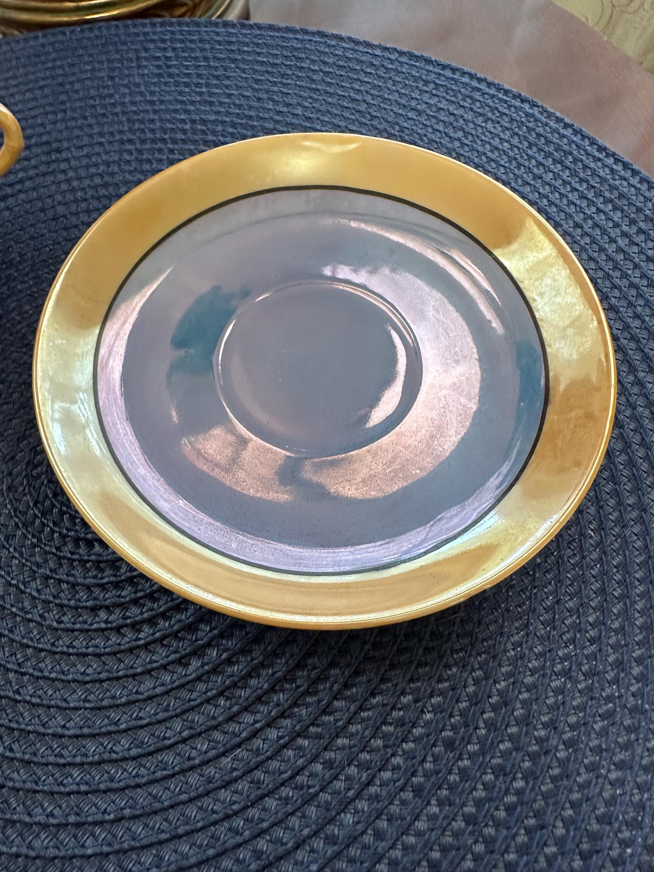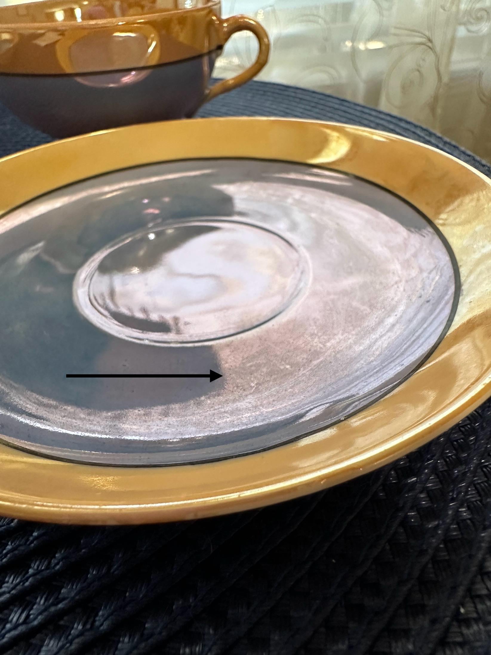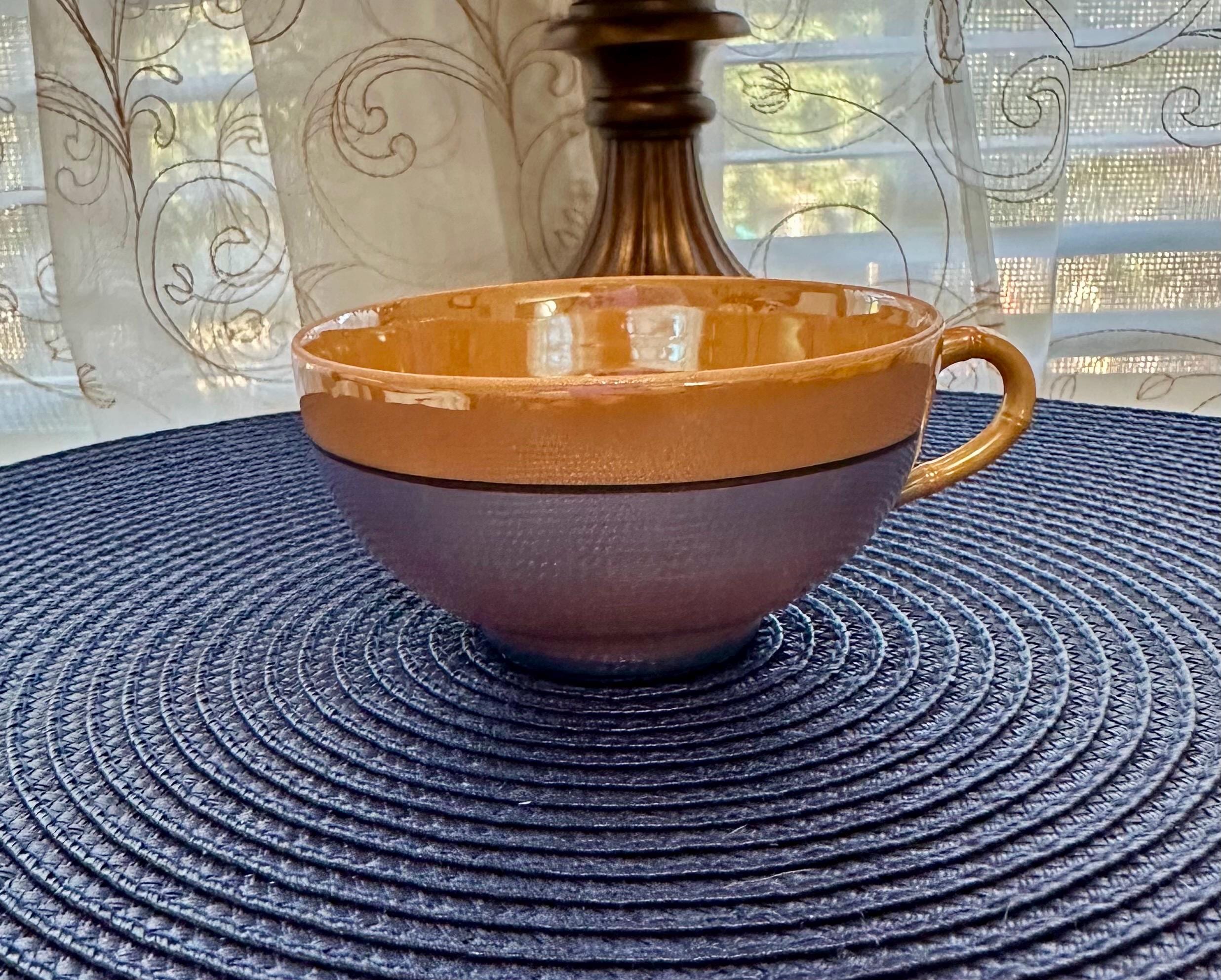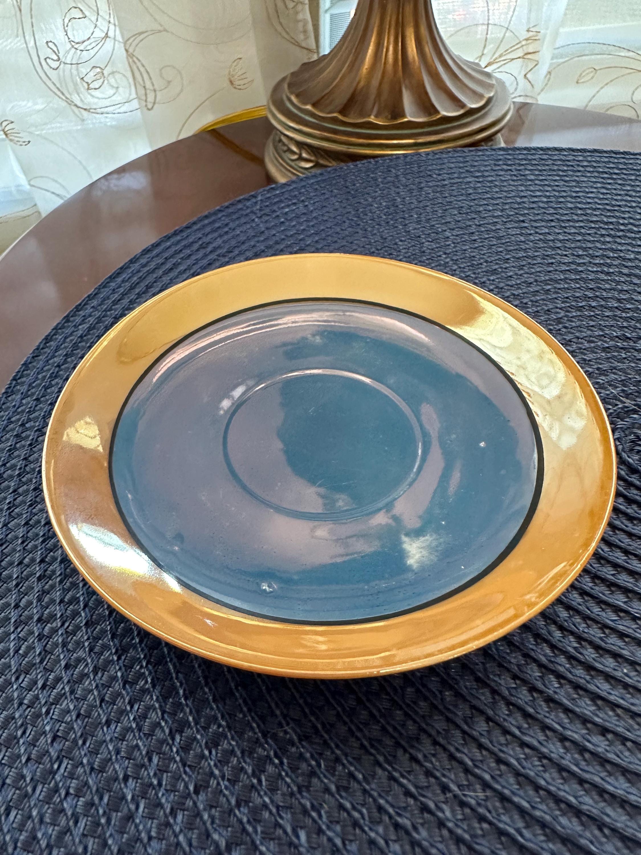 Beautiful lusterware blue and peach tea cup and saucer PLUS a bonus saucer. Before you ask "What am I going to do with an extra saucer?" The answer is easy. That is for your snacks to go with your hot cup of tea. This is a vintage item and for the age it is in great shape. There is a slight haze to one of the saucers and a white spot on the other saucer (pictures are included). This has been discounted for the blemishes. If you have any questions or would like additional pictures please contact us.