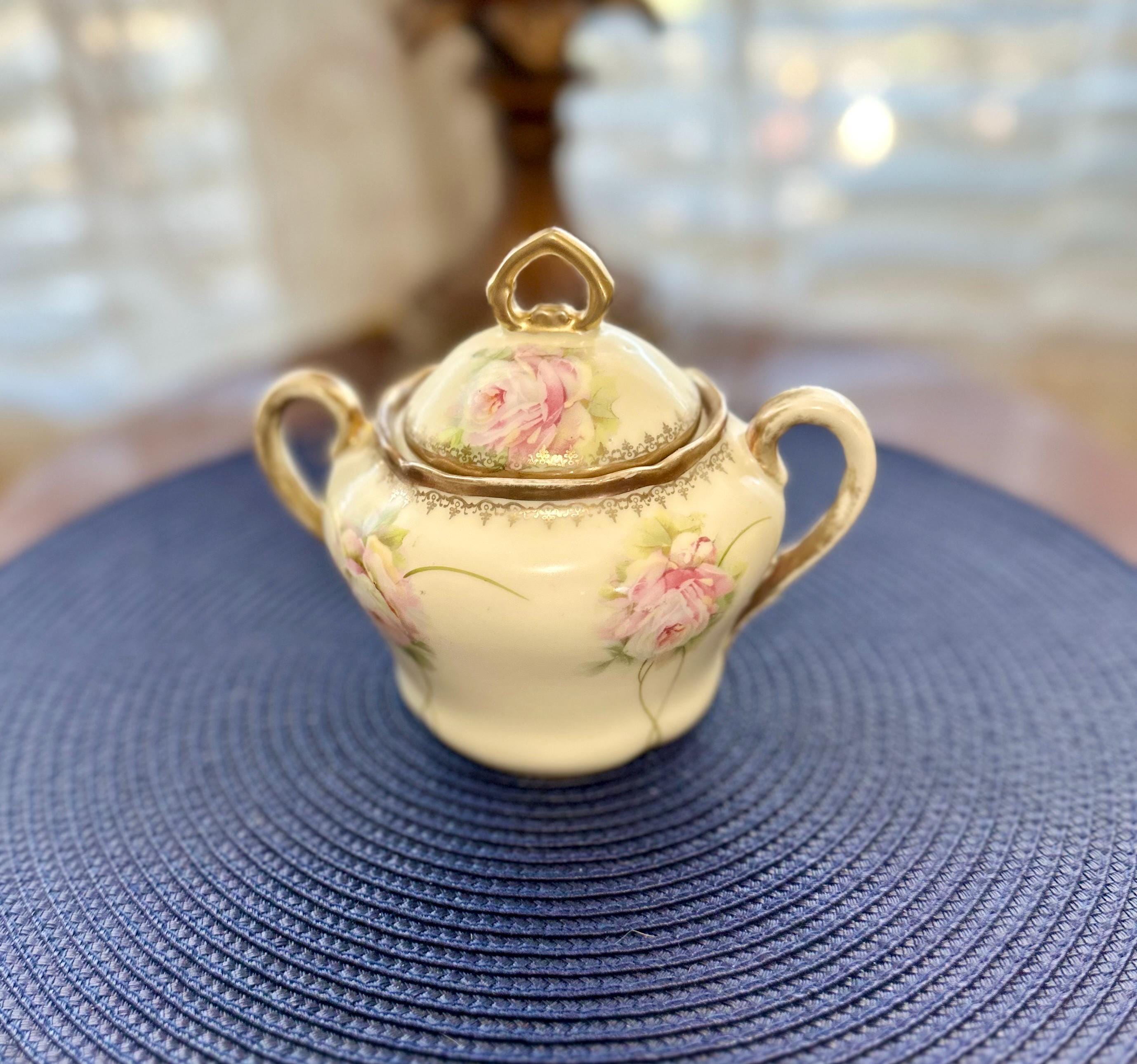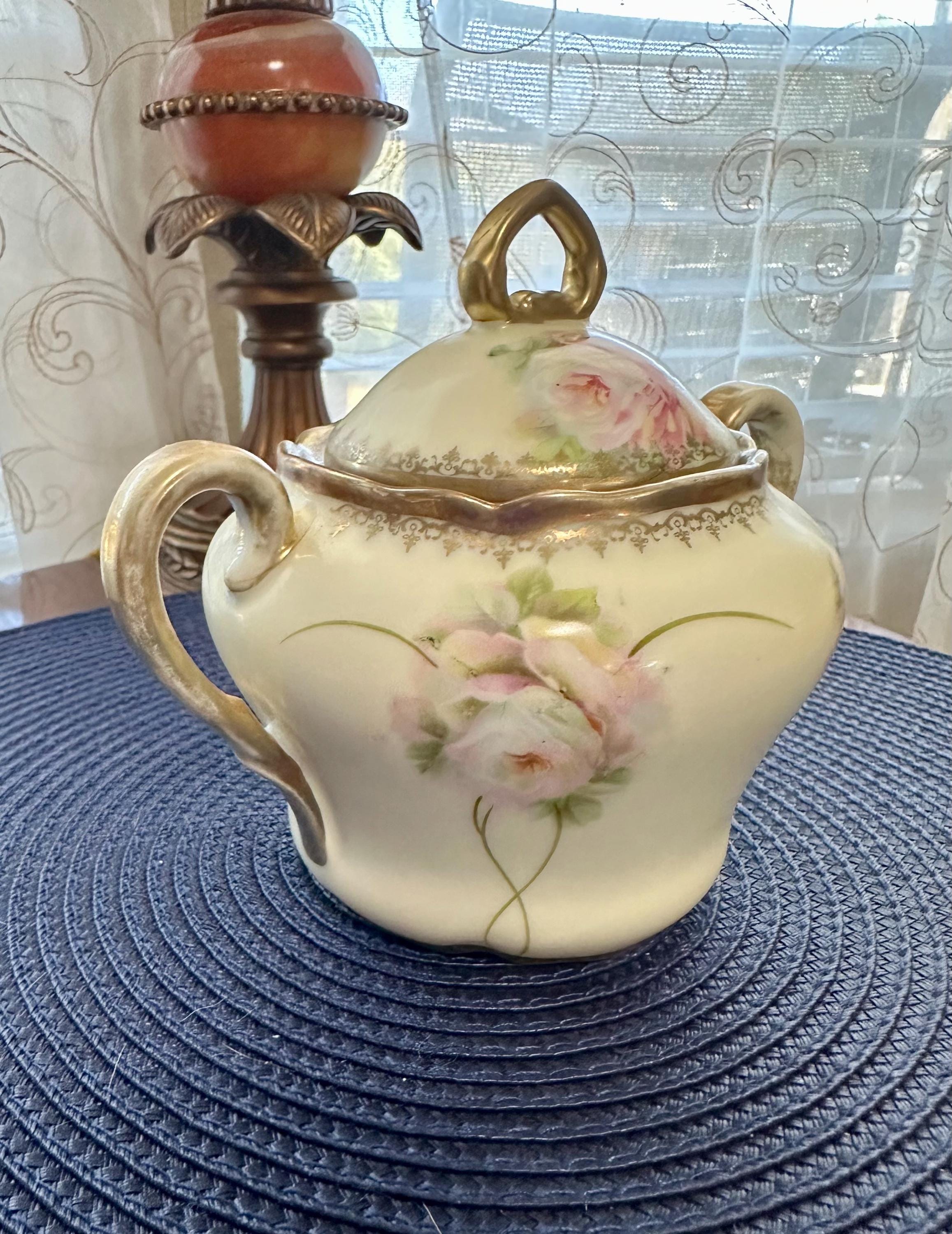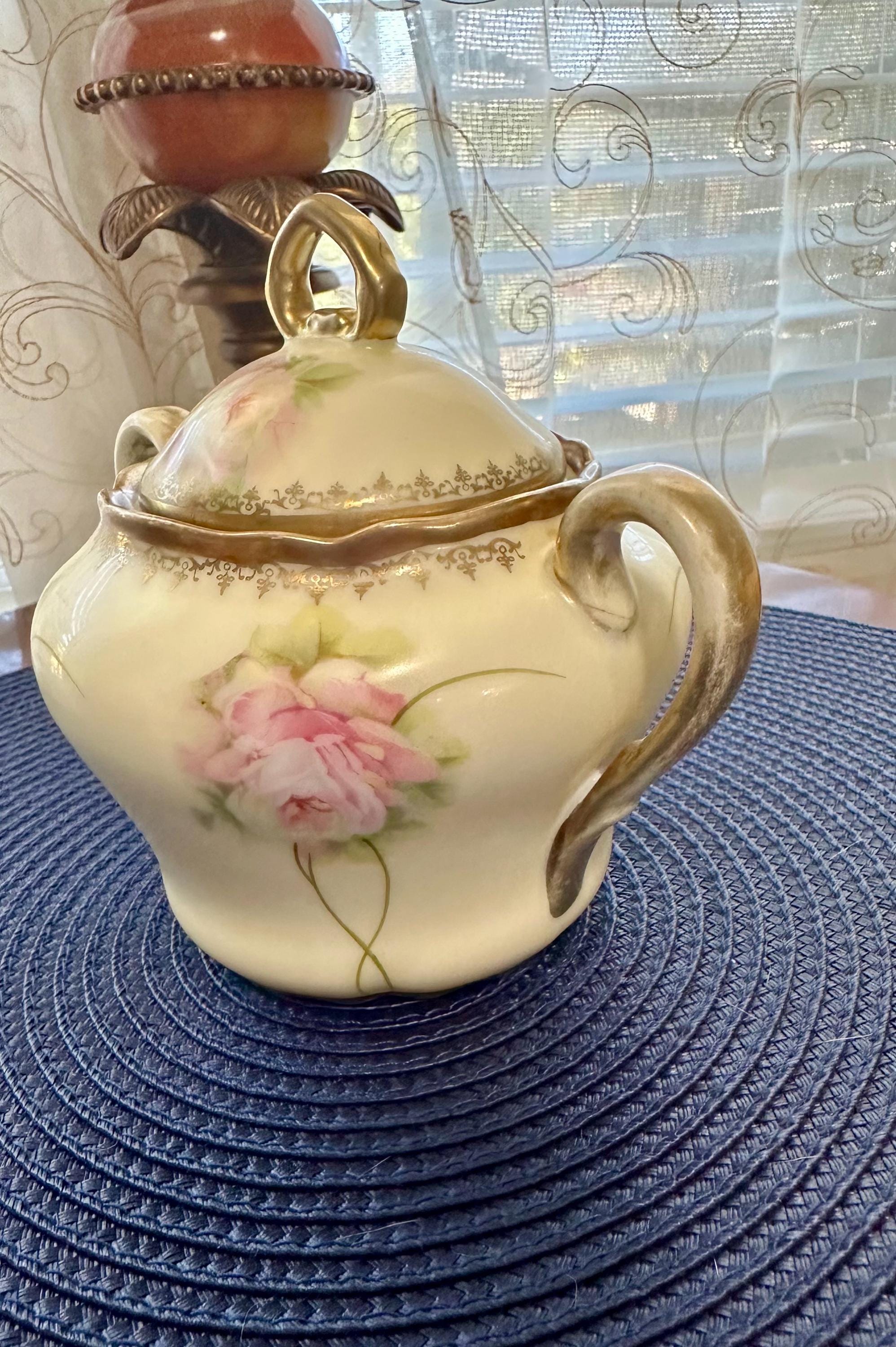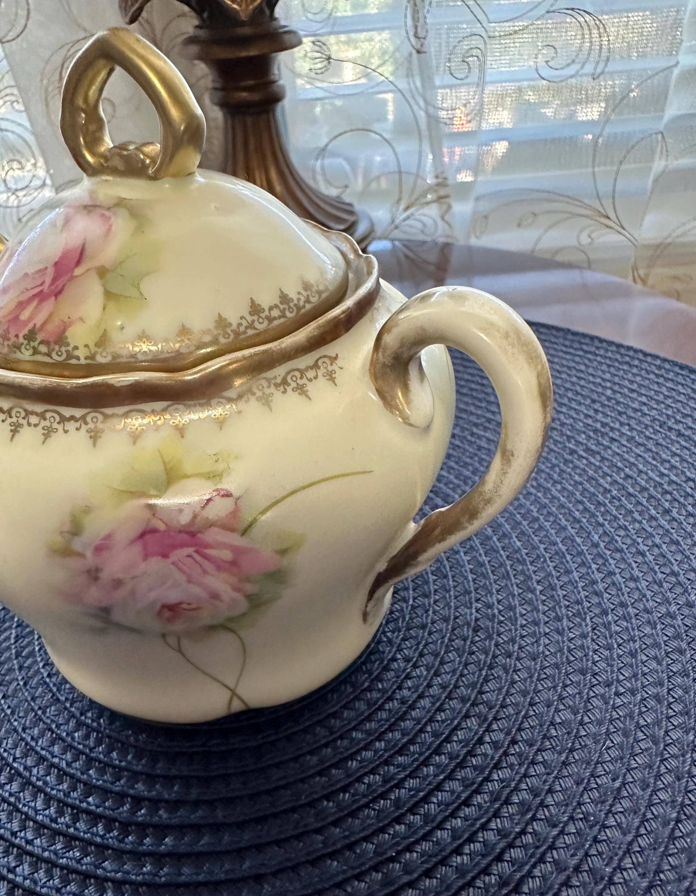 This vintage sugar bowl was made in Bavaria, Germany. This sugar bowl is hand-painted with roses and golden trim. This is an older piece and is missing some of the gold trim. The bottom is stamped with PM BAVARIA. From researching this piece, I found that having this stamp could date this item between 1895 to 1939. I can not guarantee the age of this item. If you have any questions, please feel free to reach out and I am more than happy to send more pictures or answer any questions you may have. The color may be different due to lighting or camera. Though we try to reduce and reuse, the cost of additional shipping materials are included in the price.