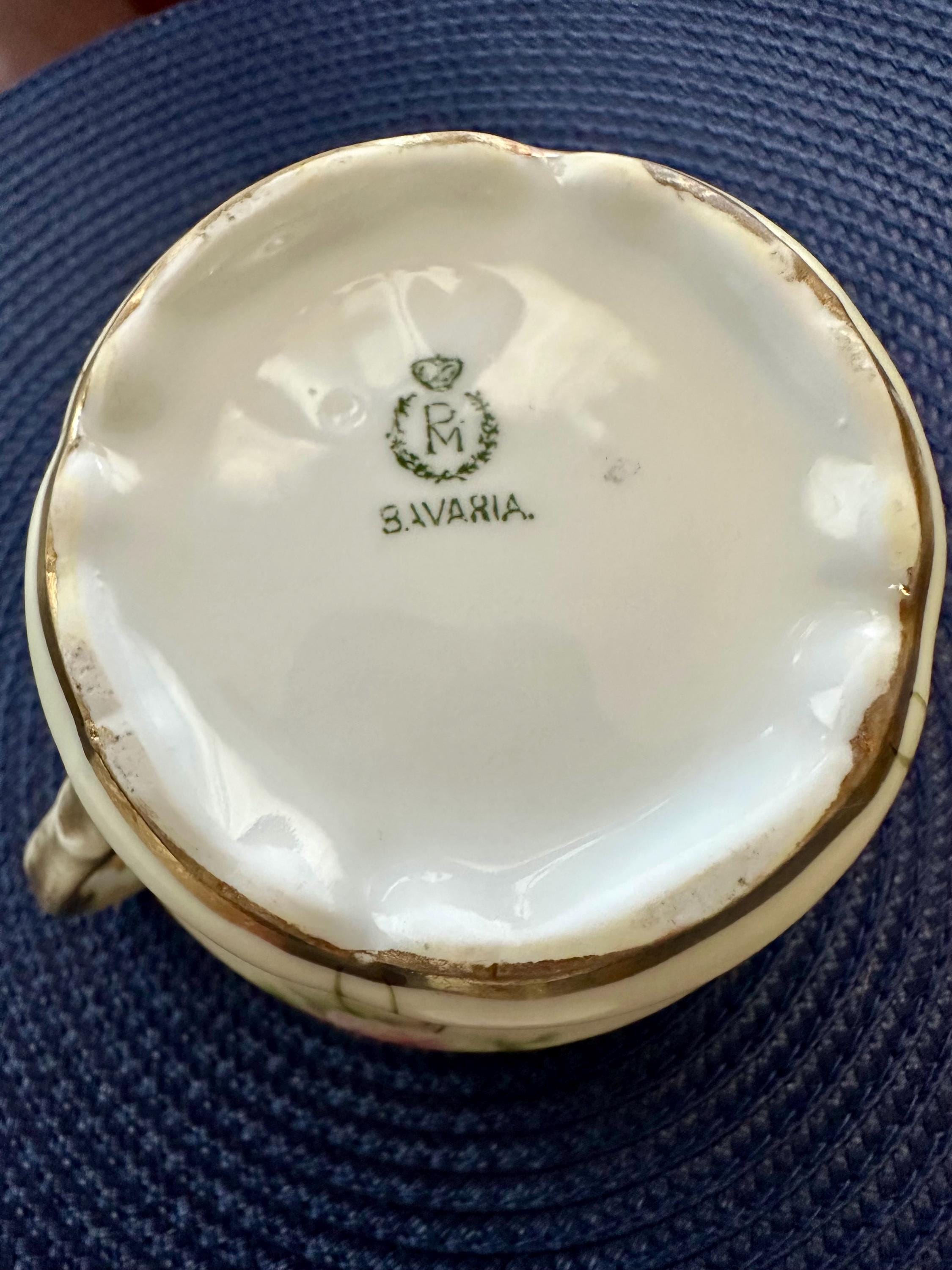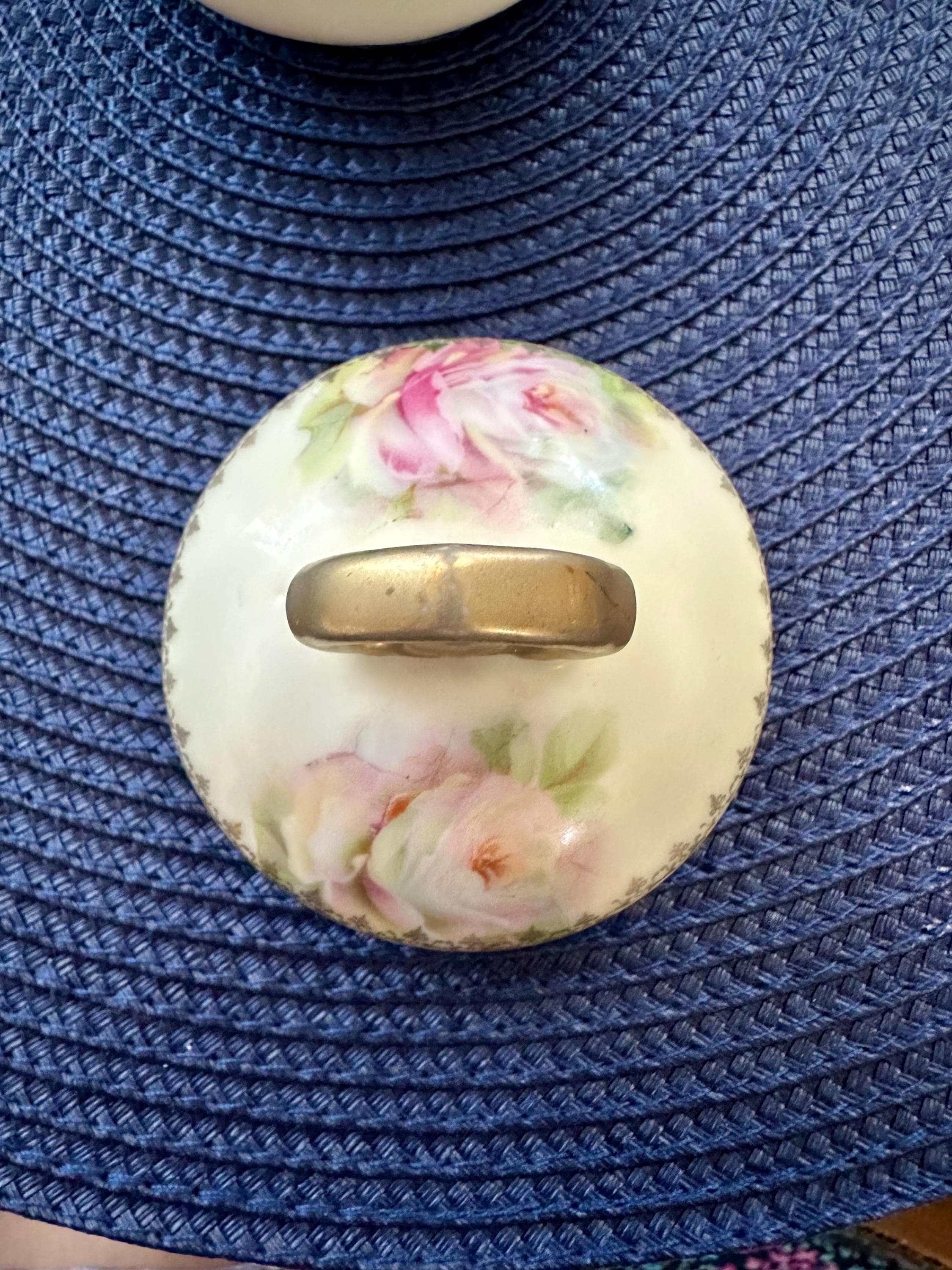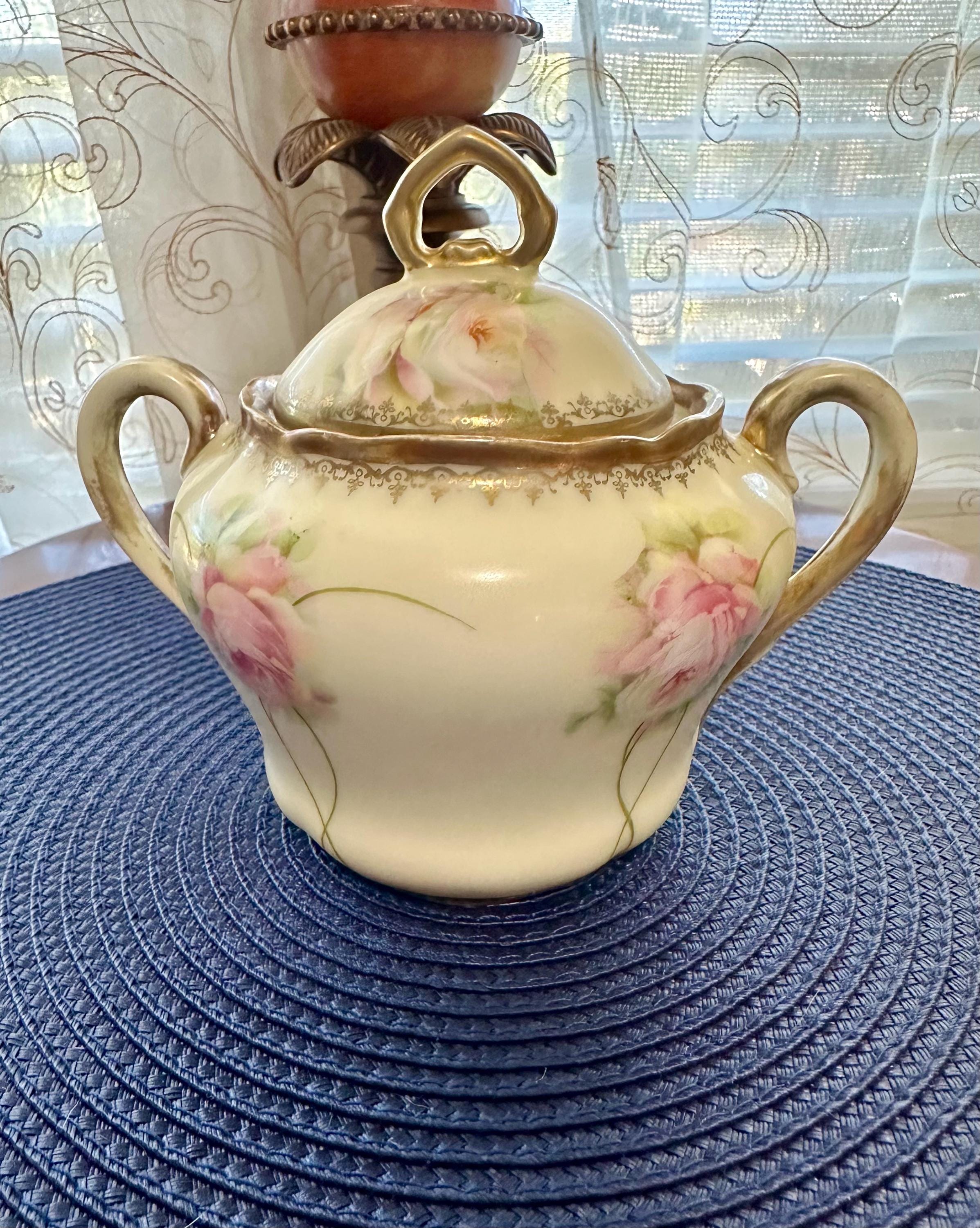 This vintage sugar bowl was made in Bavaria, Germany. This sugar bowl is hand-painted with roses and golden trim. This is an older piece and is missing some of the gold trim. The bottom is stamped with PM BAVARIA. From researching this piece, I found that having this stamp could date this item between 1895 to 1939. I can not guarantee the age of this item. If you have any questions, please feel free to reach out and I am more than happy to send more pictures or answer any questions you may have. The color may be different due to lighting or camera. Though we try to reduce and reuse, the cost of additional shipping materials are included in the price.