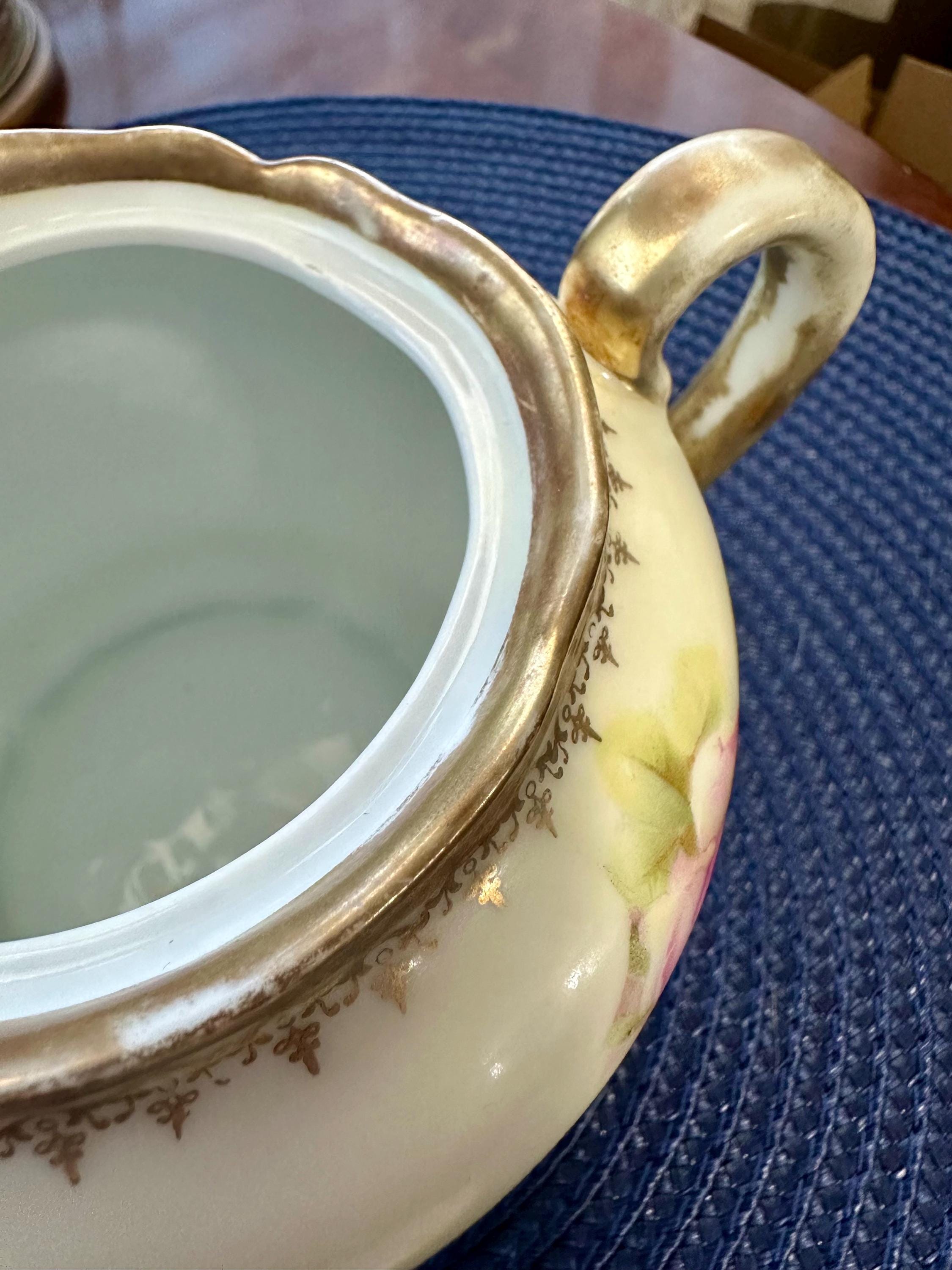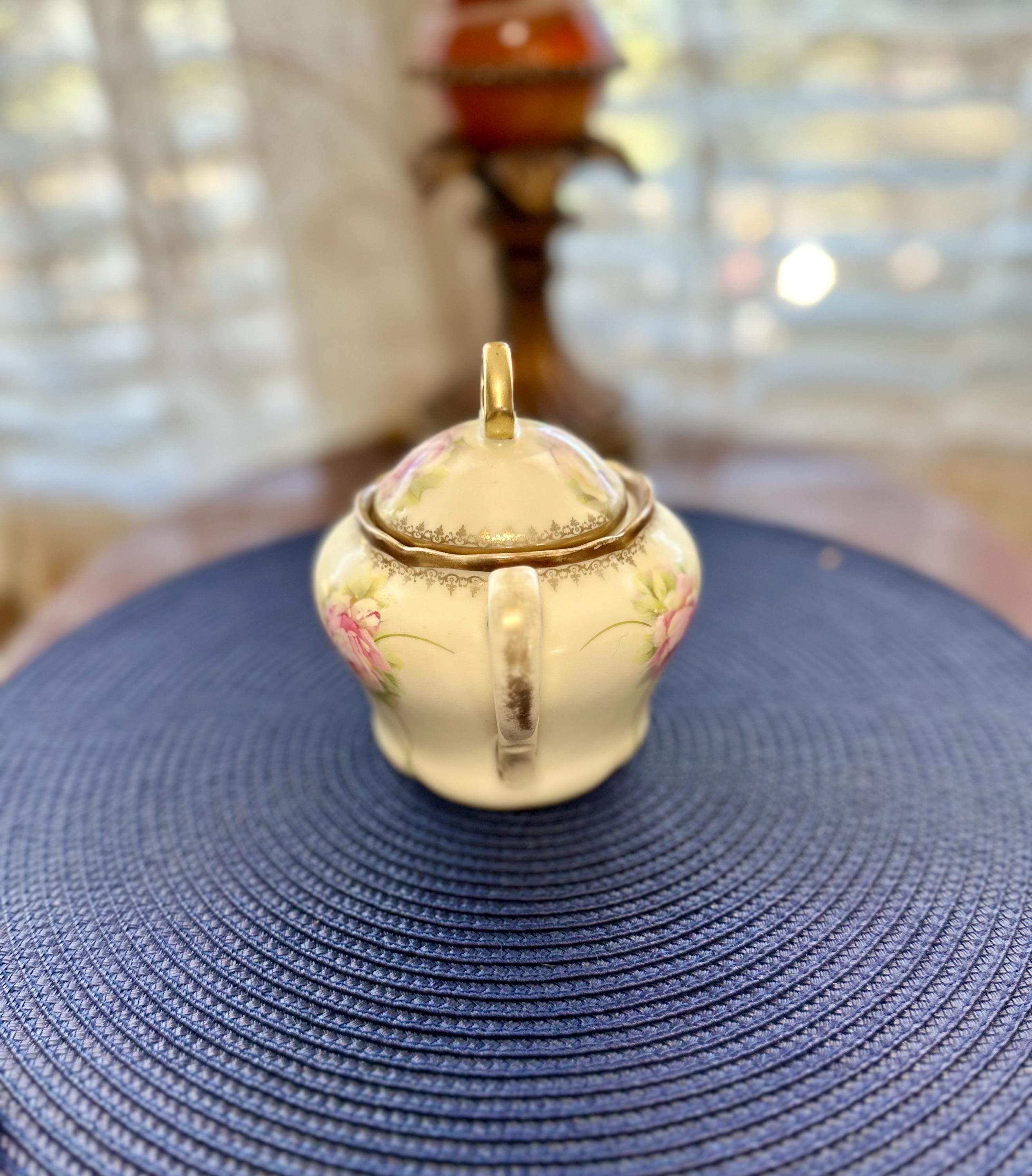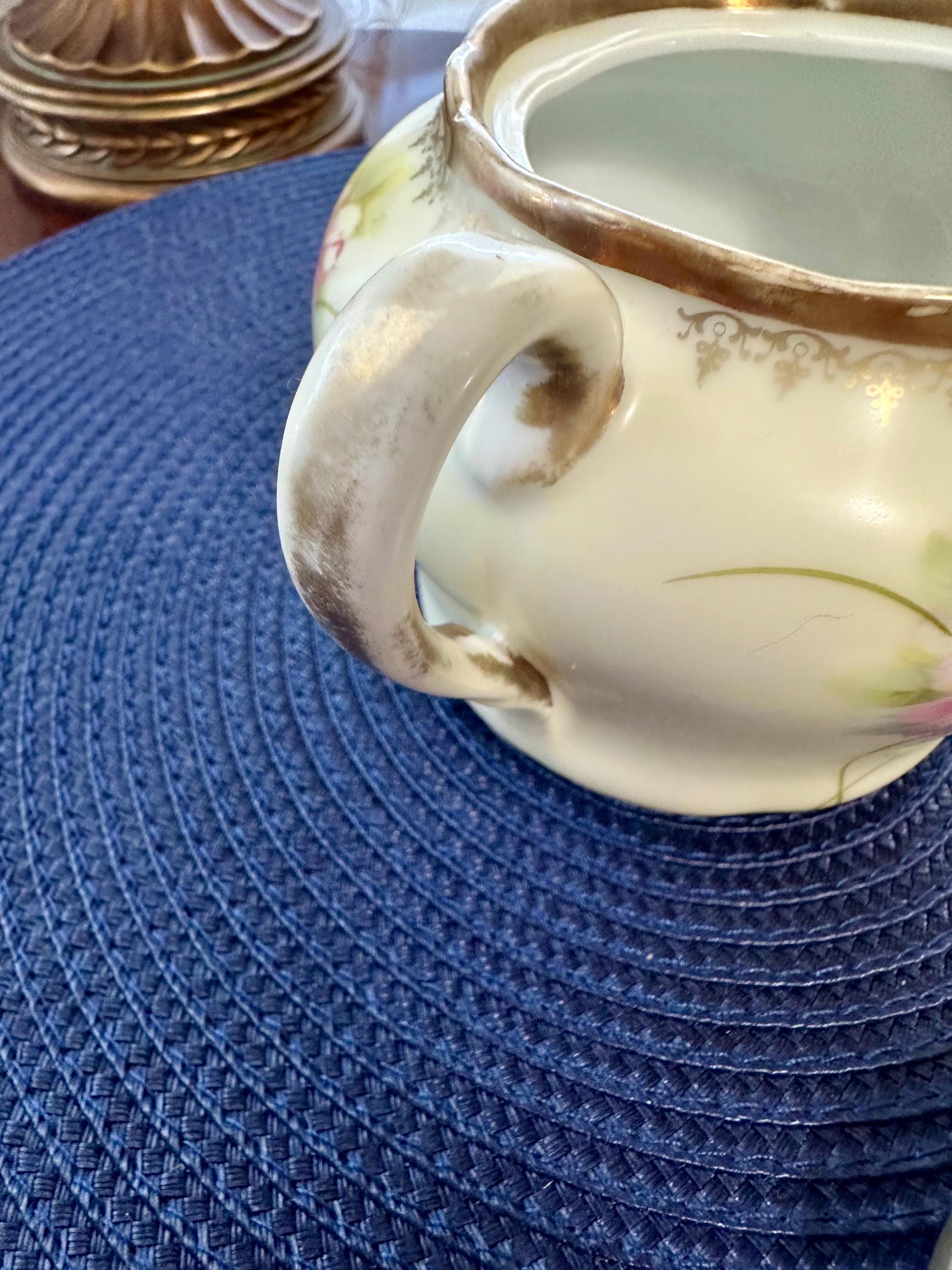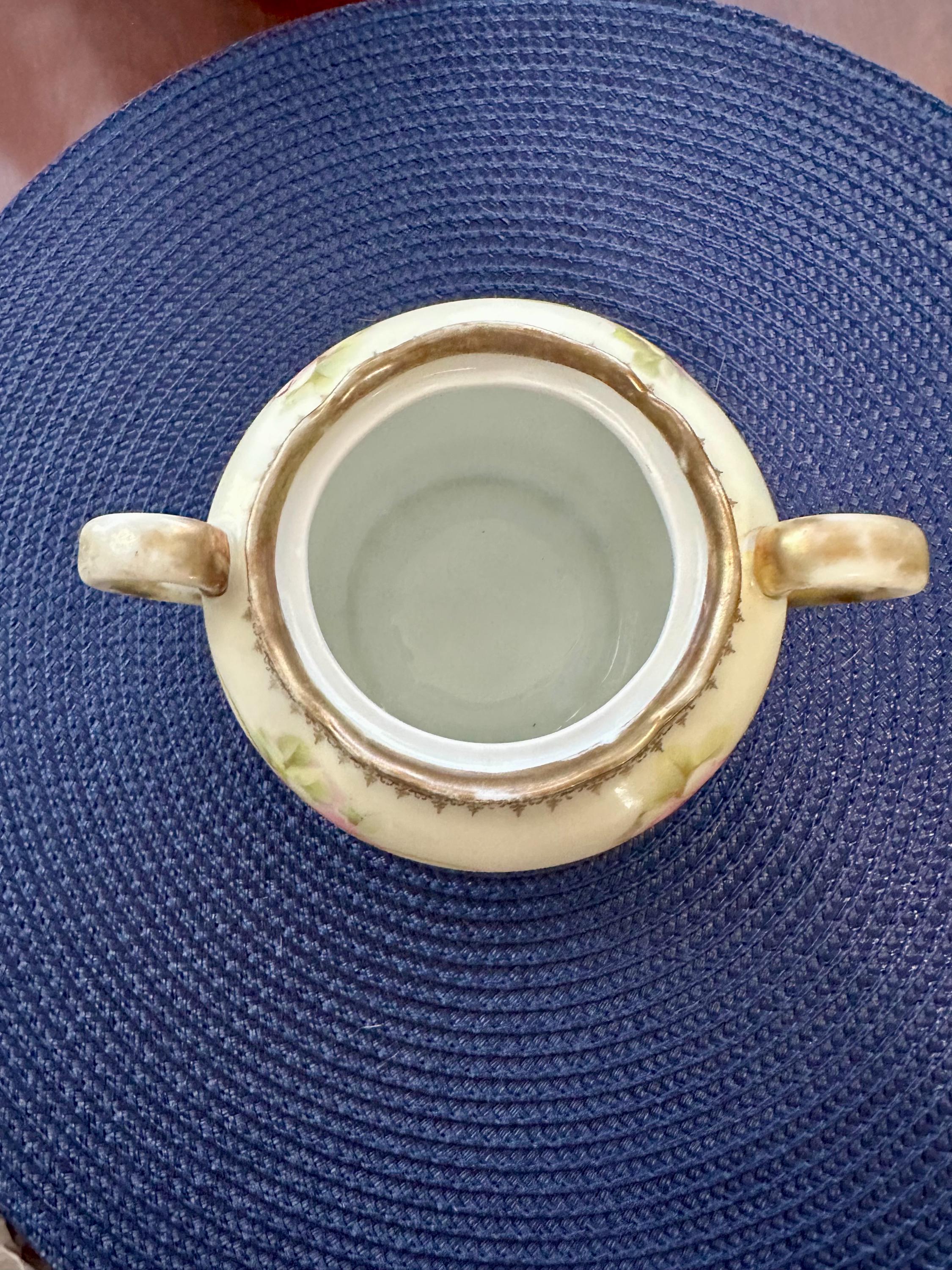 This vintage sugar bowl was made in Bavaria, Germany. This sugar bowl is hand-painted with roses and golden trim. This is an older piece and is missing some of the gold trim. The bottom is stamped with PM BAVARIA. From researching this piece, I found that having this stamp could date this item between 1895 to 1939. I can not guarantee the age of this item. If you have any questions, please feel free to reach out and I am more than happy to send more pictures or answer any questions you may have. The color may be different due to lighting or camera. Though we try to reduce and reuse, the cost of additional shipping materials are included in the price.