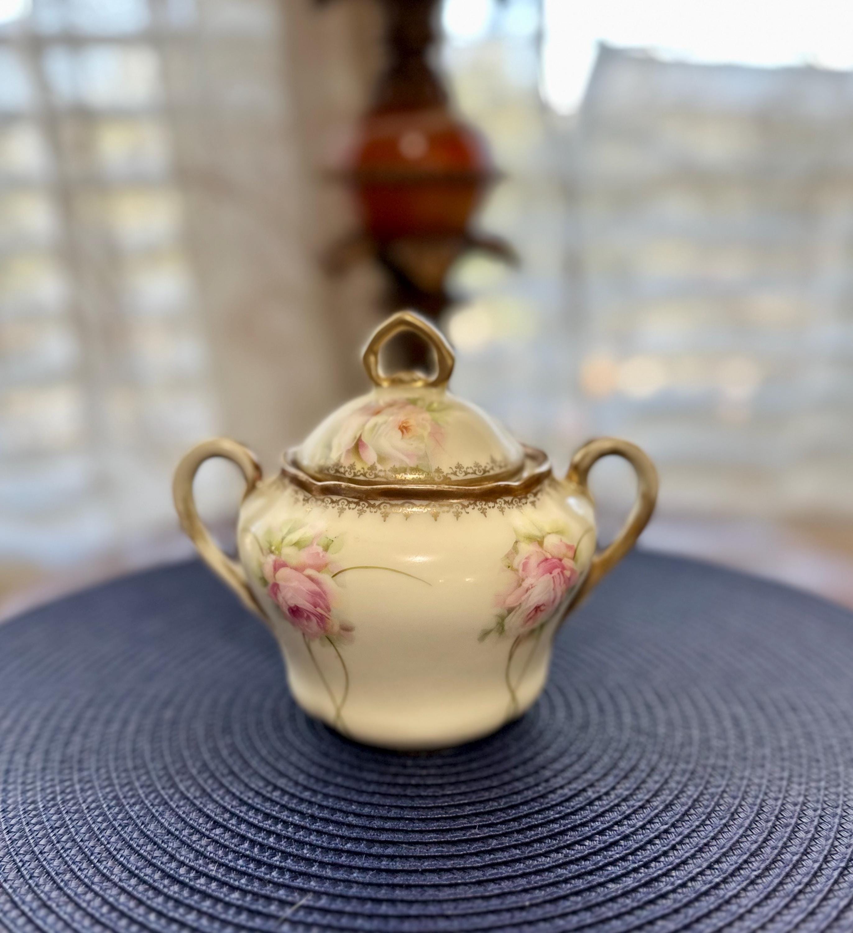 This vintage sugar bowl was made in Bavaria, Germany. This sugar bowl is hand-painted with roses and golden trim. This is an older piece and is missing some of the gold trim. The bottom is stamped with PM BAVARIA. From researching this piece, I found that having this stamp could date this item between 1895 and 1939. I can not guarantee the age of this item. If you have any questions, please feel free to reach out and I am more than happy to send more pictures or answer any questions you may have.