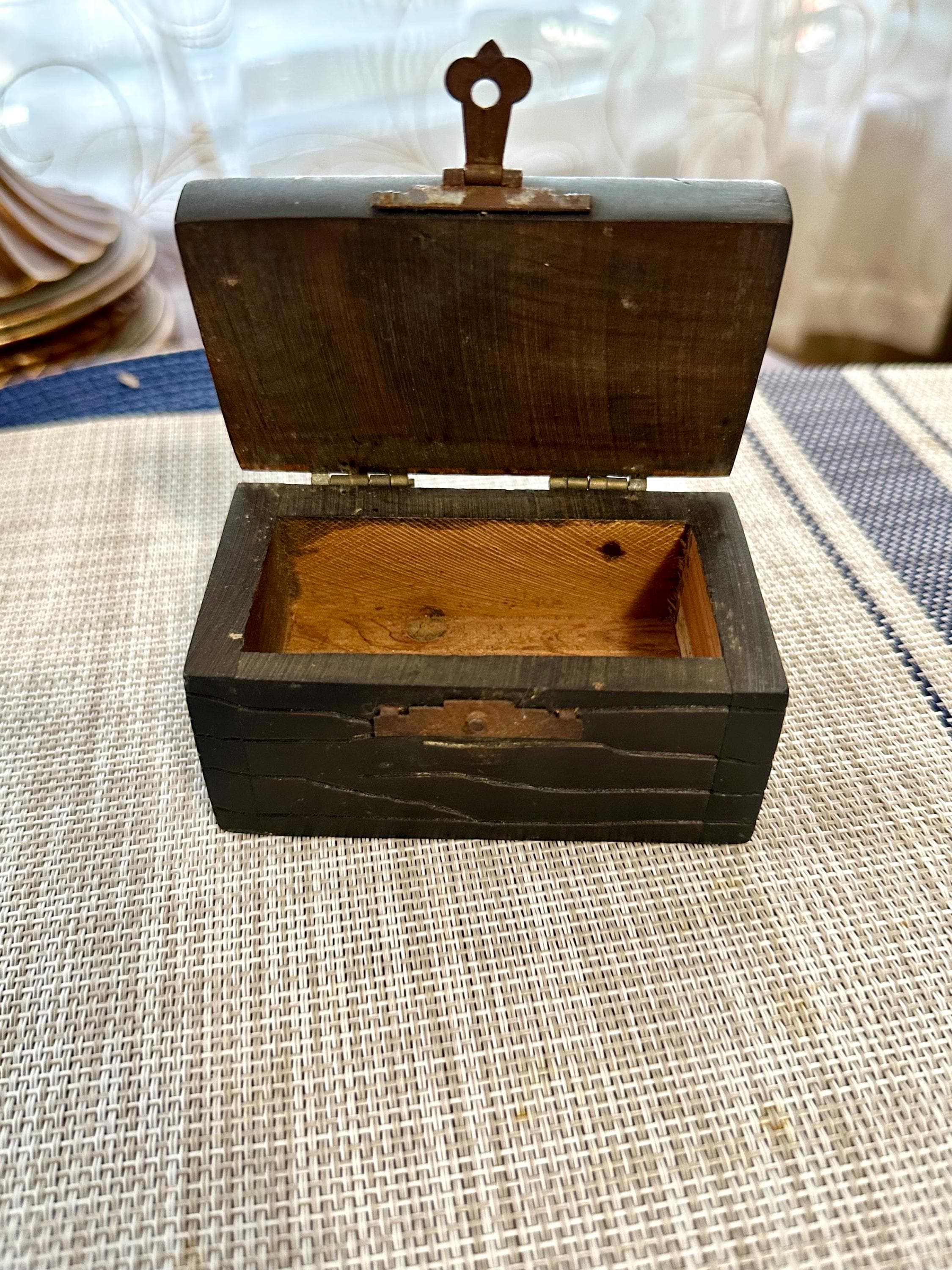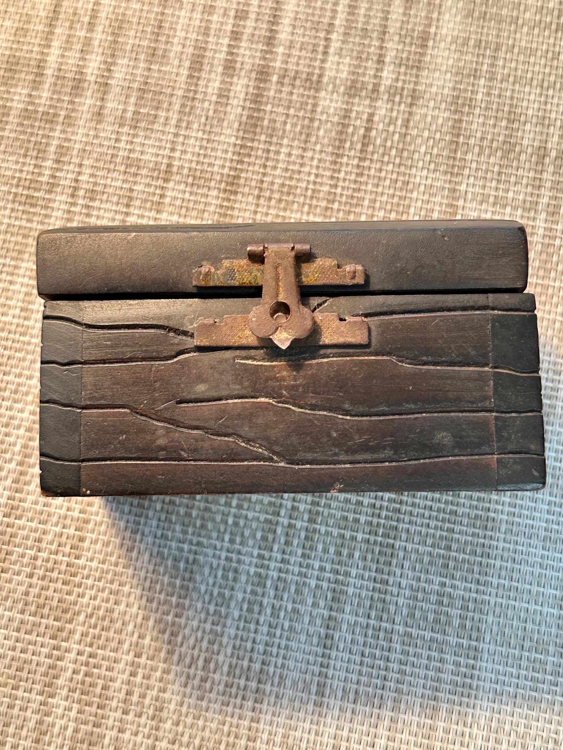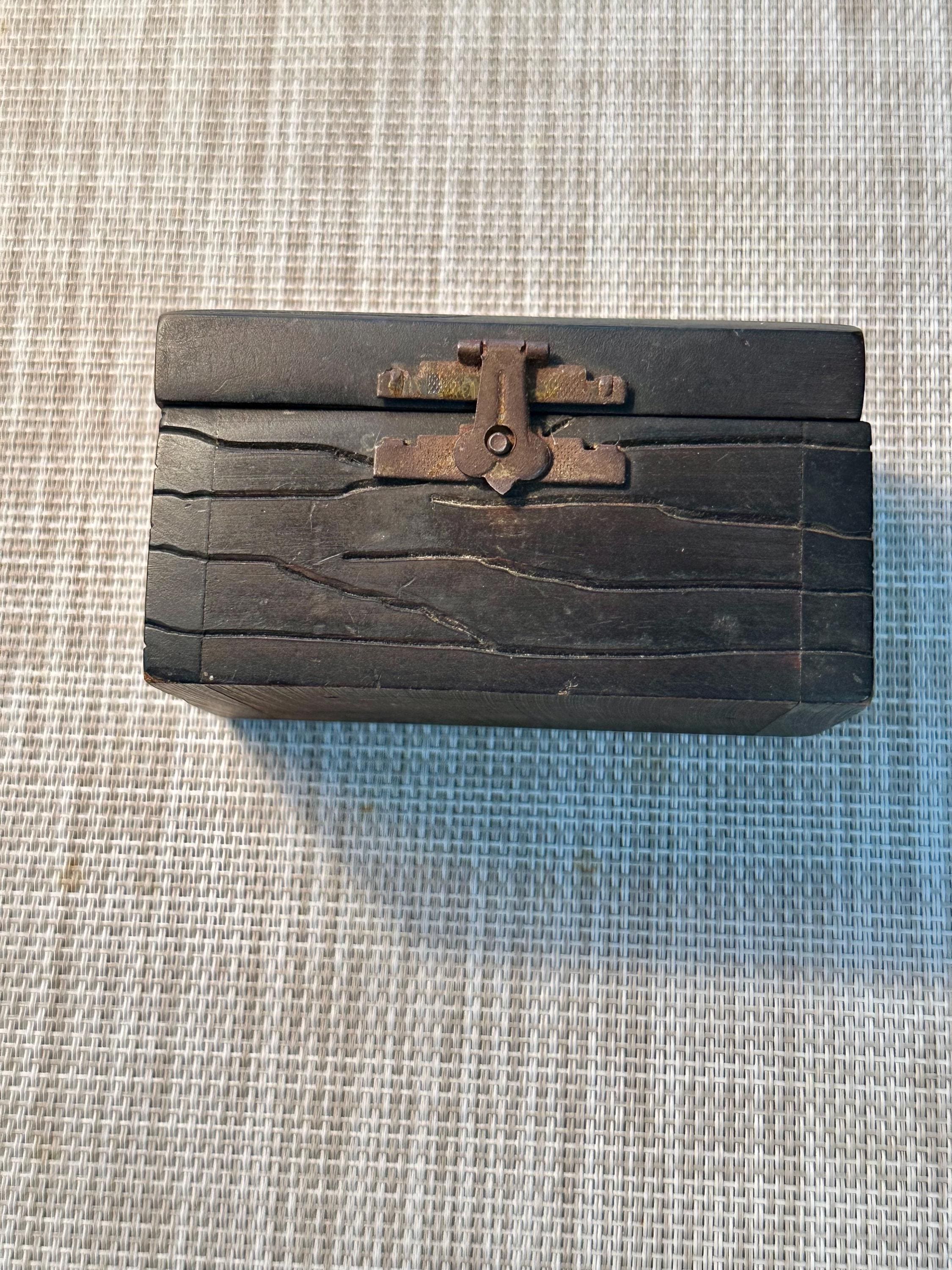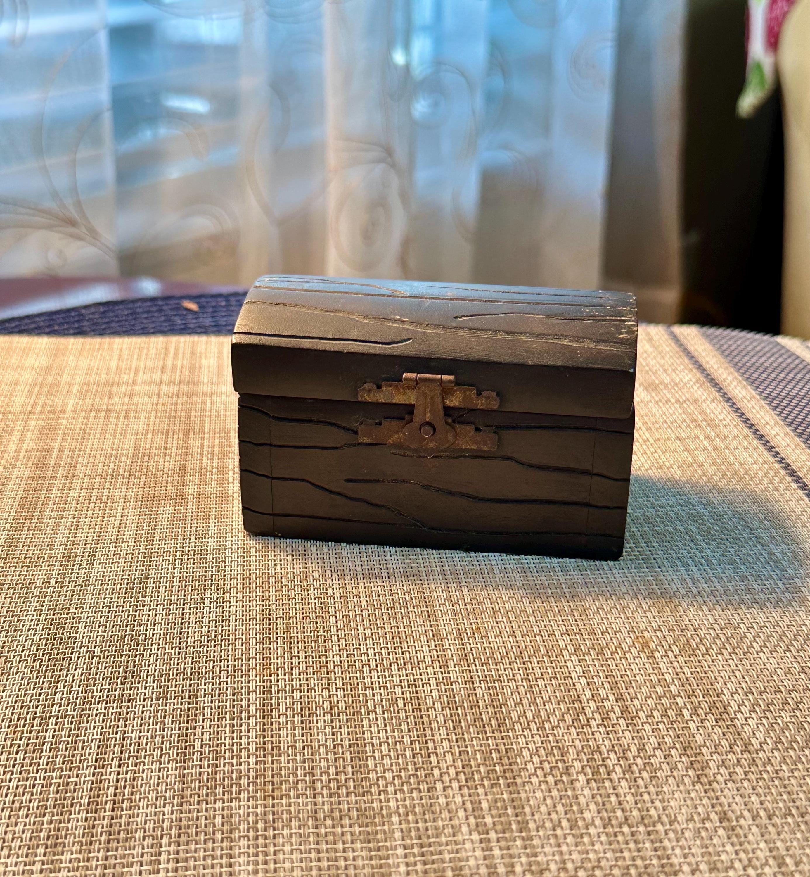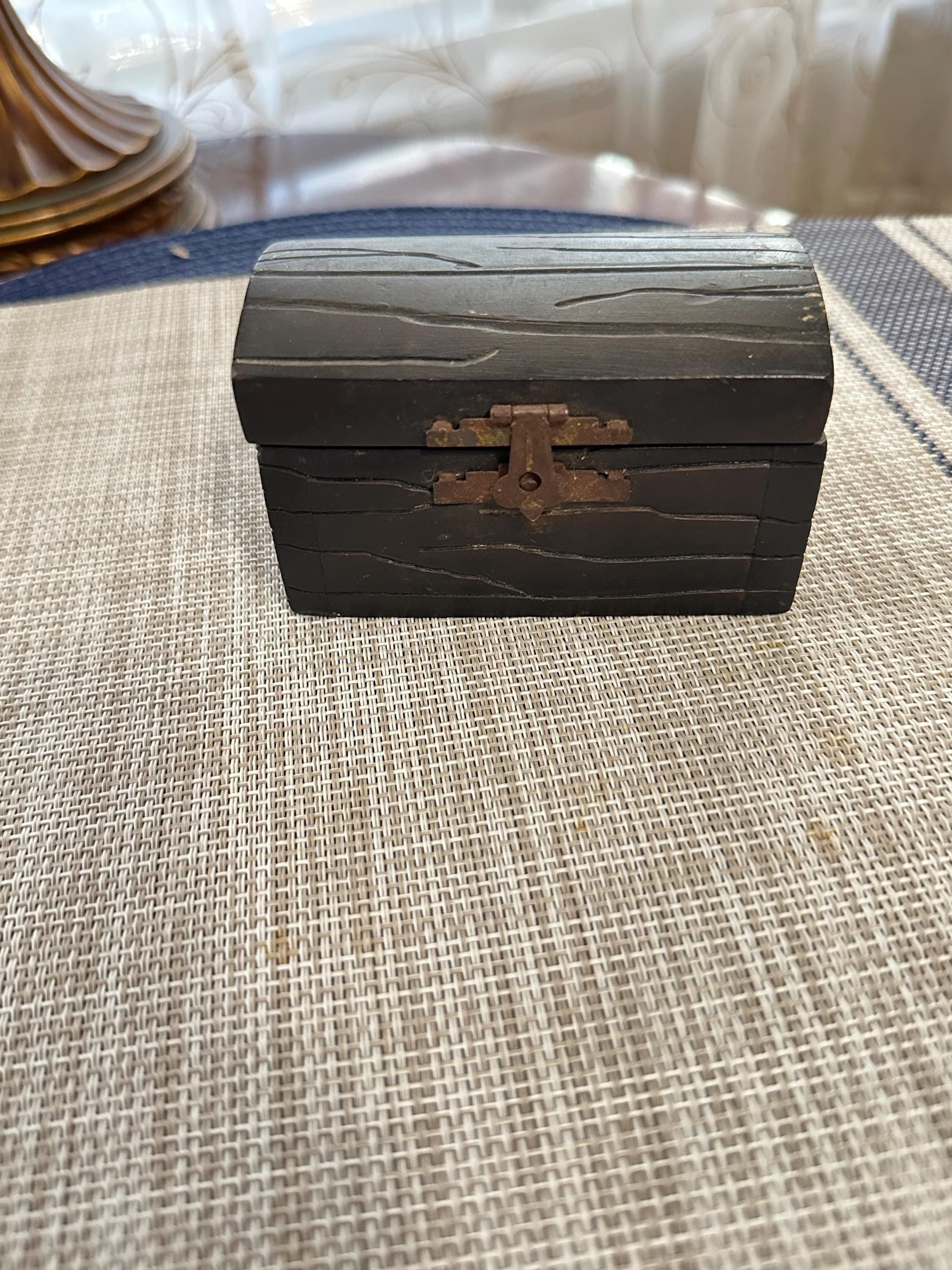 This is a miniature hope chest made of wood. This is a brown box that is 2 inches tall, 3 1/2 inches long, 2 1/2 inches wide. The latch does close, and if you wanted to add a tiny padlock, it would be an option. This item is sold as is and there will not be any refunds or returns.