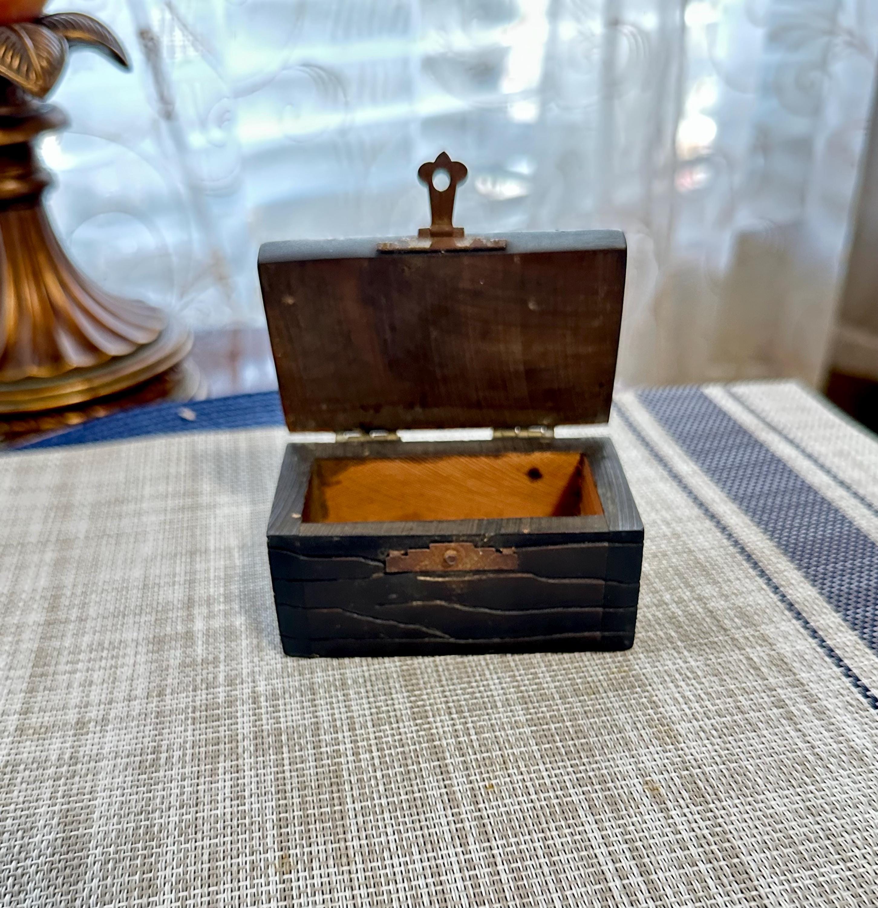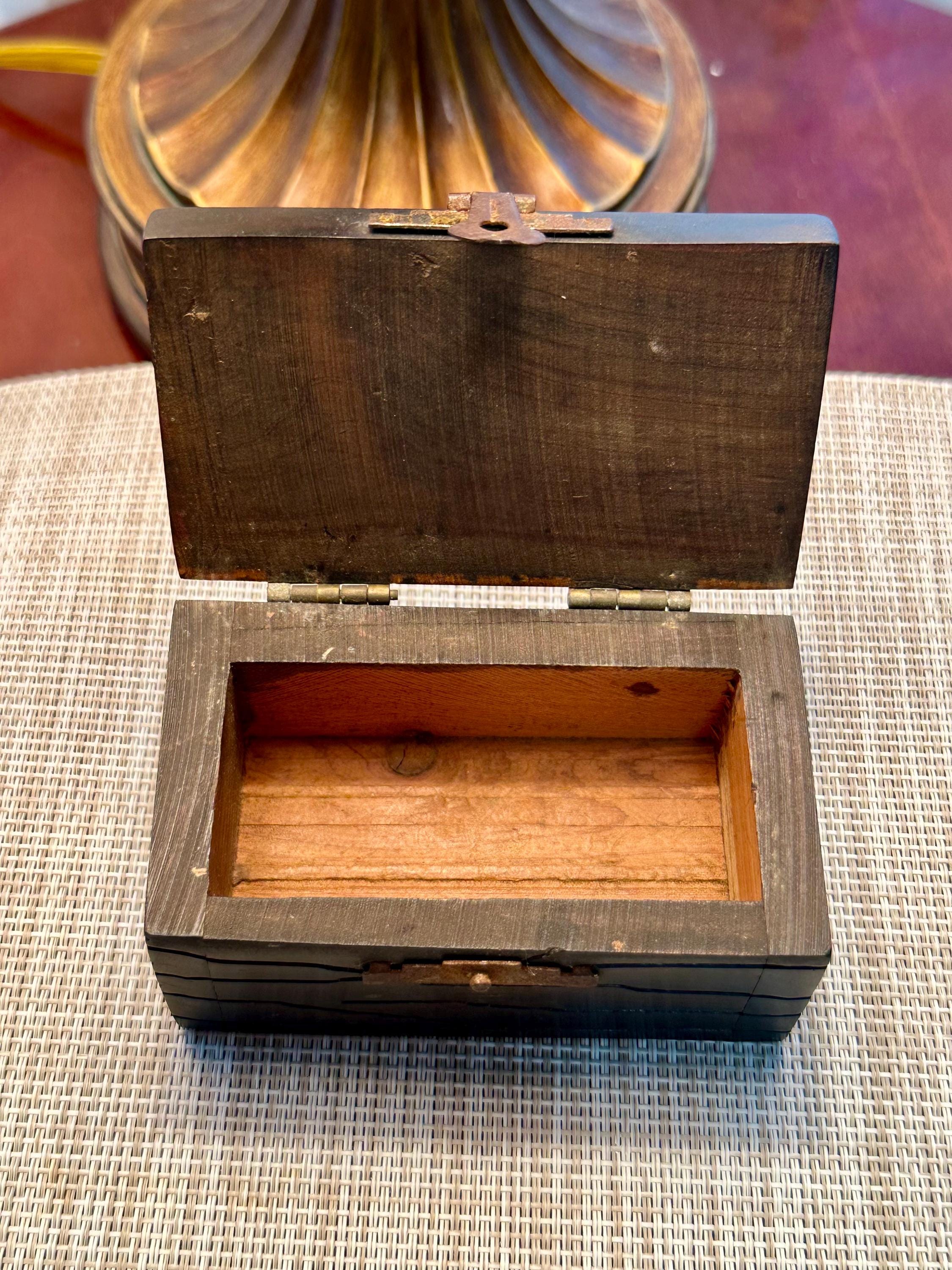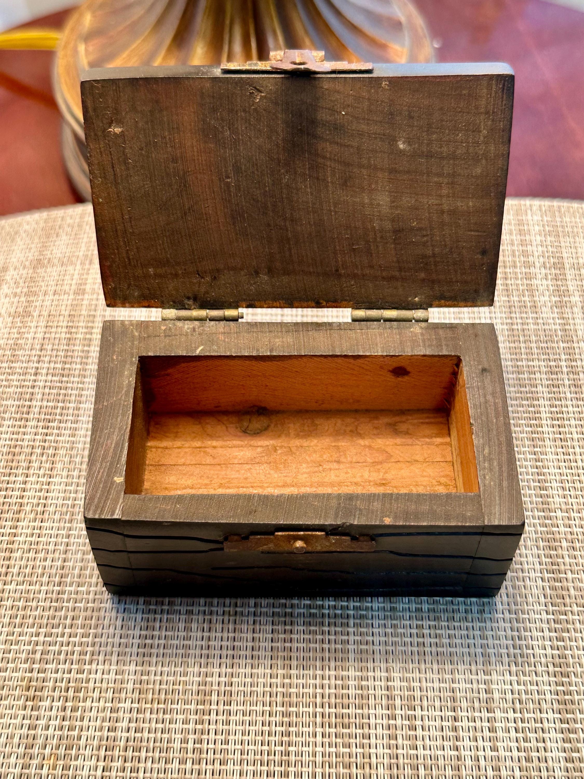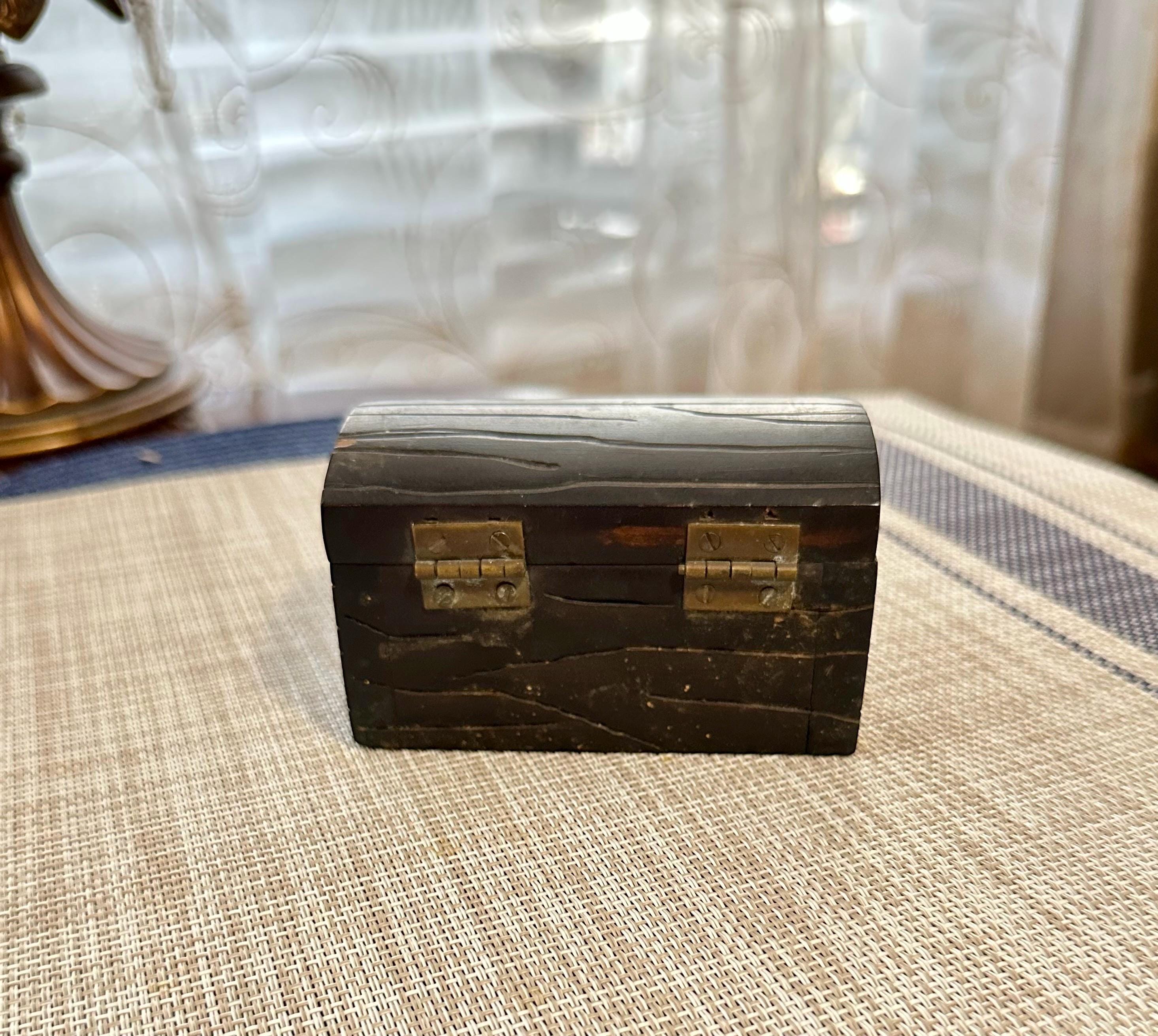 This is a miniature hope chest made of wood. This is a brown box that is 2 inches tall, 3 1/2 inches long, 2 1/2 inches wide. The latch does close, and if you wanted to add a tiny padlock, it would be an option. This item is sold as is and there will not be any refunds or returns.