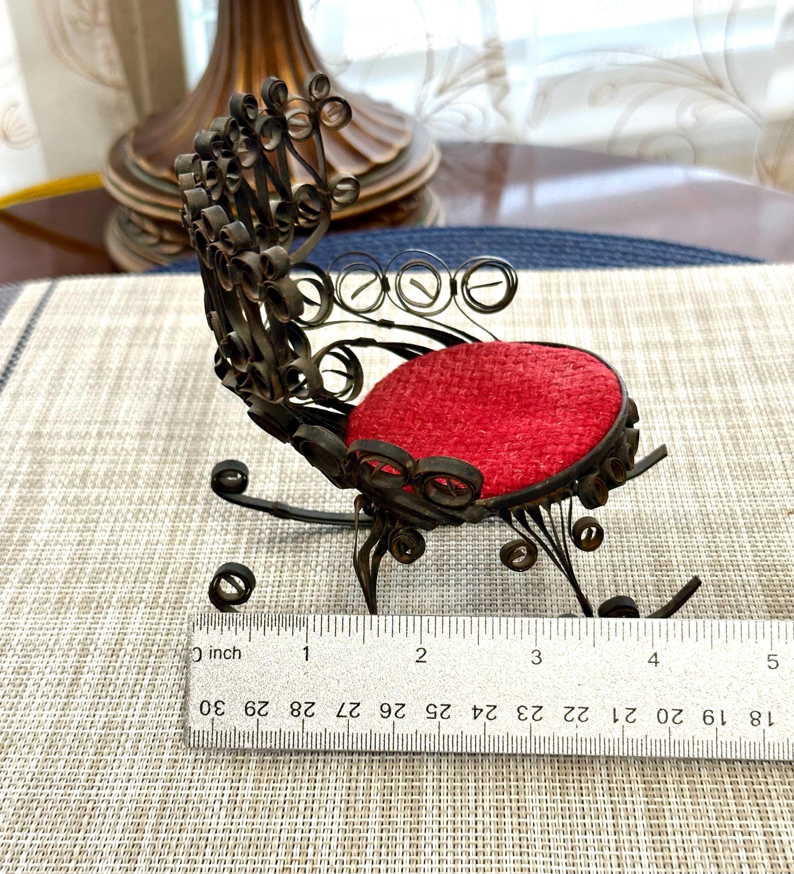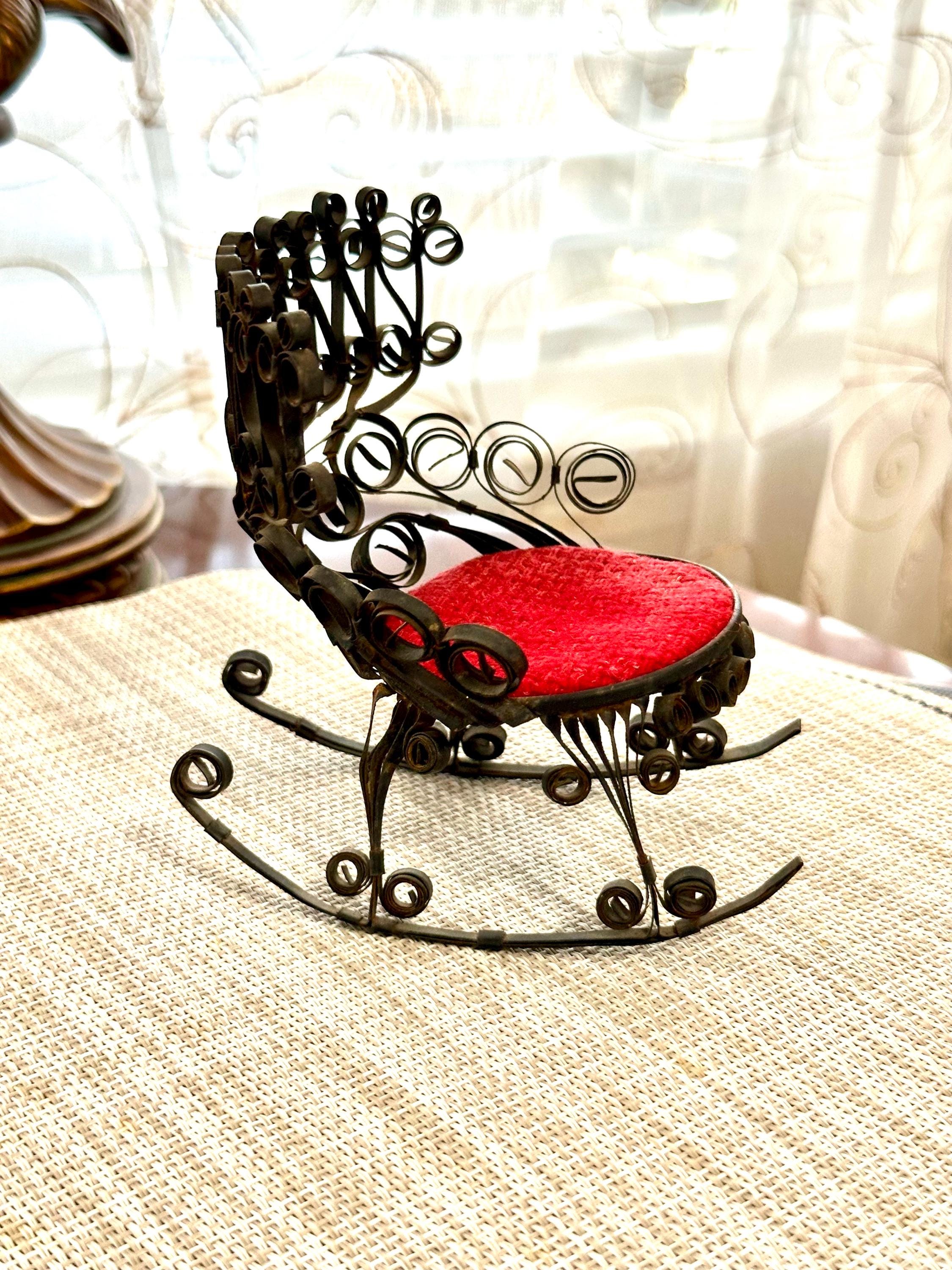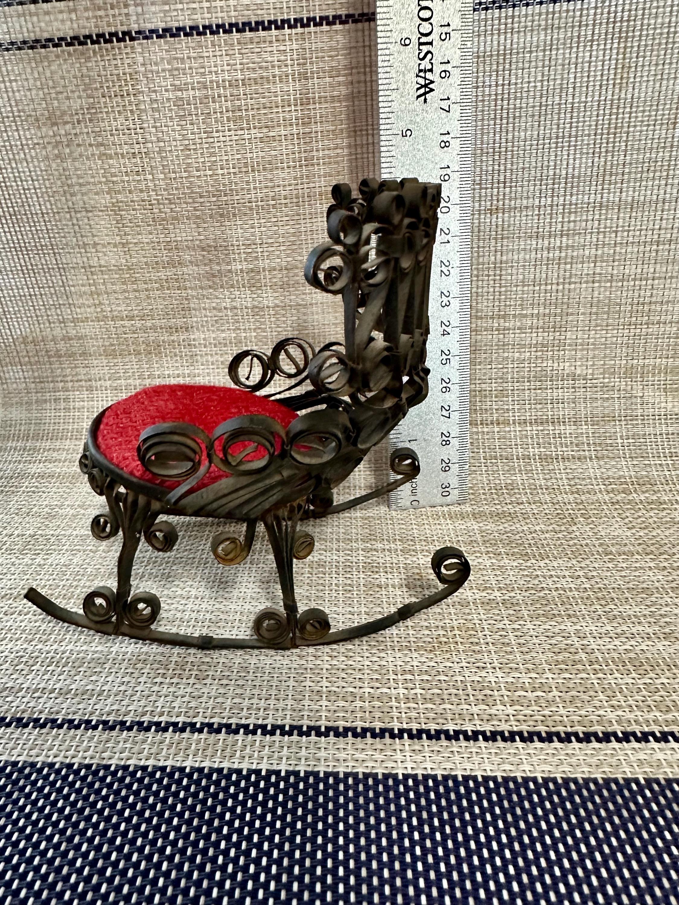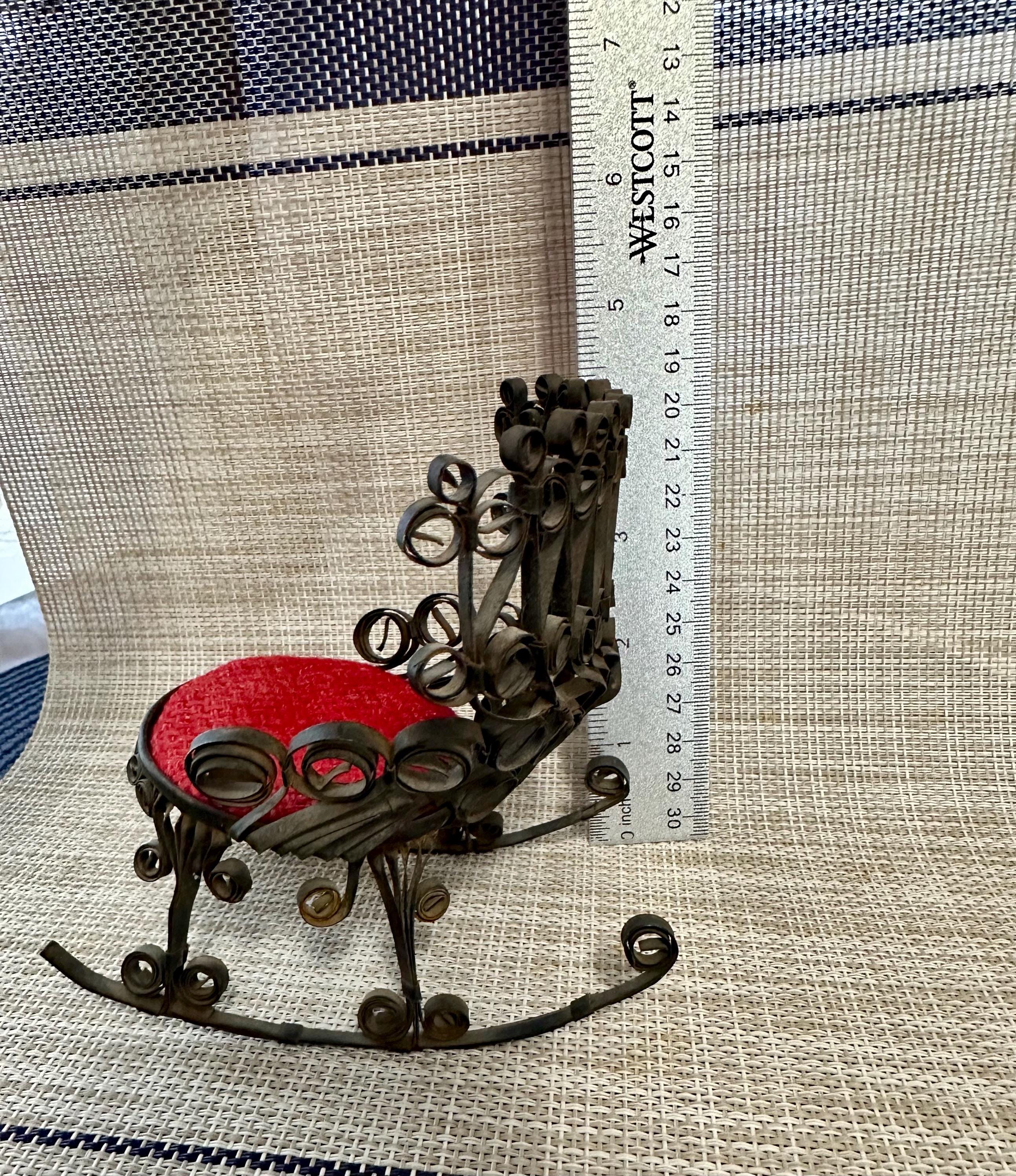 This is a miniature rocking chair. It is 4.5 inches tall and 4.5 inches wide. This chair has a detachable red cushion. There is some slight rust on the back of the chair and underneath the chair, there are a few spots that is missing the black paint. The color may be different due to the camera or the lighting. Please contact us if you have any questions or would like additional pictures. Though we try to reduce and reuse, the cost of additional shipping materials are included in the price.