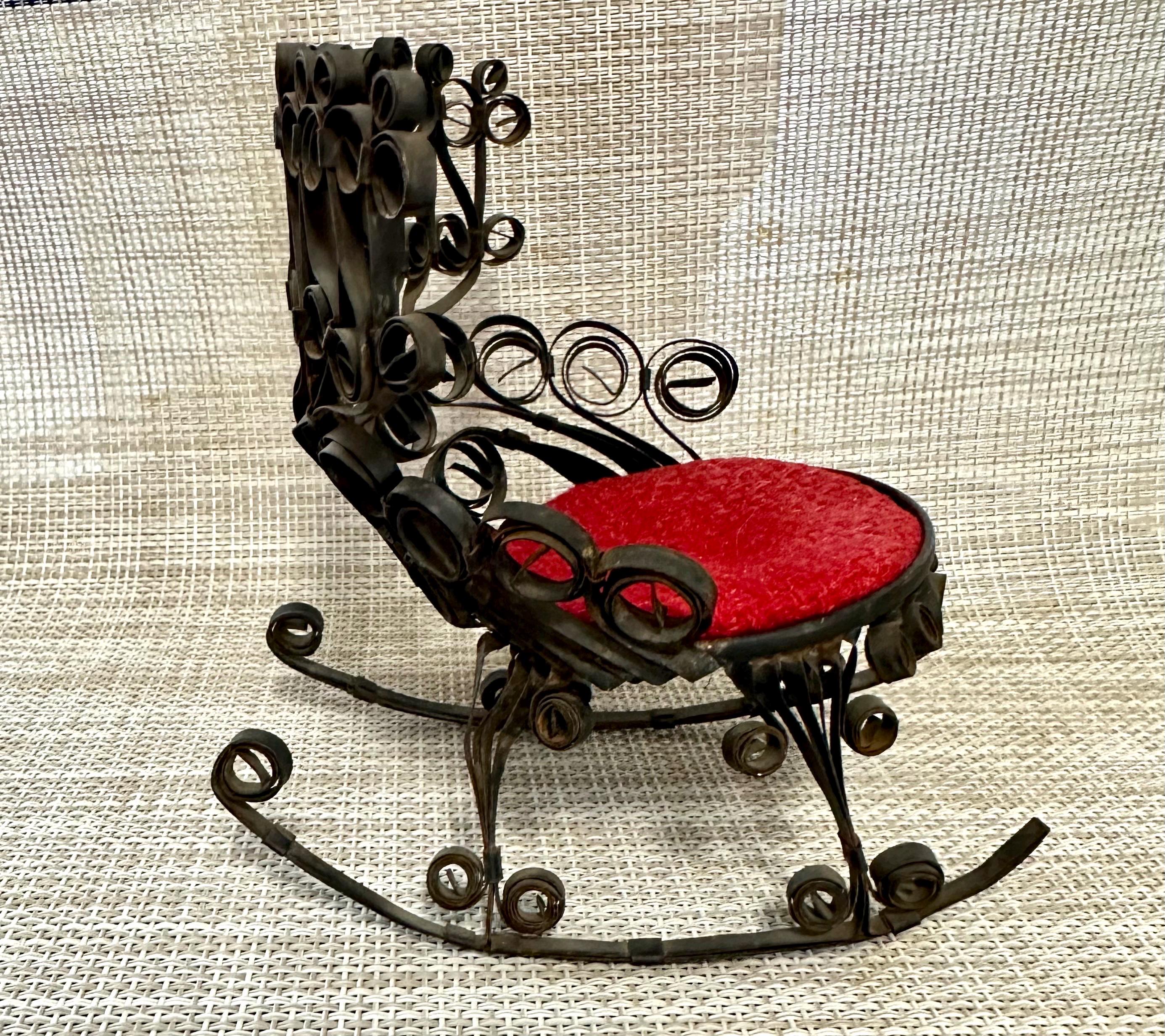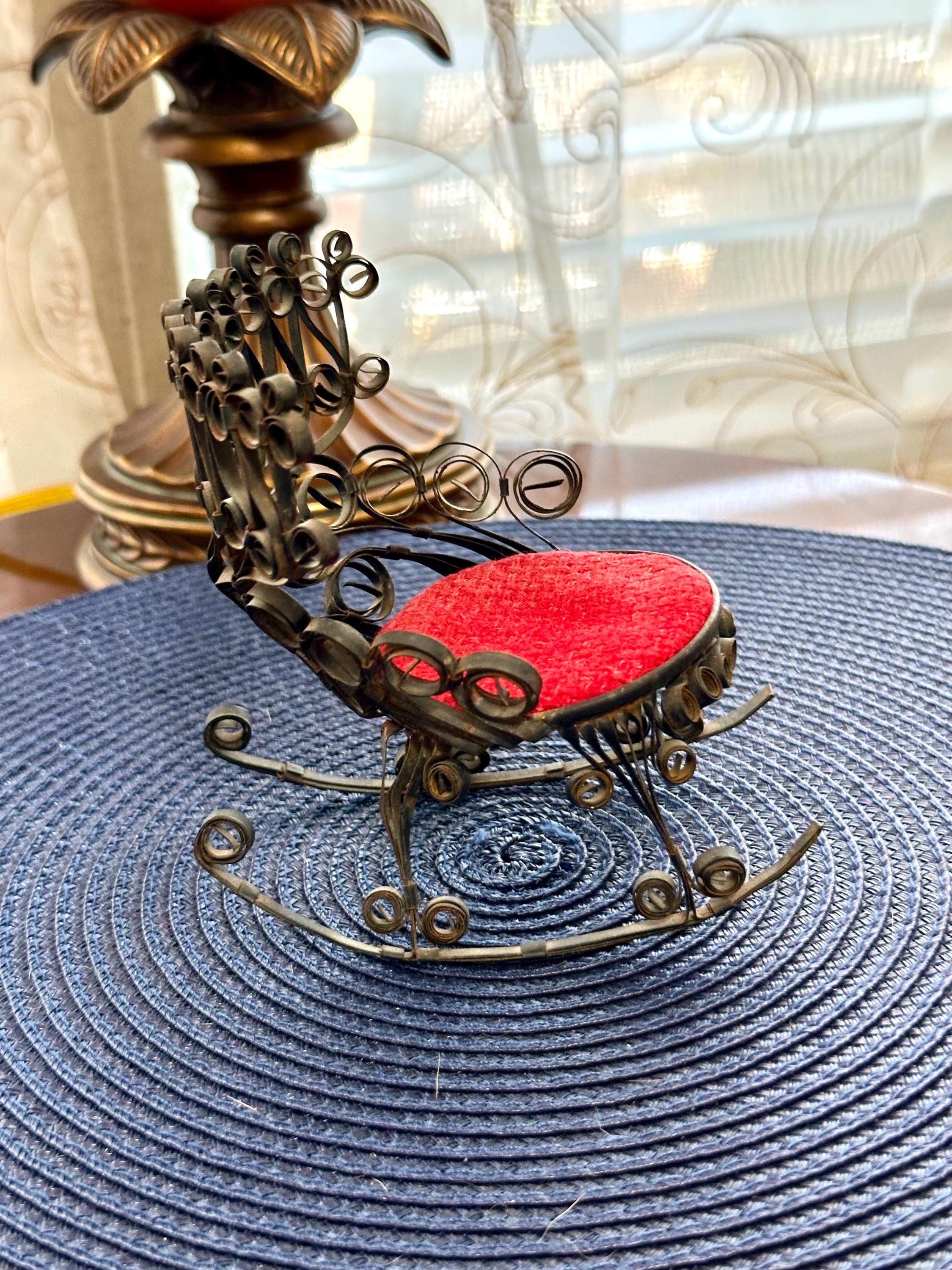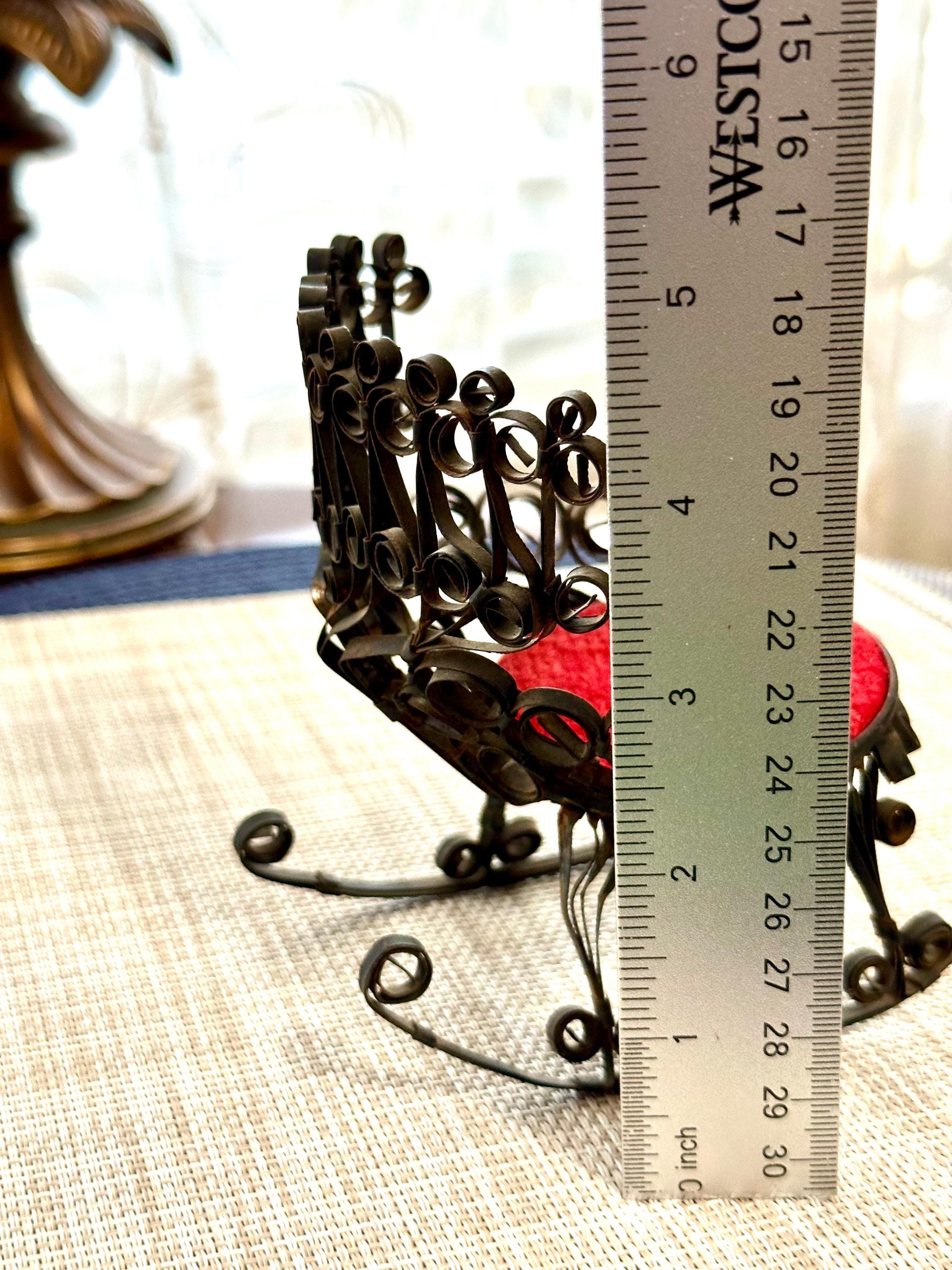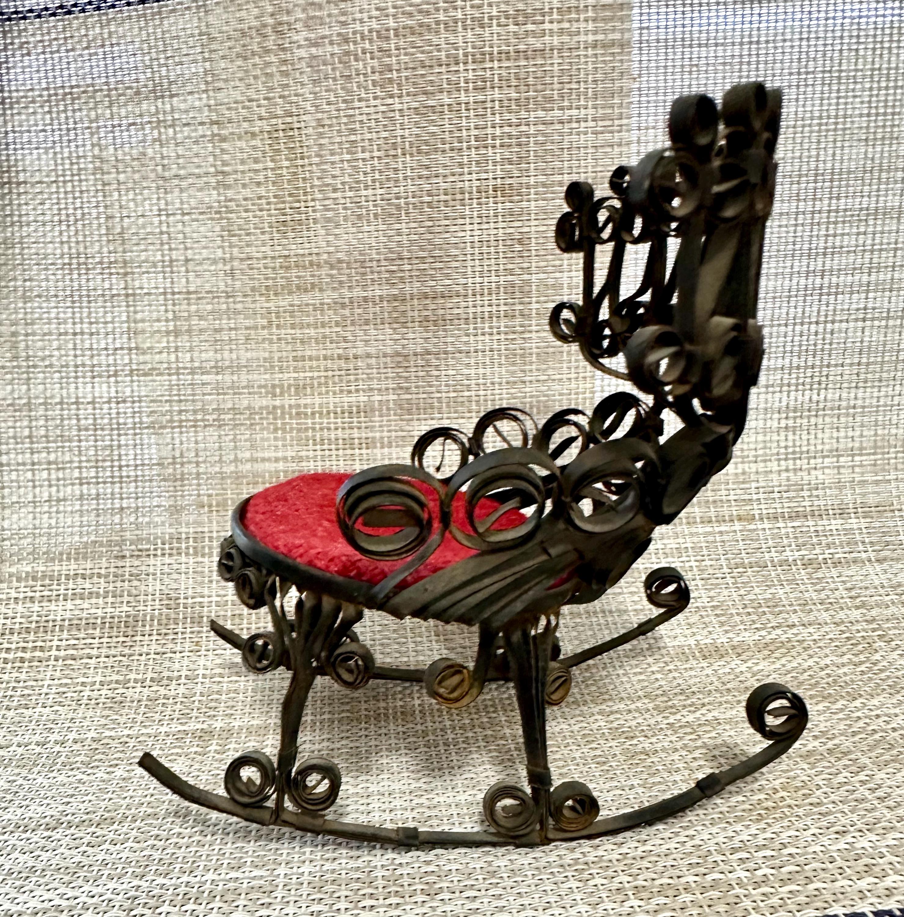 This is a miniature rocking chair. It is 4.5 inches tall and 4.5 inches wide. This chair has a detachable red cushion. There is some slight rust on the back of the chair and underneath the chair, there are a few spots that is missing the black paint. The color may be different due to the camera or the lighting. Please contact us if you have any questions or would like additional pictures. Though we try to reduce and reuse, the cost of additional shipping materials are included in the price.