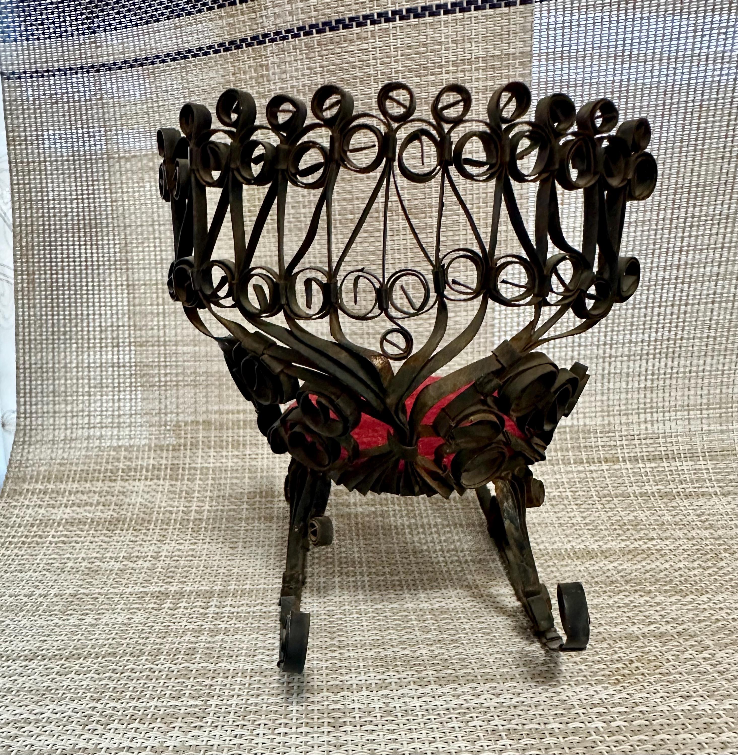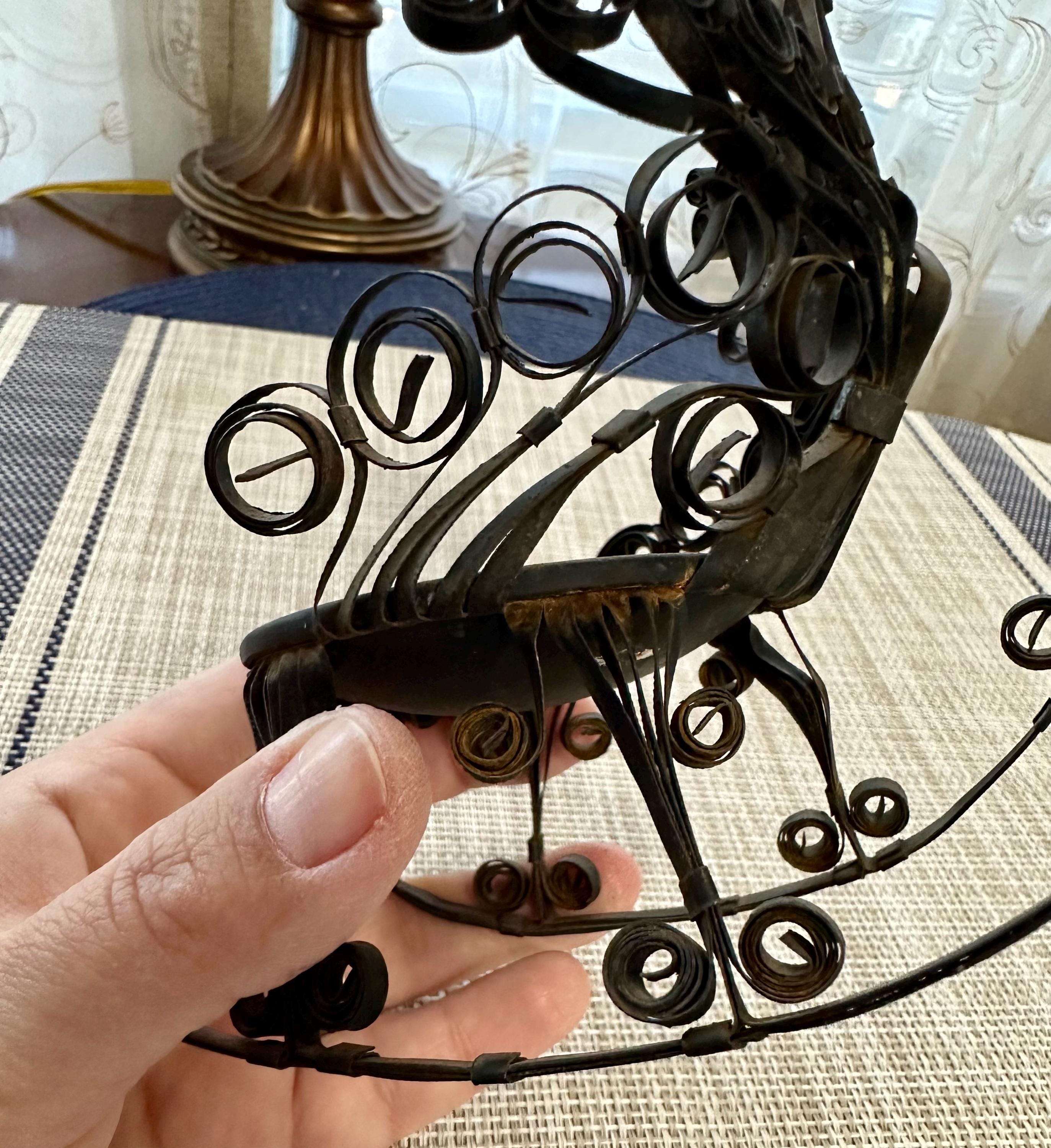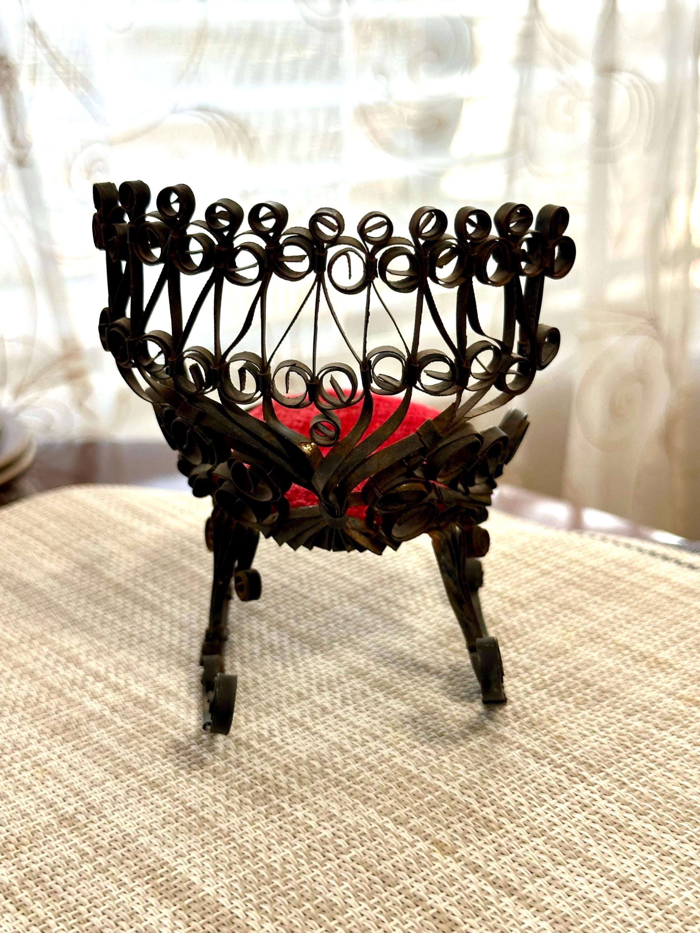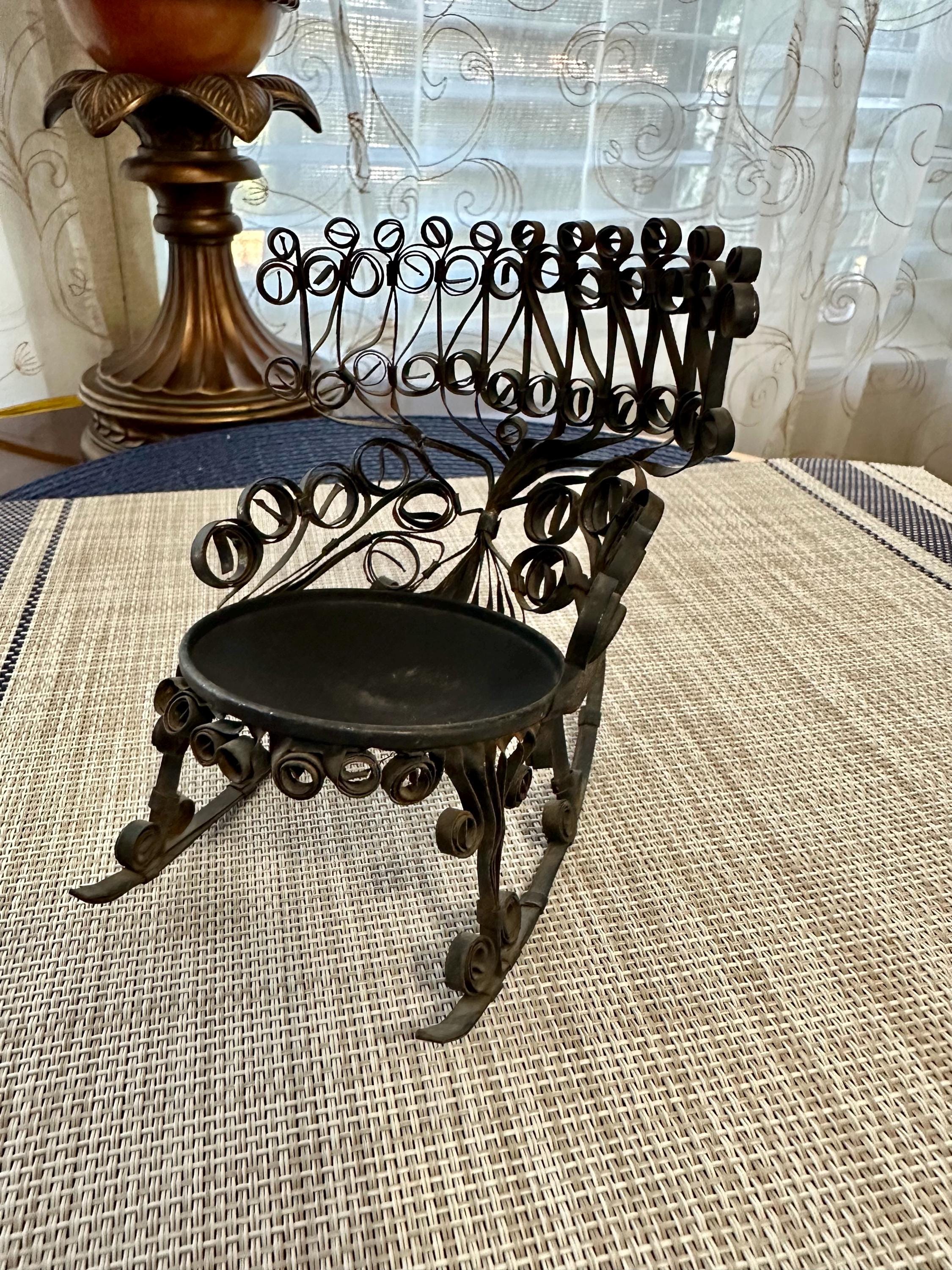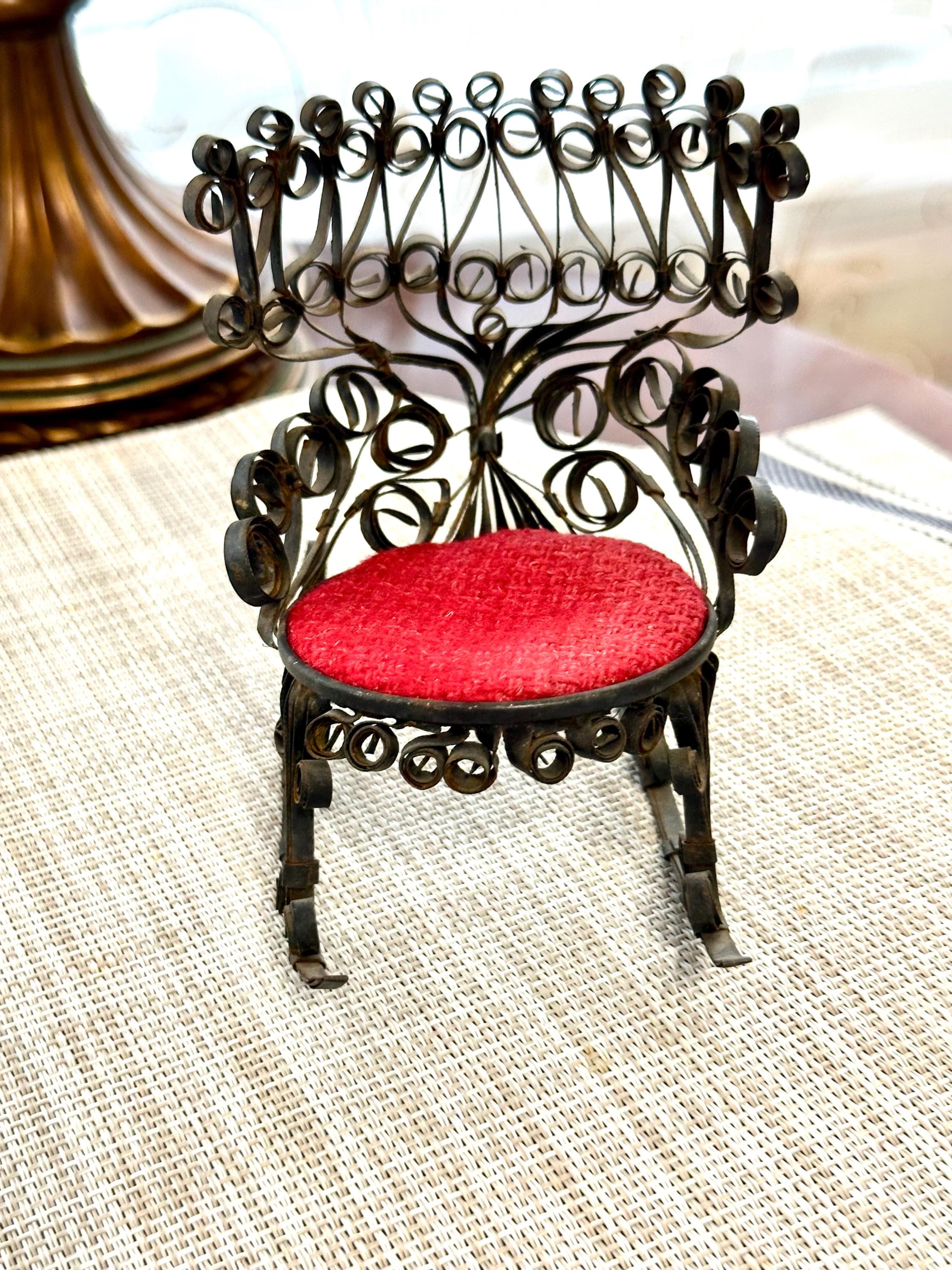 This is a miniature rocking chair. It is 4.5 inches tall and 4.5 inches wide. This chair has a detachable red cushion. There is some slight rust on the back of the chair and underneath the chair, there are a few spots that is missing the black paint. The color may be different due to the camera or the lighting. Please contact us if you have any questions or would like additional pictures. Though we try to reduce and reuse, the cost of additional shipping materials are included in the price.