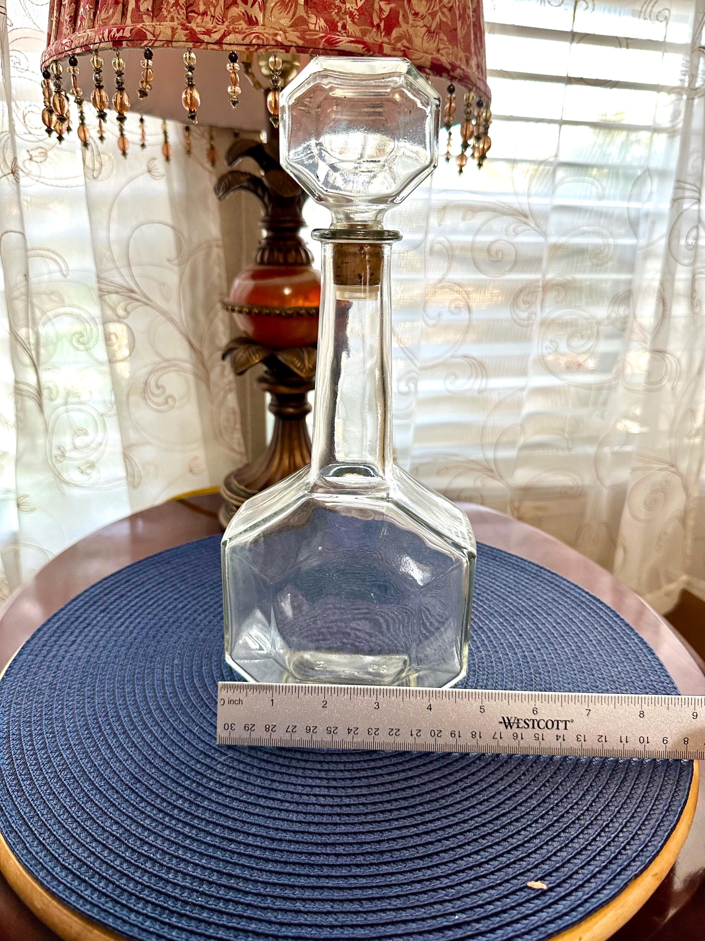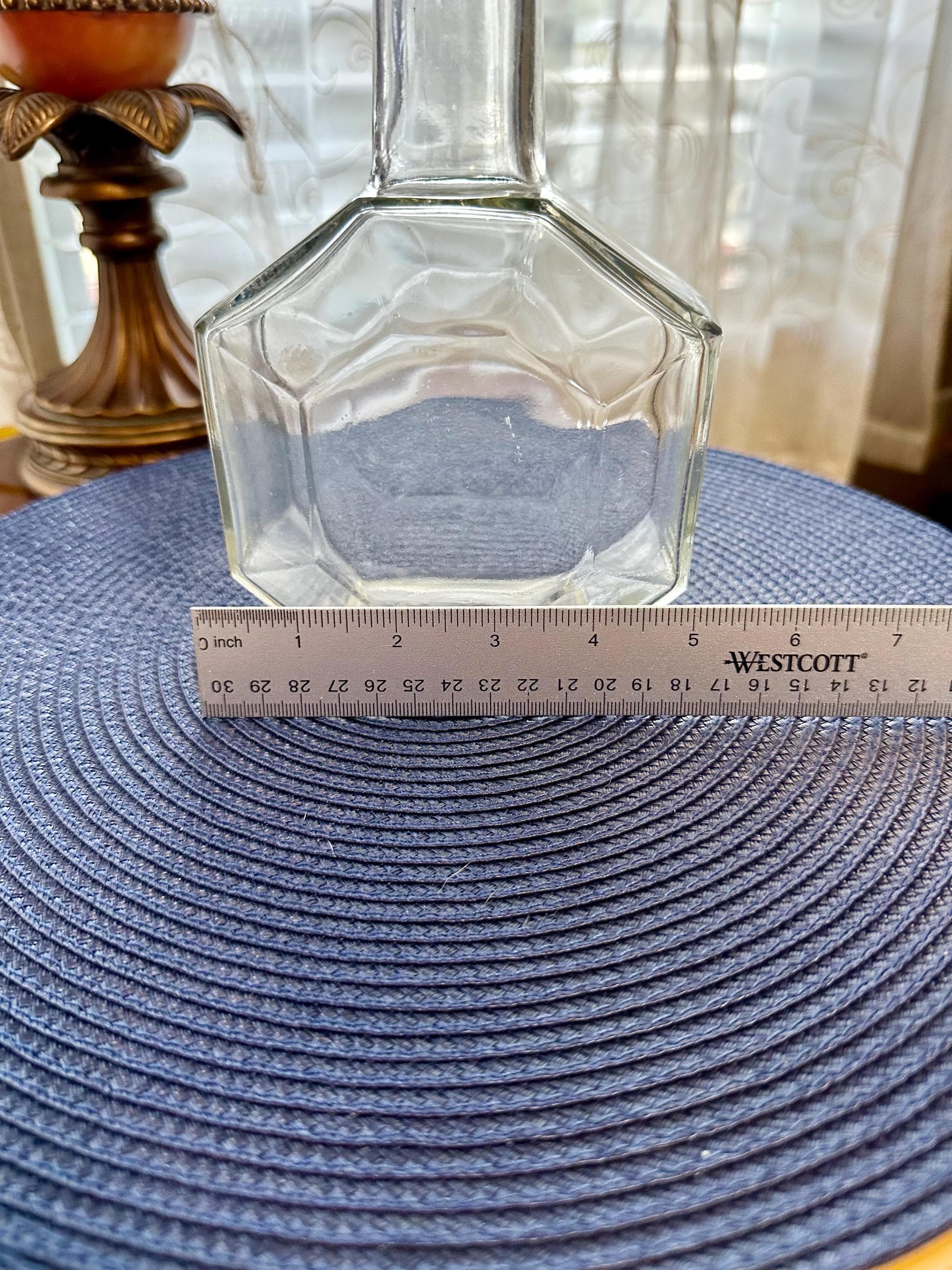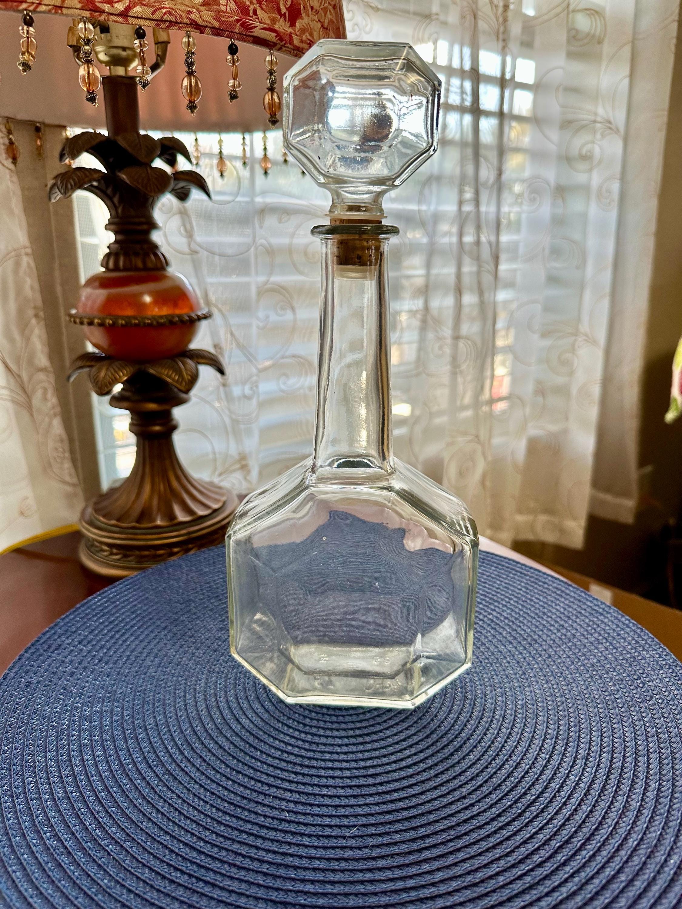 This is a vintage glass octagon long neck whiskey decanter. This is 12 inches tall and 5 inches wide. The cork around the stopper is in good condition. If you have any questions please contact us. Though we try to reduce and reuse, the cost of additional shipping materials are included in the price.