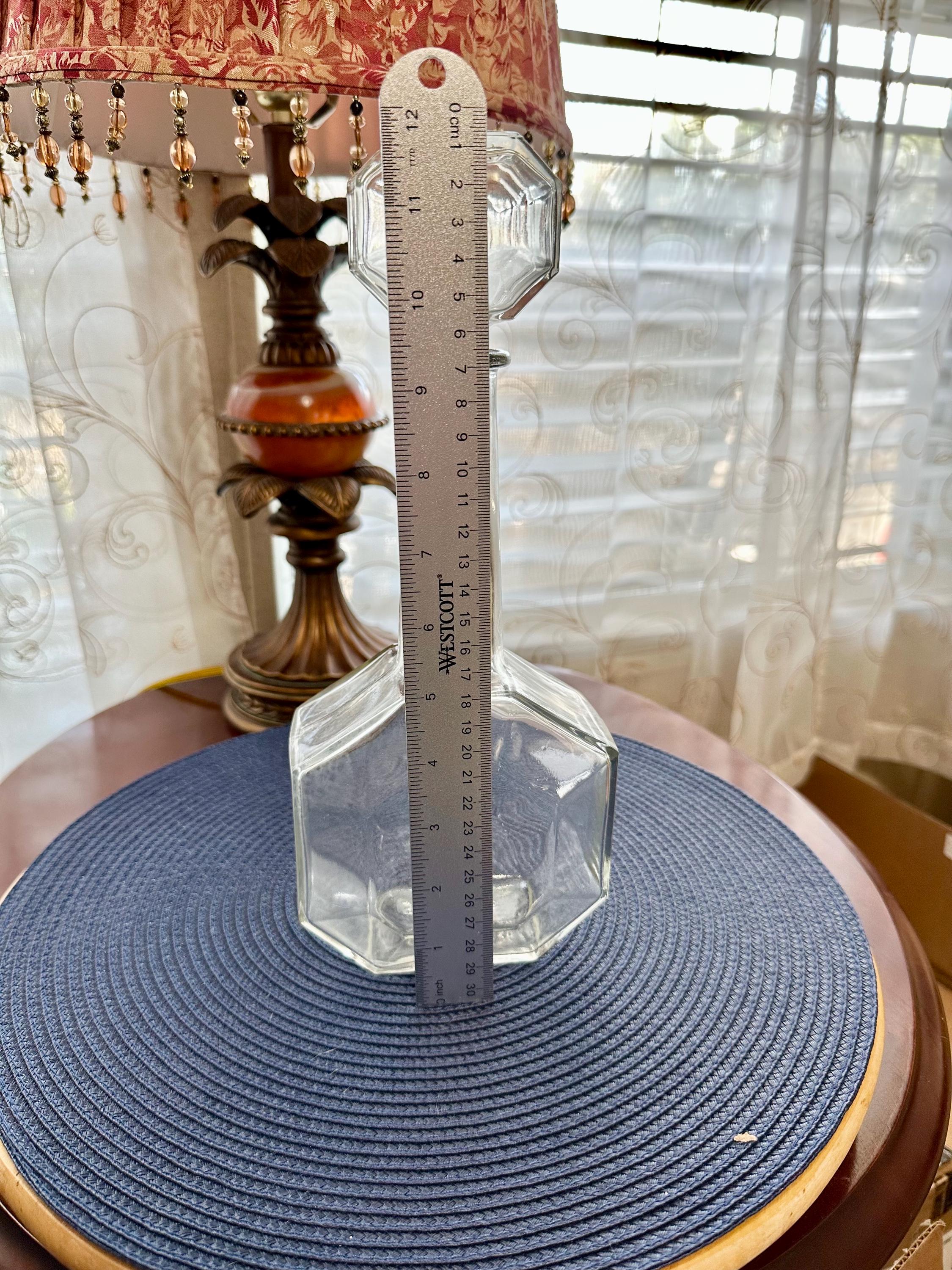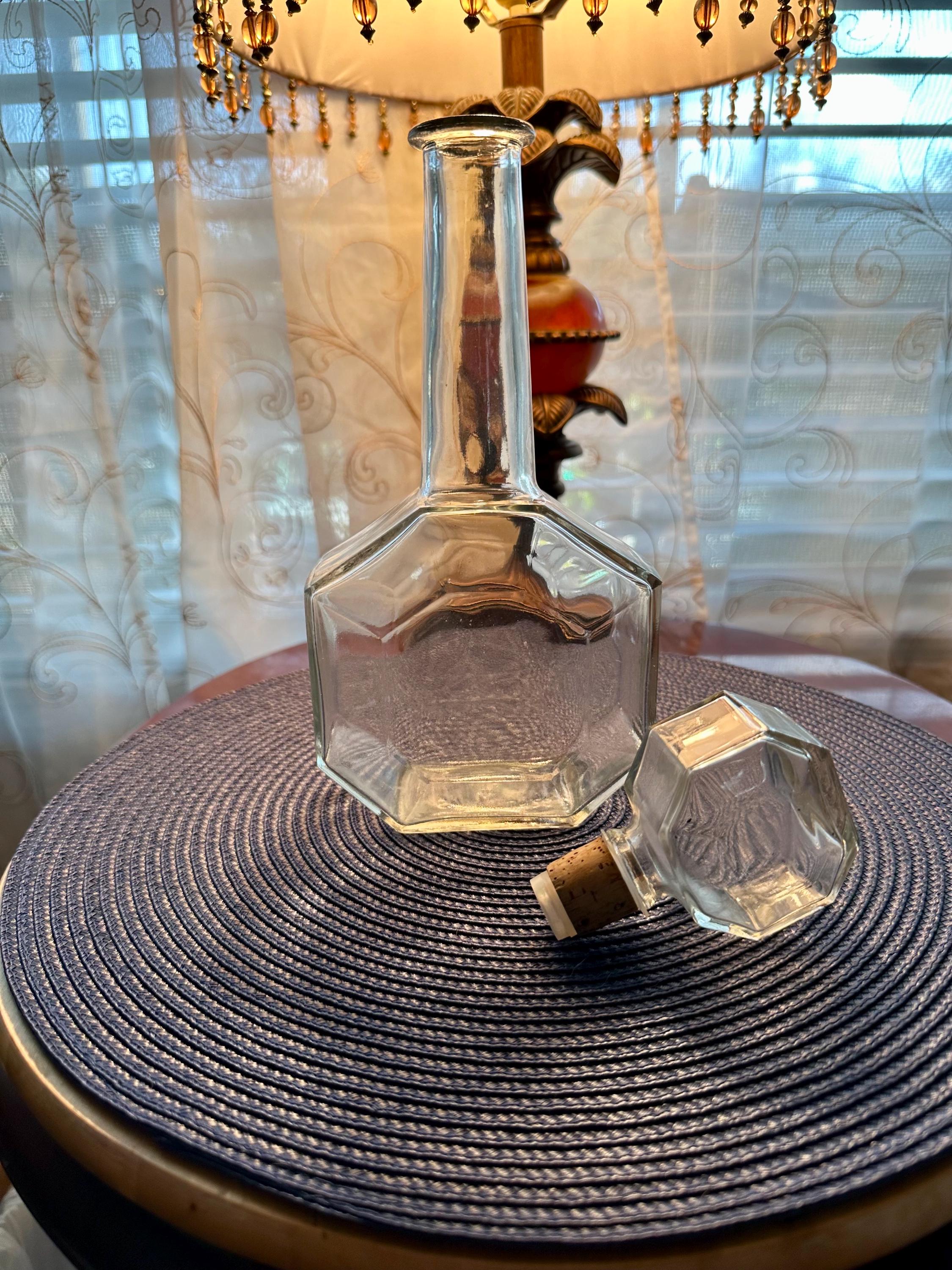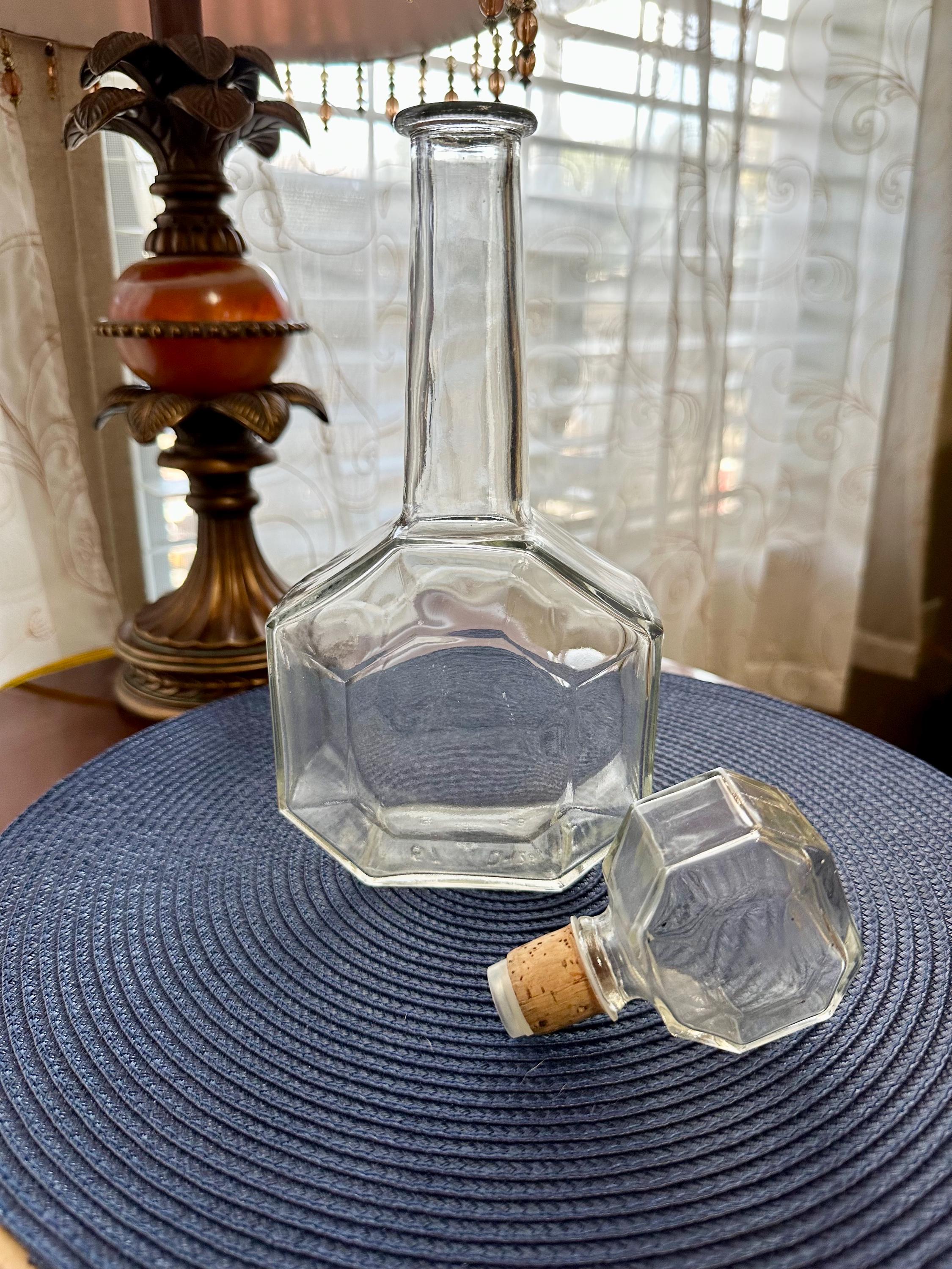 This is a vintage glass octagon long neck whiskey decanter. This is 12 inches tall and 5 inches wide. The cork around the stopper is in good condition. If you have any questions please contact us. Though we try to reduce and reuse, the cost of additional shipping materials are included in the price.