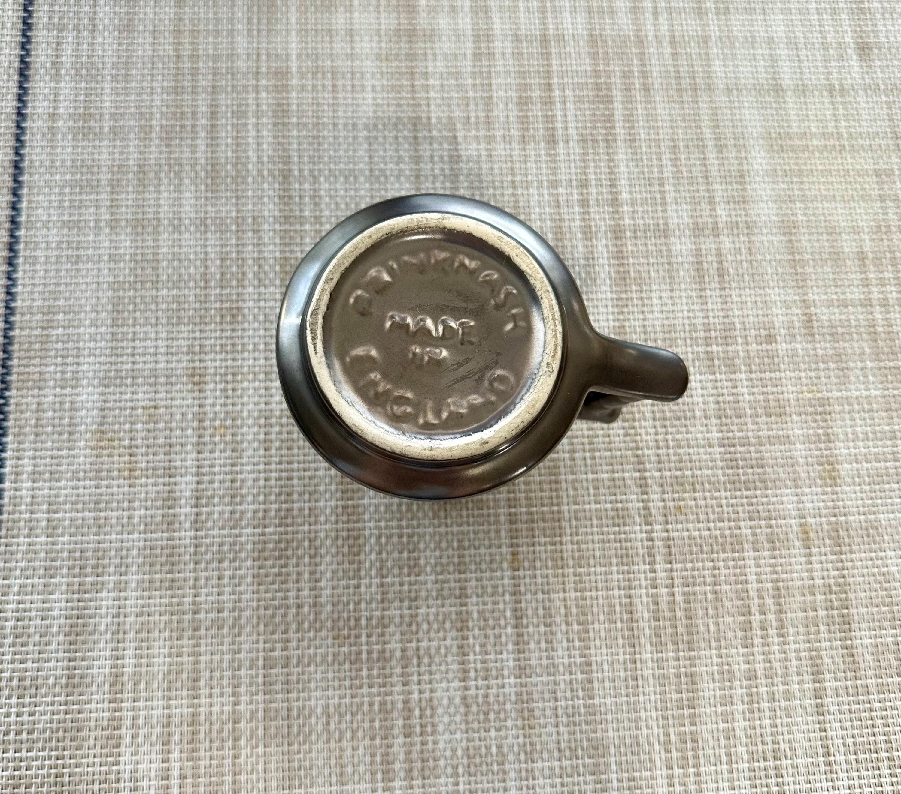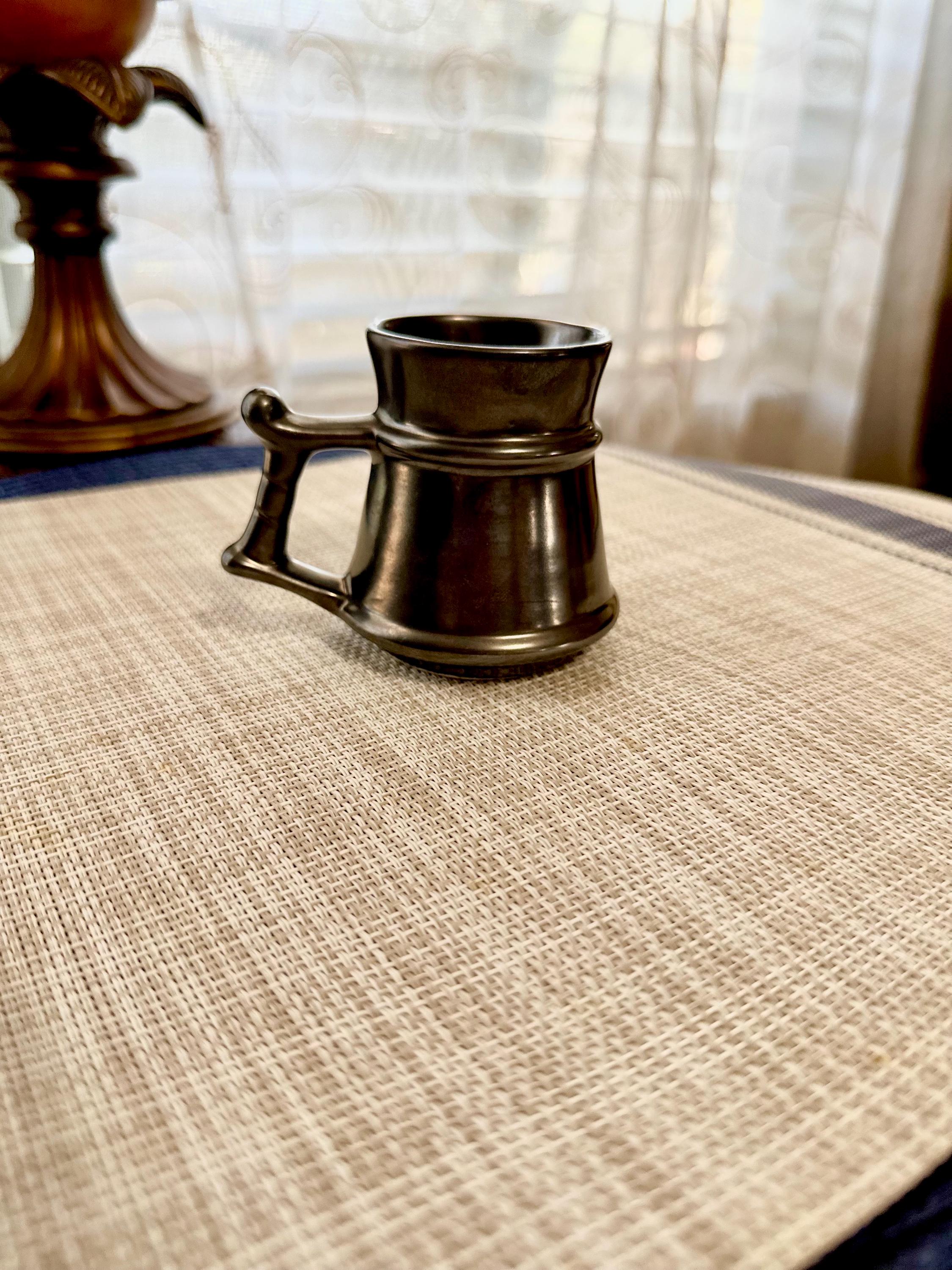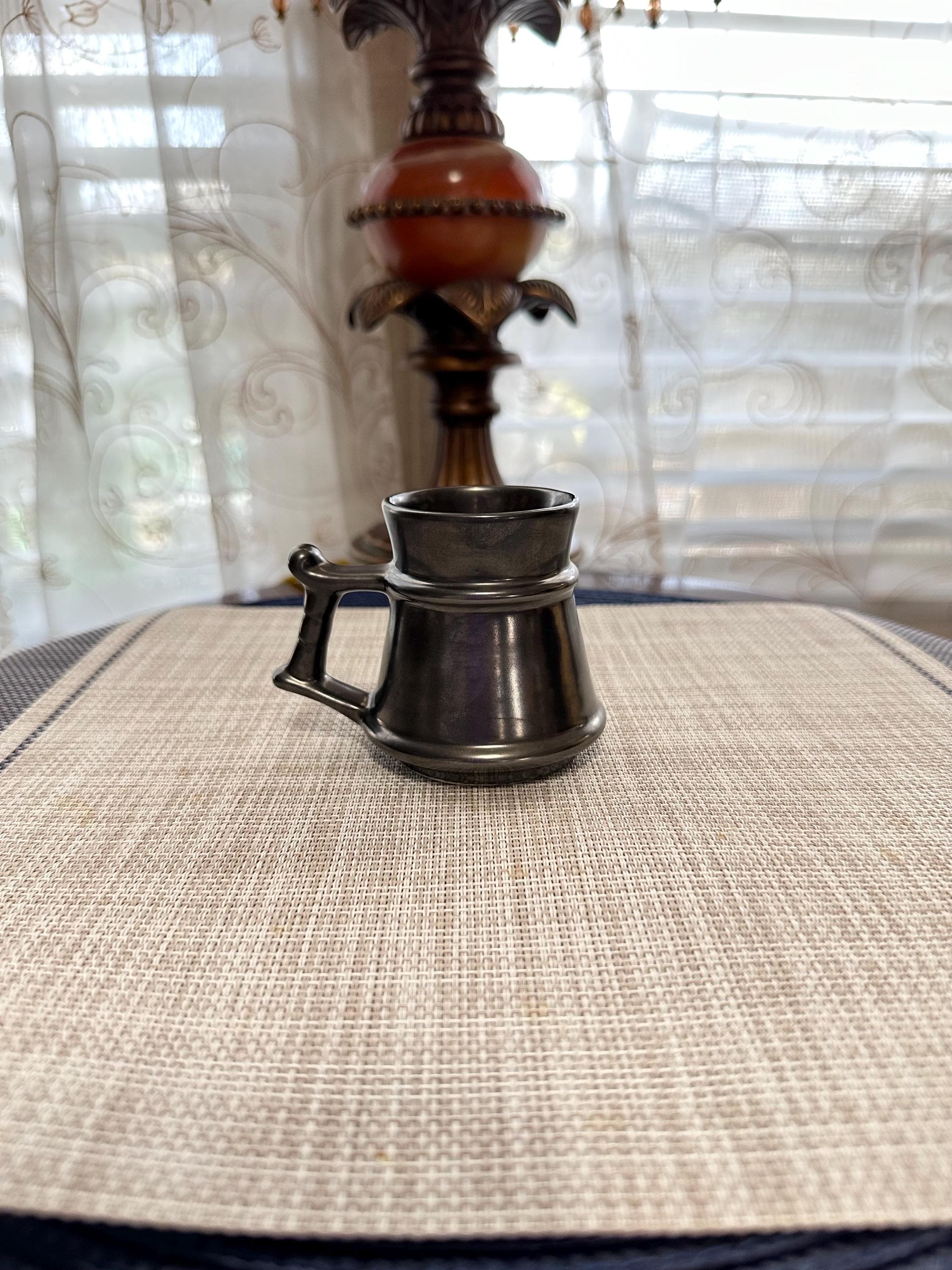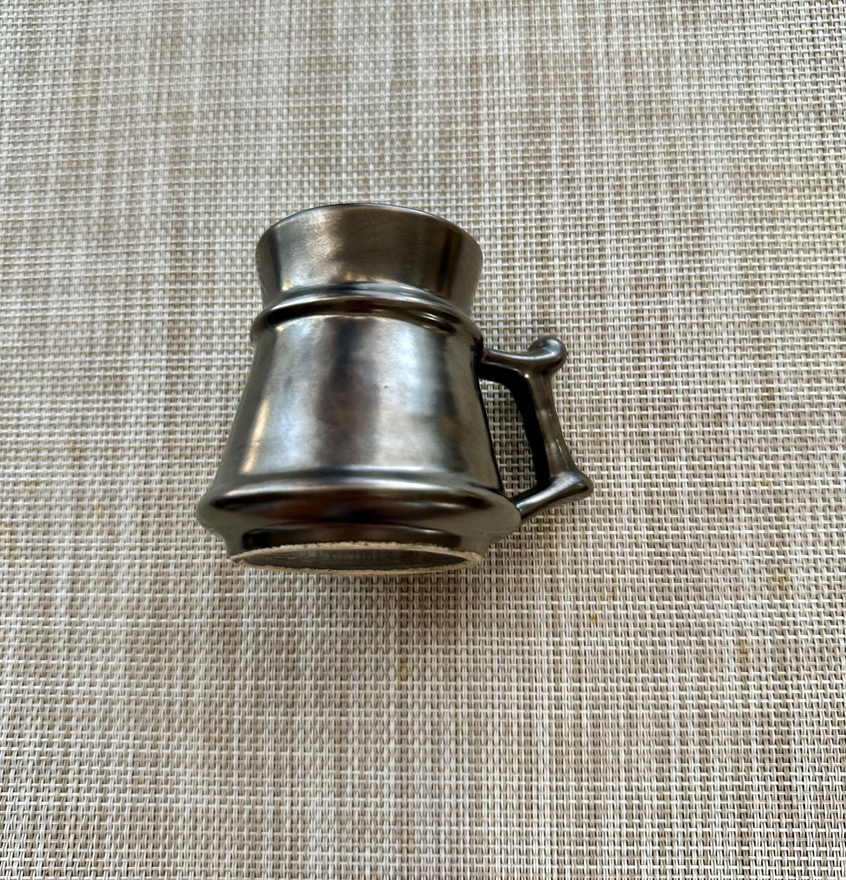 This mini mug is made by Prinknash Abbey Pottery in a "gunmetal" glaze. This has no chips, crazing or scratches. This is 3 inches tall and 3 inches wide.