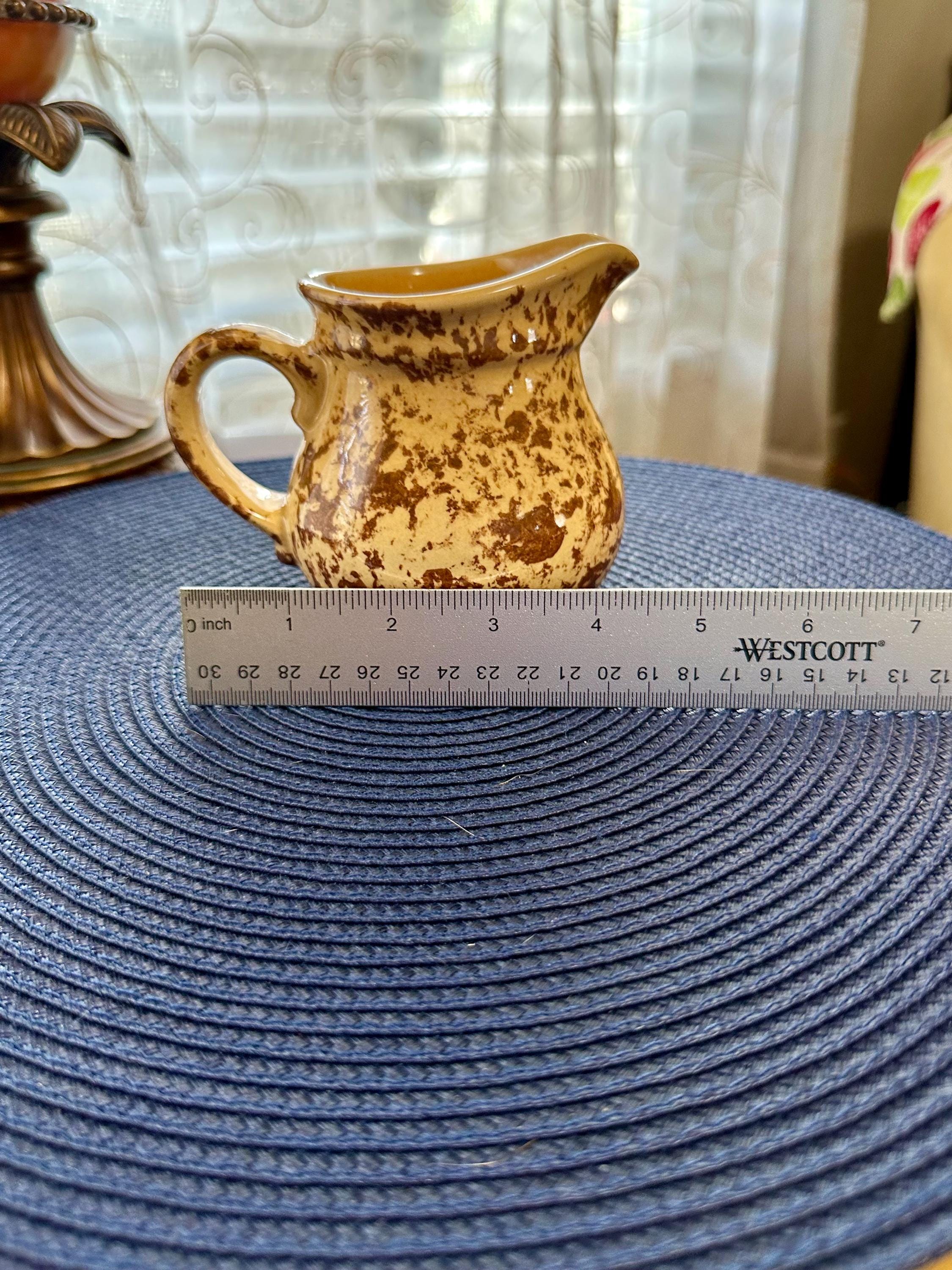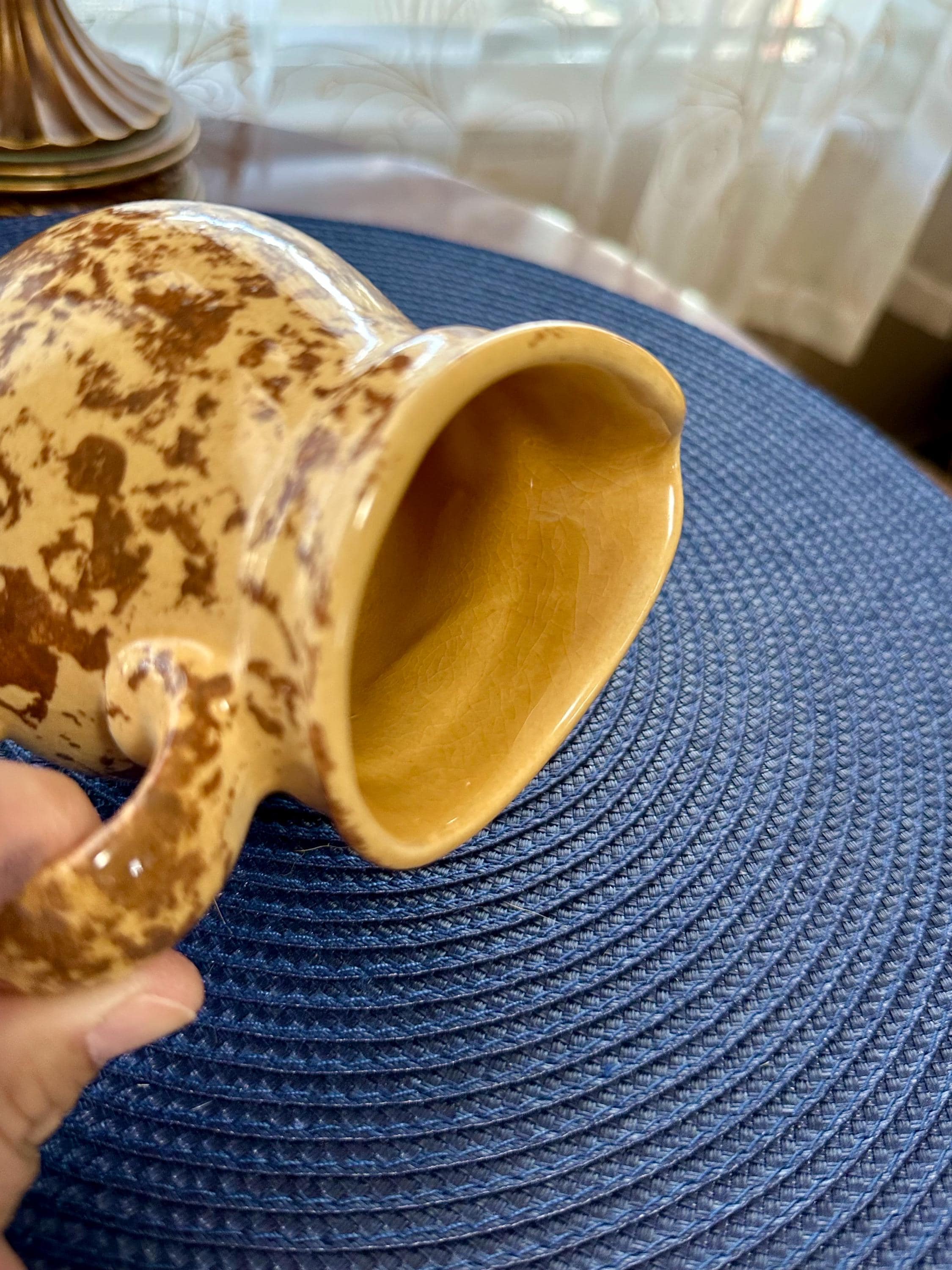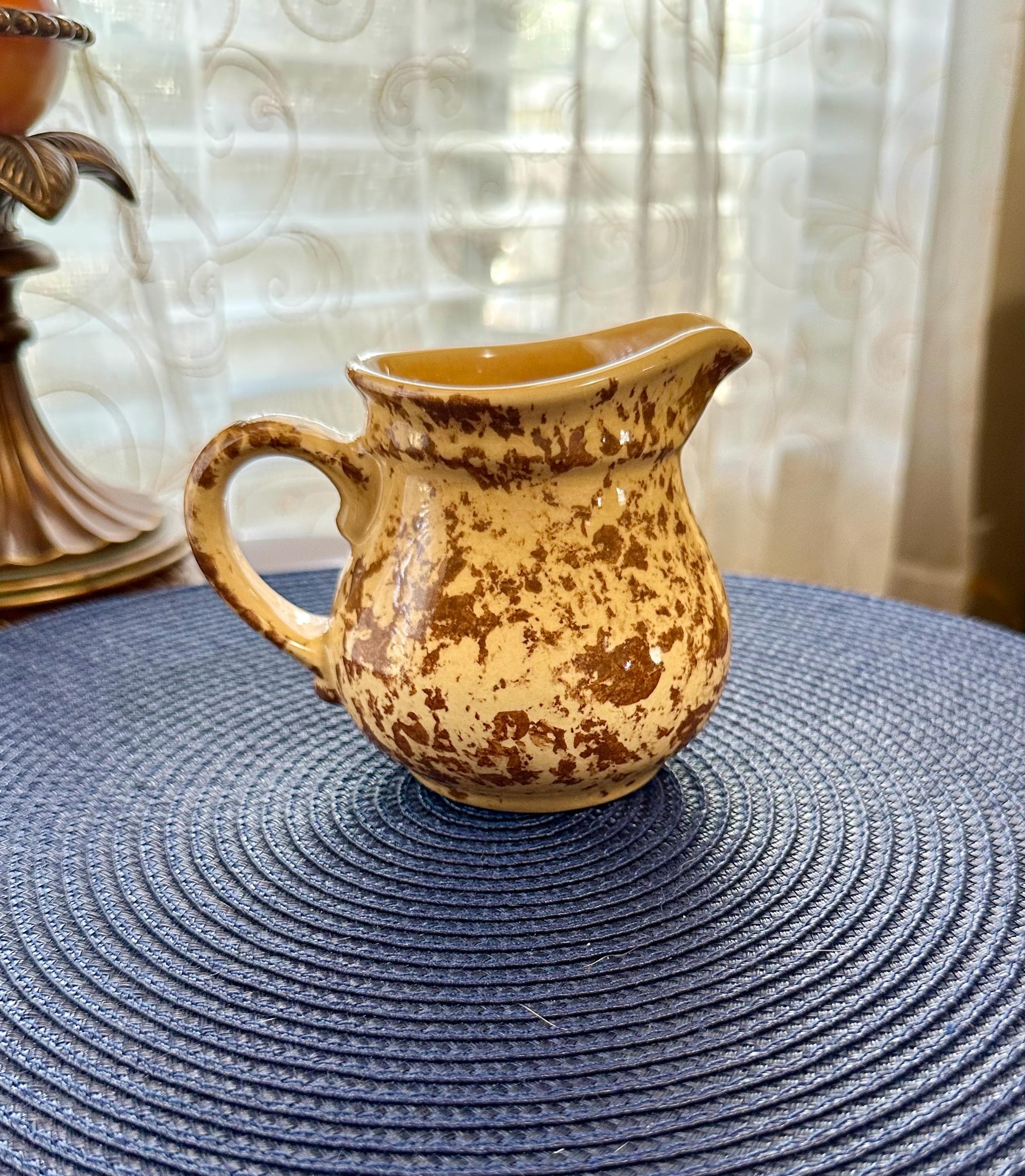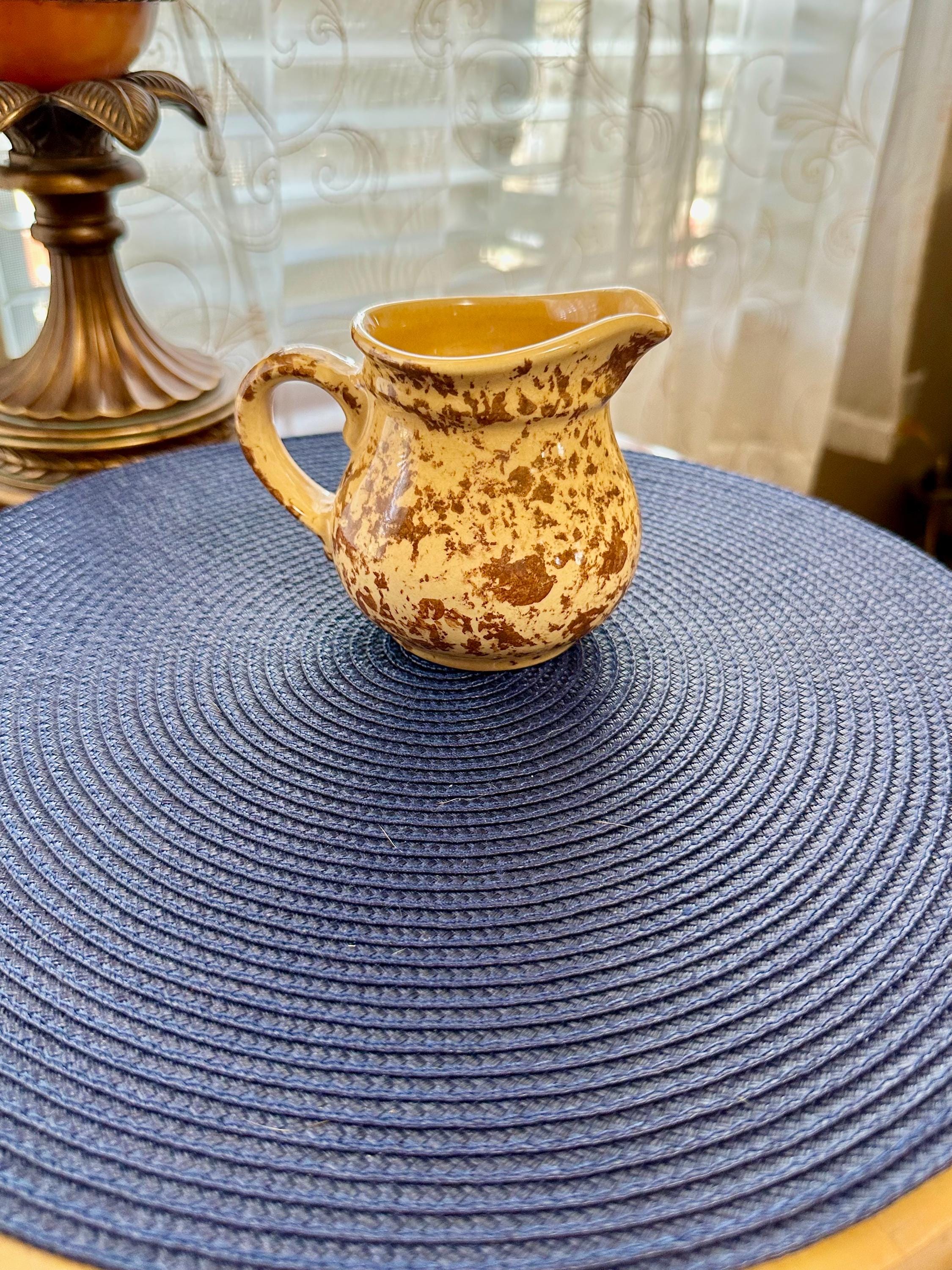 This is a discontinued Pfaltzgraff Spongeware Creamer/Pitcher in yellow and brown. This is from the "America" patterns, and the mold number is 024. There are no cracks or chips. There is slight crazing on the inside of this pitcher.