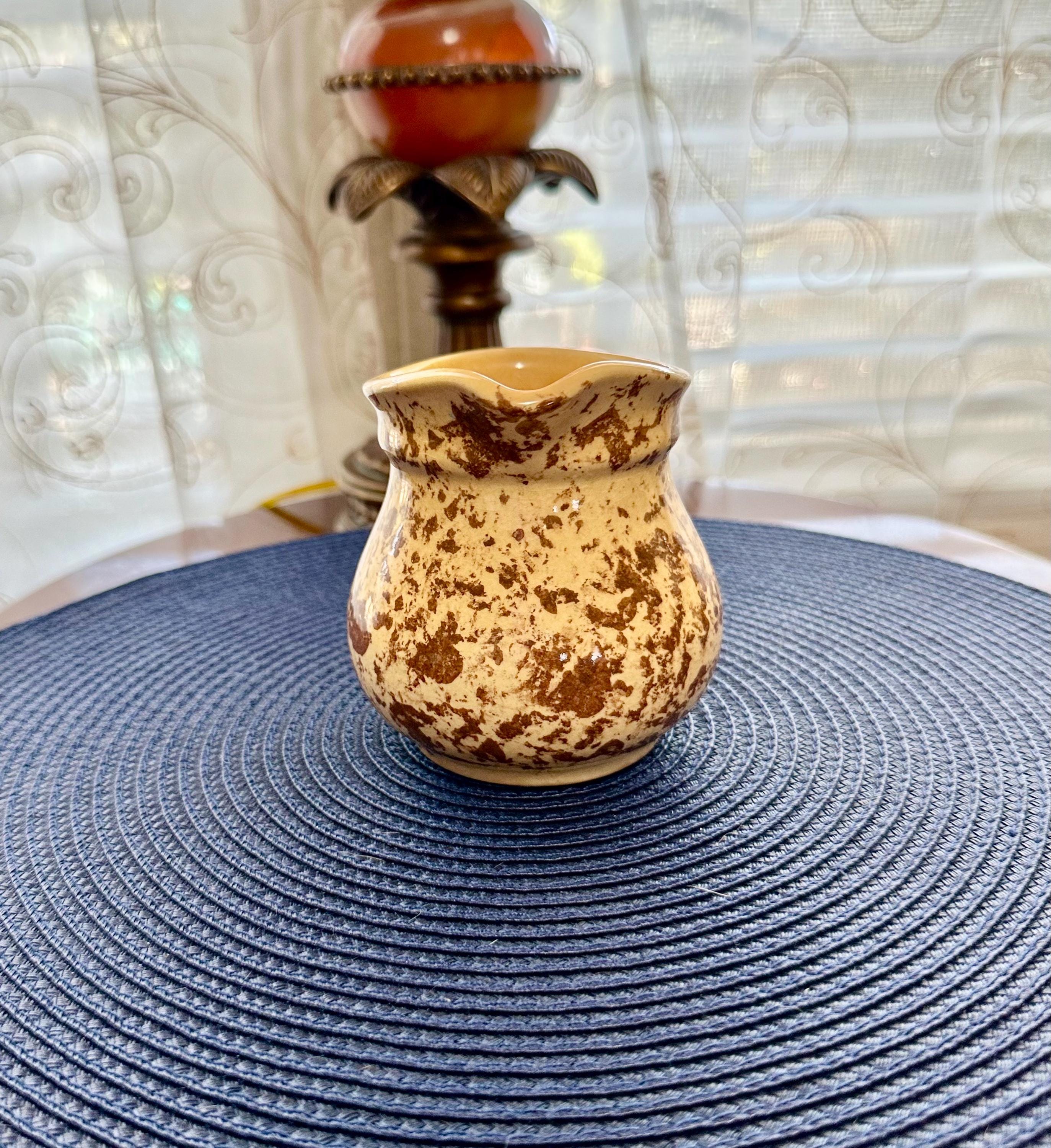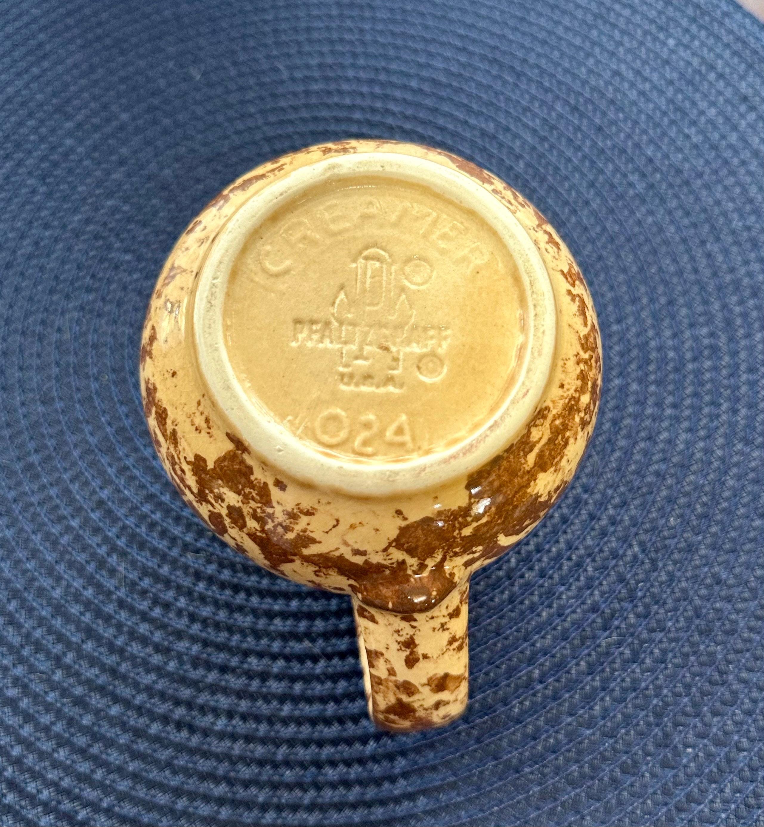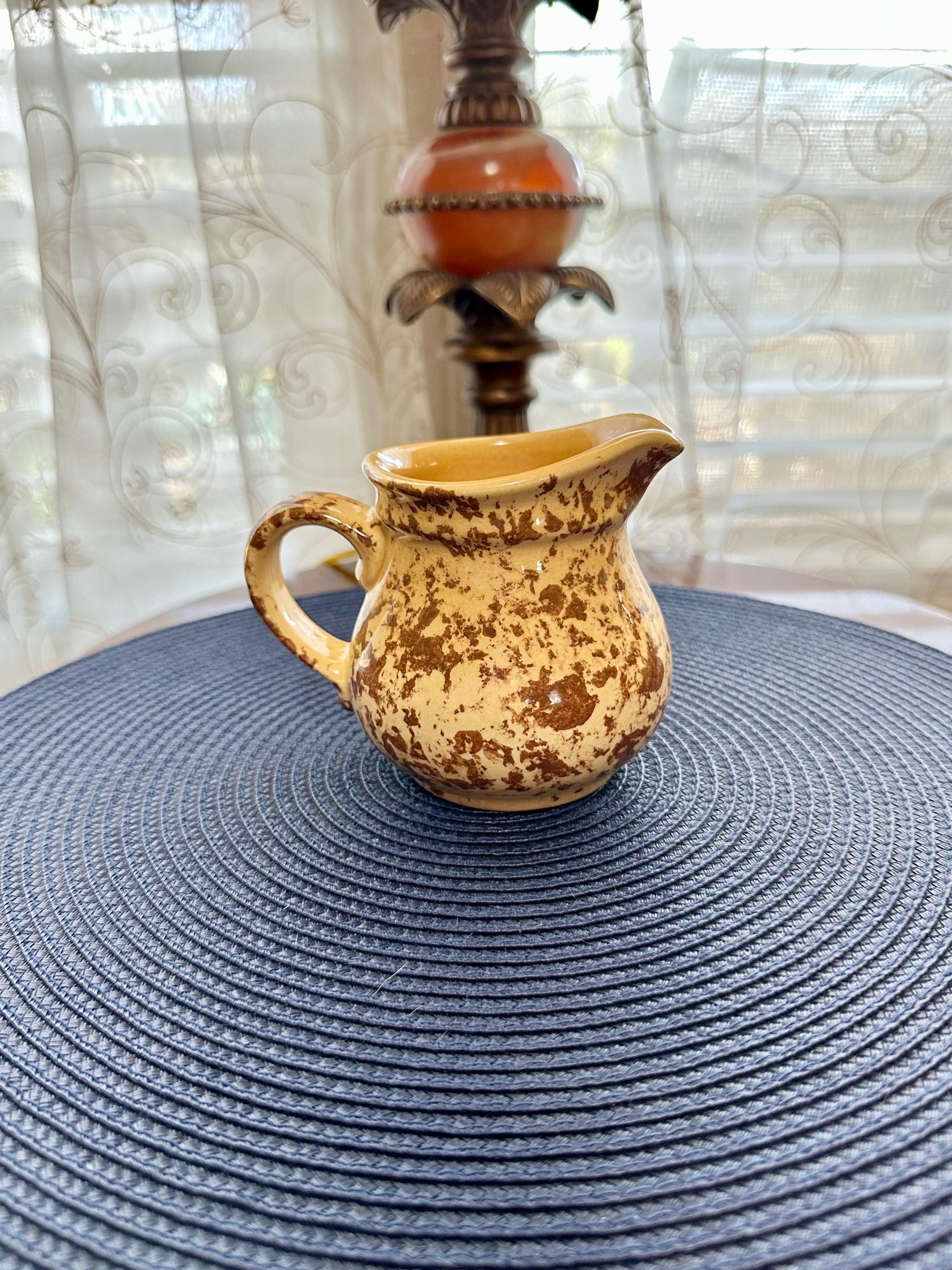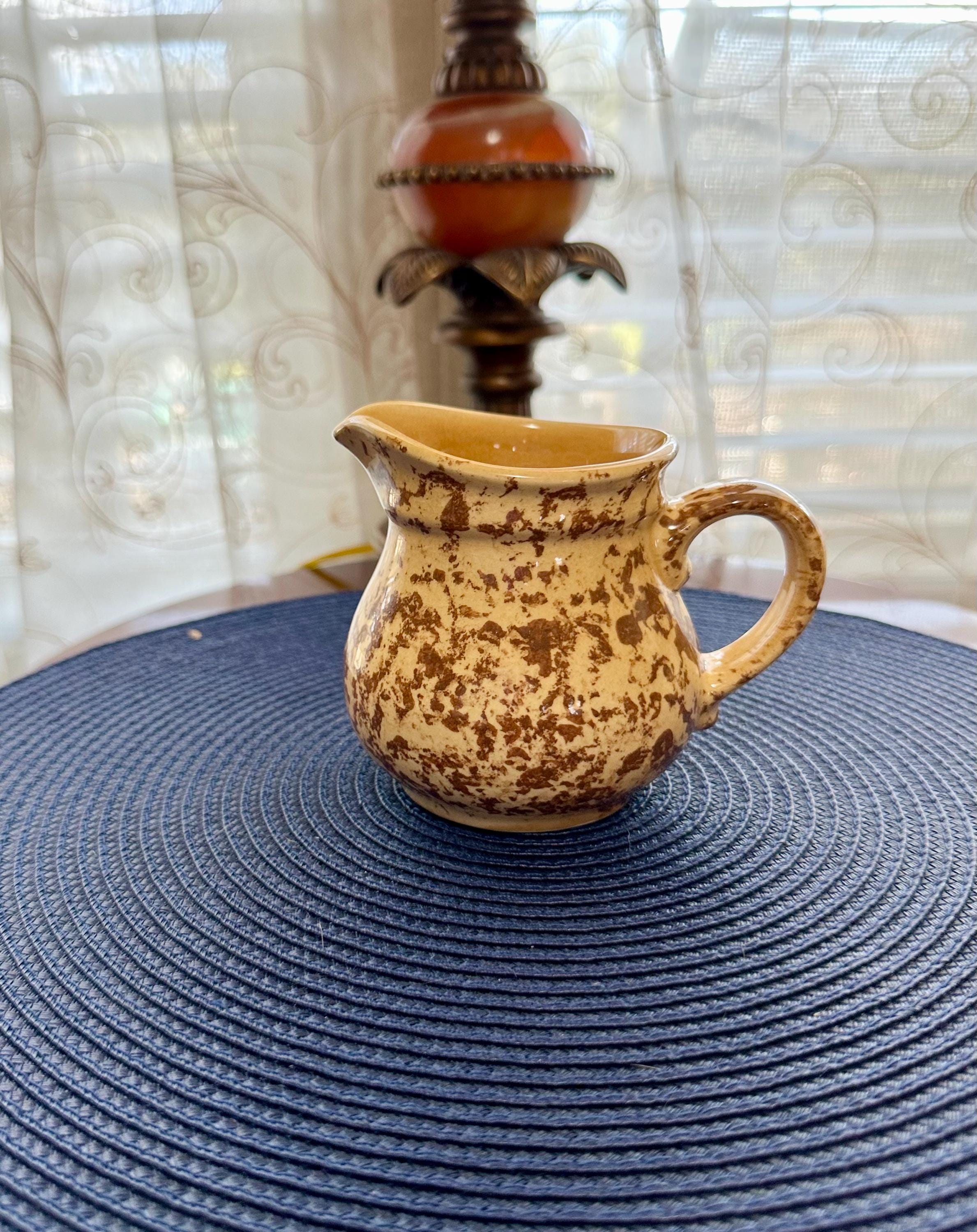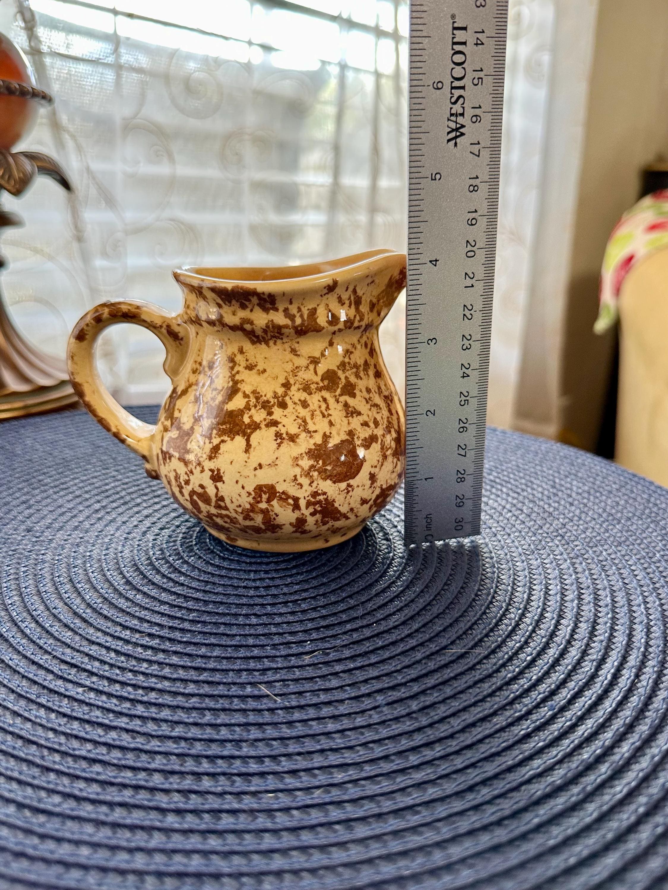 This is a discontinued Pfaltzgraff Spongeware Creamer/Pitcher in yellow and brown. This is from the "America" patterns, and the mold number is 024. There are no cracks or chips. There is slight crazing on the inside of this pitcher.